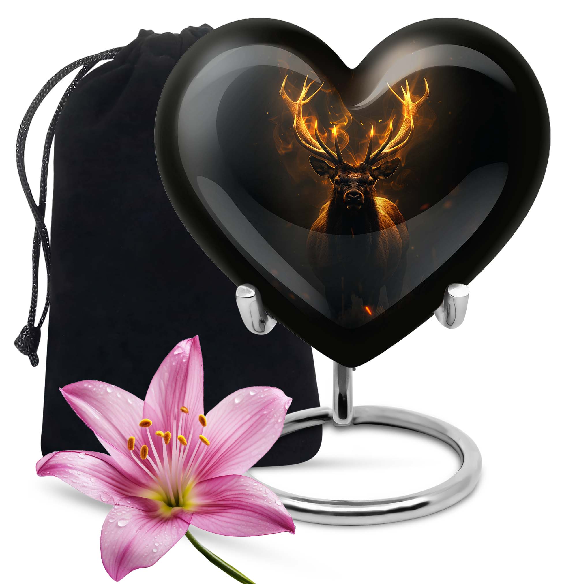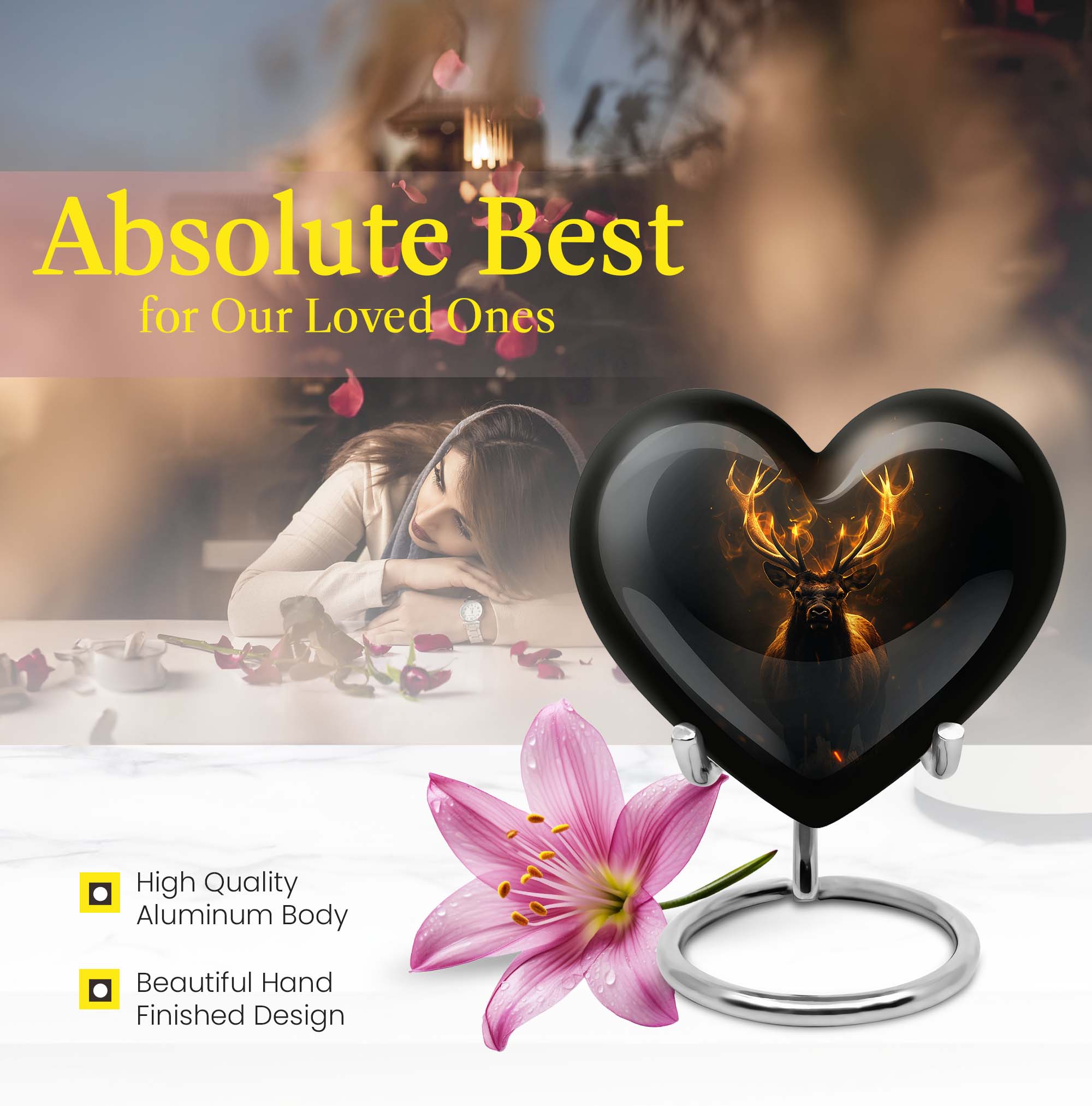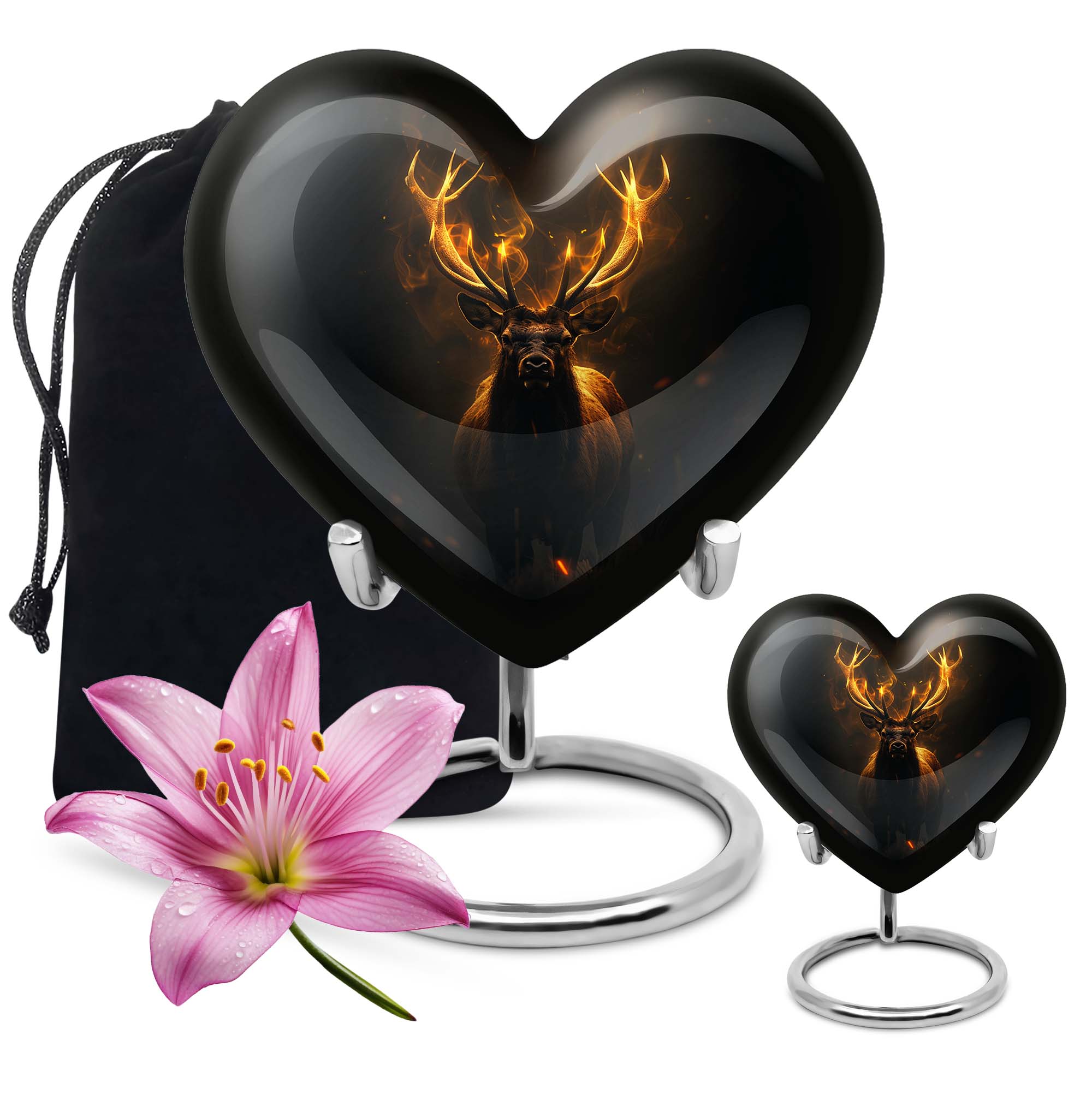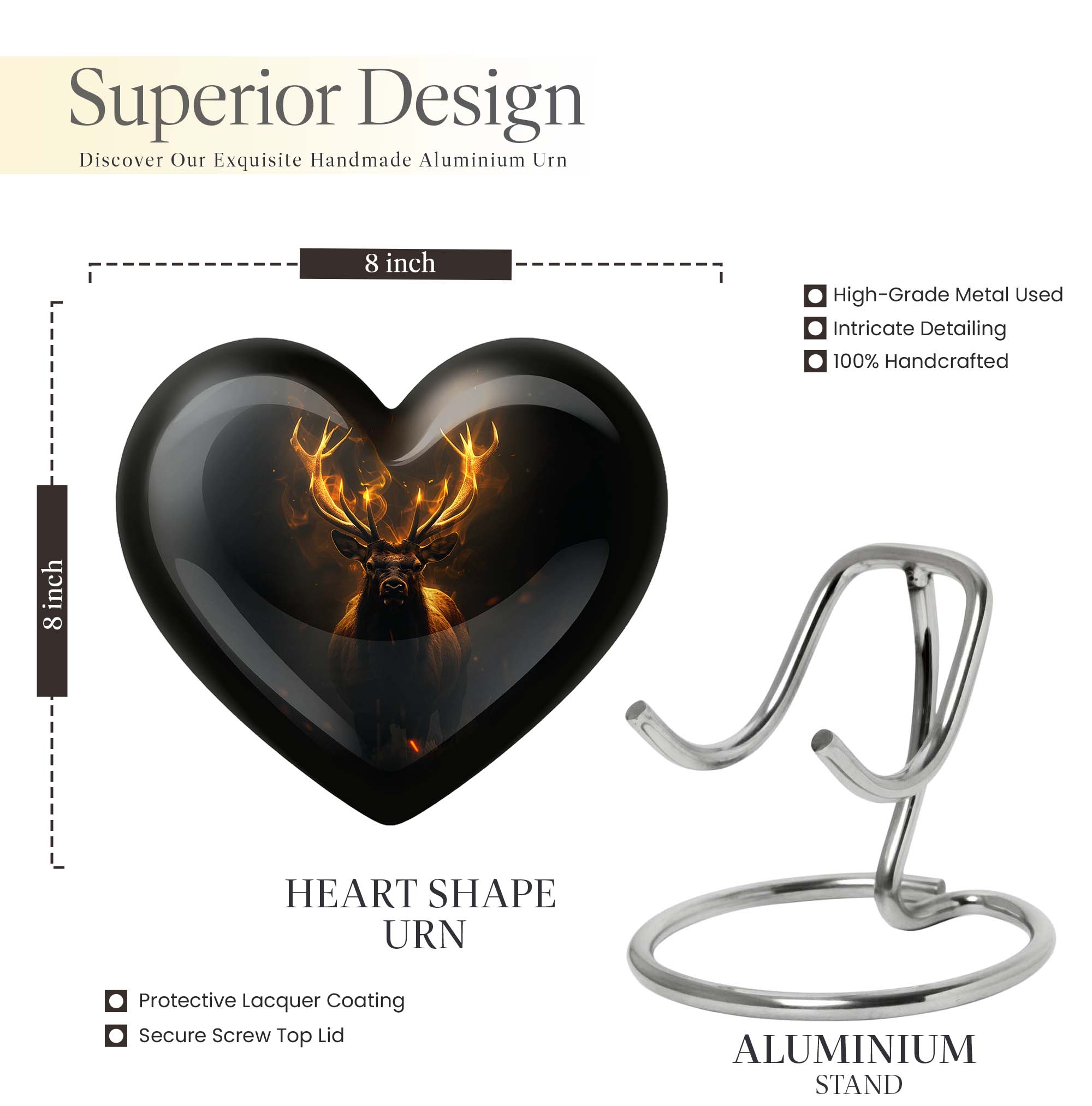 Embark on an expression of eternal love and remembrance with this stunning Heart Urn, serving as a beautiful tribute to a dearly loved one. Handcrafted from superior quality aluminium, this 10-inch deer Urn is large enough to store up to 200 cubic inches, making it an ideal burial urn for adult ashes. The stirring wolf howling theme is sure to carve a meaningful memorial. The urn uniquely comes with an additional velvet pouch, providing an alternate containment of ashes, adding an extra layer of sacredness. This urn can be personalized with engraved names, to truly manifest your connection with your cherished one. At a weight of 3.3 pounds, handling this urn ensures a sense of firm security. Whether you're seeking 'cremation urns for dad' or 'memorial adult urns, this item provides a heartfelt home for those who were so genuinely loved and yet are no longer with us physically. Adorn this breathtaking work of art as a symbol of undying love and memories that will forever live on.