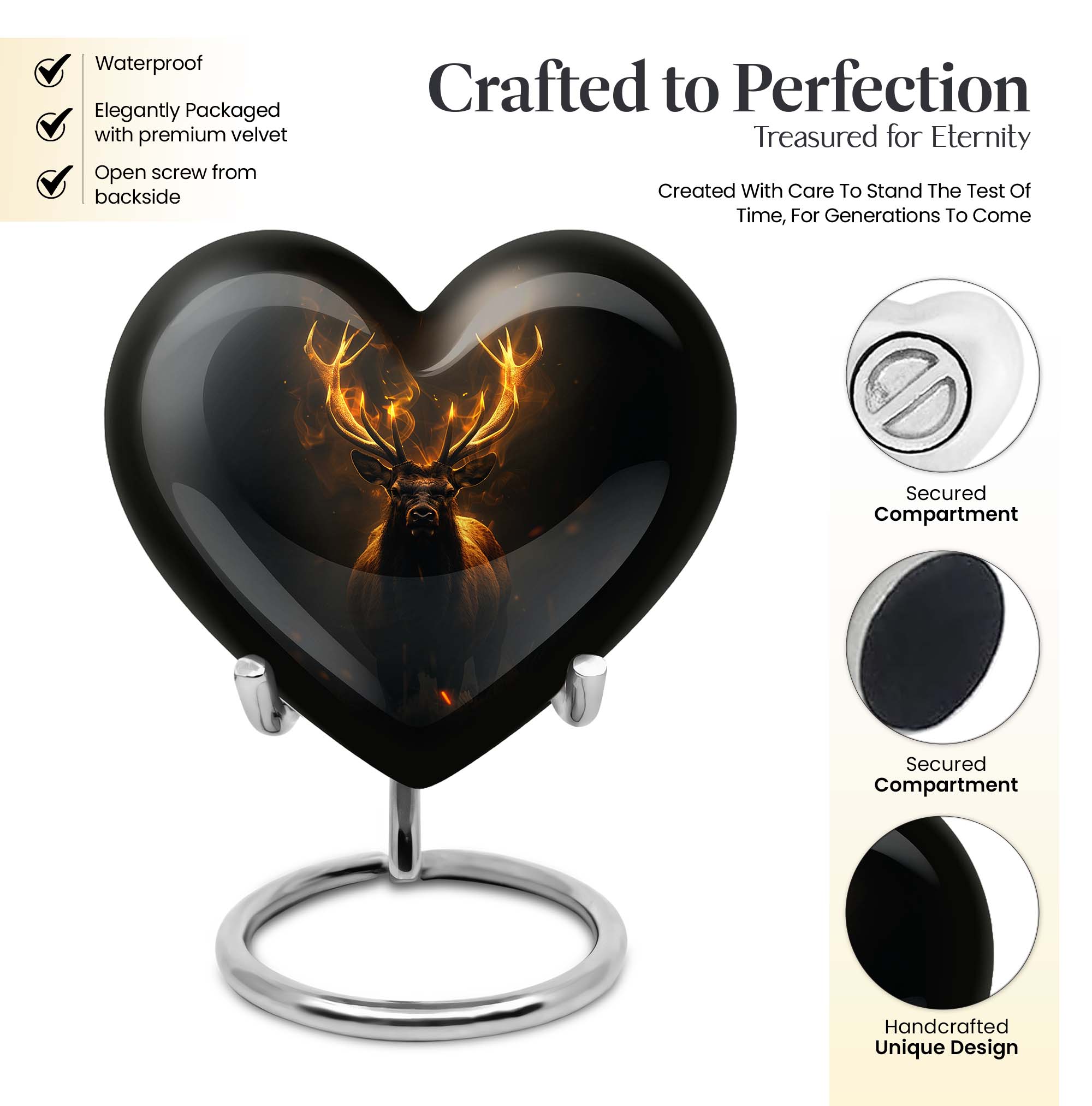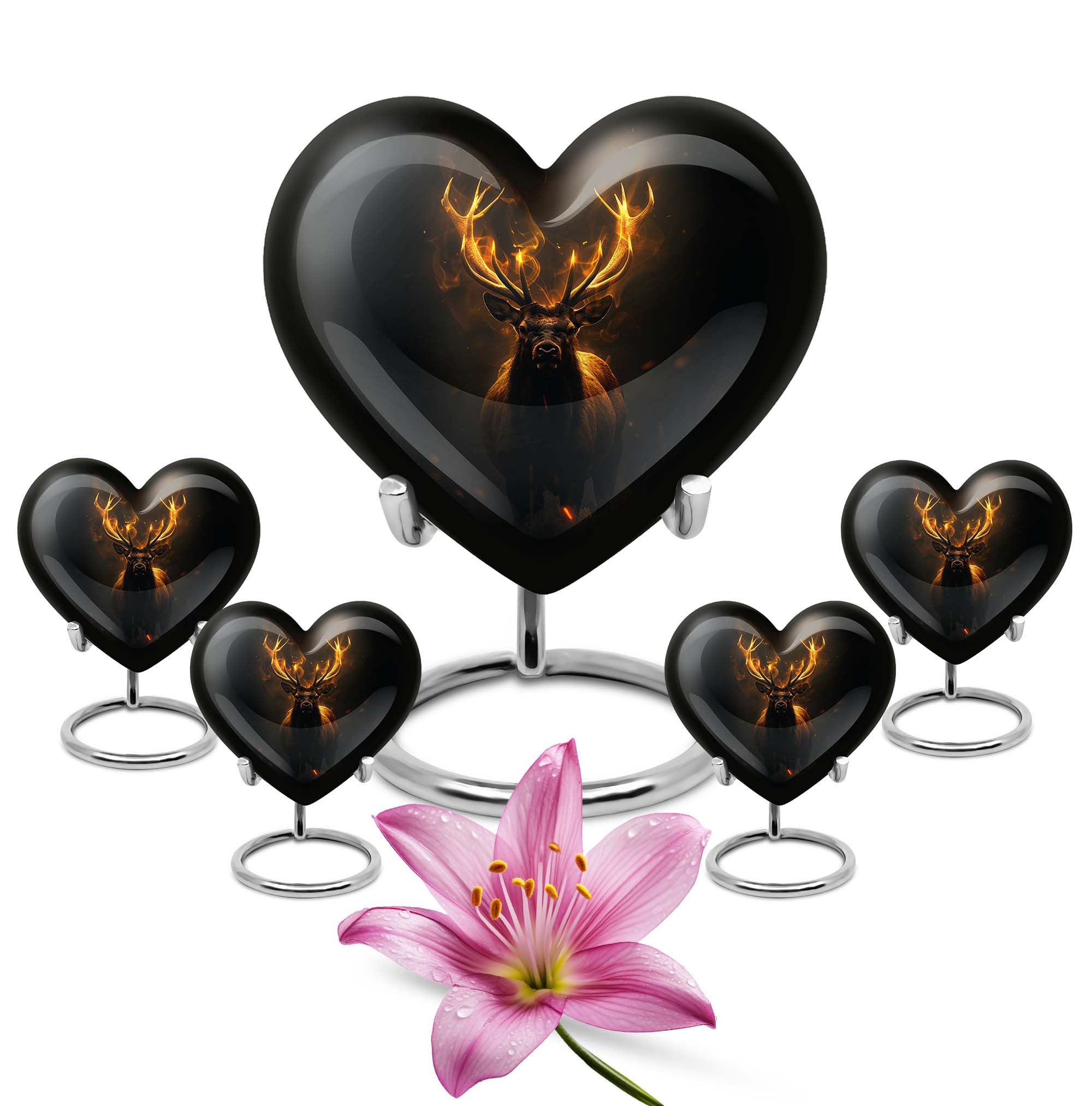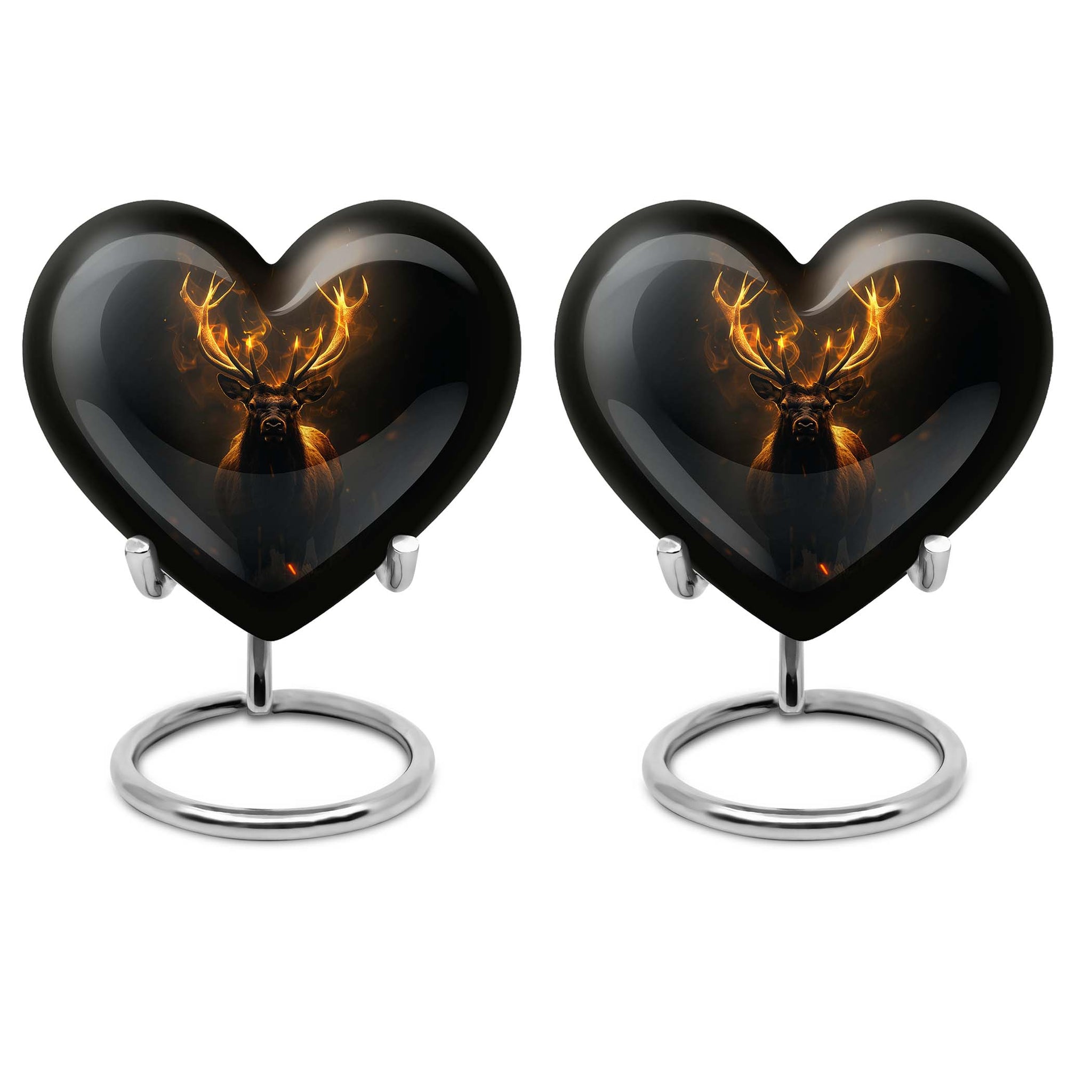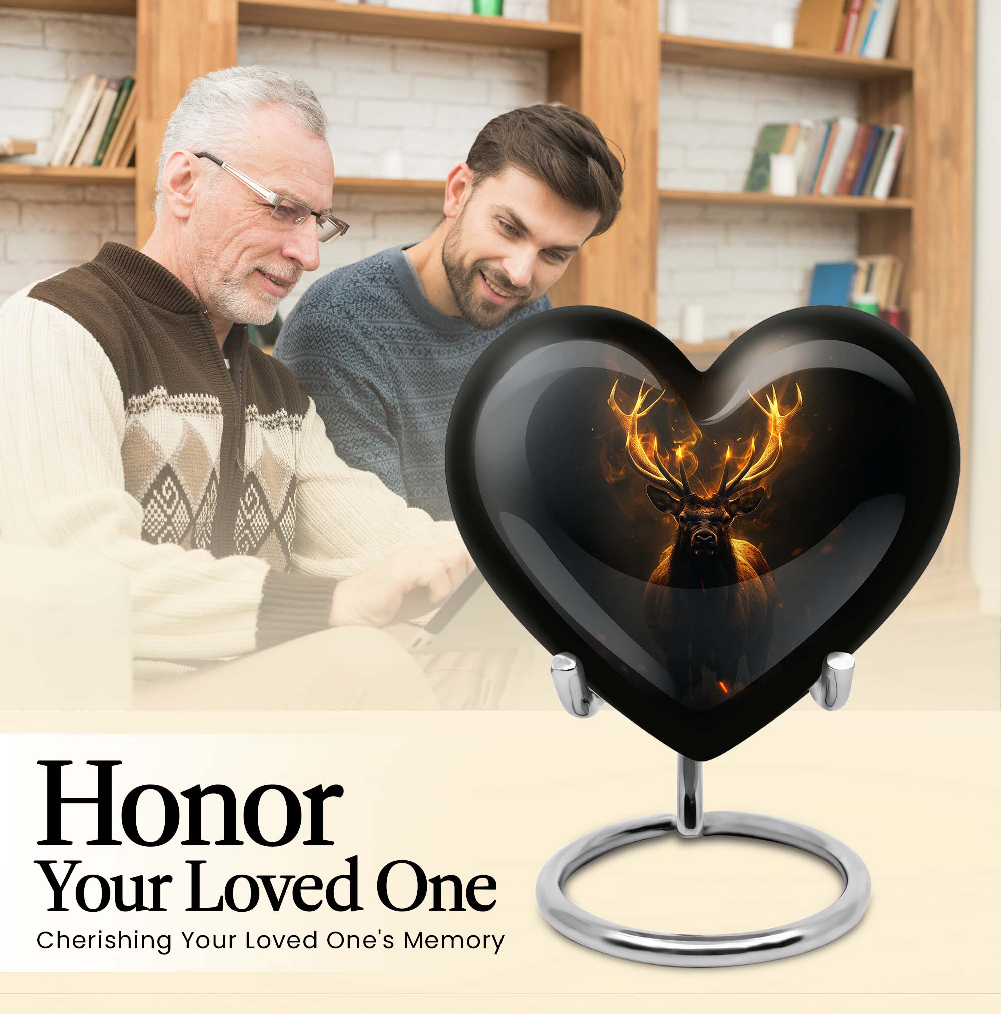 Embark on an expression of eternal love and remembrance with this stunning Heart Urn, serving as a beautiful tribute to a dearly loved one. Handcrafted from superior quality aluminium, this 10-inch deer Urn is large enough to store up to 200 cubic inches, making it an ideal burial urn for adult ashes. The stirring wolf howling theme is sure to carve a meaningful memorial. The urn uniquely comes with an additional velvet pouch, providing an alternate containment of ashes, adding an extra layer of sacredness. This urn can be personalized with engraved names, to truly manifest your connection with your cherished one. At a weight of 3.3 pounds, handling this urn ensures a sense of firm security. Whether you're seeking 'cremation urns for dad' or 'memorial adult urns, this item provides a heartfelt home for those who were so genuinely loved and yet are no longer with us physically. Adorn this breathtaking work of art as a symbol of undying love and memories that will forever live on.