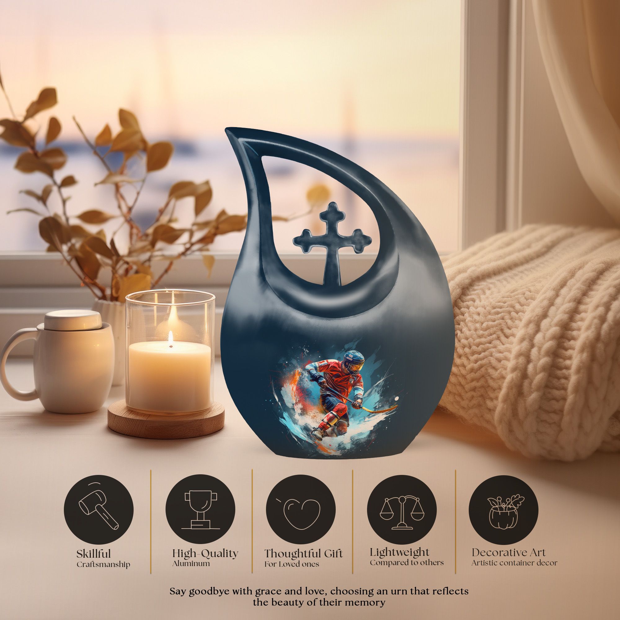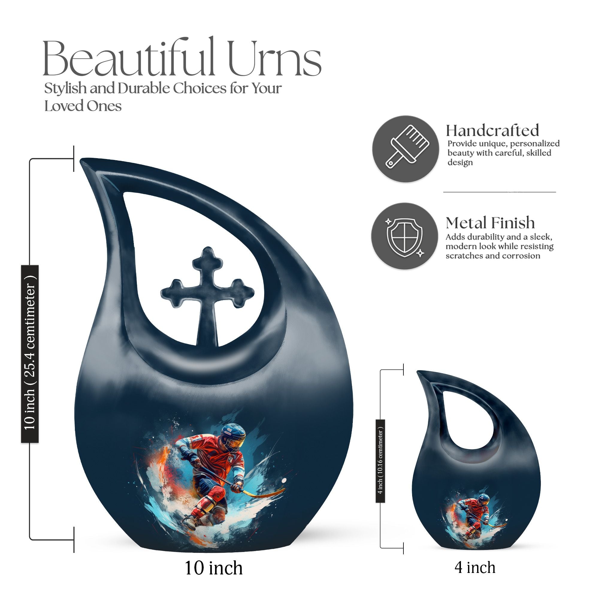 Features:• Material: Aluminium• Dimensions: Height 10 inches (Large Urn)• Capacity: 200 cubic inches• Lid: Secure screw-top lid• Design: Ice hockey–themed memorial artwork• Use: Adult Male/Female Cremation