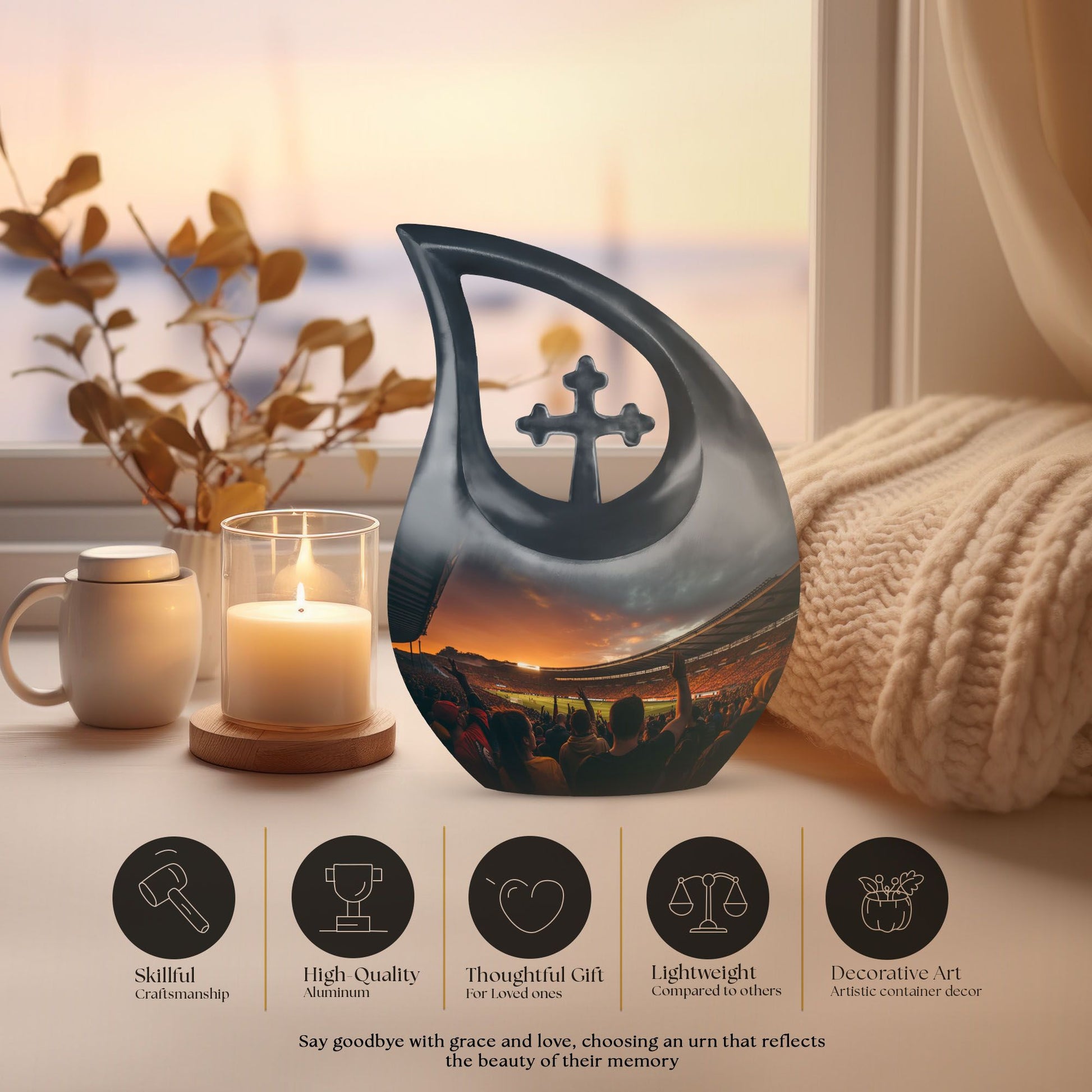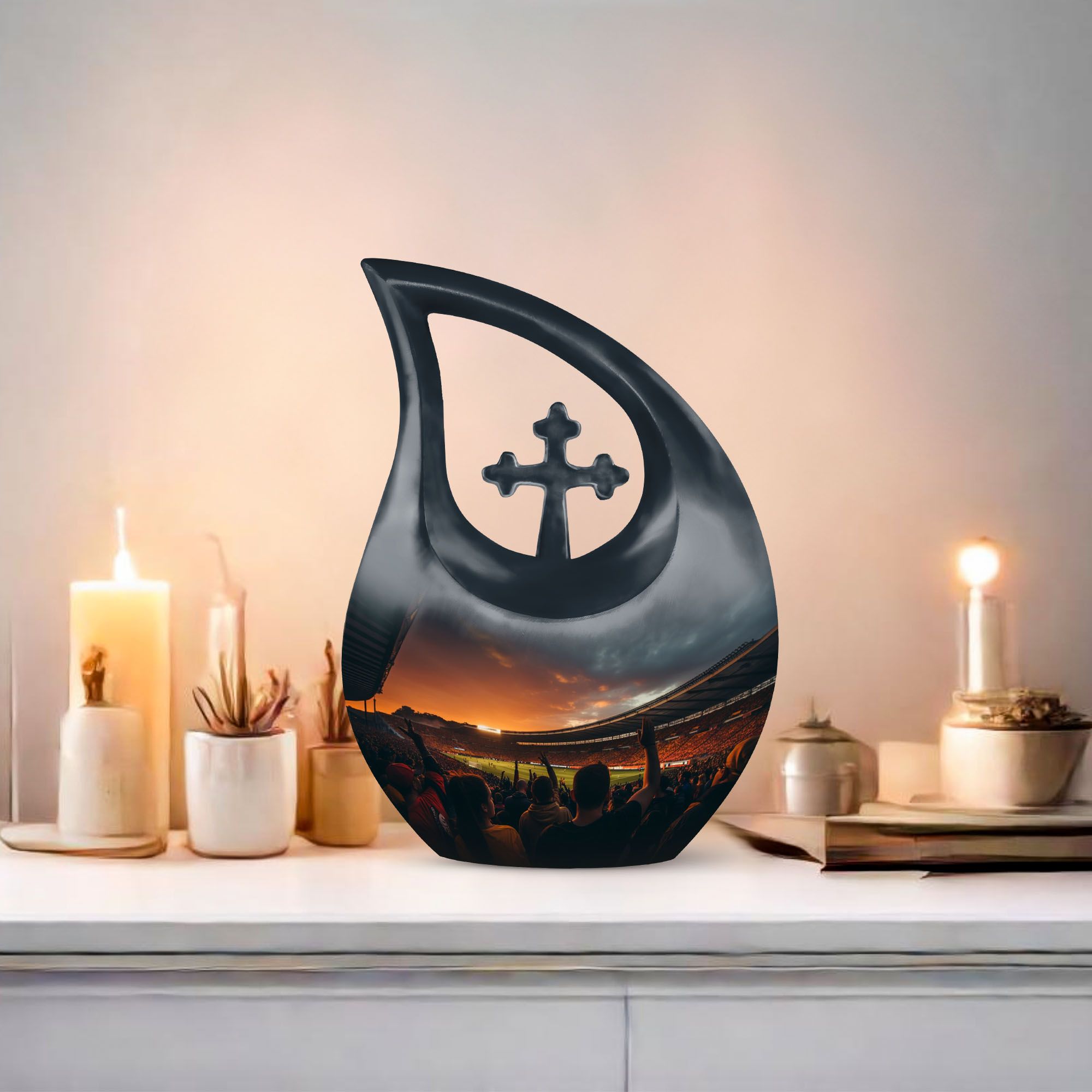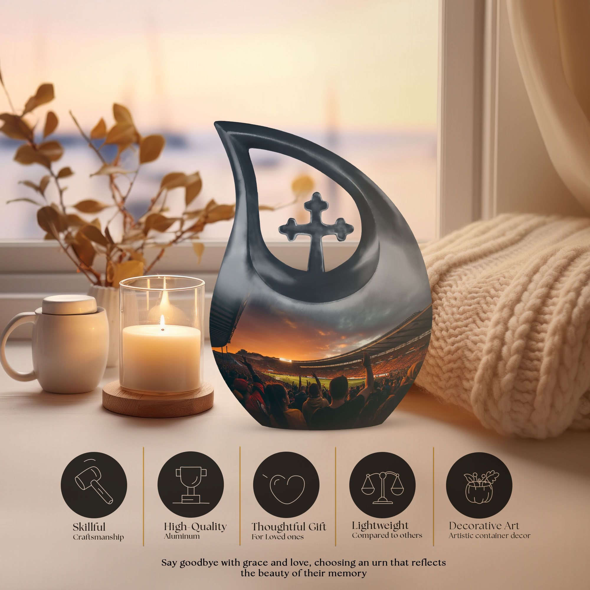 Crafted from durable aluminum, this urn features a powerful stadium-inspired design—symbolizing unity, teamwork, and unforgettable moments shared. With a 10-inch height and a 200-cubic-inch capacity, it is suitable for adult ashes and is compatible with both home memorial display and burial needs. Whether you're looking for a cremation urn for humans, cremation urn ashes, or a versatile option paired with cremation urn for ashes small or cremation urns for adult ashes small, this piece ensures long-lasting security through its screw-top lid.