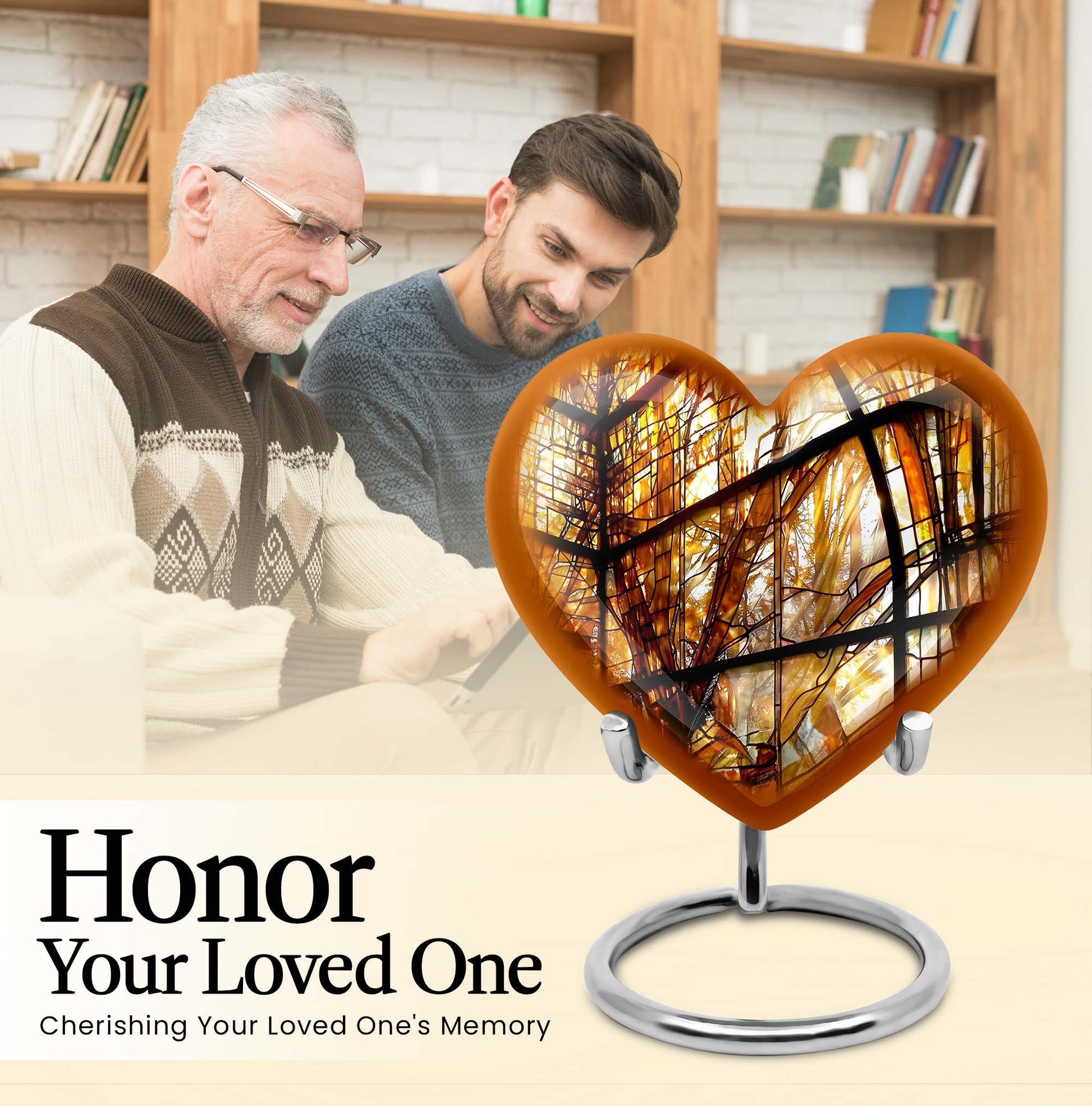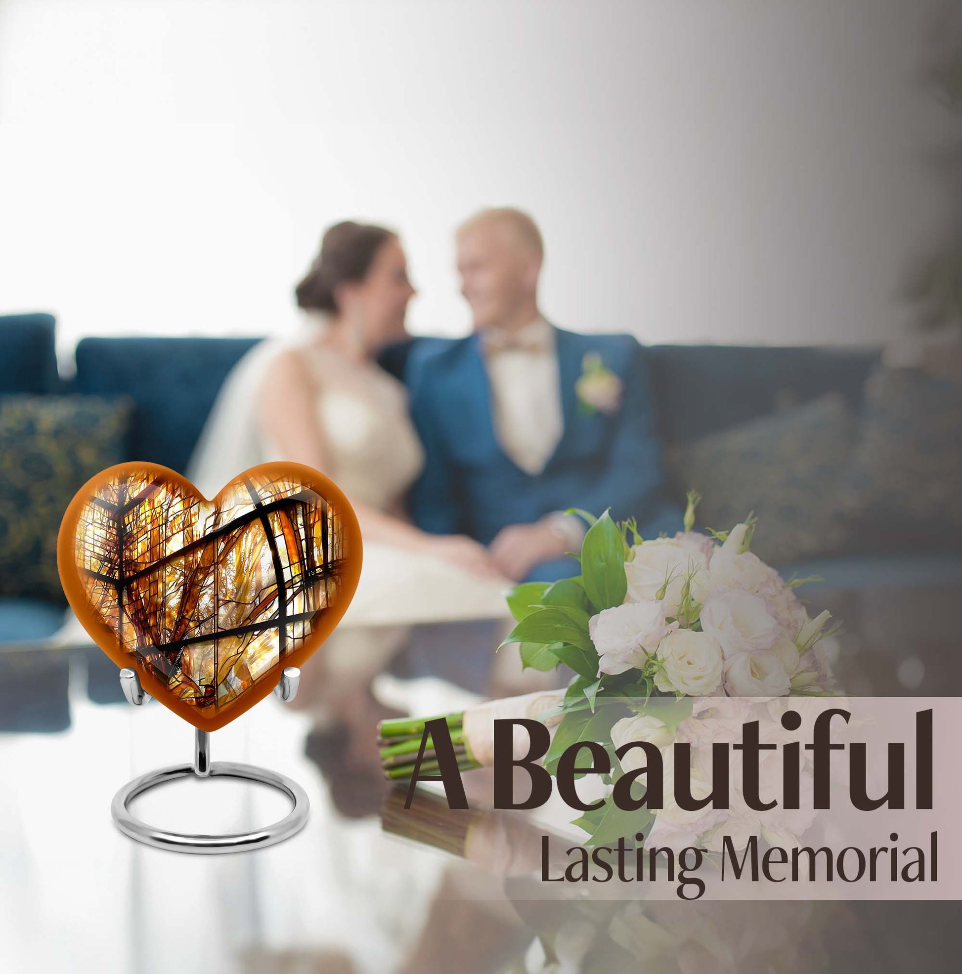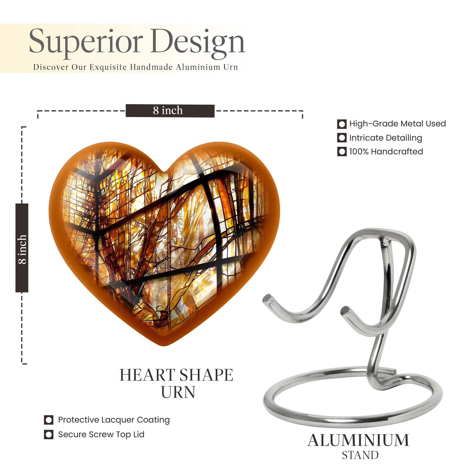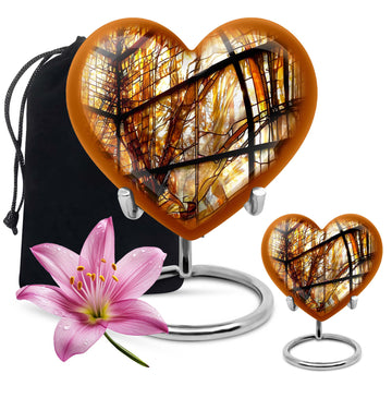 Honor the memory of your loved ones with this elegant 10-inch, heart-shaped stained glass urn for funeral ashes. Weighing just 3.3 pounds, this aluminium urn provides room for up to 200 cubic inches worth of ashes. Its attractive abstract theme adds a unique touch to any memorial ceremony. Apart from its beautiful aesthetic, this model also offers a personal touch with the option to engrave names onto it. This offering is particularly suited to men, given the prioritized touch in the artistic detail, positioning it as a fitting tribute. It also convenient to handle with a velvet pouch included in the package for easy containment of ashes. An ideal addition under the category of 'memorial urns,' customers can search using terms like 'stained glass urn,' 'funeral urn,' 'large urns,' or 'metal urn.' Offering peace of mind, this urn balances its unique artistic appeal with sacred significance, making it an exquisite home for treasured remains.