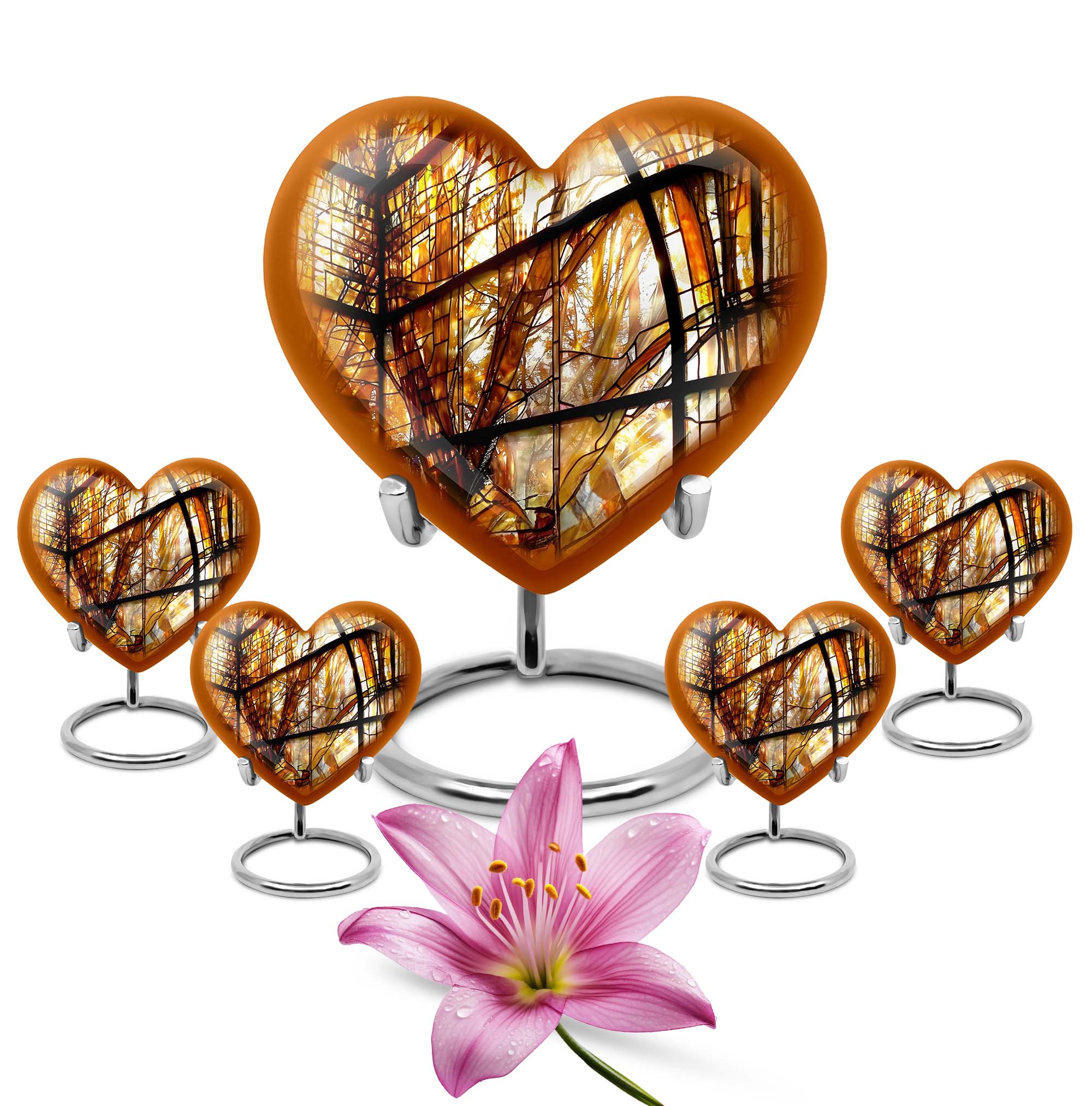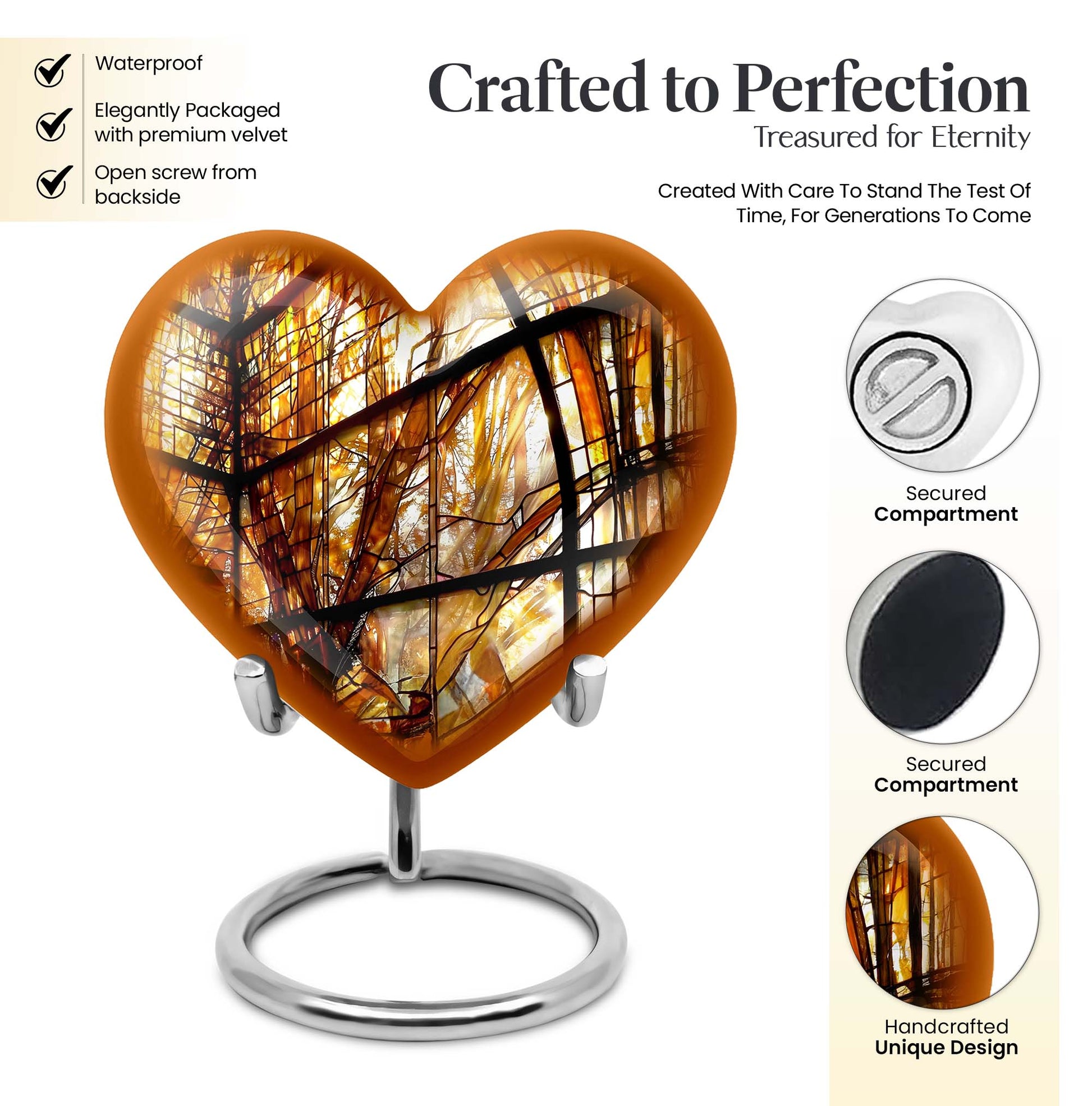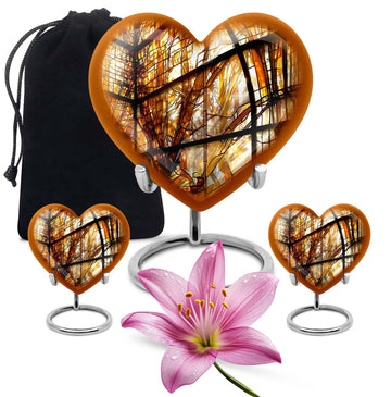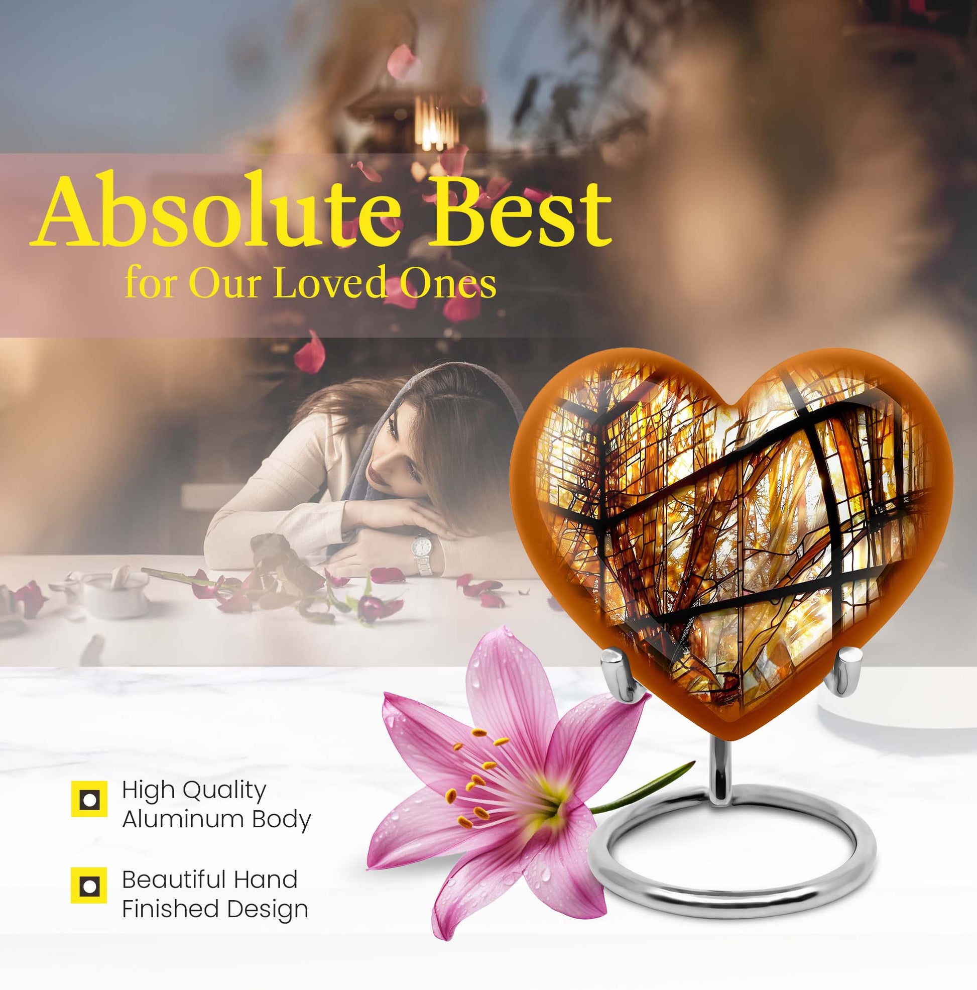 Honor the memory of your loved ones with this elegant 10-inch, heart-shaped stained glass urn for funeral ashes. Weighing just 3.3 pounds, this aluminium urn provides room for up to 200 cubic inches worth of ashes. Its attractive abstract theme adds a unique touch to any memorial ceremony. Apart from its beautiful aesthetic, this model also offers a personal touch with the option to engrave names onto it. This offering is particularly suited to men, given the prioritized touch in the artistic detail, positioning it as a fitting tribute. It also convenient to handle with a velvet pouch included in the package for easy containment of ashes. An ideal addition under the category of 'memorial urns,' customers can search using terms like 'stained glass urn,' 'funeral urn,' 'large urns,' or 'metal urn.' Offering peace of mind, this urn balances its unique artistic appeal with sacred significance, making it an exquisite home for treasured remains.