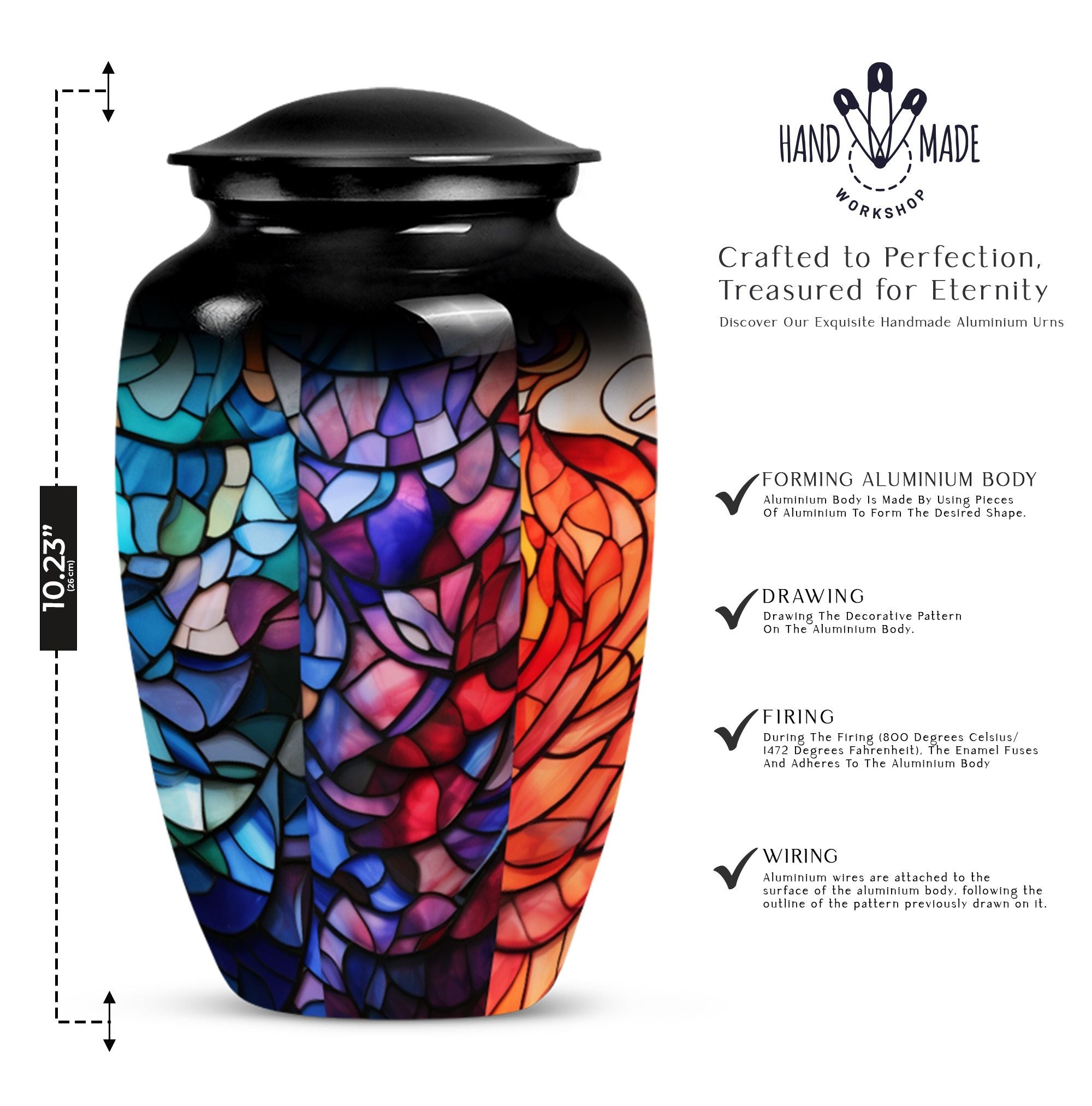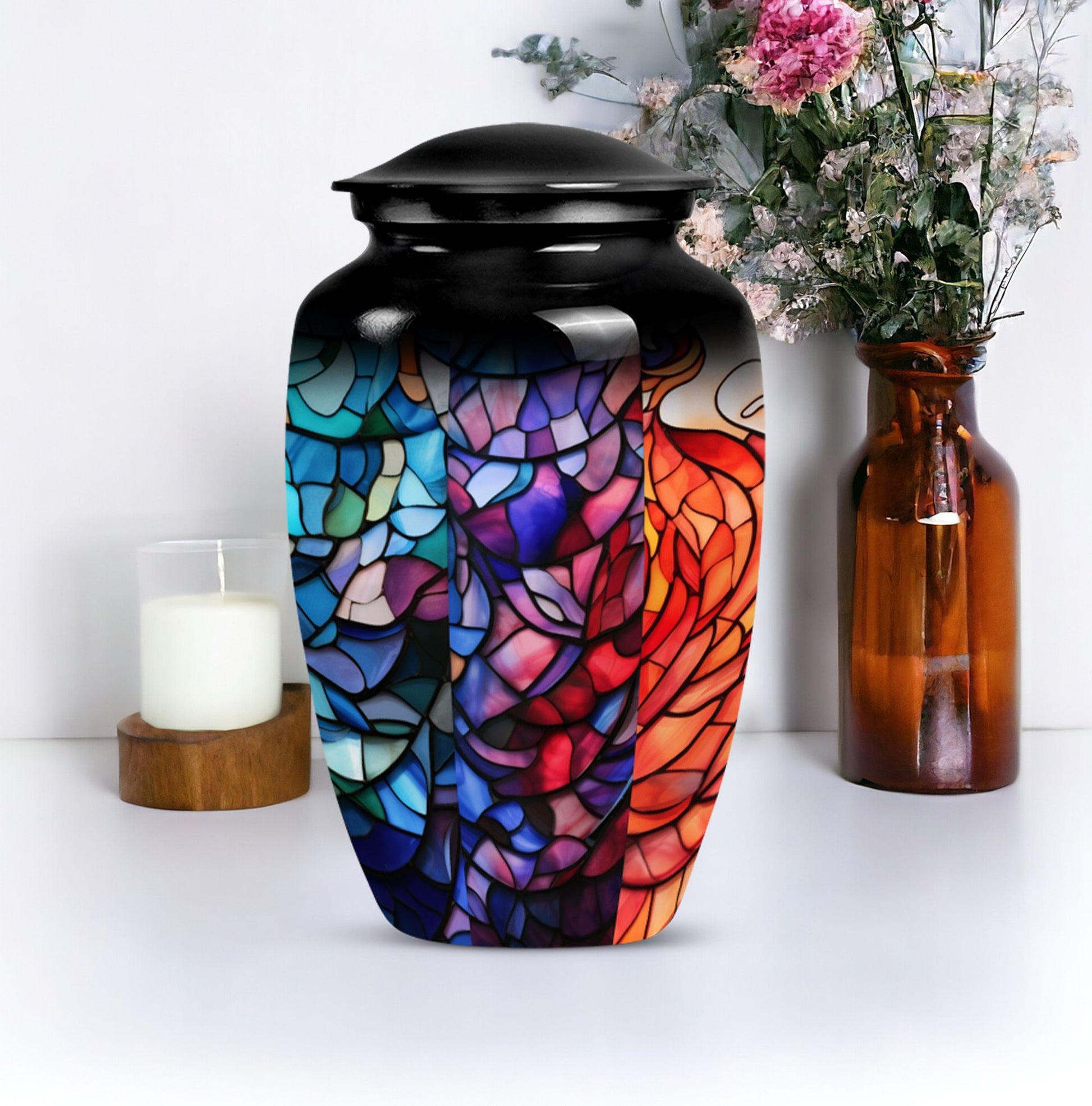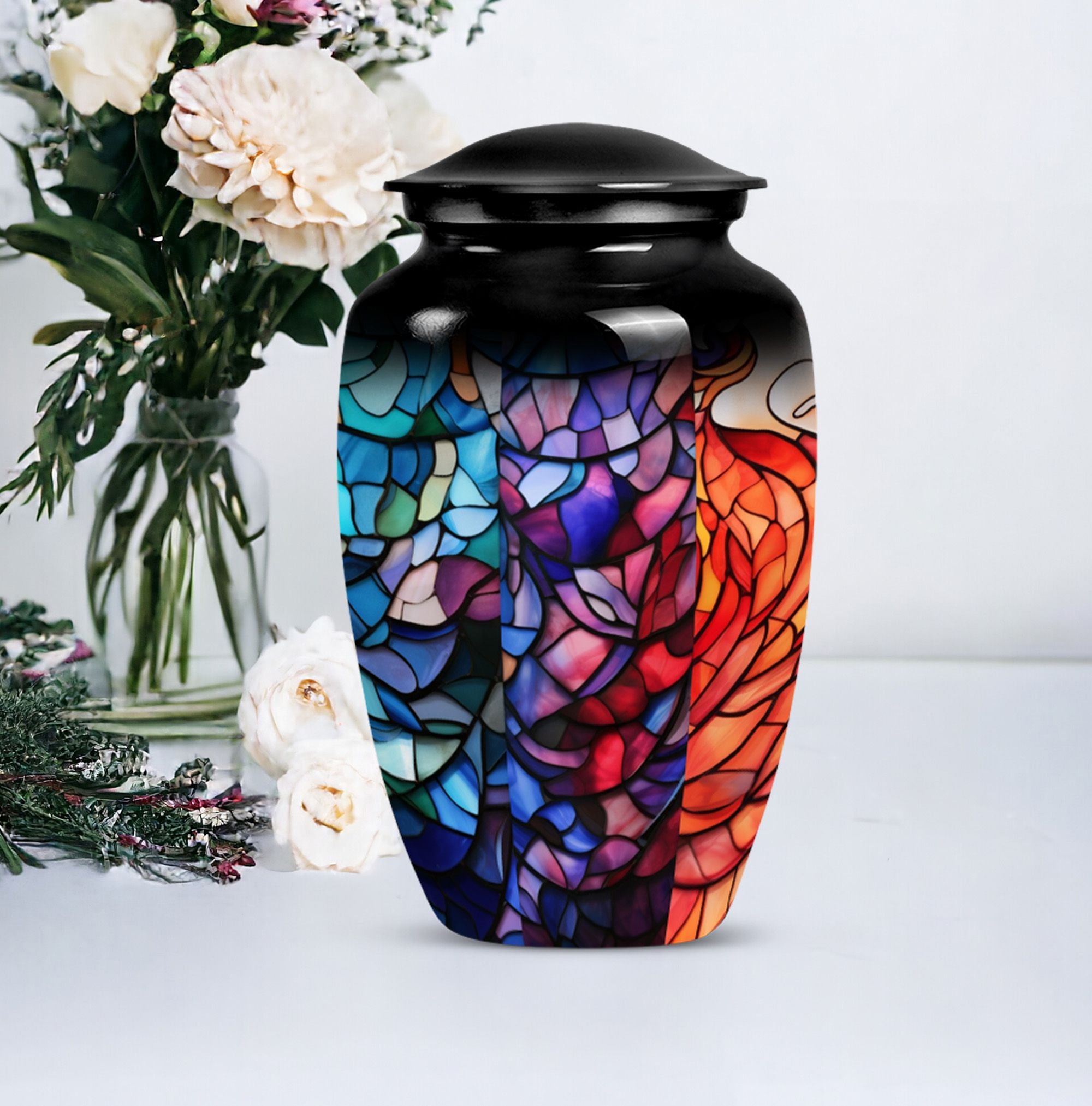 Crafted with precision and care, this urn combines artistic stained-glass design with durable construction to ensure lasting beauty. Its smooth finish and secure structure make it perfect among urns for ground burial. Made from high-quality aluminum, it offers both strength and elegance, suitable for use as cremation urns for human ashes adult burial. With its vibrant yet dignified stained-glass pattern, it’s not only functional but also a true piece of art, offering peace of mind and comfort in times of grief.