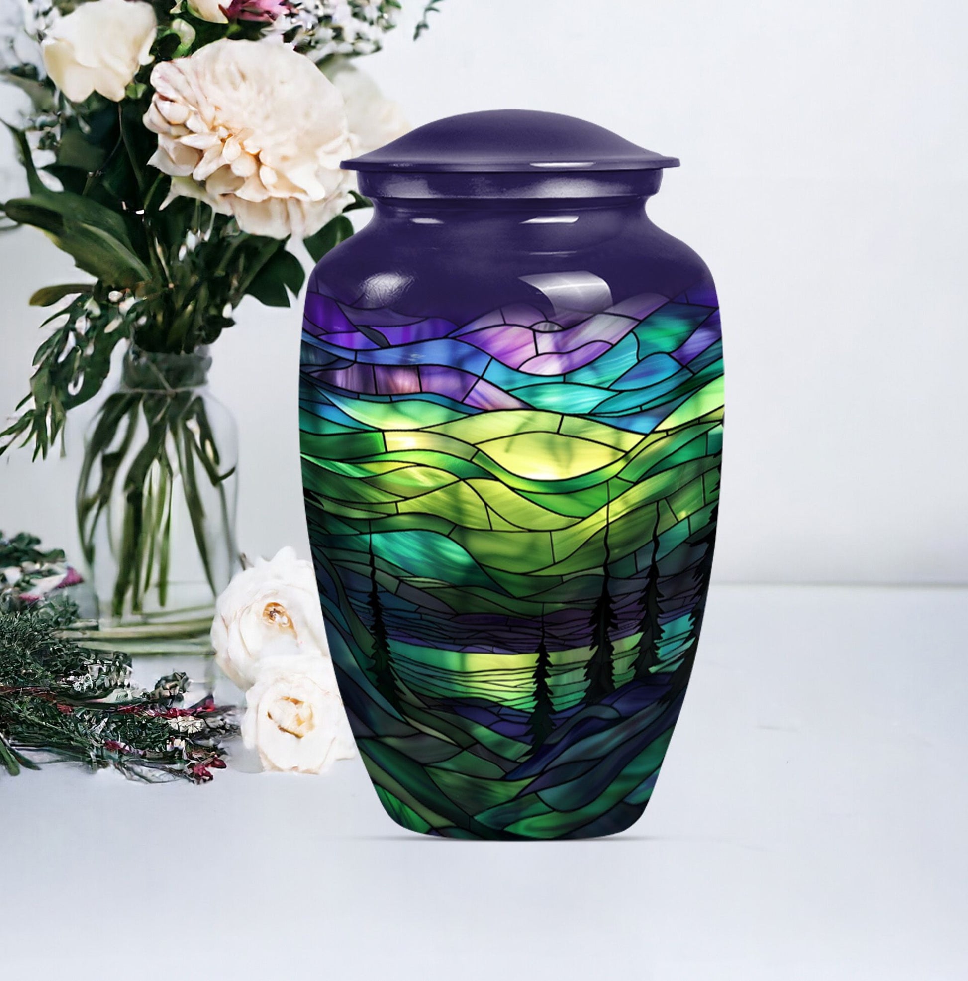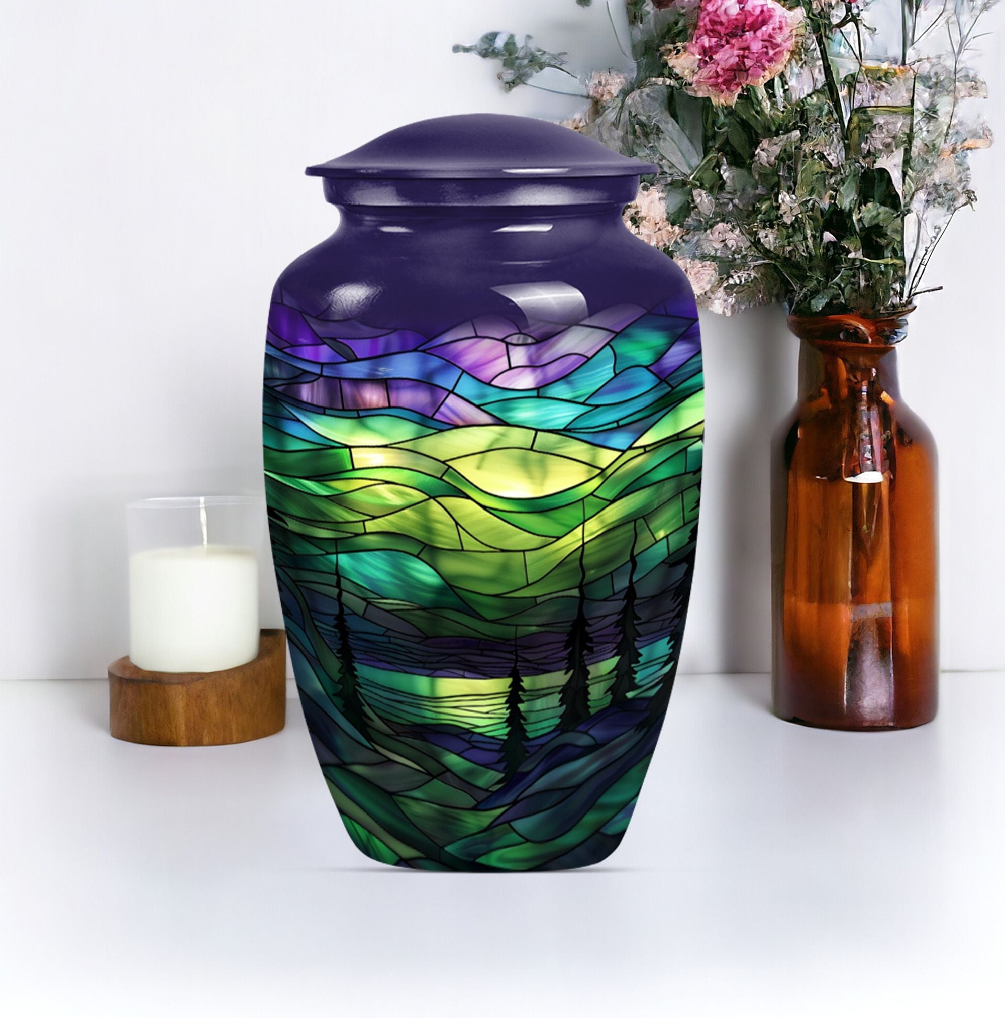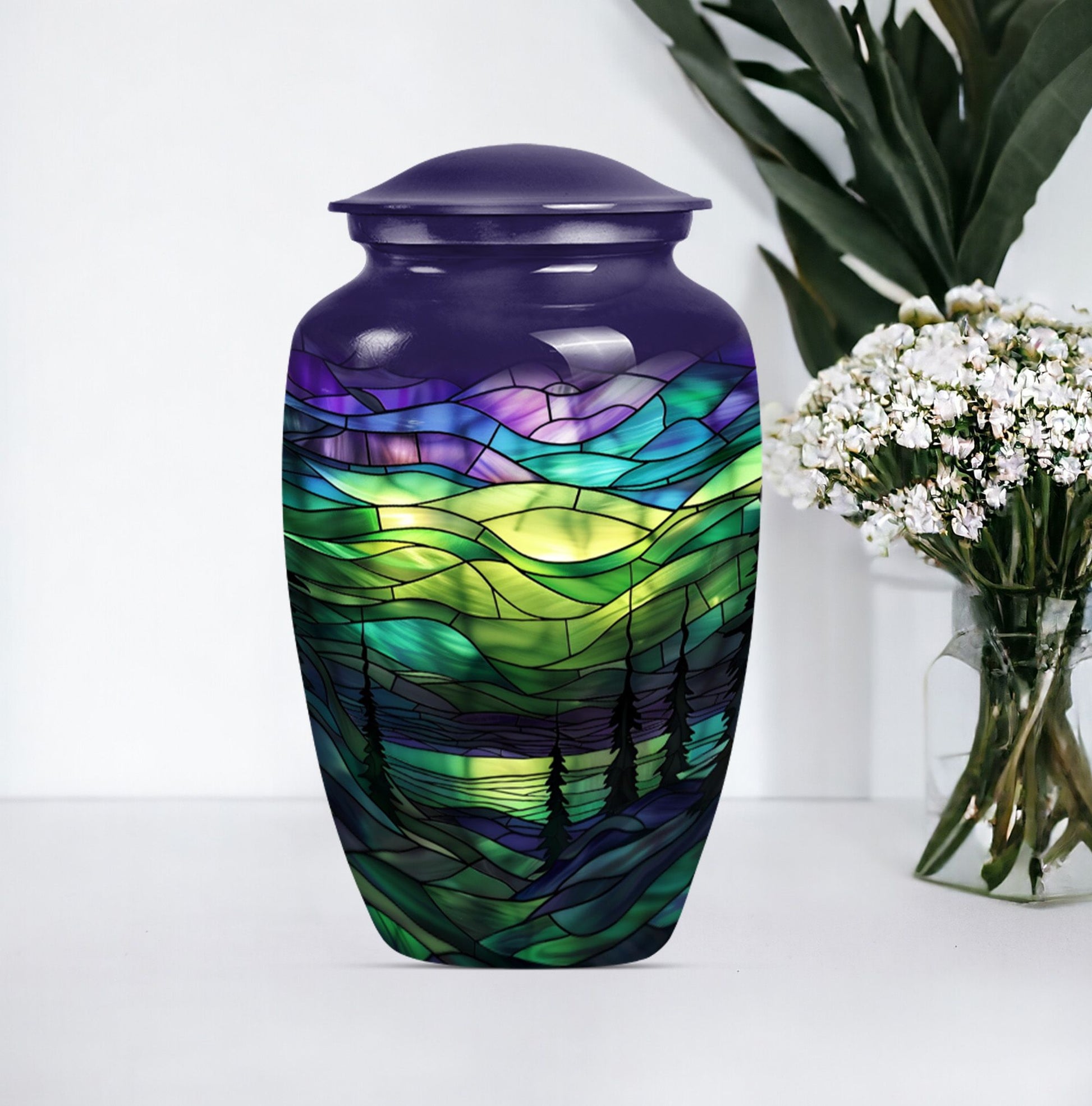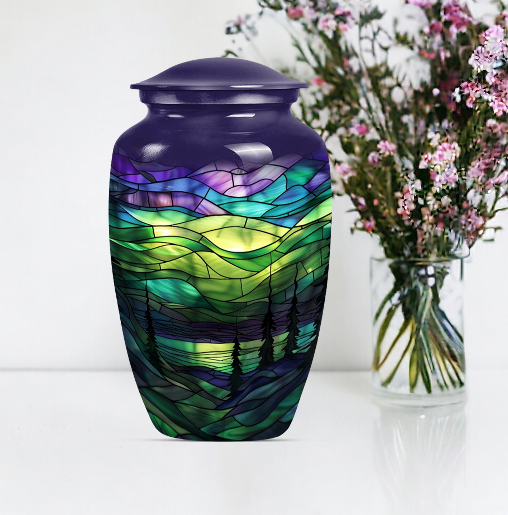 Discover exceptional beauty in our specially crafted Purple Meadow stained glass Urn. This burial urn, intended for an adult female, is an elegant and meaningful tribute to your loved one's life. With a height of 10 inches and a weight of 3.3 pounds, this aluminium urn embodies a classic form of timeless elegance. Its large capacity of 200 cubic inches ensures that it can securely contain the remains of your beloved. The urn comes with a velvet pouch that delicately encloses the ashes, making it a perfect memorial gift. Personalize this cremation urn by engraving names, adding a touch of sentimentality to its aesthetic value. Our Purple Meadow theme adds a soothing touch, paying tribute to the vibrant life led by your cherished one. This product is available in the English language locale. Large urns, funeral urns for adult women, and cremation urn funeral urns for adult ash are popular search terms related to this product. Truly, a metal urn for ashes adult male or female that is an epitome of grace and reverence.