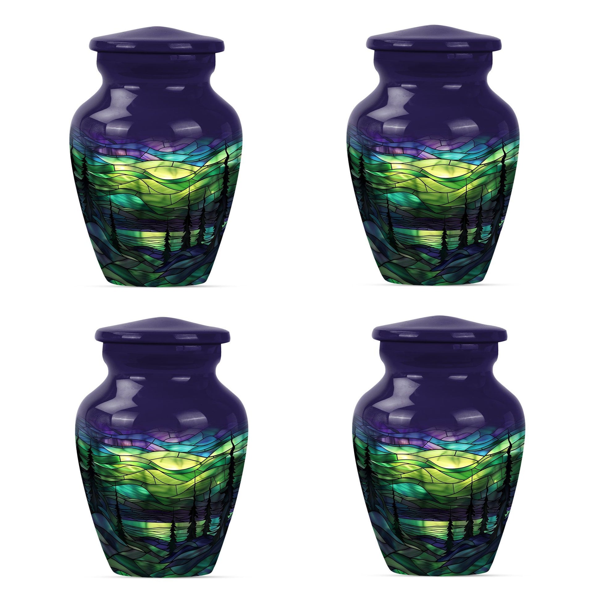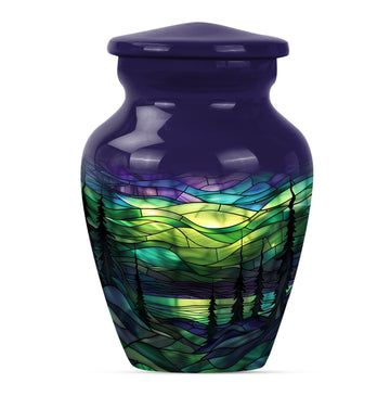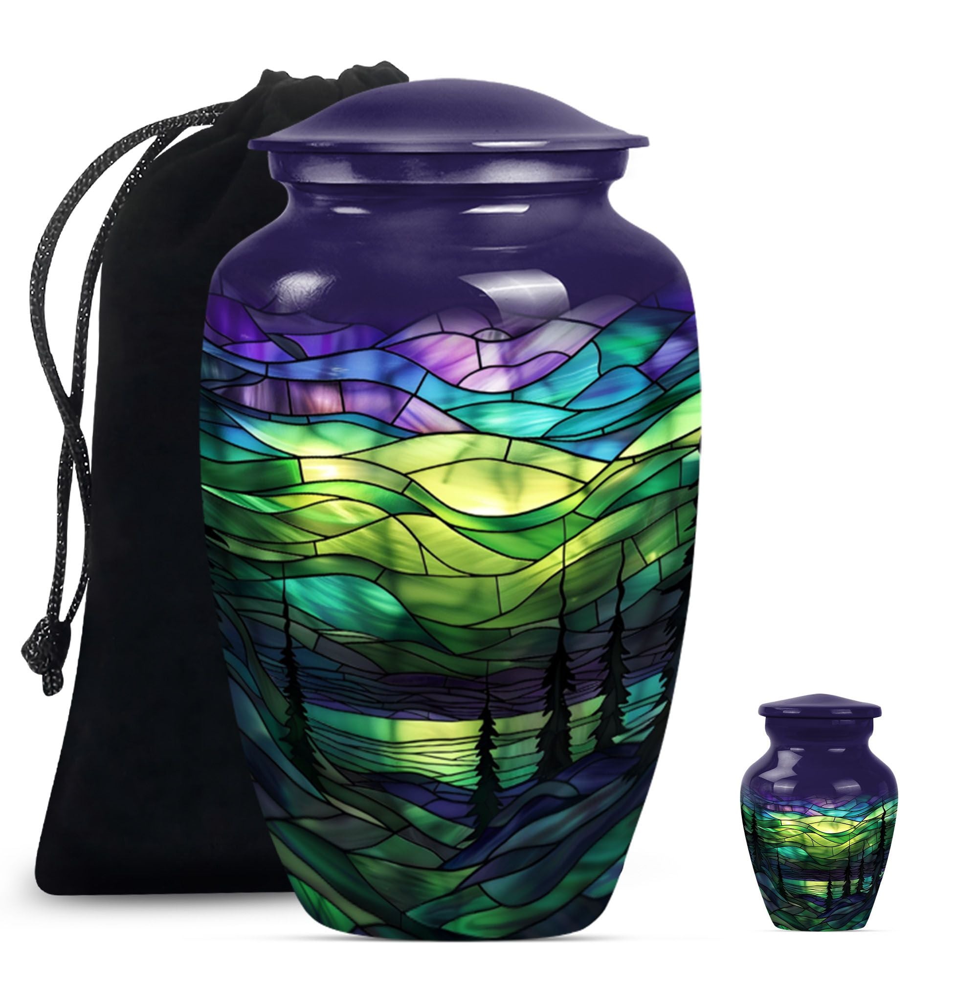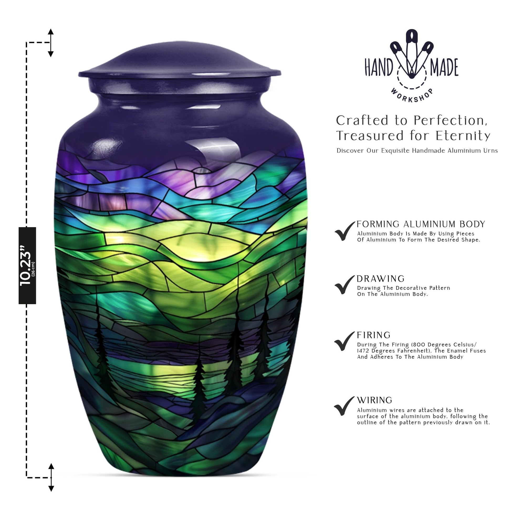 Discover exceptional beauty in our specially crafted Purple Meadow stained glass Urn. This burial urn, intended for an adult female, is an elegant and meaningful tribute to your loved one's life. With a height of 10 inches and a weight of 3.3 pounds, this aluminium urn embodies a classic form of timeless elegance. Its large capacity of 200 cubic inches ensures that it can securely contain the remains of your beloved. The urn comes with a velvet pouch that delicately encloses the ashes, making it a perfect memorial gift. Personalize this cremation urn by engraving names, adding a touch of sentimentality to its aesthetic value. Our Purple Meadow theme adds a soothing touch, paying tribute to the vibrant life led by your cherished one. This product is available in the English language locale. Large urns, funeral urns for adult women, and cremation urn funeral urns for adult ash are popular search terms related to this product. Truly, a metal urn for ashes adult male or female that is an epitome of grace and reverence.