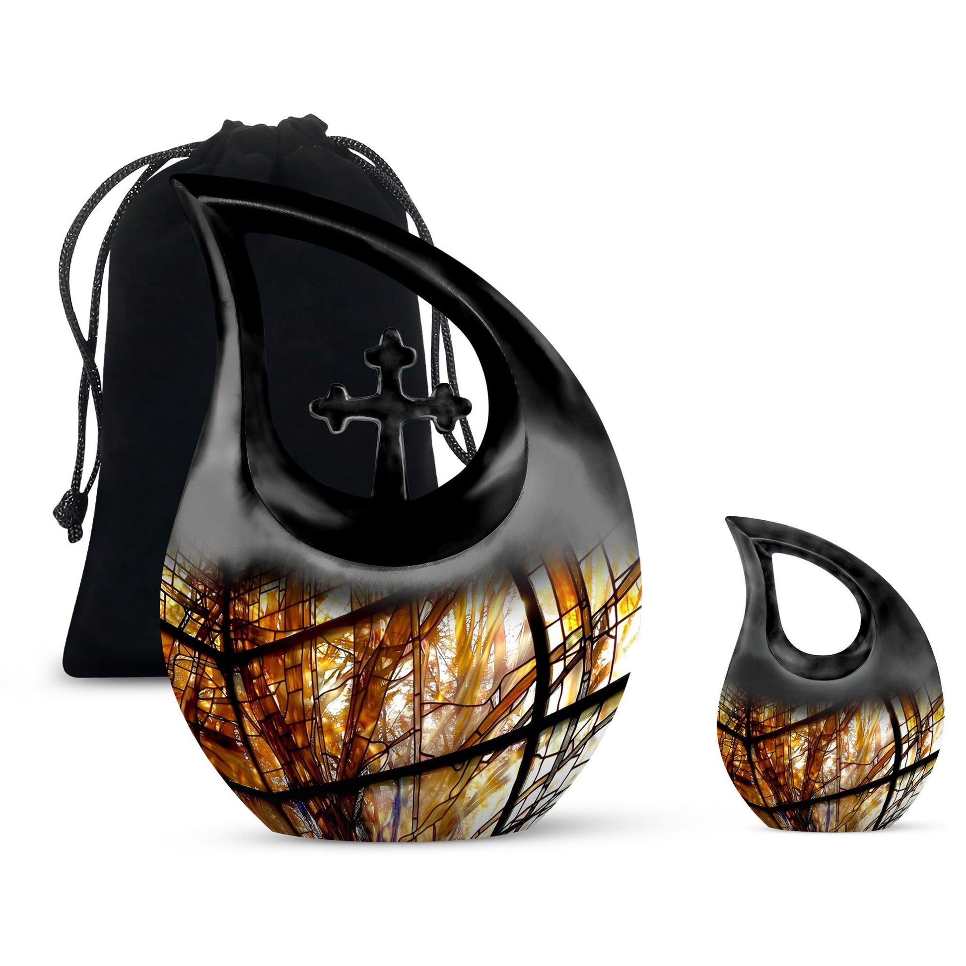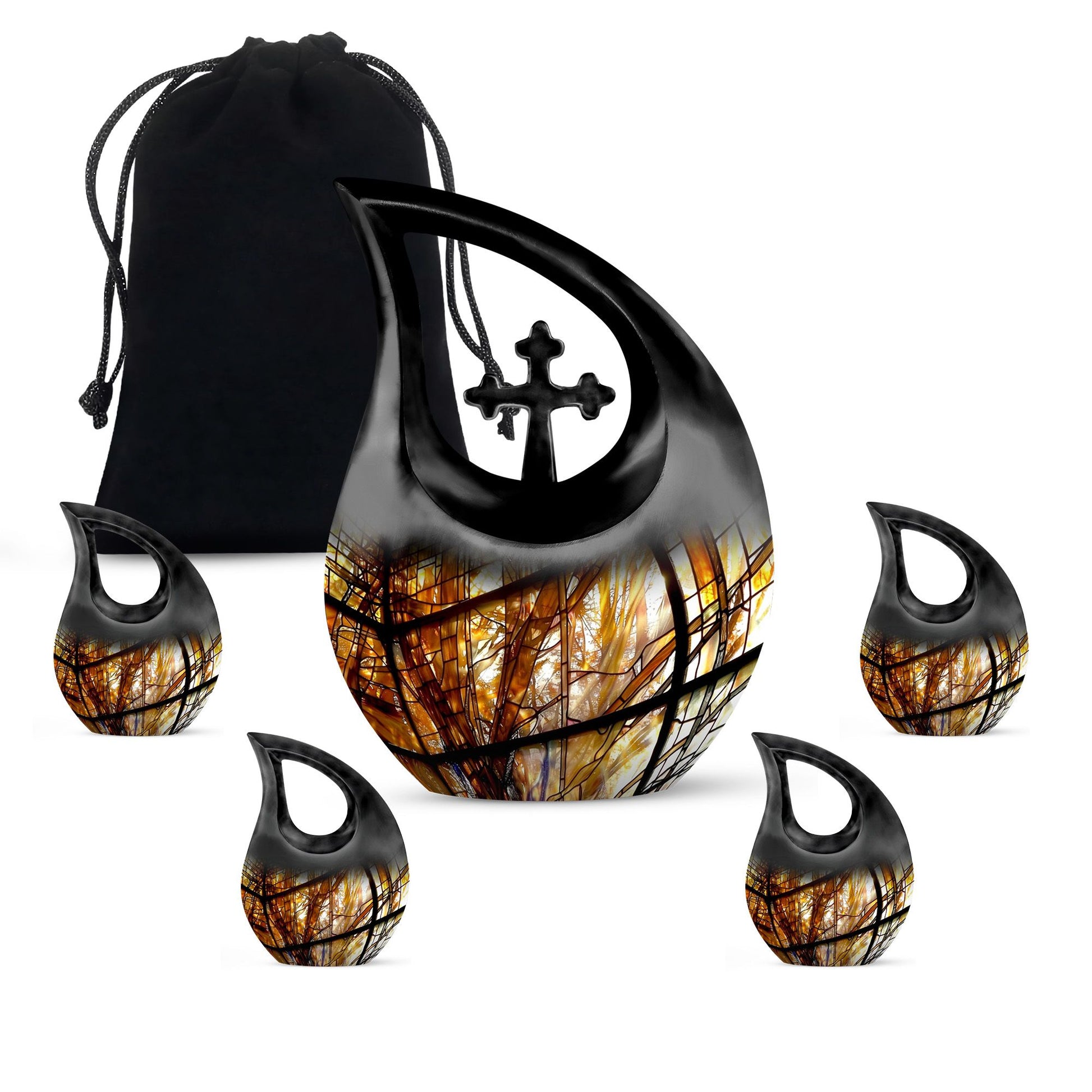 Coordinated keepsake urns allow each family member to hold a small portion of ashes, complementing the main stained-glass design and creating a meaningful memorial set.