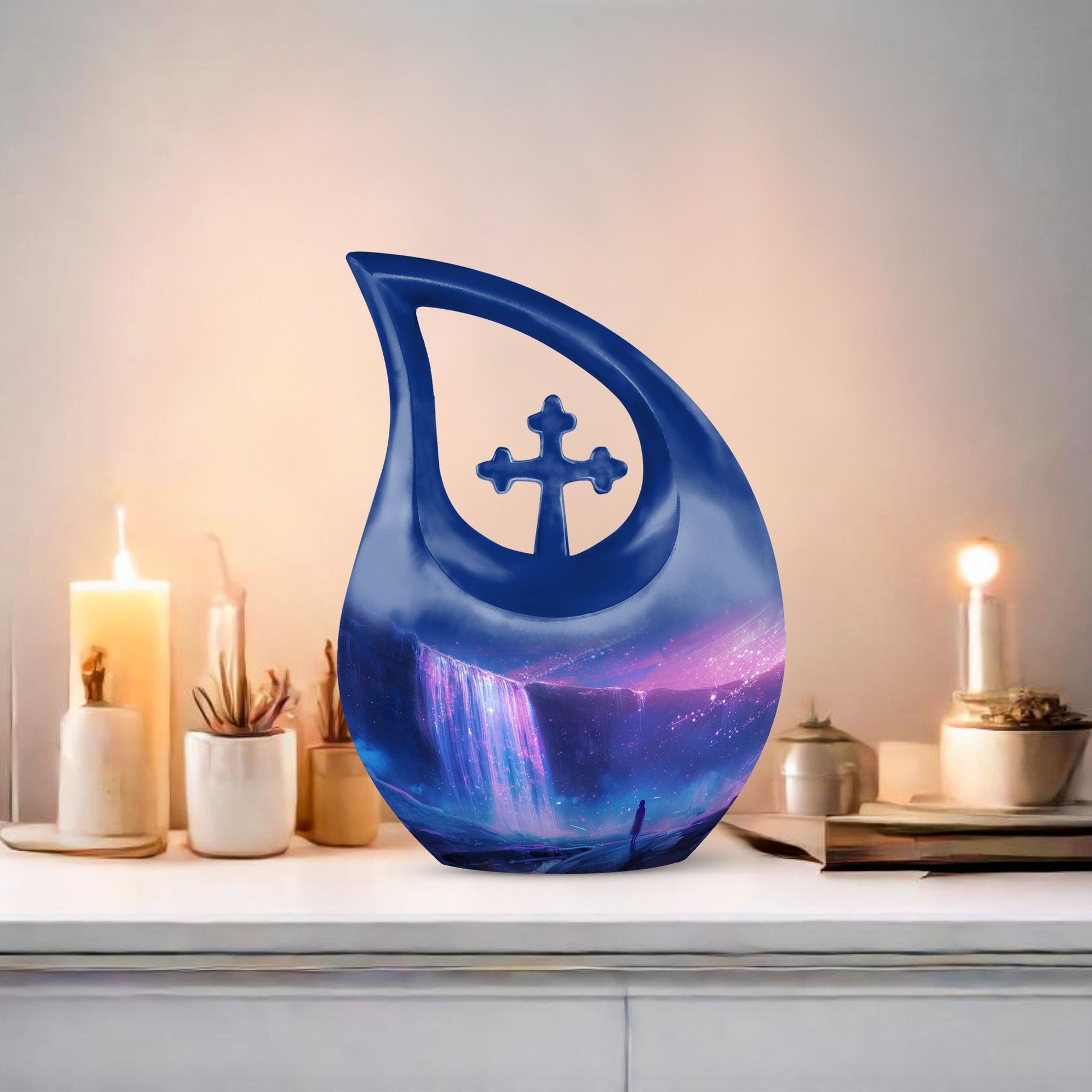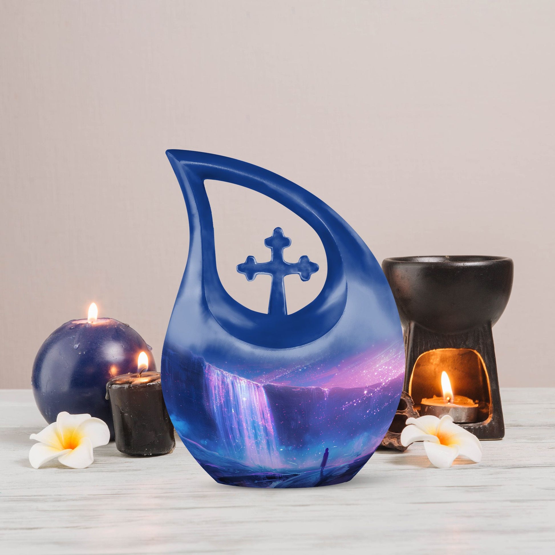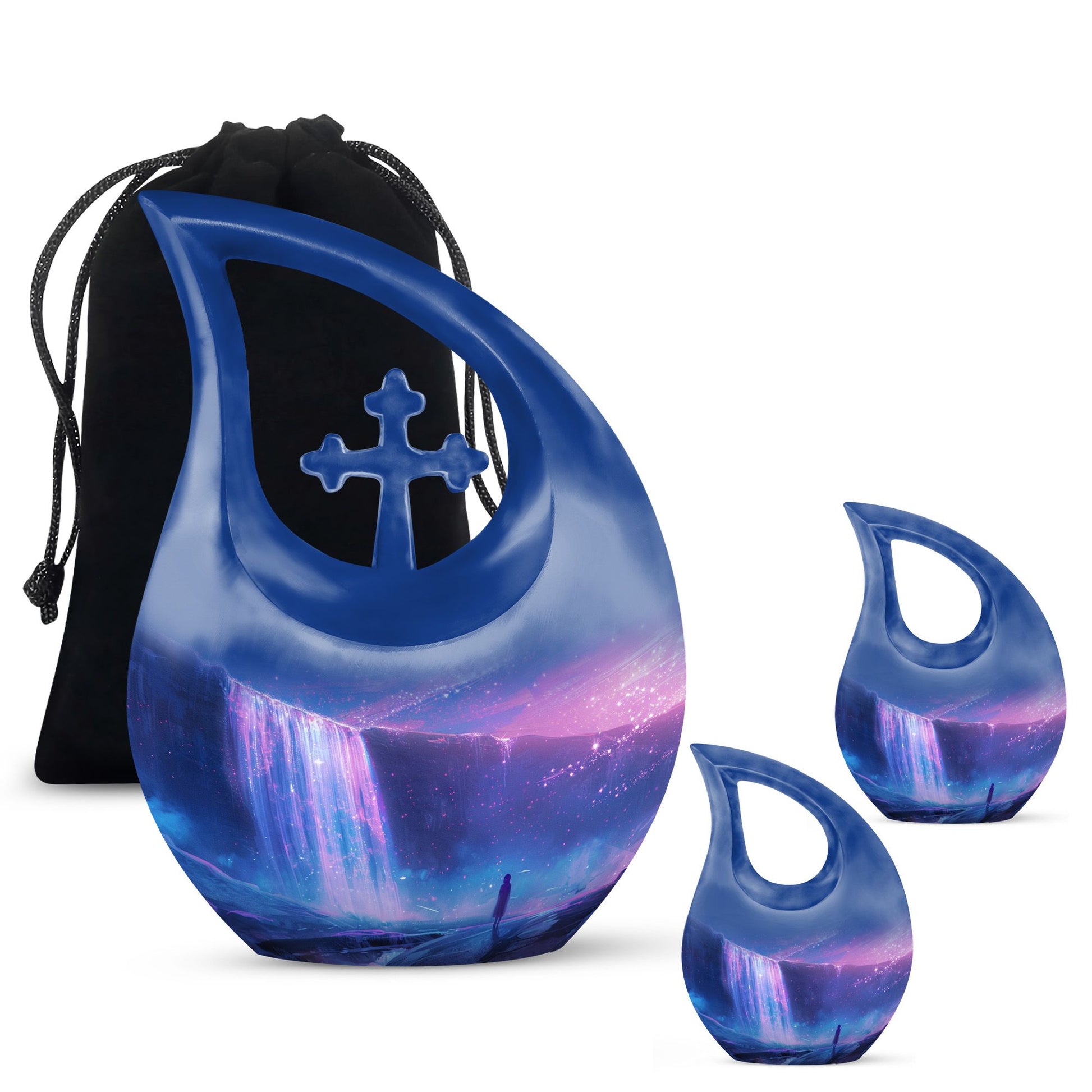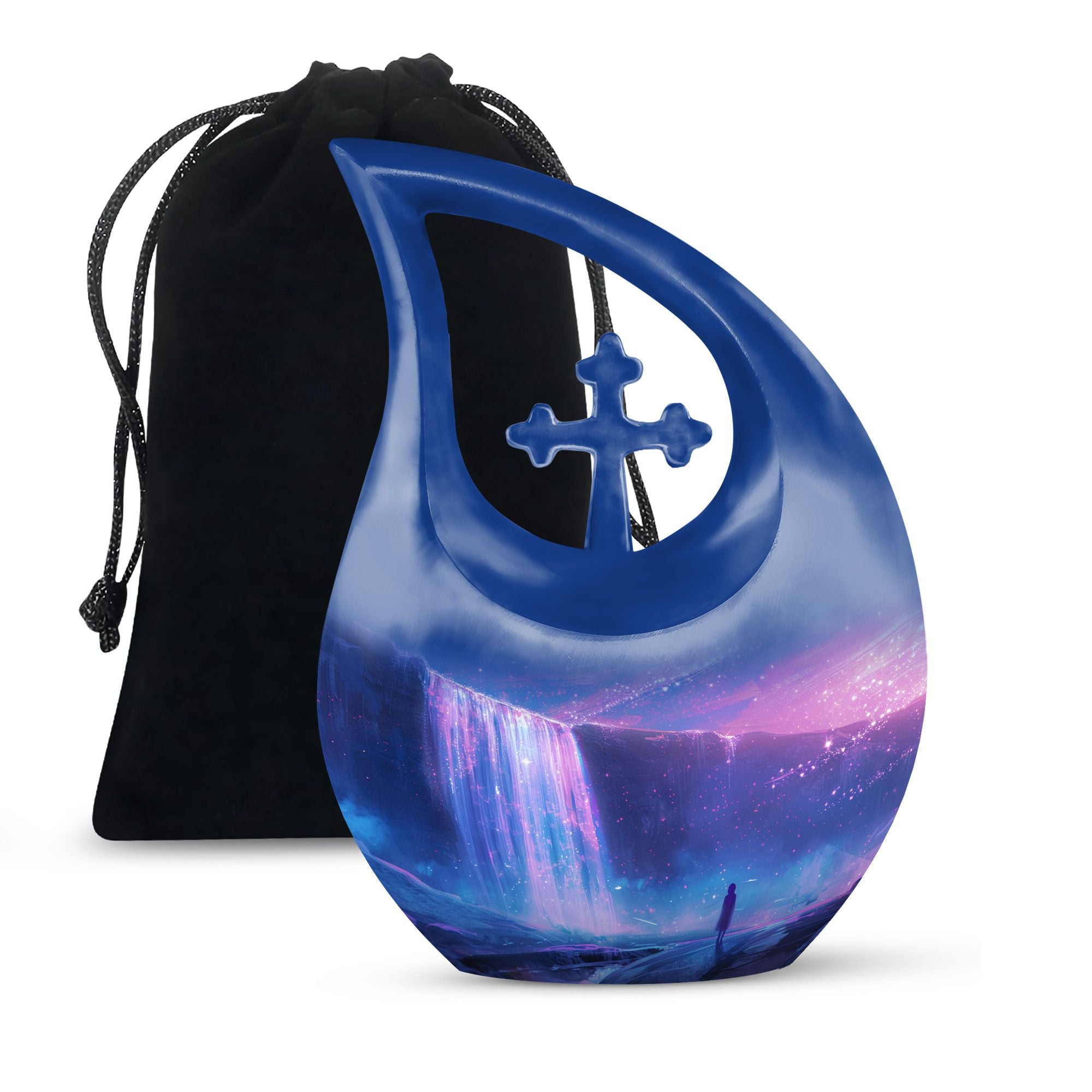 Discover purity and peace when you choose the 'Starlight Over The Urn', a beautiful memorial piece in our range of large Urns. Crafted from durable Aluminium, this uniquely personalized urn weighs a substantial 3.3 pounds and stands proud at 10 inches in height. The one-of-a-kind 'Cross Drop' urn design signifies a beacon of faith, offering comfort and solace during challenging times. The urn caters to practical needs too, with a generous capacity of 200 cubic inches and a complimentary velvet pouch for dignified containment of ashes. There's also an option to make this urn even more special - simply personalize it with engraved names. So whether you're searching for small urns for Human ashes, or Funeral urns for ashes, our 'Starlight Over The Urn' is an affordable, tasteful choice - a precious starlight to cherish forever.
