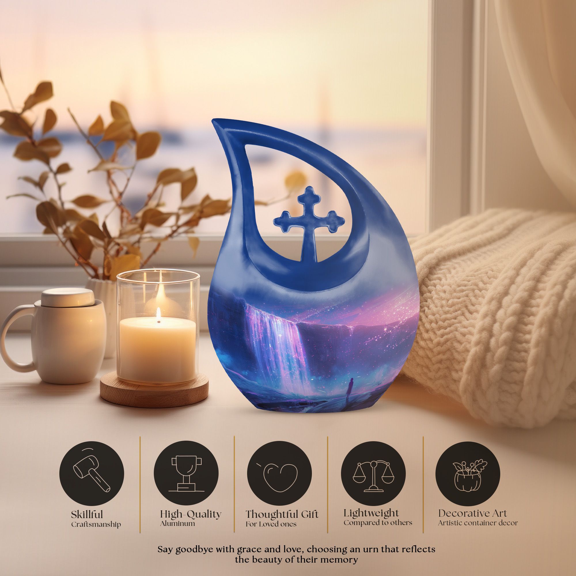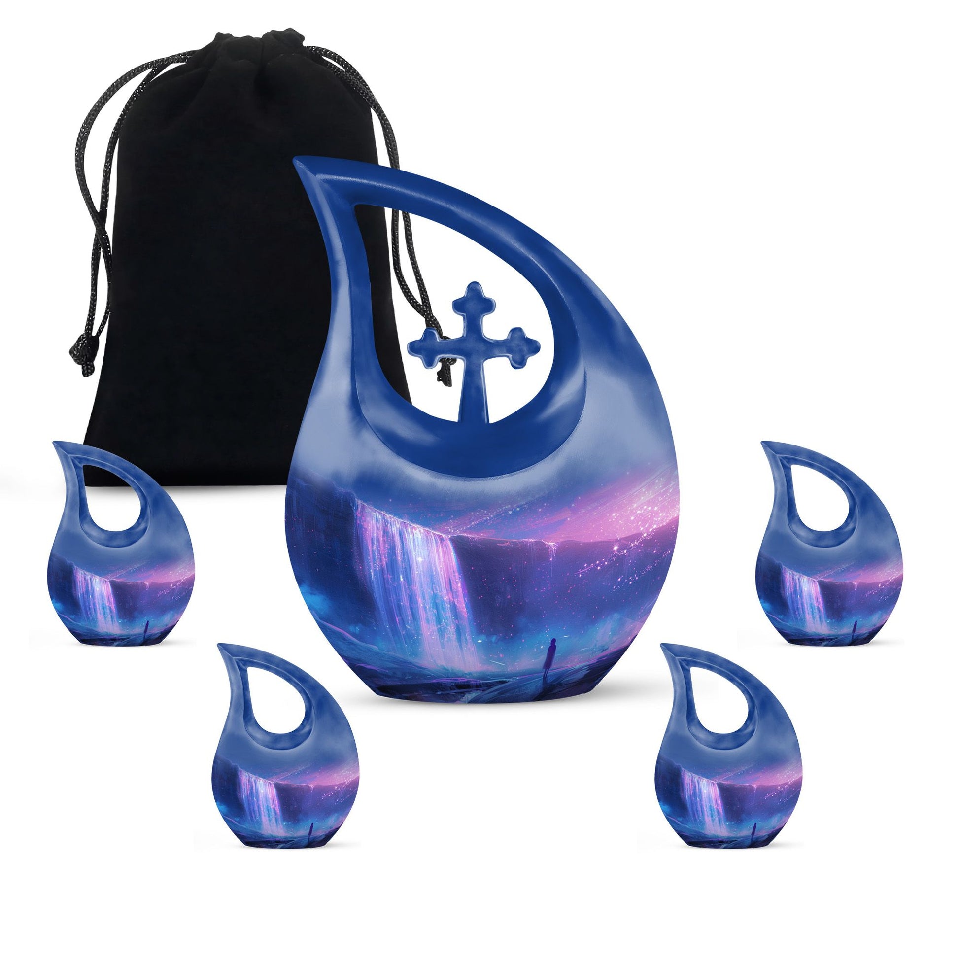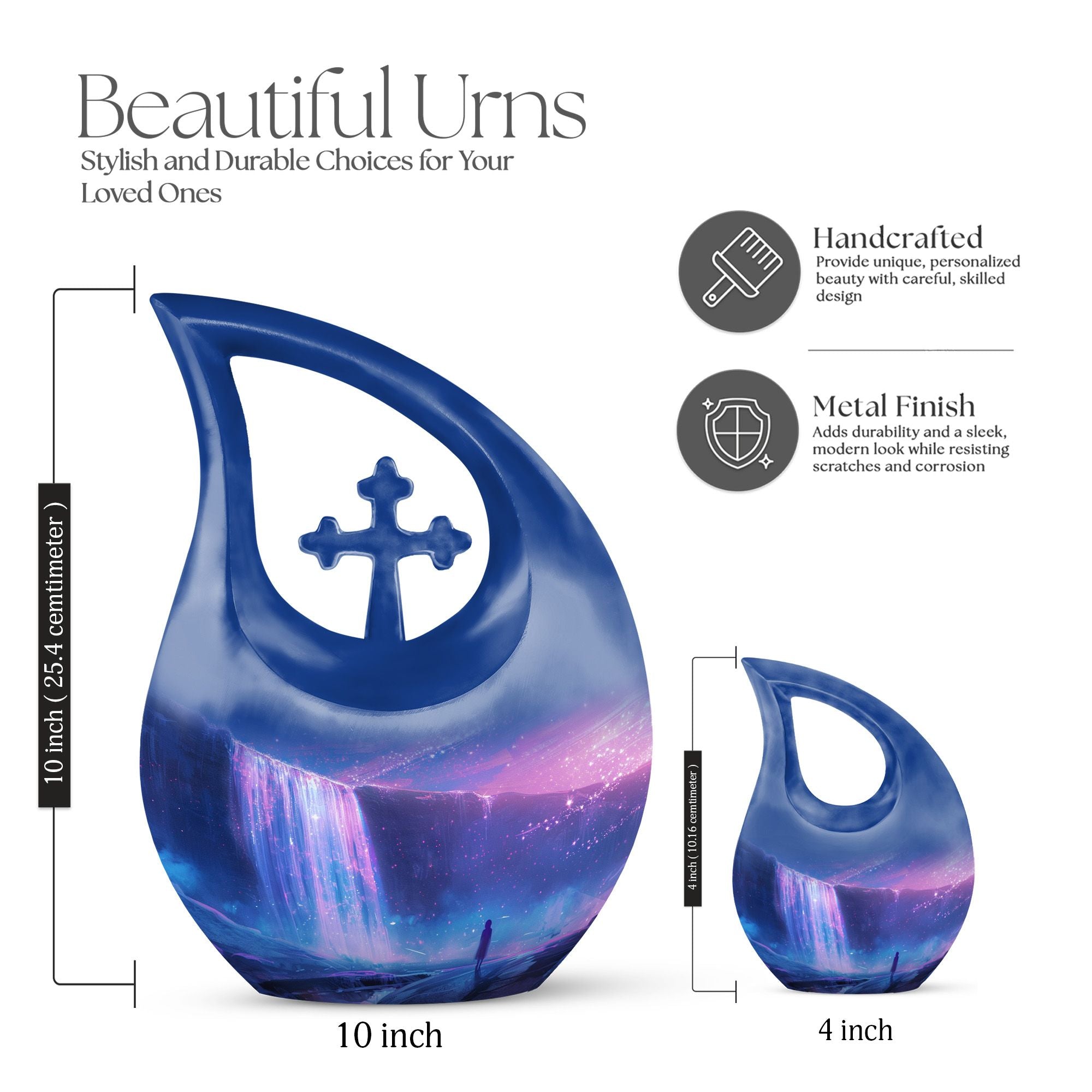 Discover purity and peace when you choose the 'Starlight Over The Urn', a beautiful memorial piece in our range of large Urns. Crafted from durable Aluminium, this uniquely personalized urn weighs a substantial 3.3 pounds and stands proud at 10 inches in height. The one-of-a-kind 'Cross Drop' urn design signifies a beacon of faith, offering comfort and solace during challenging times. The urn caters to practical needs too, with a generous capacity of 200 cubic inches and a complimentary velvet pouch for dignified containment of ashes. There's also an option to make this urn even more special - simply personalize it with engraved names. So whether you're searching for small urns for Human ashes, or Funeral urns for ashes, our 'Starlight Over The Urn' is an affordable, tasteful choice - a precious starlight to cherish forever.