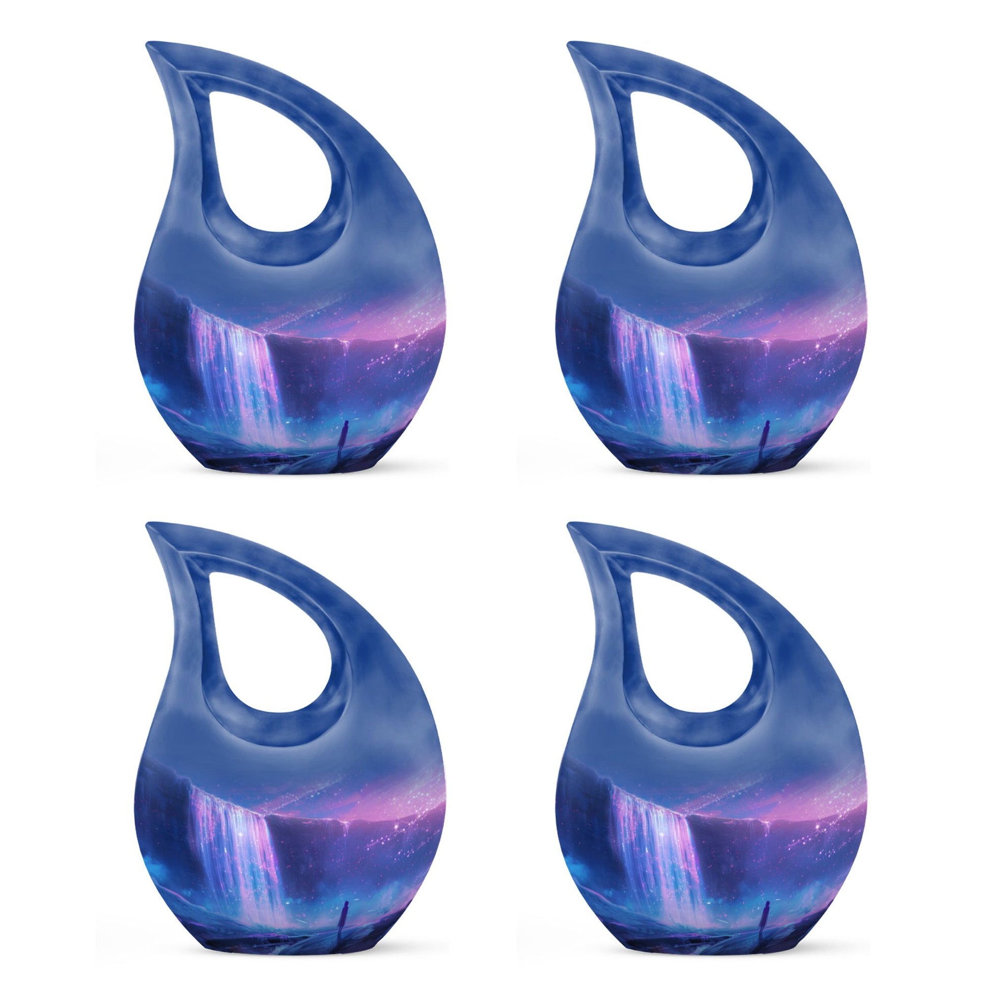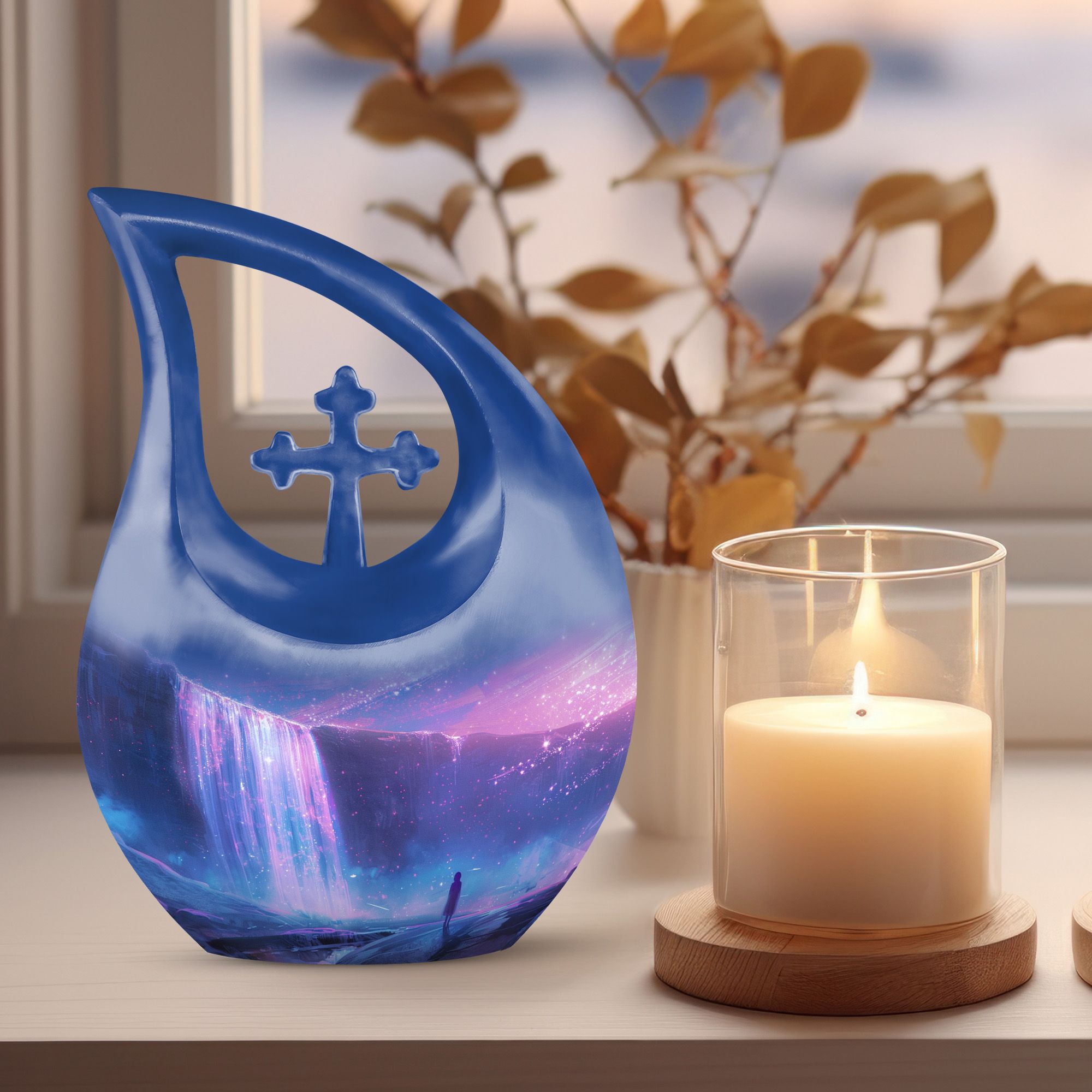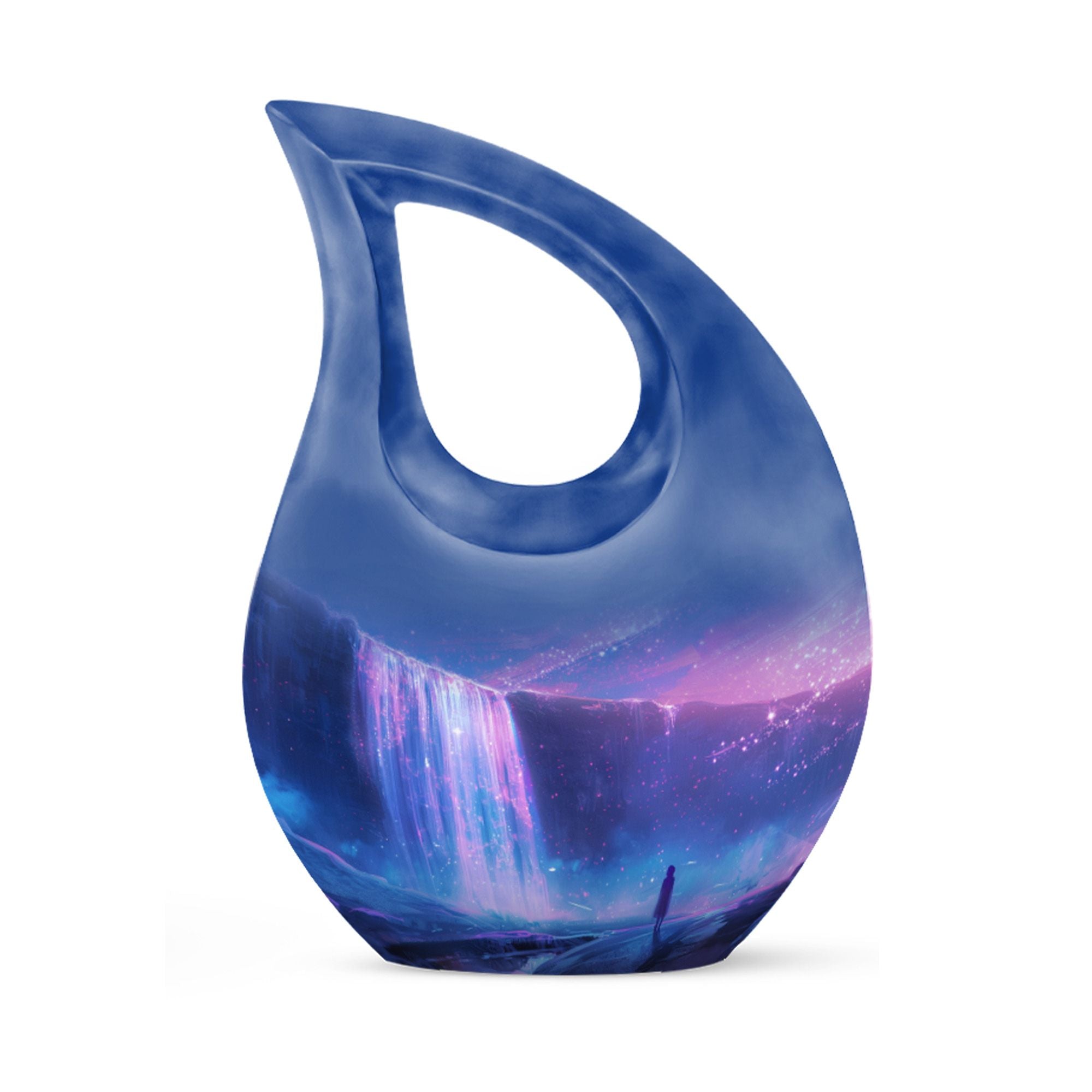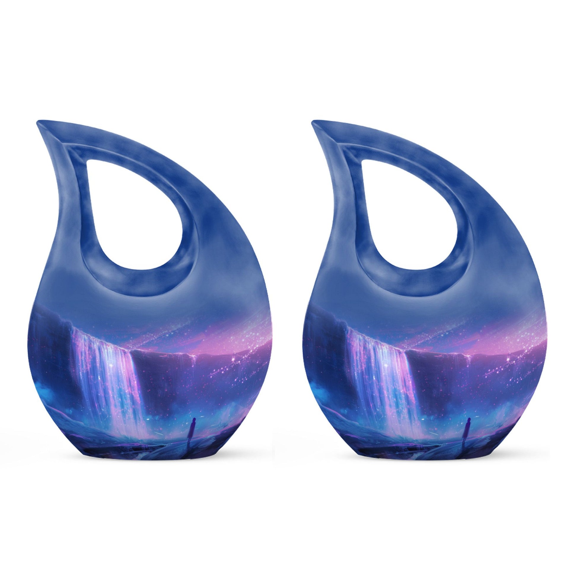 Discover purity and peace when you choose the 'Starlight Over The Urn', a beautiful memorial piece in our range of large Urns. Crafted from durable Aluminium, this uniquely personalized urn weighs a substantial 3.3 pounds and stands proud at 10 inches in height. The one-of-a-kind 'Cross Drop' urn design signifies a beacon of faith, offering comfort and solace during challenging times. The urn caters to practical needs too, with a generous capacity of 200 cubic inches and a complimentary velvet pouch for dignified containment of ashes. There's also an option to make this urn even more special - simply personalize it with engraved names. So whether you're searching for small urns for Human ashes, or Funeral urns for ashes, our 'Starlight Over The Urn' is an affordable, tasteful choice - a precious starlight to cherish forever.