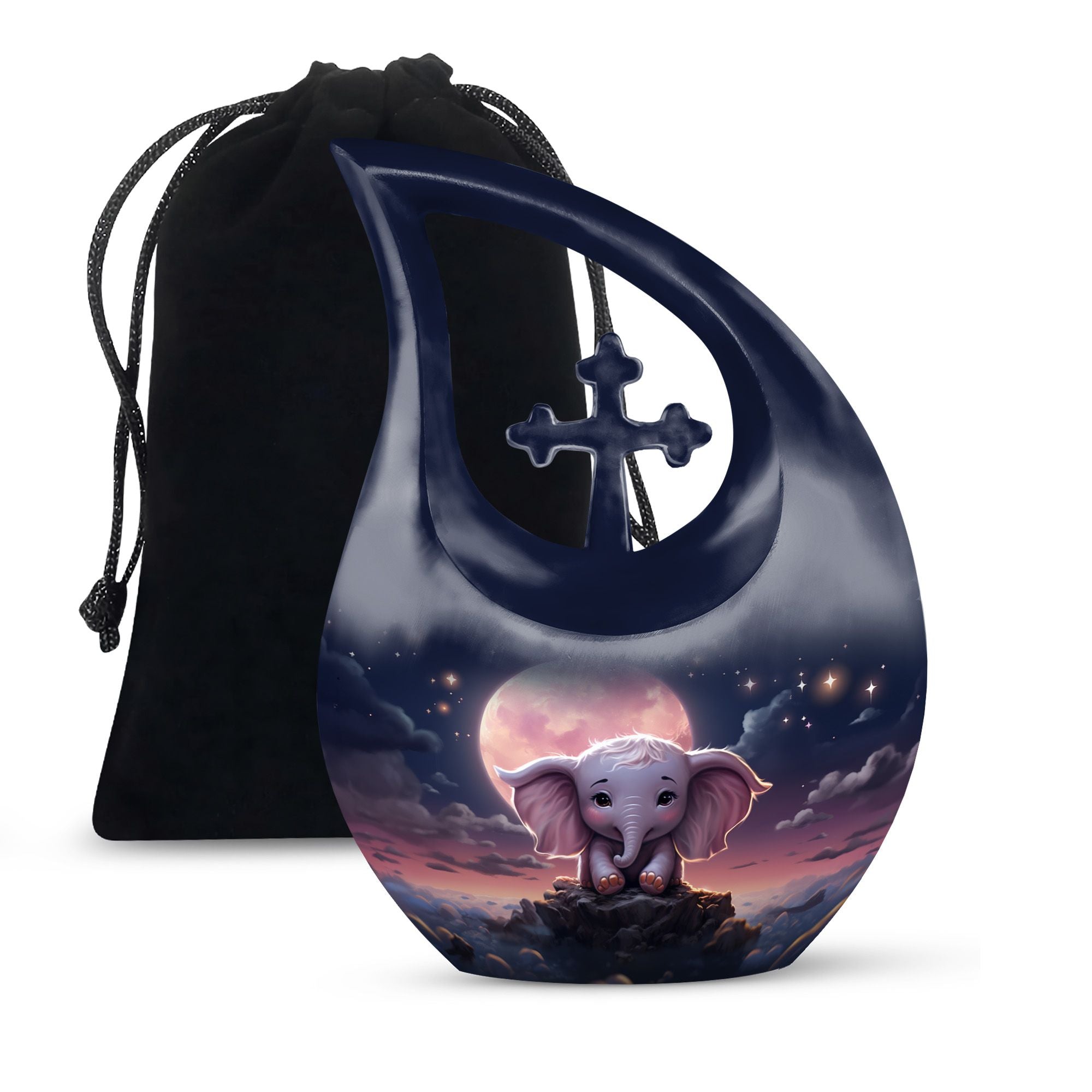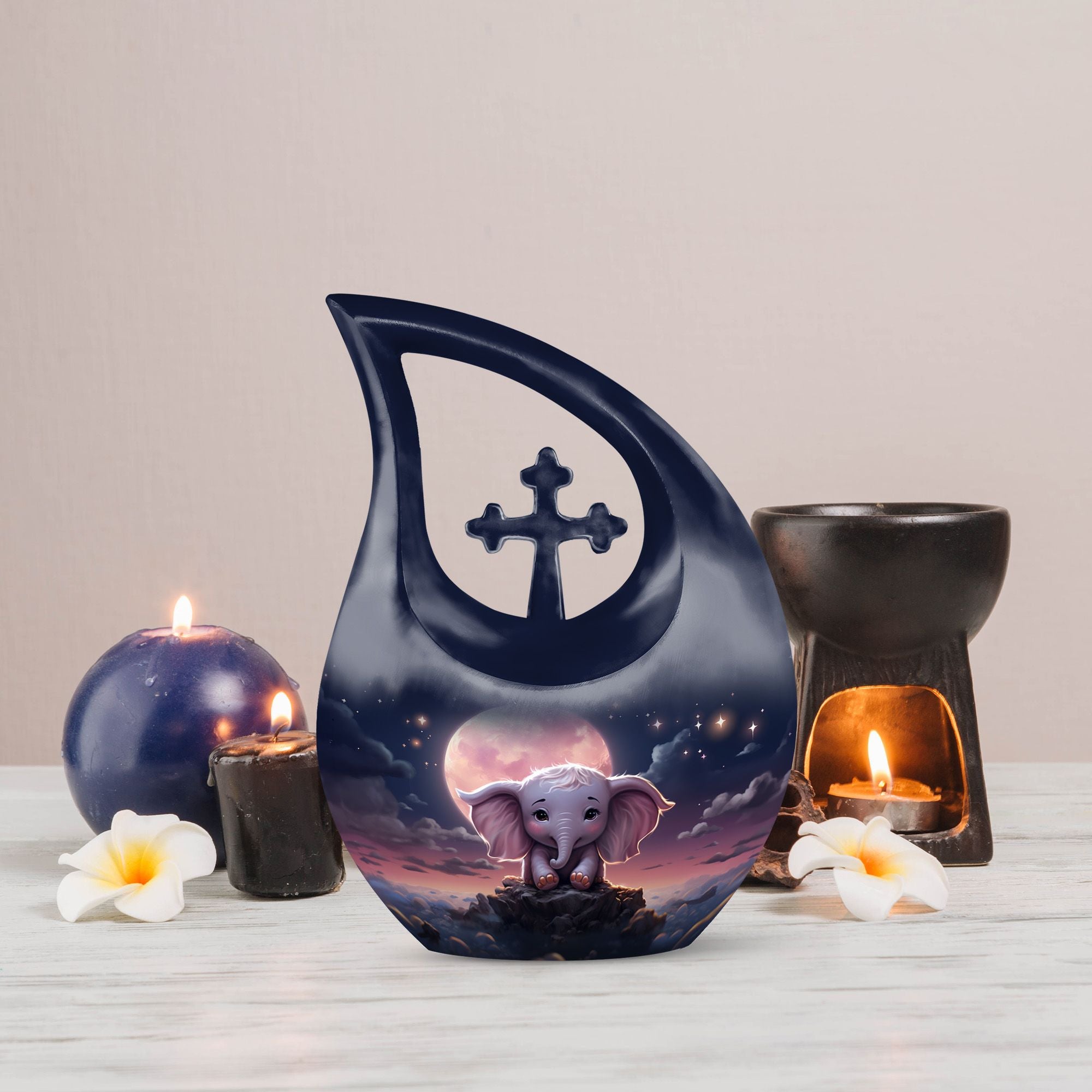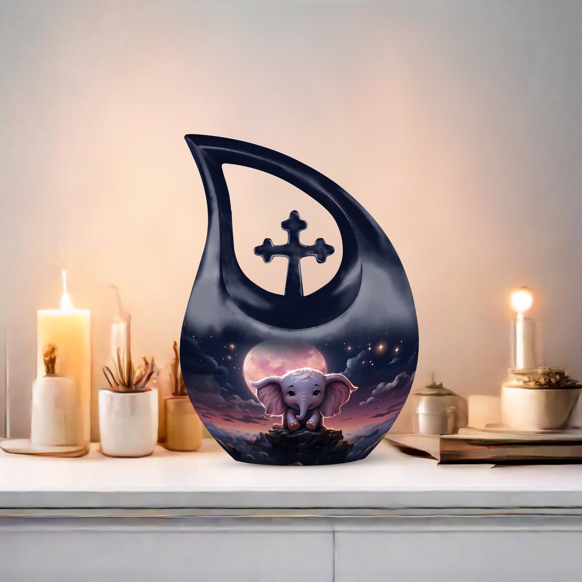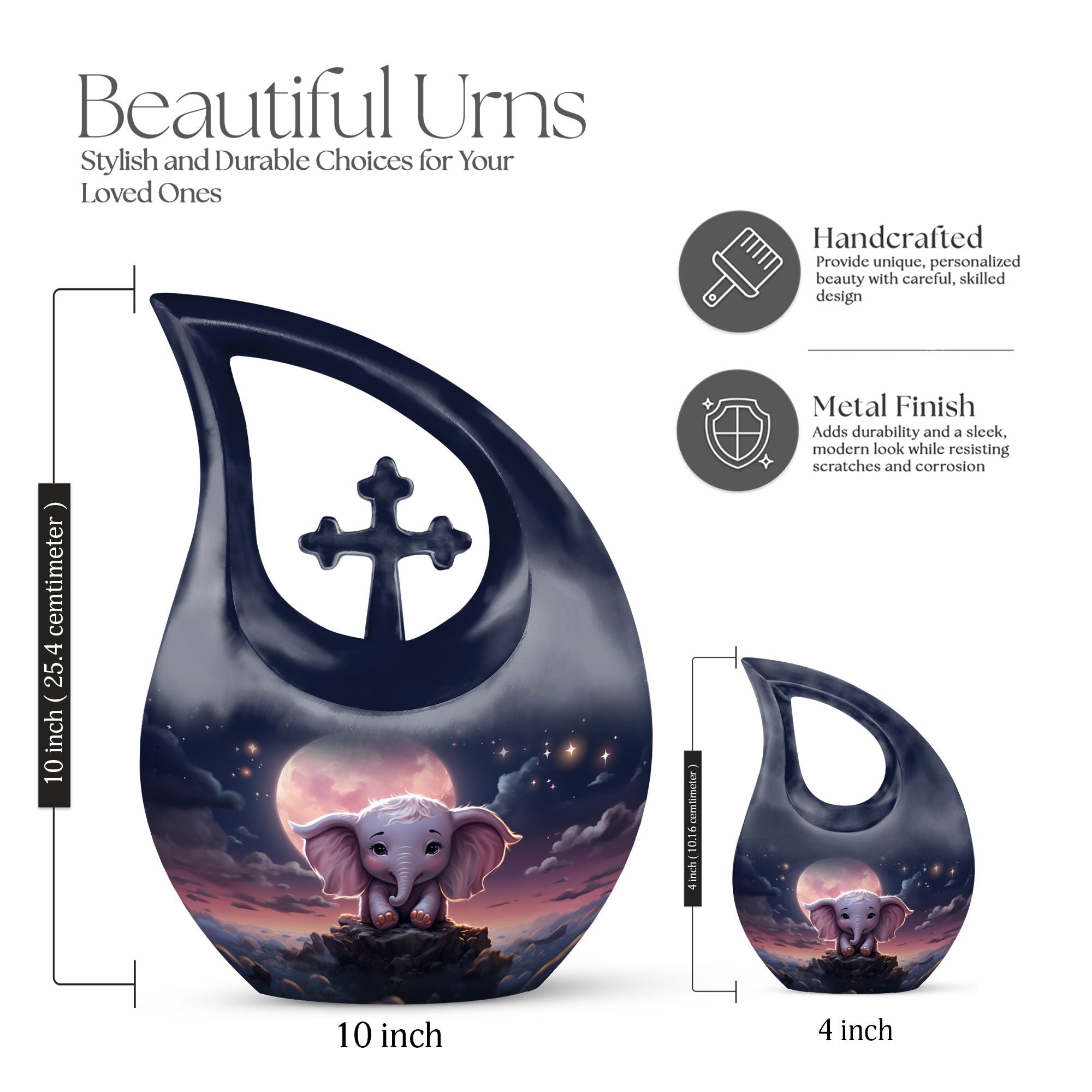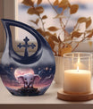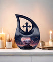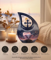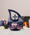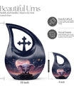 Experience the serene embrace of the Starry Night Dreamer Urn, an exquisite symbol of tranquility and enduring spiritual bond. This distinguished memorial urn, measuring a majestic 10 inches in height, is adorned with the tranquil Cross Drop theme, painting a sacred respite to heed the call of the everlasting journey. Crafted meticulously from robust Aluminium, this large urn weighs 3.3 pounds and has a capacity of 200 cubic inches, can comfortably hold the ashes of your beloved. The urn comes with an additional velvet pouch, offering a dignified containment of ashes. Personalize your tribute with the custom option of engraved names, transforming this urn into a unique memorial. Ideal for adults and seniors, this urn seamlessly fits into the Religious & Ceremonial Memorial Ceremony Supplies category. Primary keywords related to this product include 'Starry Night Dreamer Urn', 'Companion Urns', and other secondary keywords are 'Keepsake Cremation Urns', 'Religious Urns', 'Urns that can be buried', 'Funeral Urns for Sale'. This urn crafts a visual narrative of sublime peace and resilience, honoring your loved one in an unspoken language of reverence.