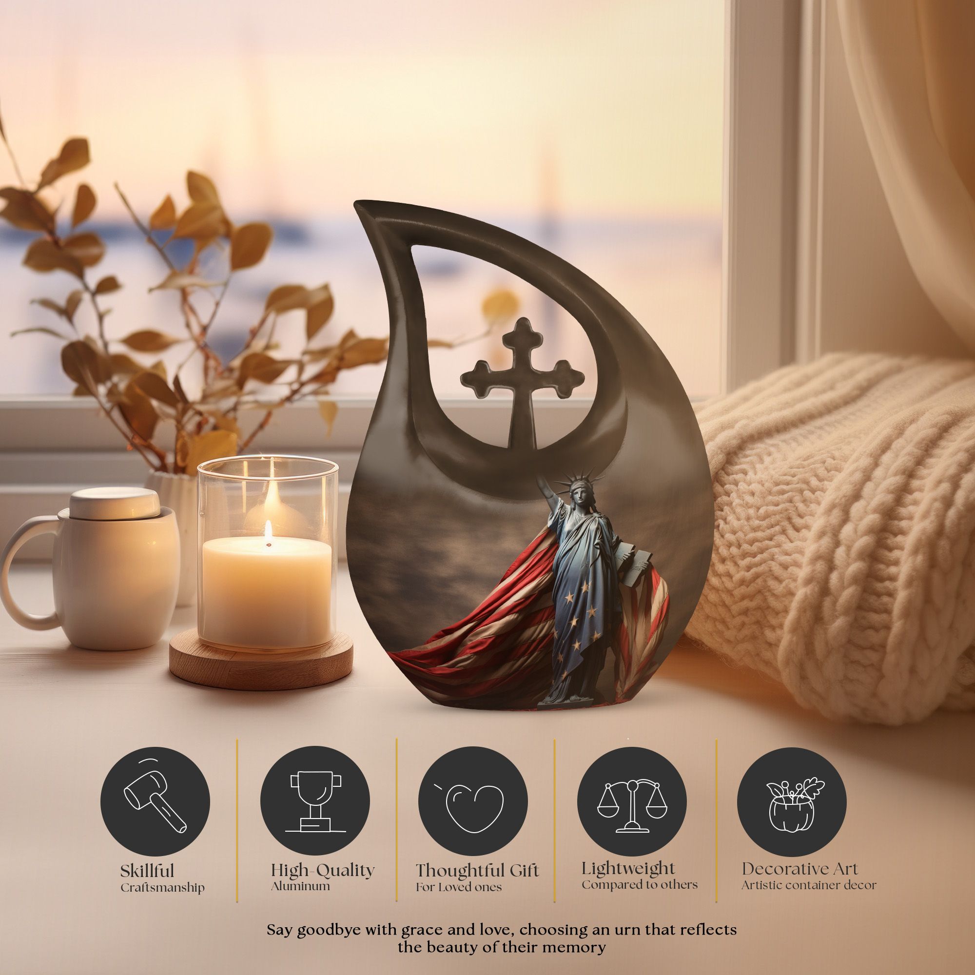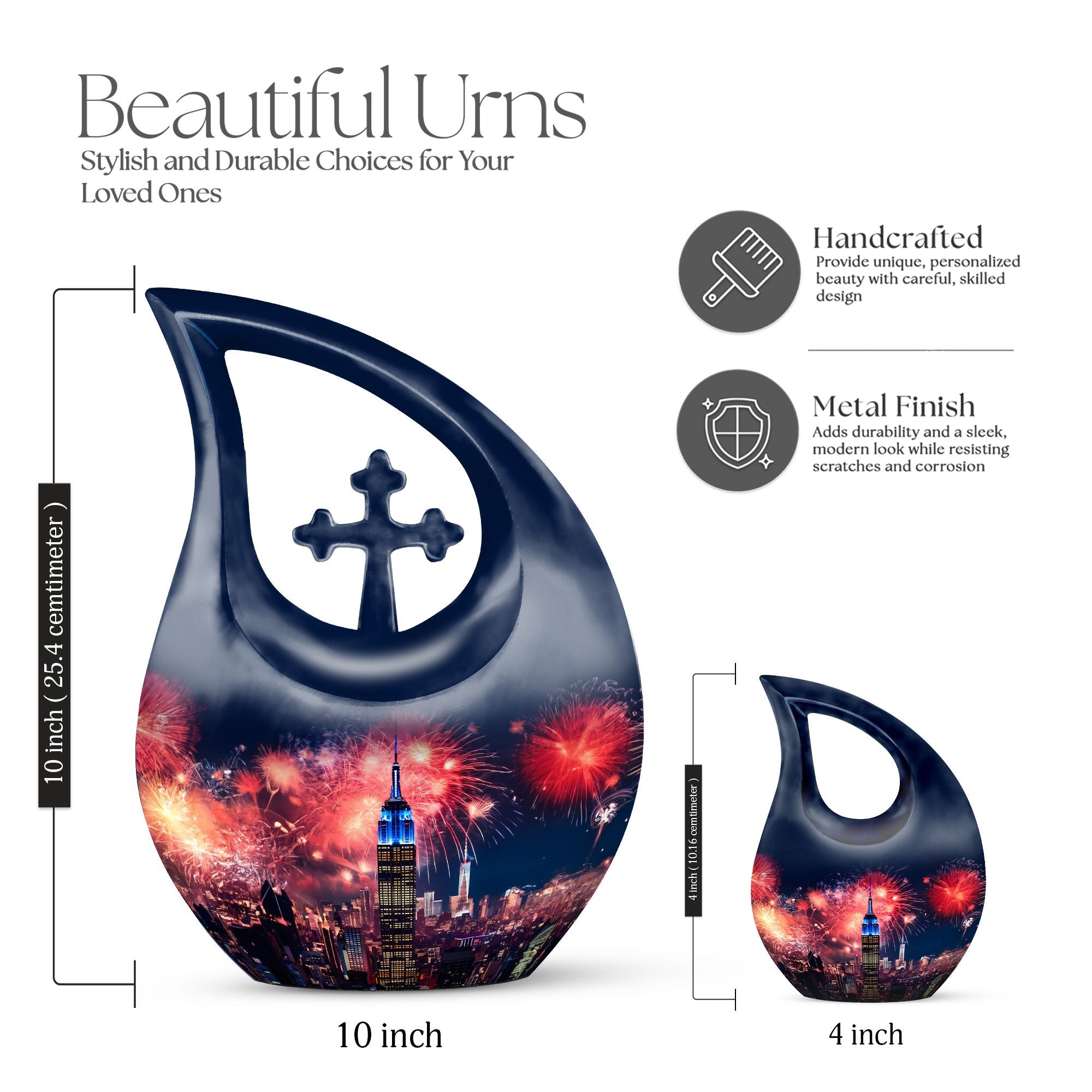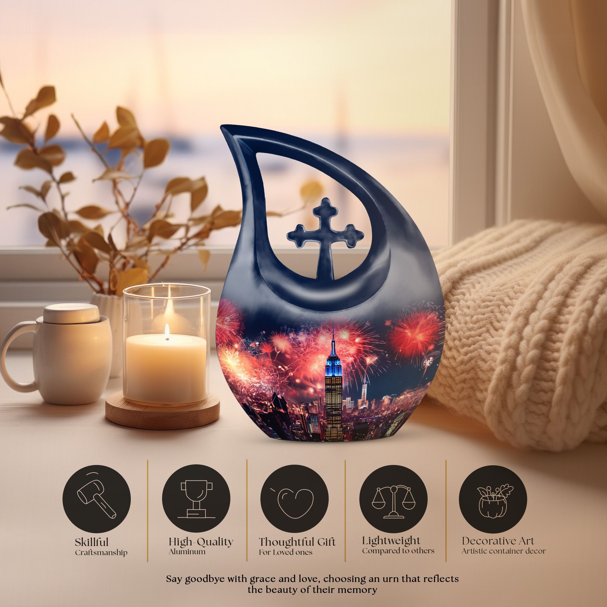 Expertly crafted from durable aluminum, this urn showcases a remarkable scenic design with the New York skyline illuminated by colorful fireworks. Its polished finish enhances the vibrant imagery, making it both a memorial and a work of art. Built for long-lasting preservation, it’s ideal as a burial urn for ashes or a cremation urn for burial, ensuring your loved one rests in peace with elegance. Whether displayed at home or laid to rest, its thoughtful design reflects both strength and serenity.