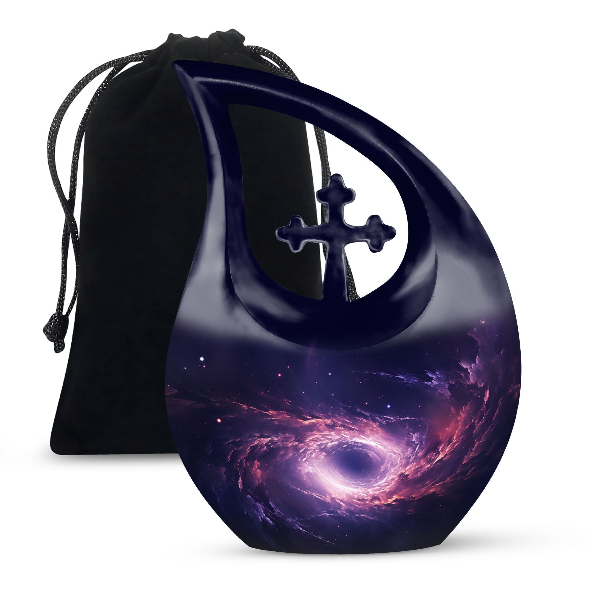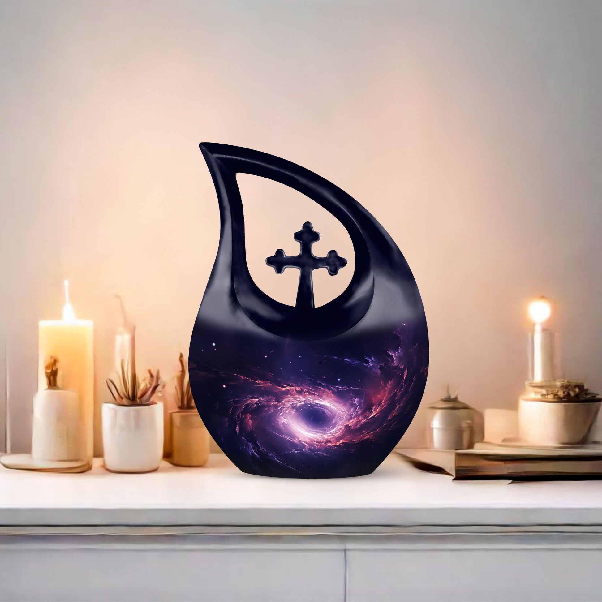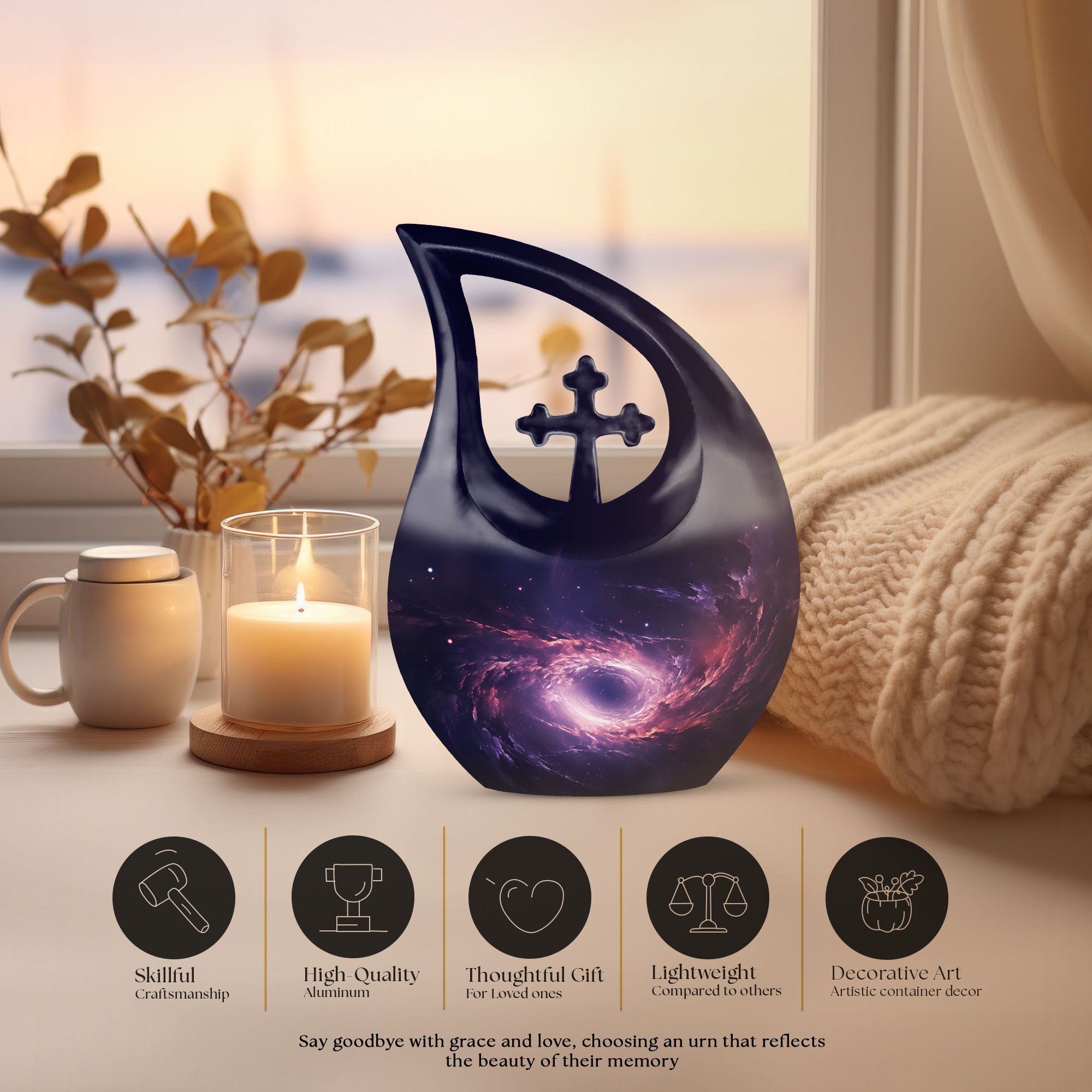 Honor the memory of your beloved one with the exquisite Galaxy Urn, fittingly sized at 10 inches and weighing 3.3 pounds. This large urn, delicately crafted from durable aluminium, presents a compelling Cross Drop design nestled within a celestial Galaxy theme, gracefully reflecting life's transcendental journey. It offers a generous capacity of 200 cubic inches, accommodating a significant portion or all ashes of adults or seniors. Our package also provides a velvet pouch, safeguarding the preserved remains of your loved one. For a more personal touch, take advantage of our customization feature, allowing the engraving of names, fostering a truly unique keepsake. While being large in dimension, it is still a practical option for those searching for smaller 'Mini Urns' or 'Mini Urns For Ashes'. Our Galaxy Urn is a magnificent blend of aesthetics and functionality, defining a new standard for 'Memorial Urns' and 'Cremation Keepsakes', providing solace during times of remembrance.