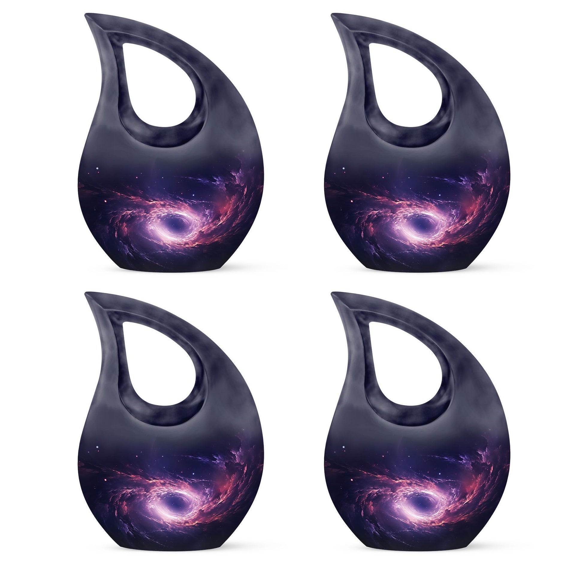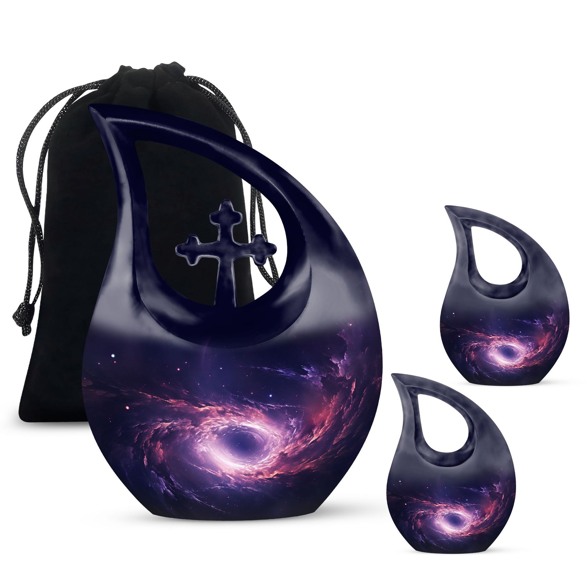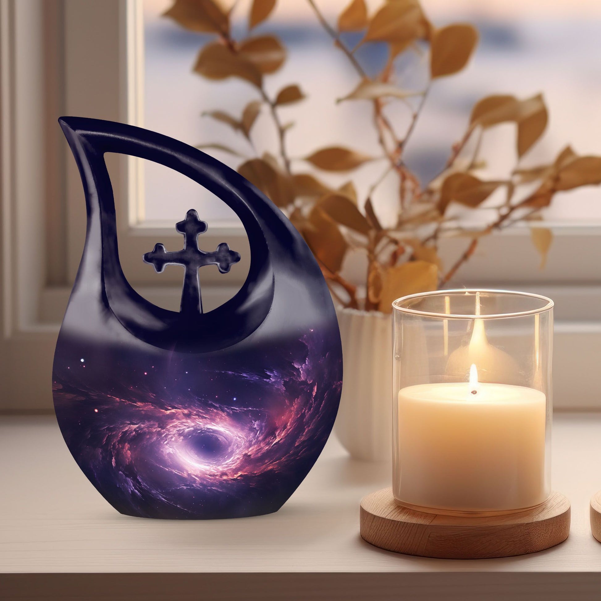 Honor the memory of your beloved one with the exquisite Galaxy Urn, fittingly sized at 10 inches and weighing 3.3 pounds. This large urn, delicately crafted from durable aluminium, presents a compelling Cross Drop design nestled within a celestial Galaxy theme, gracefully reflecting life's transcendental journey. It offers a generous capacity of 200 cubic inches, accommodating a significant portion or all ashes of adults or seniors. Our package also provides a velvet pouch, safeguarding the preserved remains of your loved one. For a more personal touch, take advantage of our customization feature, allowing the engraving of names, fostering a truly unique keepsake. While being large in dimension, it is still a practical option for those searching for smaller 'Mini Urns' or 'Mini Urns For Ashes'. Our Galaxy Urn is a magnificent blend of aesthetics and functionality, defining a new standard for 'Memorial Urns' and 'Cremation Keepsakes', providing solace during times of remembrance.