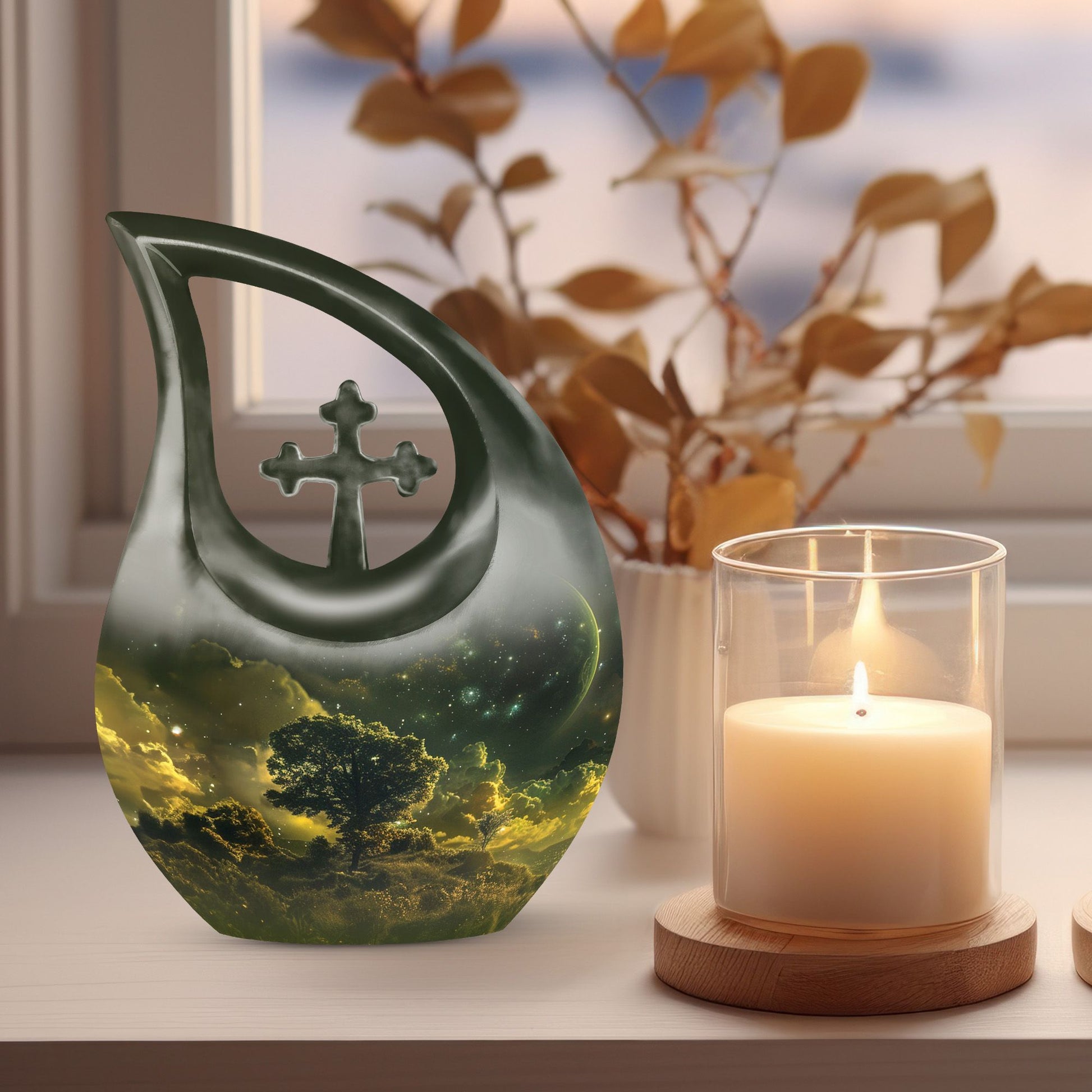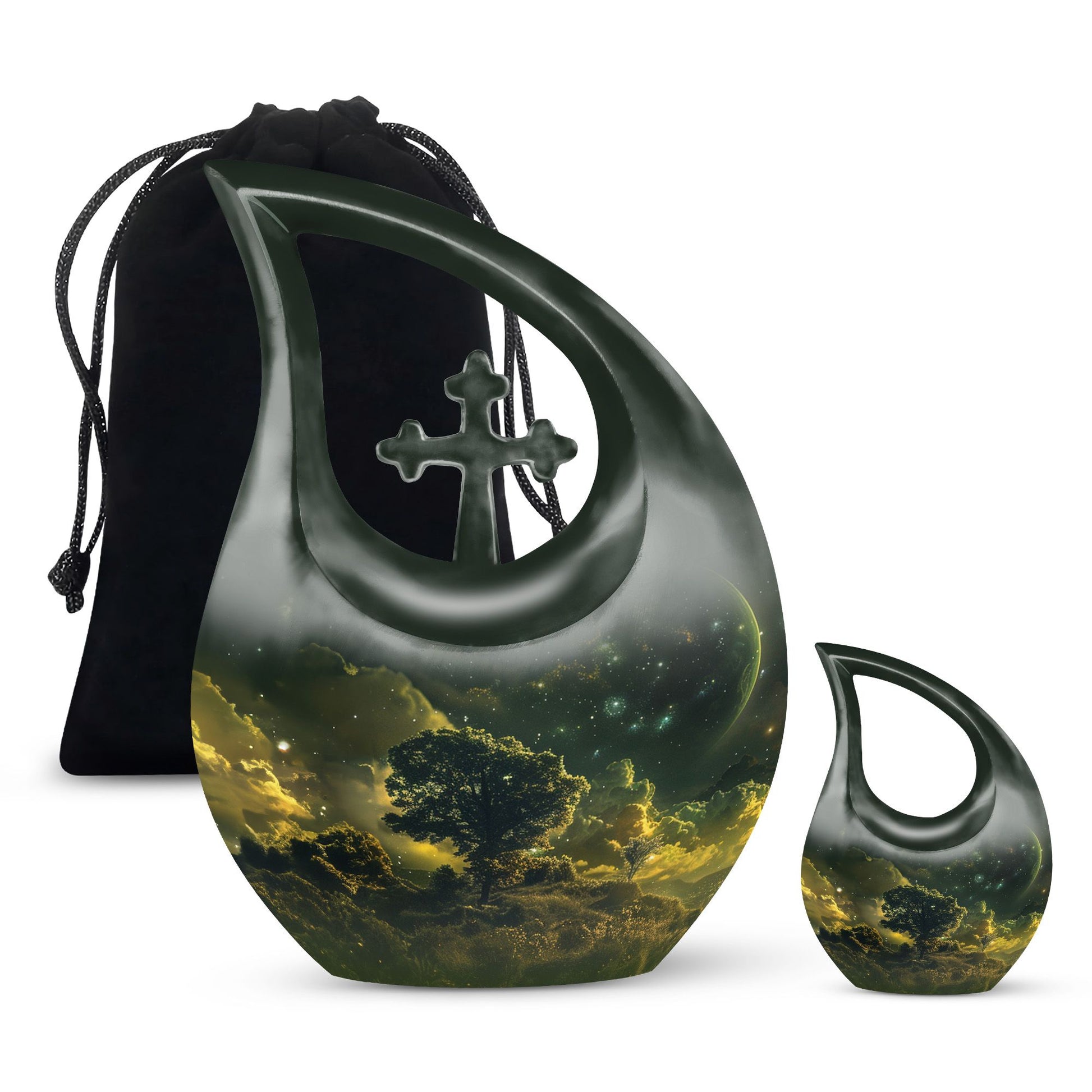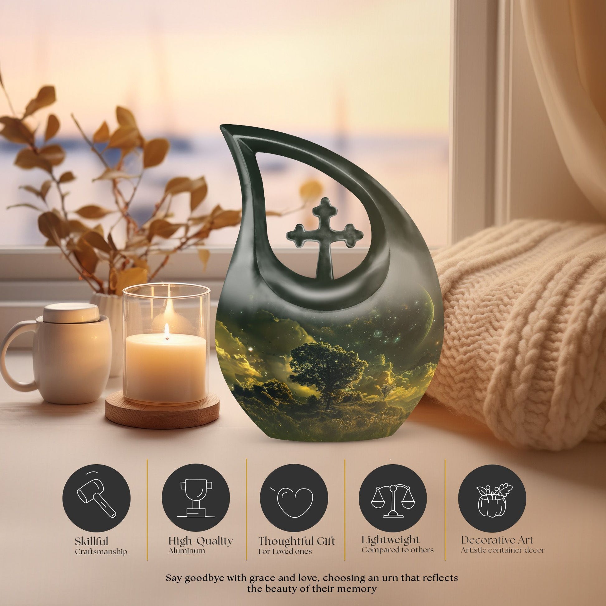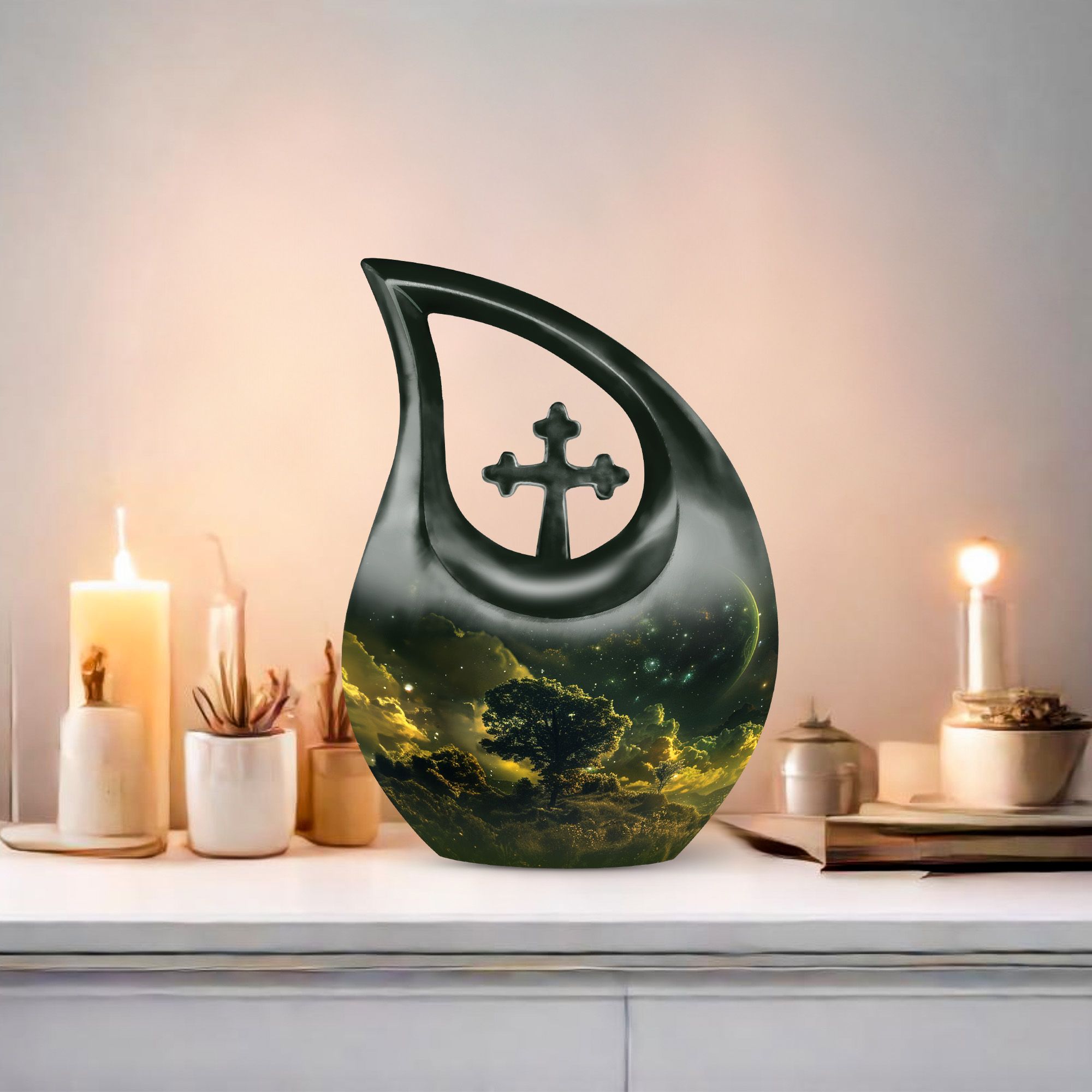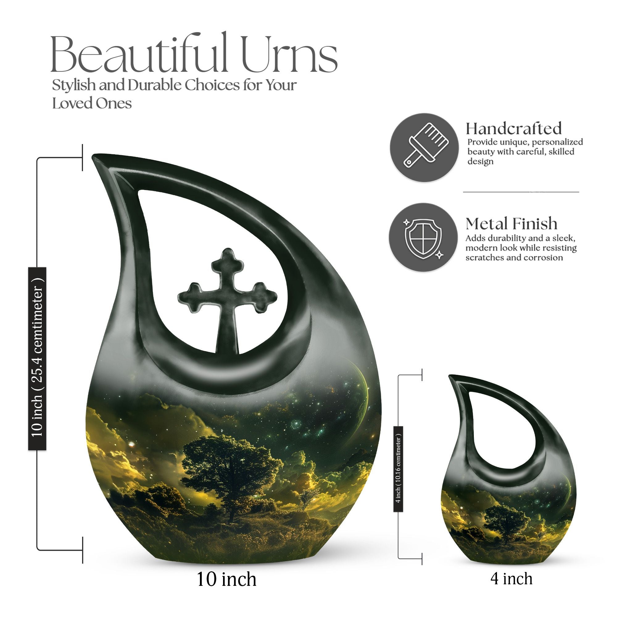 Experience tranquility and peace with our Stellar Serenity Urn, a vital addition to your personal urn collection. Crafted from premium-quality, 10-Inch-tall aluminium, this urn showcases a harmonious balance between durability and aesthetics. The urn displays a unique 'Cross Drop' theme, promoting serene memories and reflections. Weighing around 3.3 pounds, it can conveniently accommodate 200 cubic inches worth of ashes, aiding in grace-filled memorials. The urn comes with a soft and luxurious velvet pouch ensuring undisturbed containment of ashes, adding a touch of elegance to your memorial ceremony supplies. As a part of your personalized experience, this urn can be customised by engraving the names. Whether you are seeking for 'Urns To Put Ashes In', 'Companion Cremation Urns', 'Large Urns For Ashes', or 'Small Decorative Urns For Ashes', our Stellar Serenity Urn stands up to your needs, attracting all with its originality and sublime character.