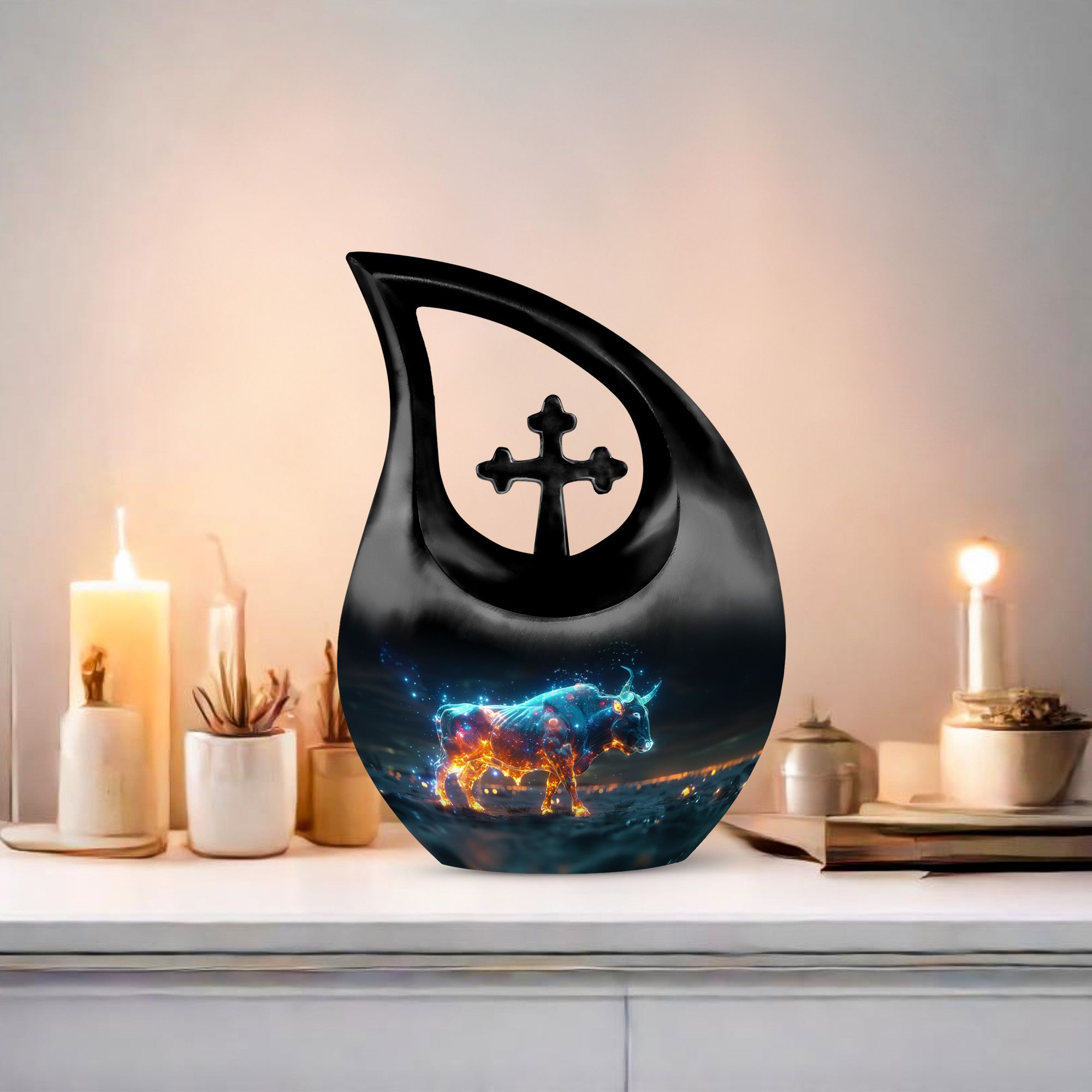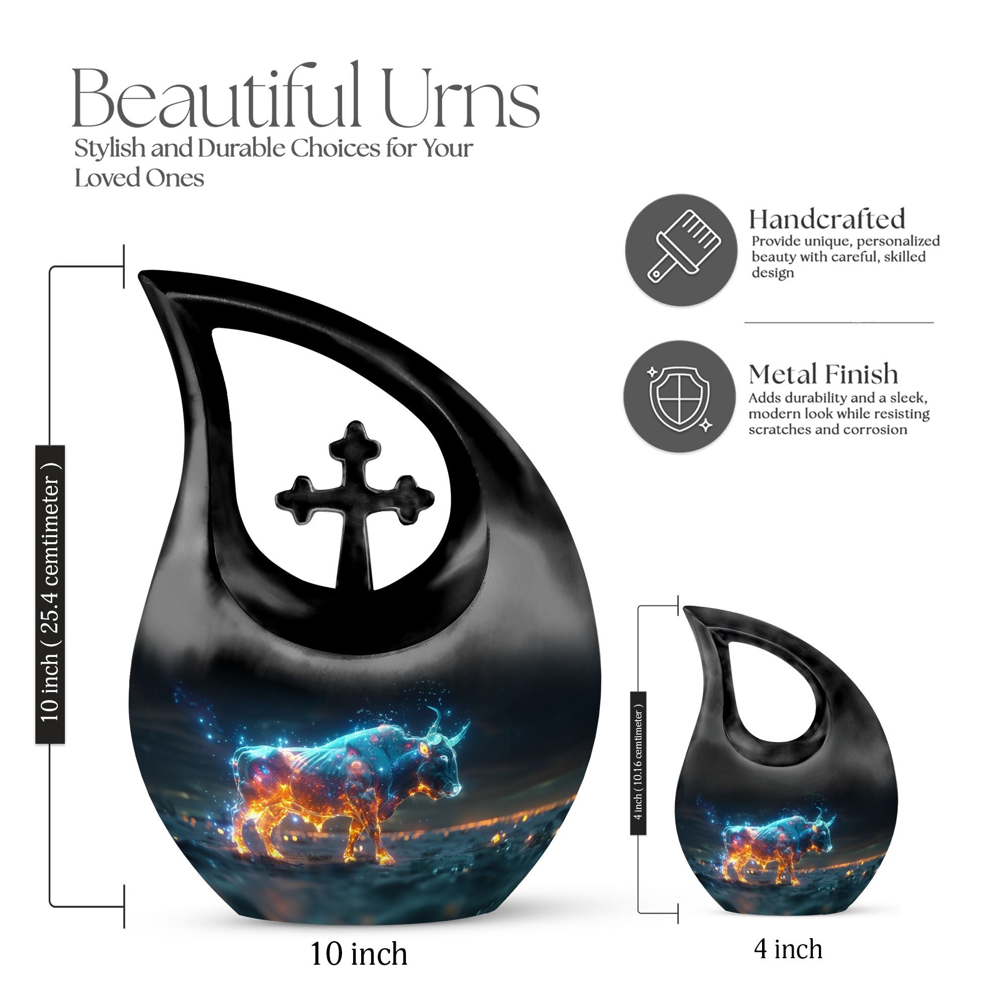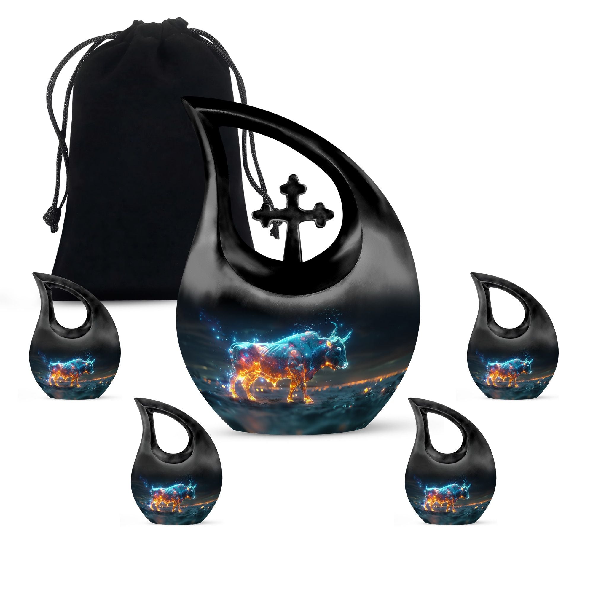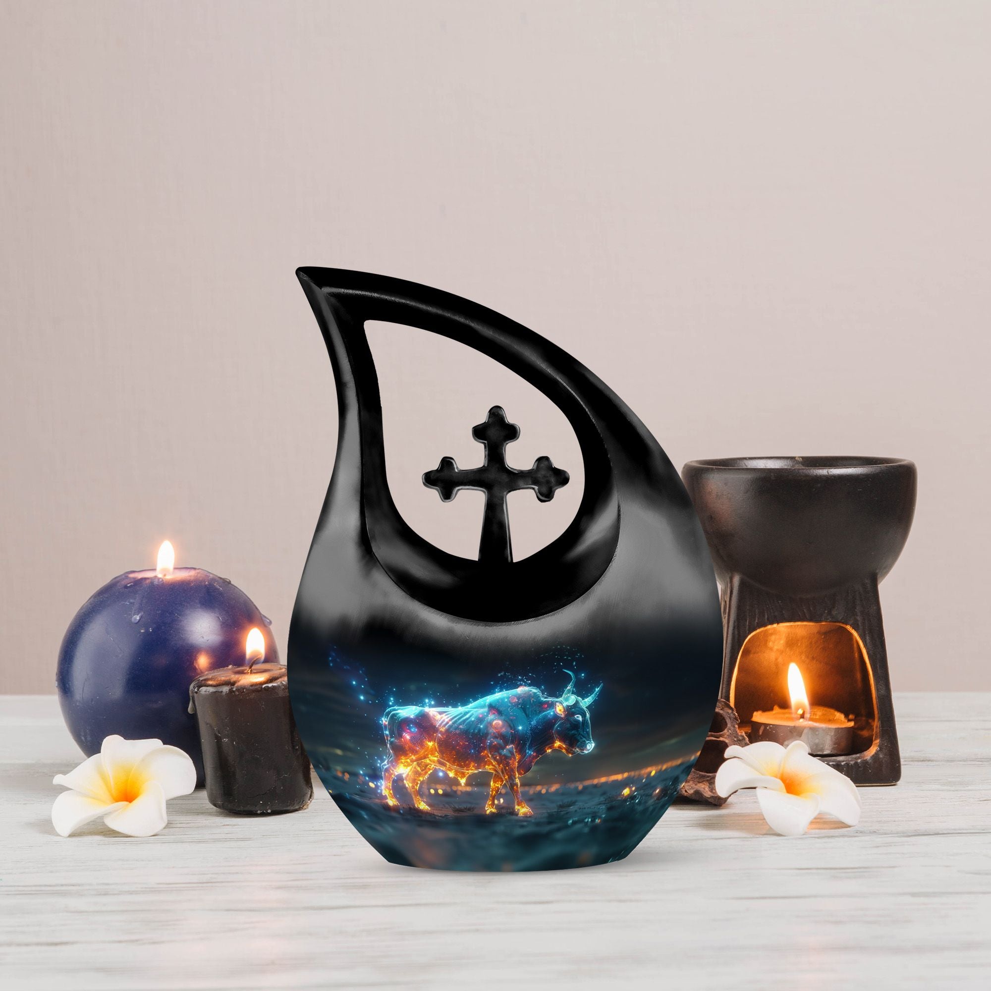 Cherish the luminous memory of a loved one with the Stellar Taurus Glow Urn. This serenely elegant ‘Cross Drop’ design encapsulating a celestial theme, is a sizeable 10-inch tall memorial urn, crafted for adults. Molded from resilient aluminum, it comfortably weighs 3.3 pounds ensuring its stability. The urn's spacious interior can hold up to 200 cubic inches of ashes, preserving the final essence of your dear one securely. This large urn adds a personal touch with the option to customize, allowing engraved names to enhance its uniqueness. The product comes complete with a plush, velvet pouch, perfect for containment of ashes. Amongst precious moments urns, this mini urn distinguishes itself with its stellar theme, making it an ideal choice for commemorative urns. Seek solace in memories as this urn captures the departing spirit’s essence, offering a beautiful sanctuary for their ashes. Whether in search of urns for ashes for adults or smaller cremation urns, our Stellar Taurus Glow Urn stands as a symbol of love and remembrance.