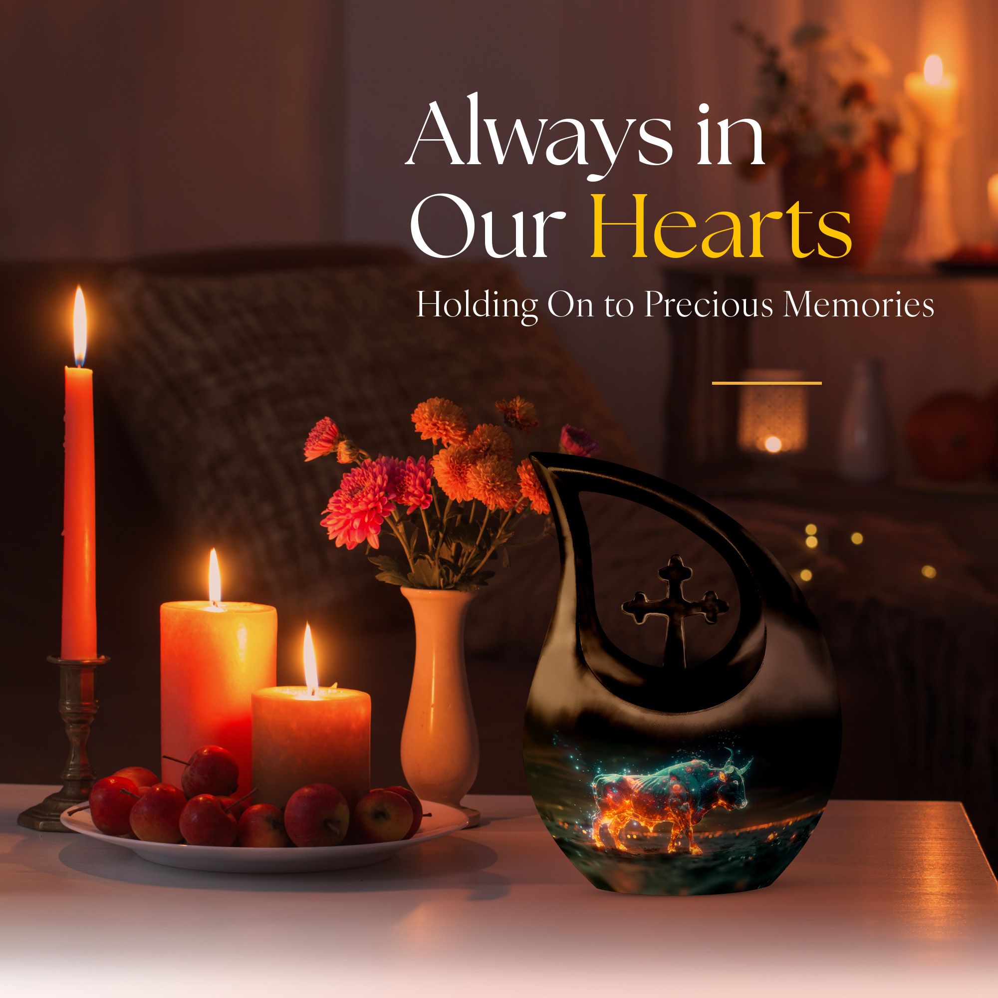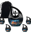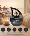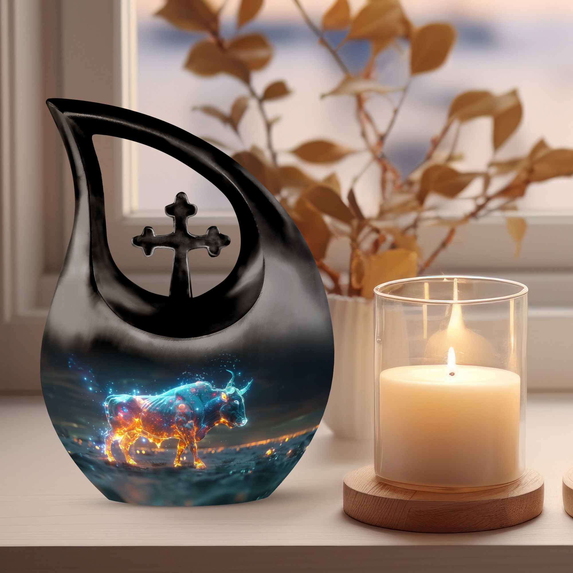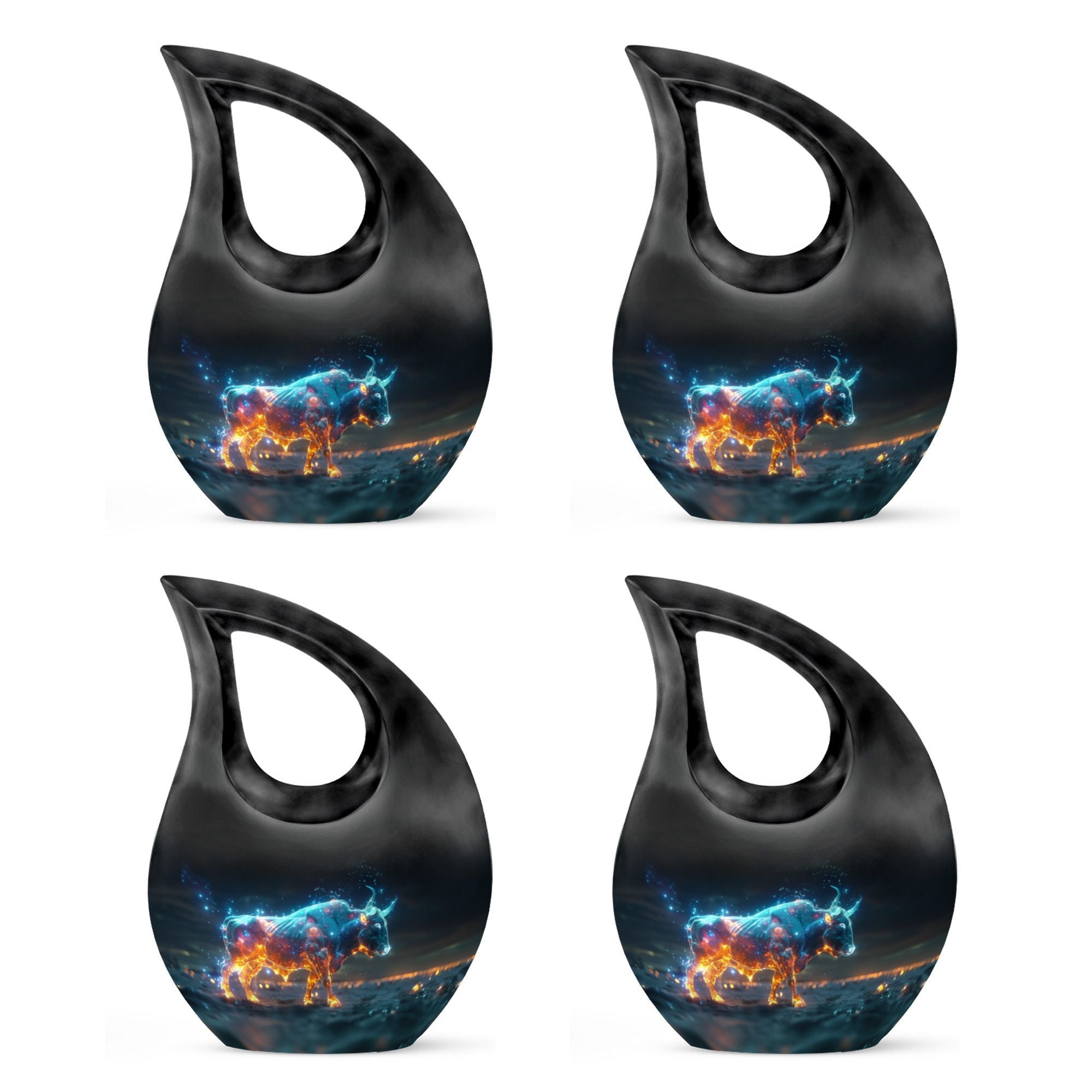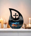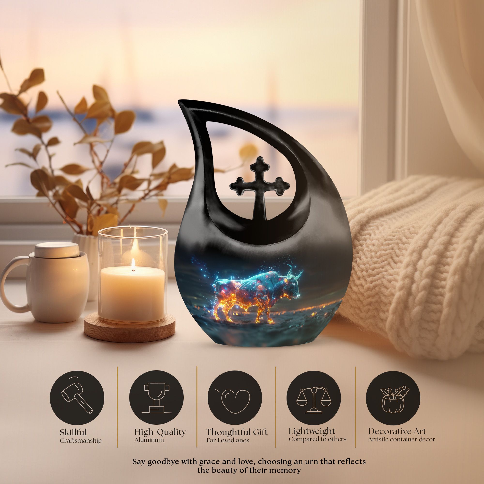 Cherish the luminous memory of a loved one with the Stellar Taurus Glow Urn. This serenely elegant ‘Cross Drop’ design encapsulating a celestial theme, is a sizeable 10-inch tall memorial urn, crafted for adults. Molded from resilient aluminum, it comfortably weighs 3.3 pounds ensuring its stability. The urn's spacious interior can hold up to 200 cubic inches of ashes, preserving the final essence of your dear one securely. This large urn adds a personal touch with the option to customize, allowing engraved names to enhance its uniqueness. The product comes complete with a plush, velvet pouch, perfect for containment of ashes. Amongst precious moments urns, this mini urn distinguishes itself with its stellar theme, making it an ideal choice for commemorative urns. Seek solace in memories as this urn captures the departing spirit’s essence, offering a beautiful sanctuary for their ashes. Whether in search of urns for ashes for adults or smaller cremation urns, our Stellar Taurus Glow Urn stands as a symbol of love and remembrance.