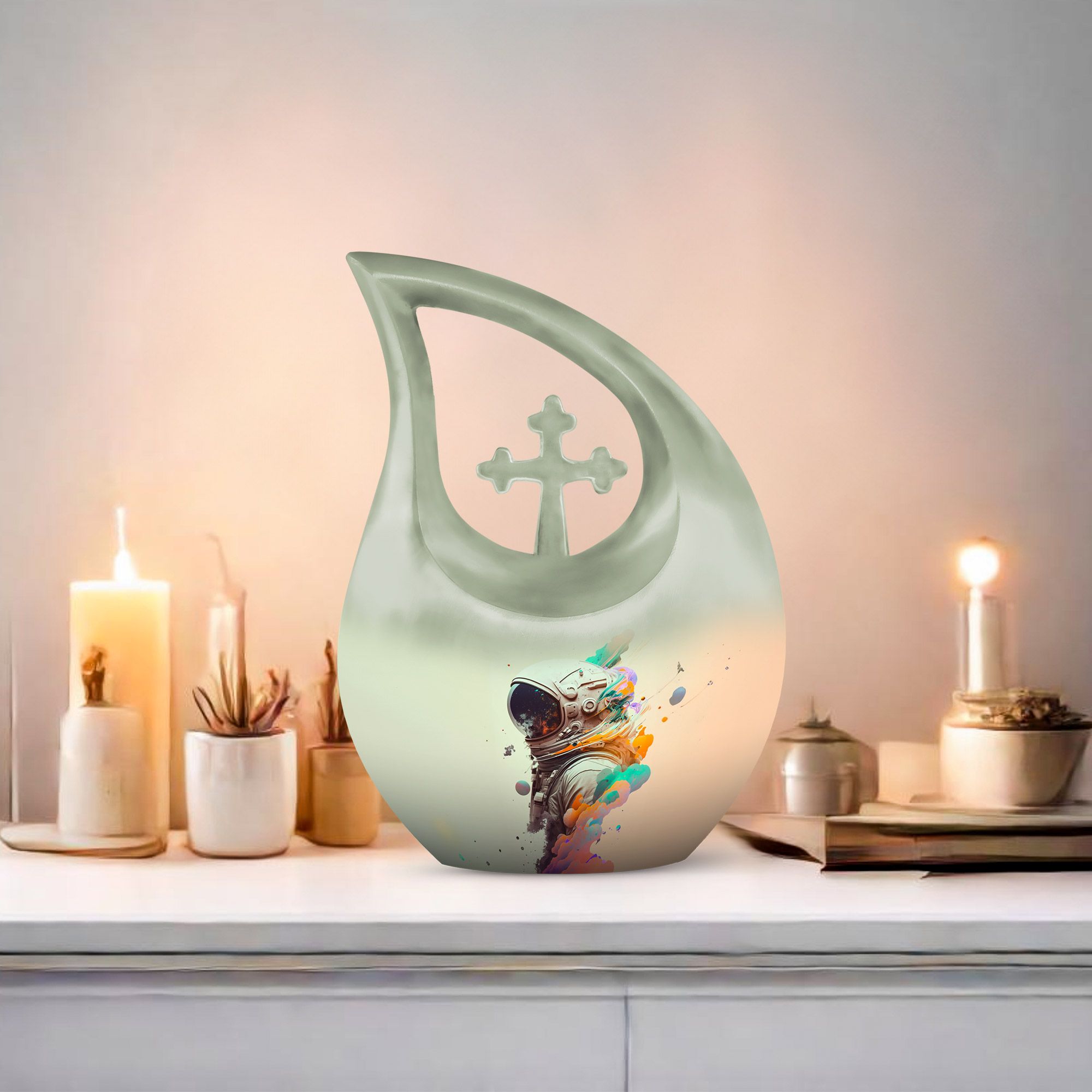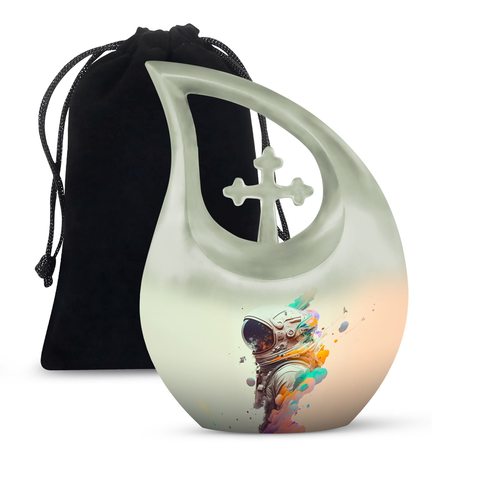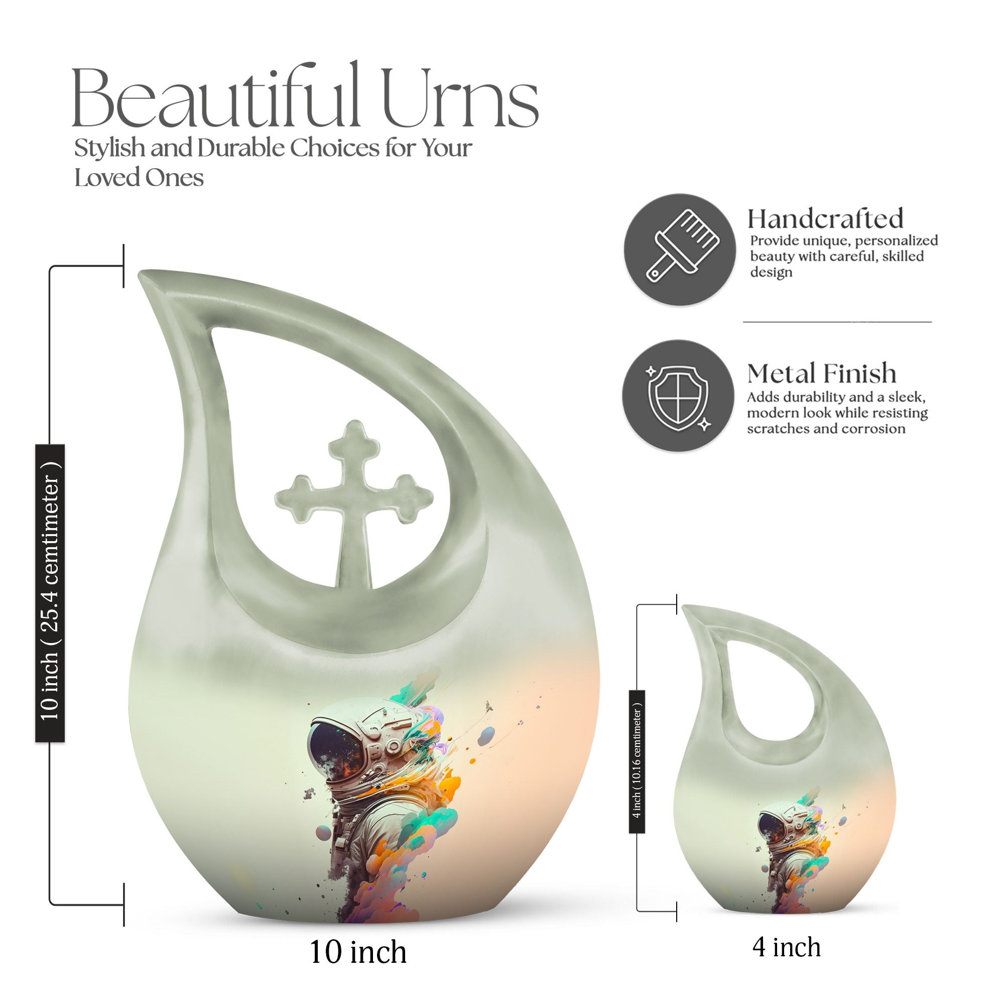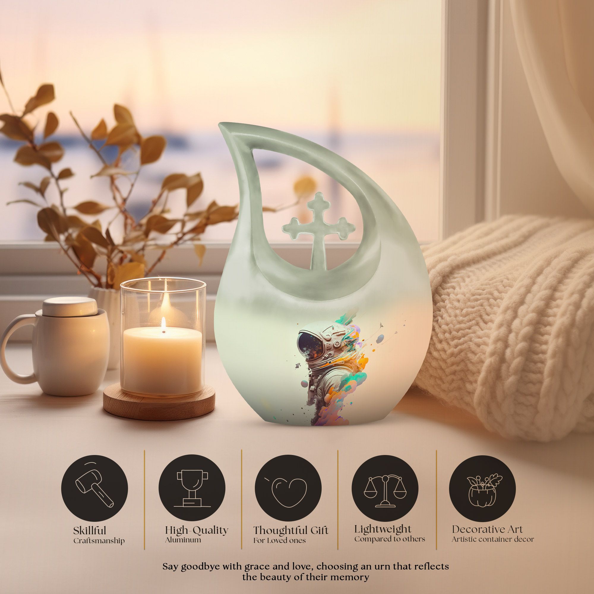 Skillfully crafted from durable aluminum, this artistic urn showcases a luminous galaxy-inspired pattern surrounding a serene astronaut design — a symbol of exploration and eternal peace. Whether chosen as an urn for human ashes adult women or as a meaningful tribute for men, it offers both elegance and durability. Perfect for those seeking cremation urns for adult ashes women or adult urns for women, its radiant colors make it a centerpiece of remembrance and beauty.