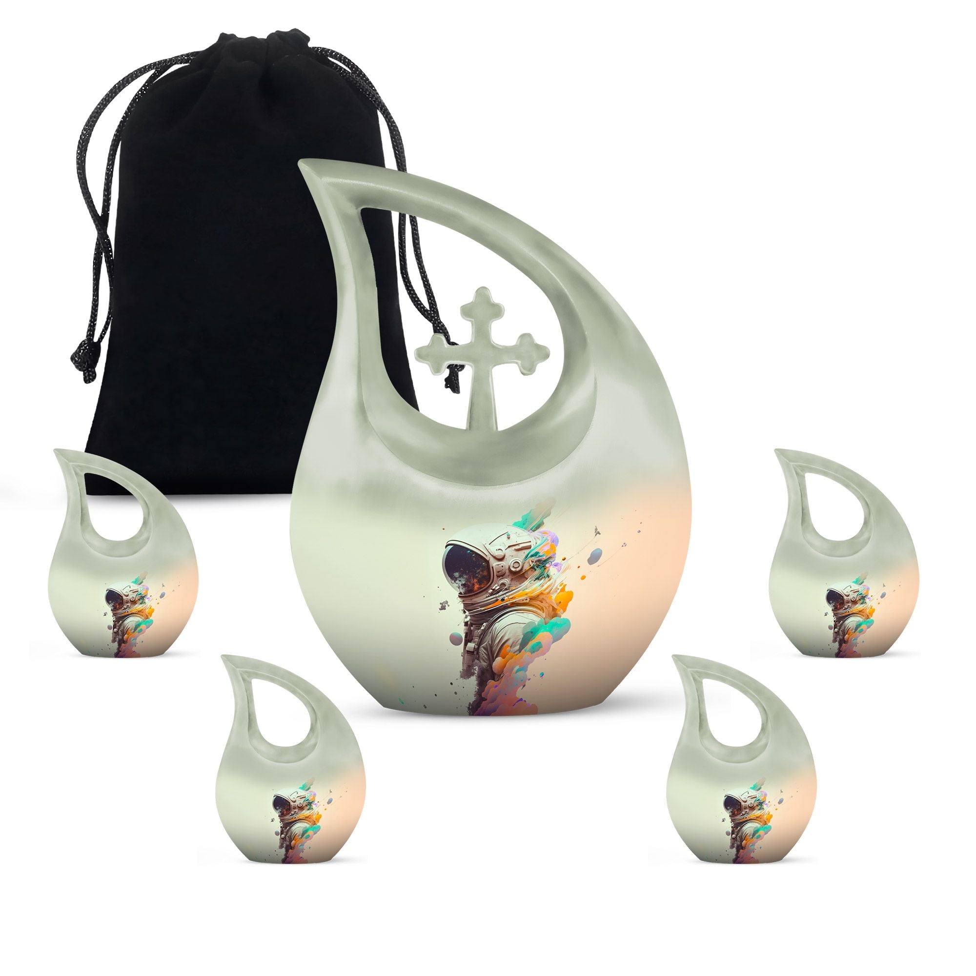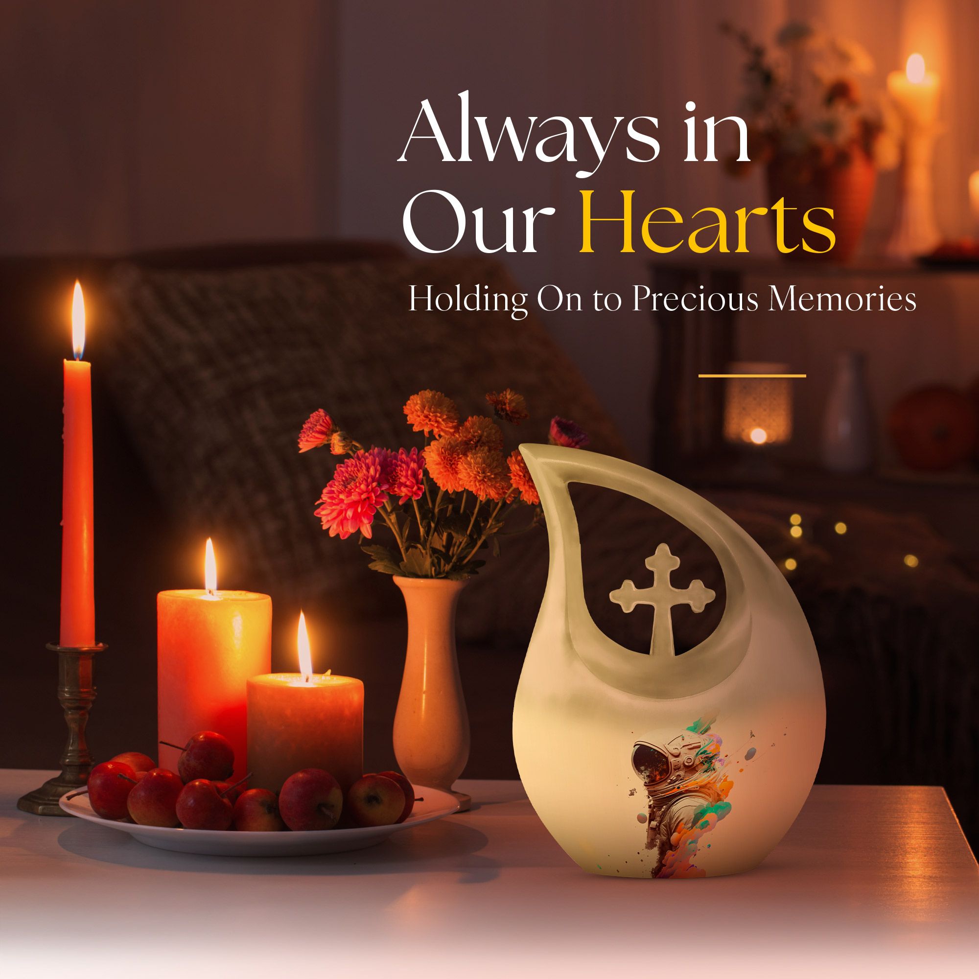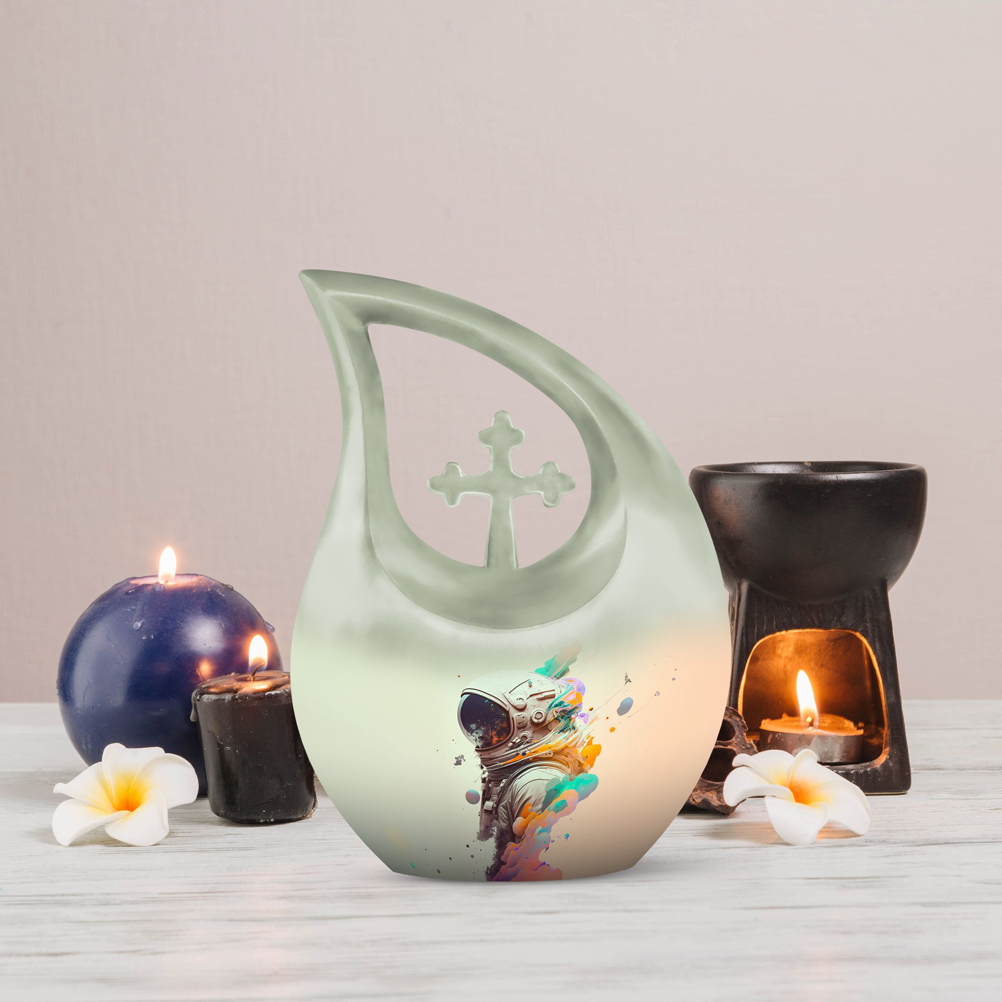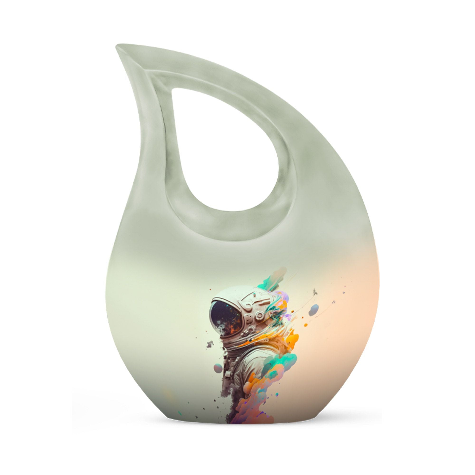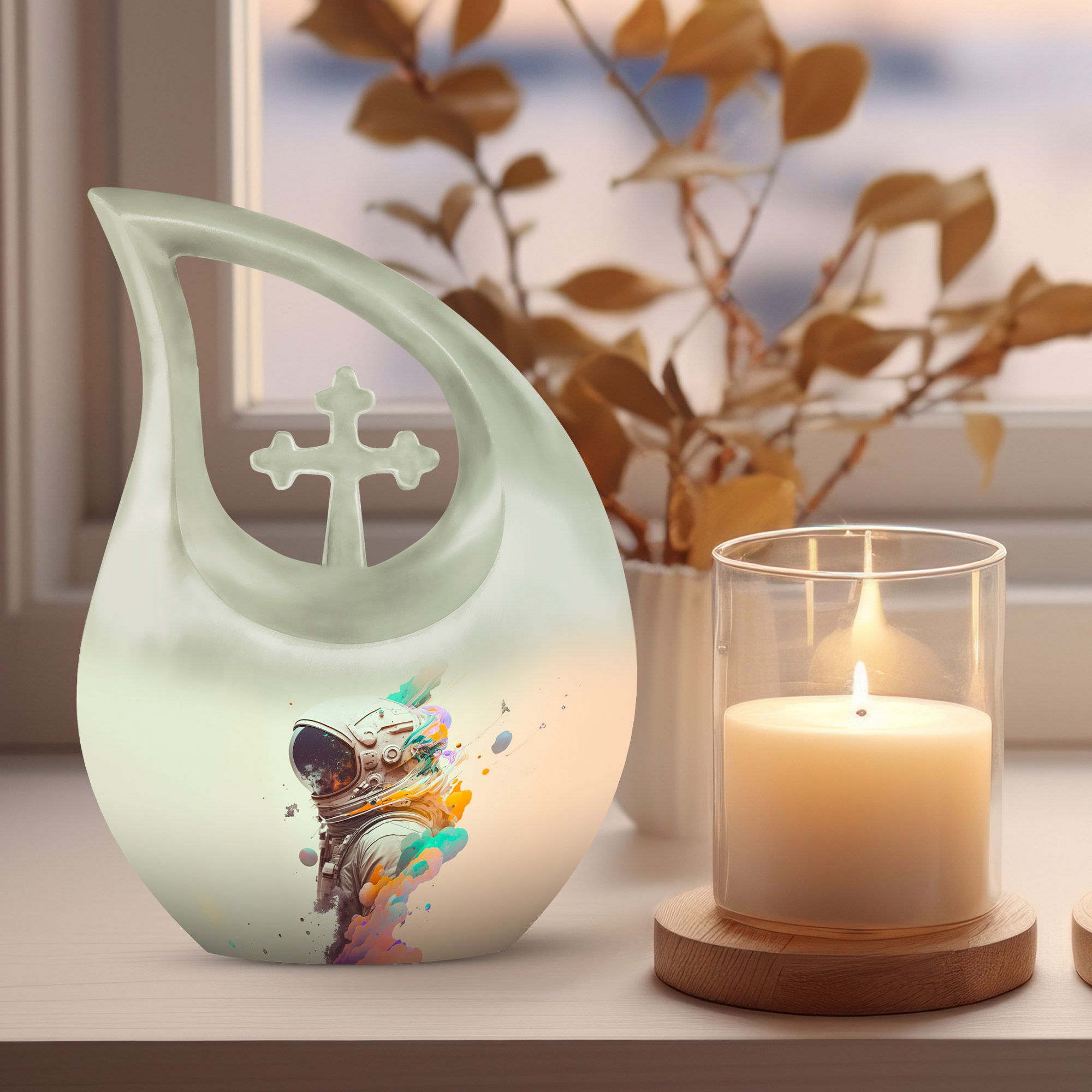 Skillfully crafted from durable aluminum, this artistic urn showcases a luminous galaxy-inspired pattern surrounding a serene astronaut design — a symbol of exploration and eternal peace. Whether chosen as an urn for human ashes adult women or as a meaningful tribute for men, it offers both elegance and durability. Perfect for those seeking cremation urns for adult ashes women or adult urns for women, its radiant colors make it a centerpiece of remembrance and beauty.