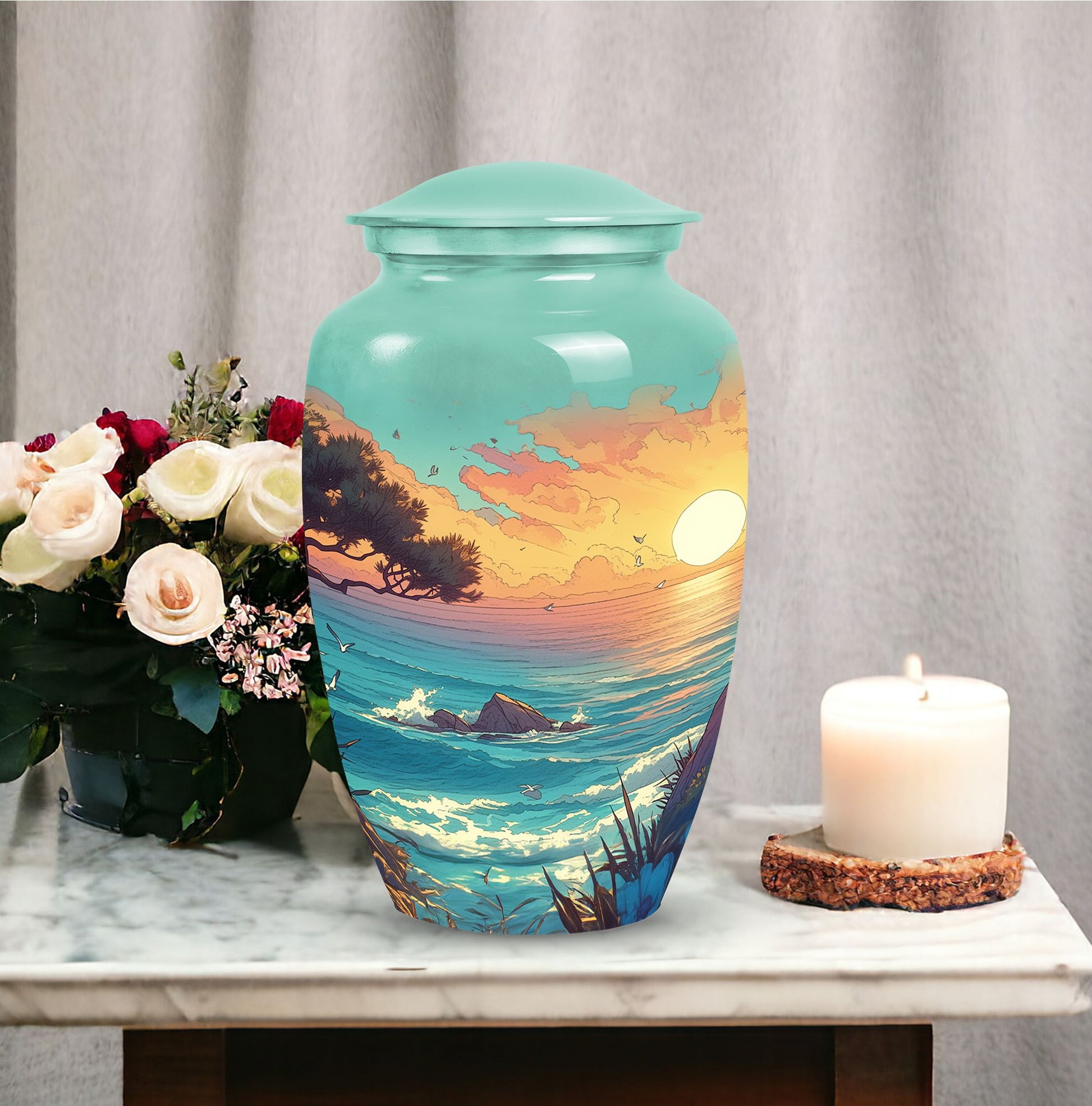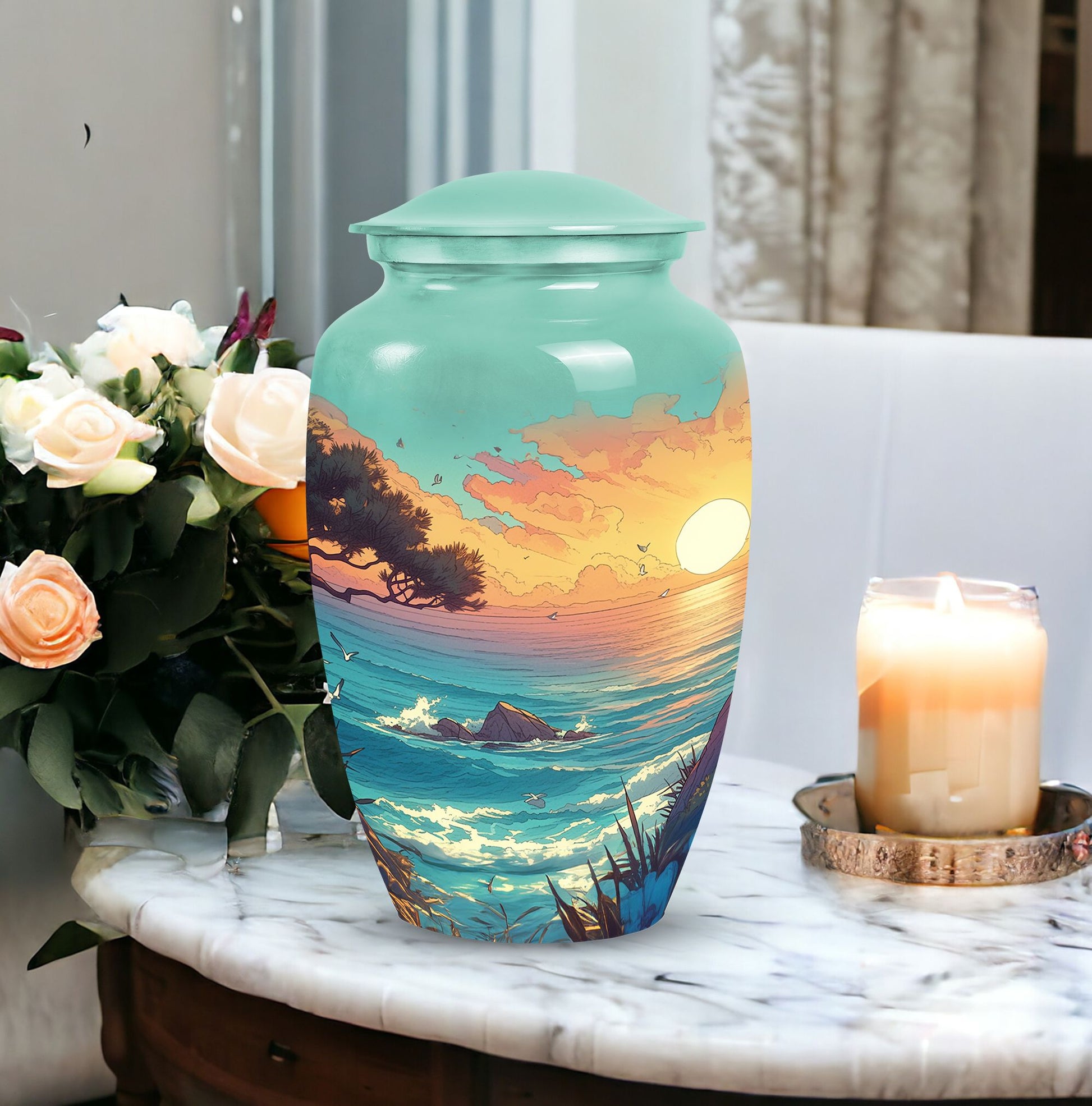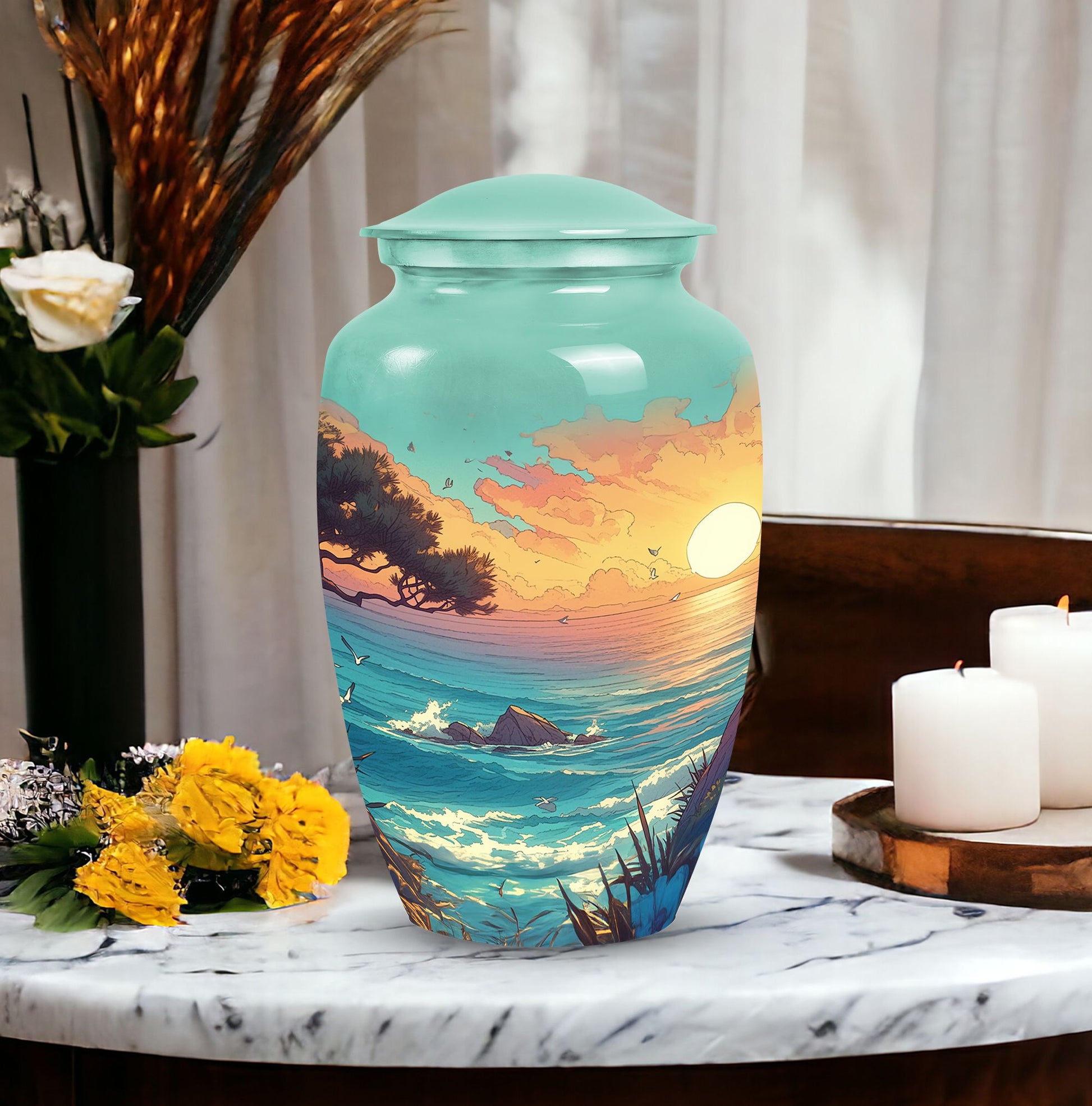 Experience tranquility and honor the memory of a loved one with our Sunset Urn. With a delightful navy hue that captures the serenity of a serene twilight, this Blue Urn sets an ambience of peace in any memorial ceremony. Carefully crafted, it's not just a funeral urn but a precious memento that seals cherished memories. Cremation urns don't need to be depressing and our product is proof: it's a reminder of an eternal sunset, depicting the transient yet beautiful journey of life. Our urns serve as an elegant decoration piece as well while delivering a subtle yet impactful message of remembrance. The product falls under a special breed of burial urns, uniquely blending functionality and aesthetics. With its appealing design, it will seamlessly capture the spirit of the departed, turning a somber occasion into a celebration of life.