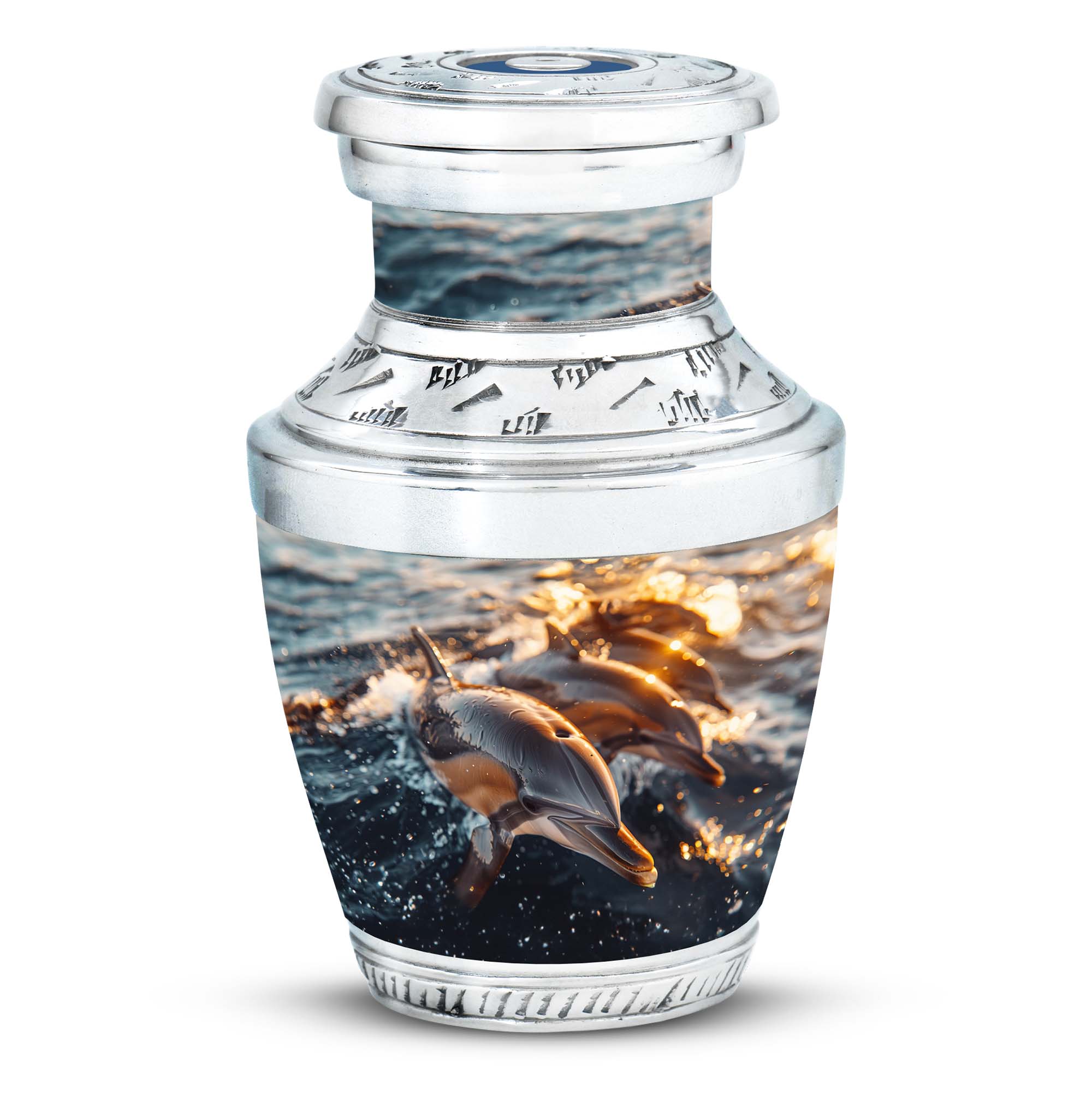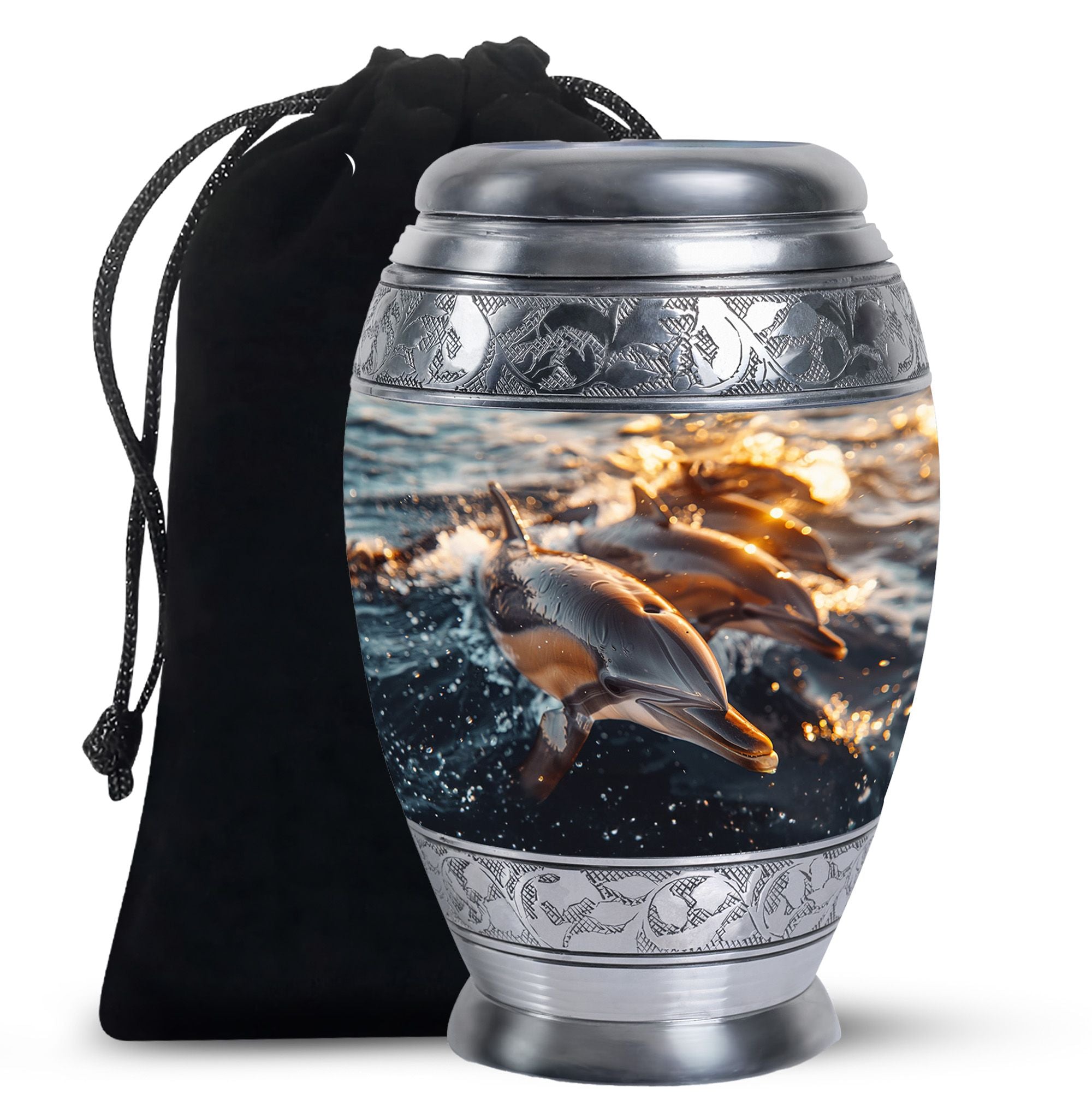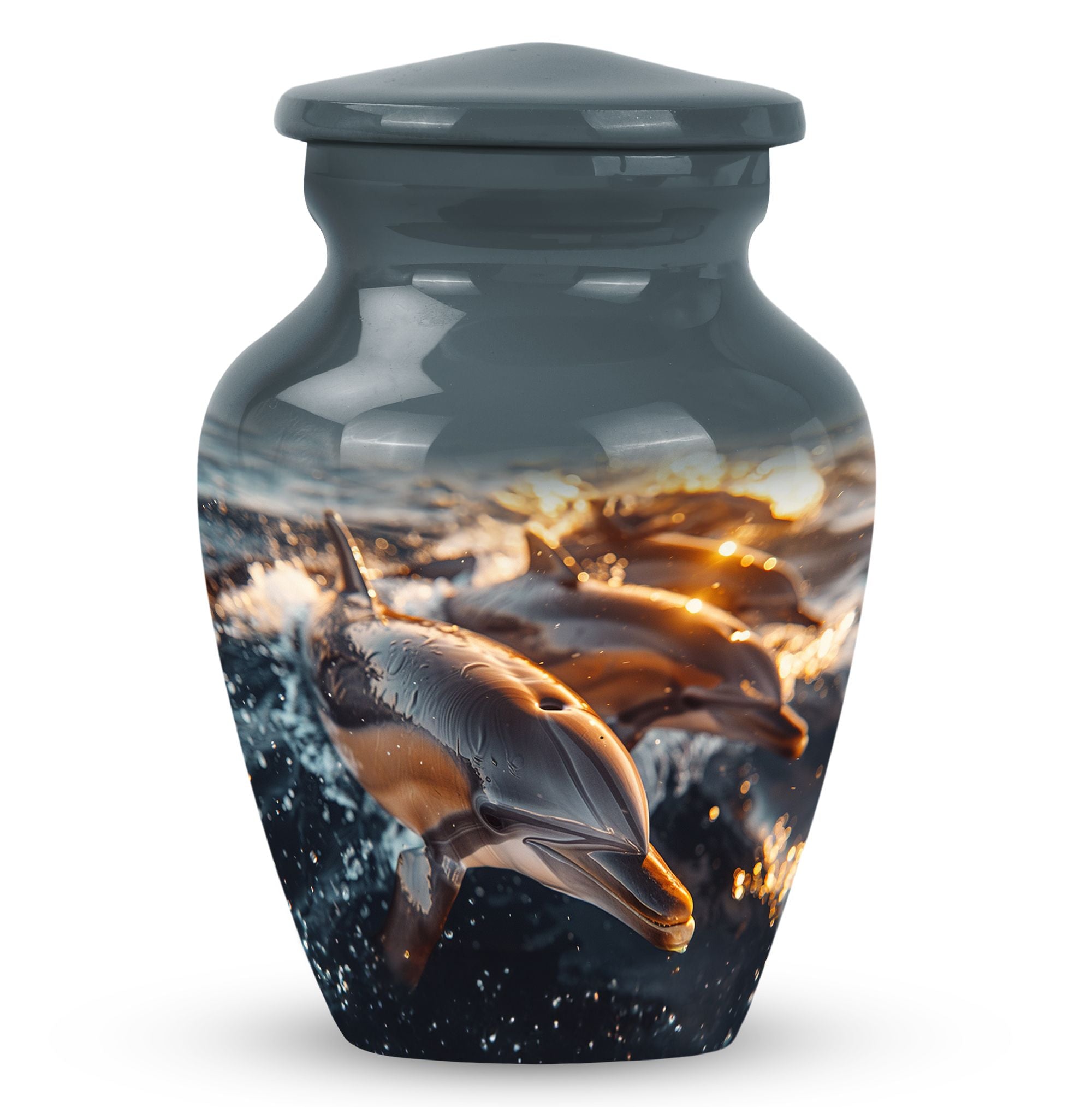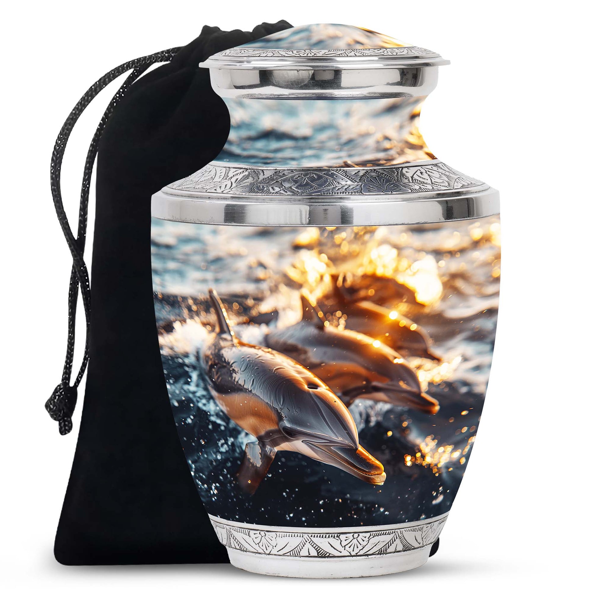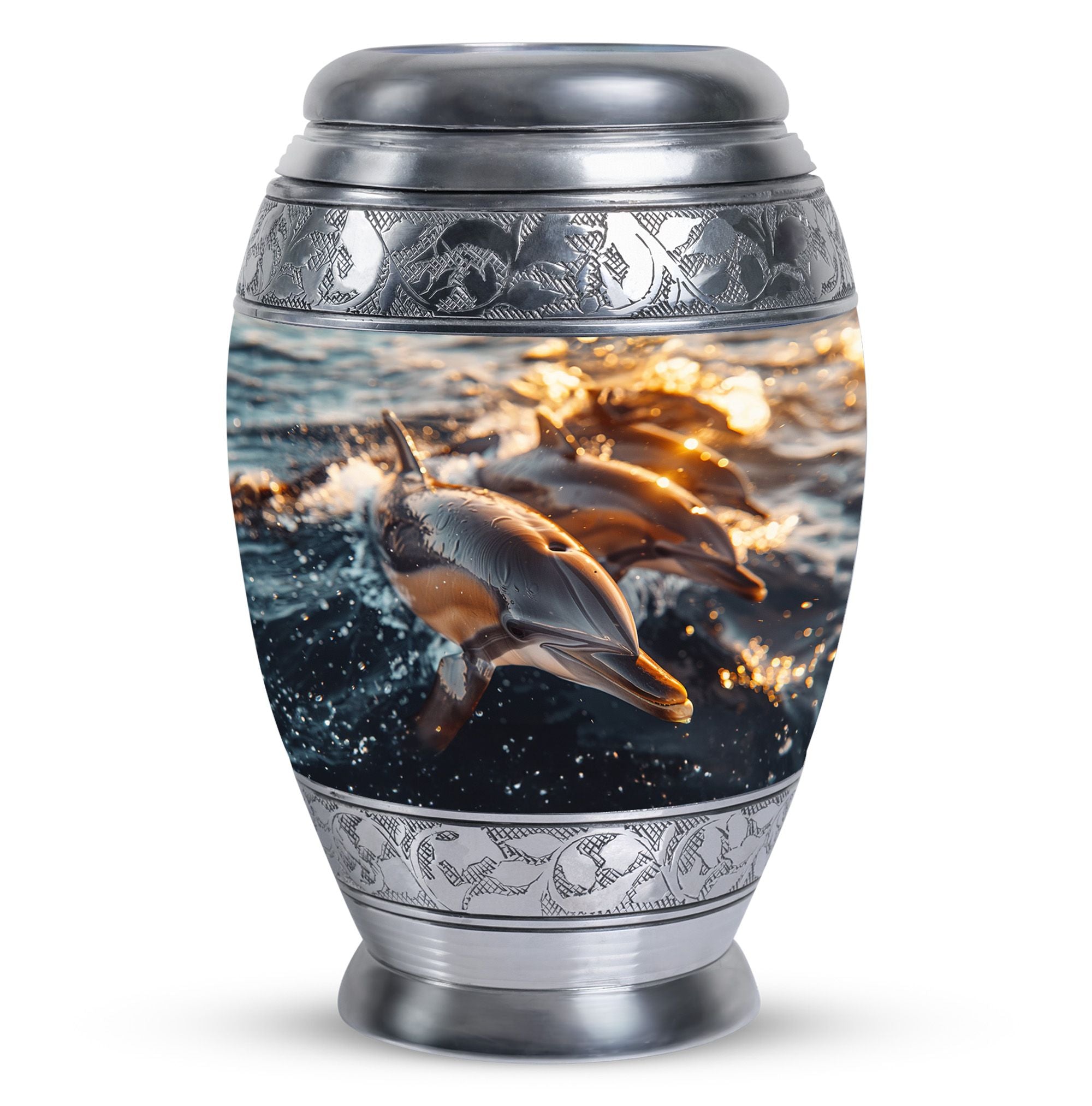 Crafted from premium aluminium, this urn showcases a vivid sunset scene with dolphins in motion, symbolizing freedom and everlasting connection. Its quality craftsmanship makes it suitable as urn for ashes adult male small, urn for adult male, or urns for ashes adult female, while providing secure placement with its screw-top lid. Families may also choose it as urn for human ashes adult male or urns for adult female, honoring loved ones with grace.