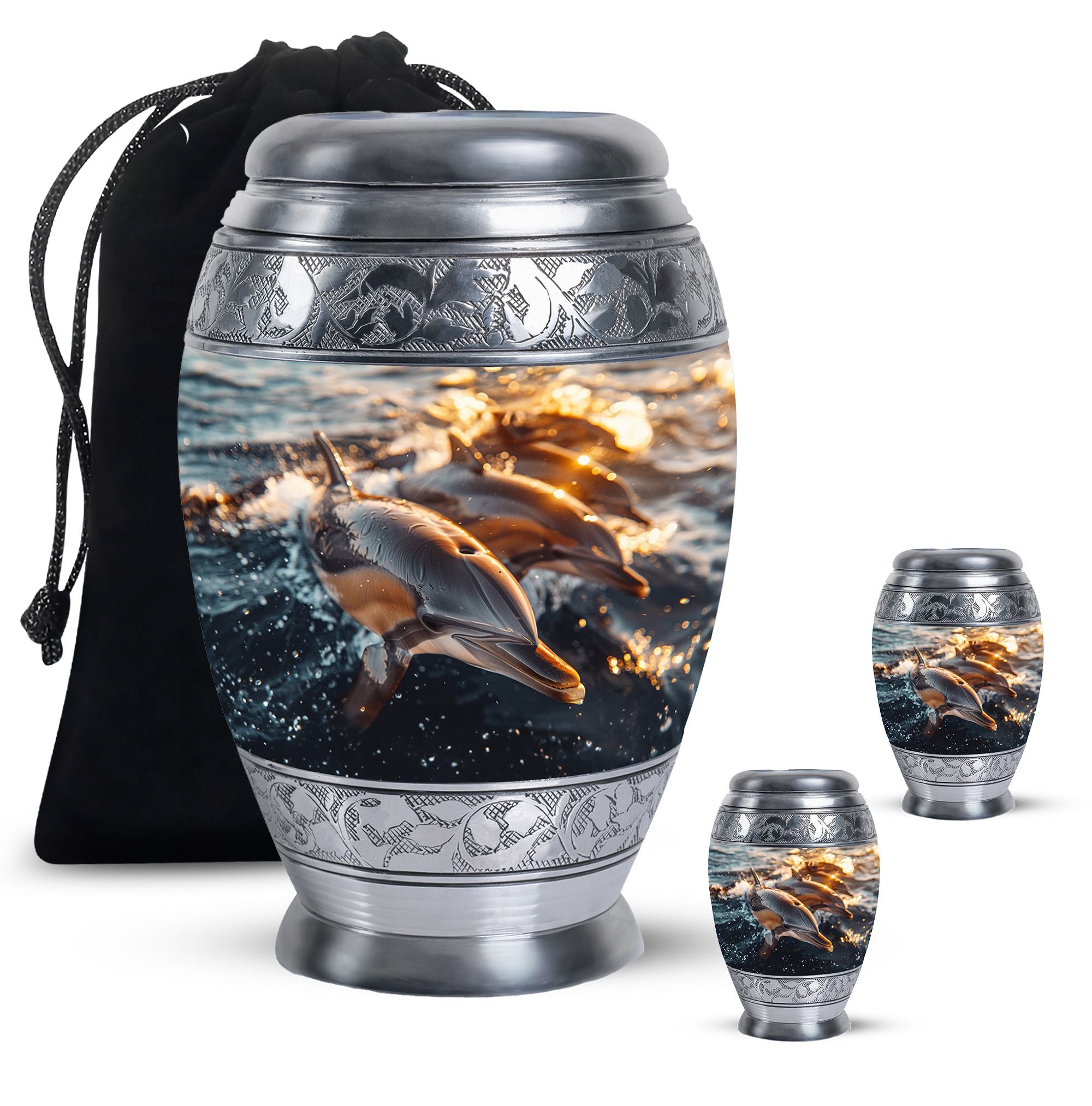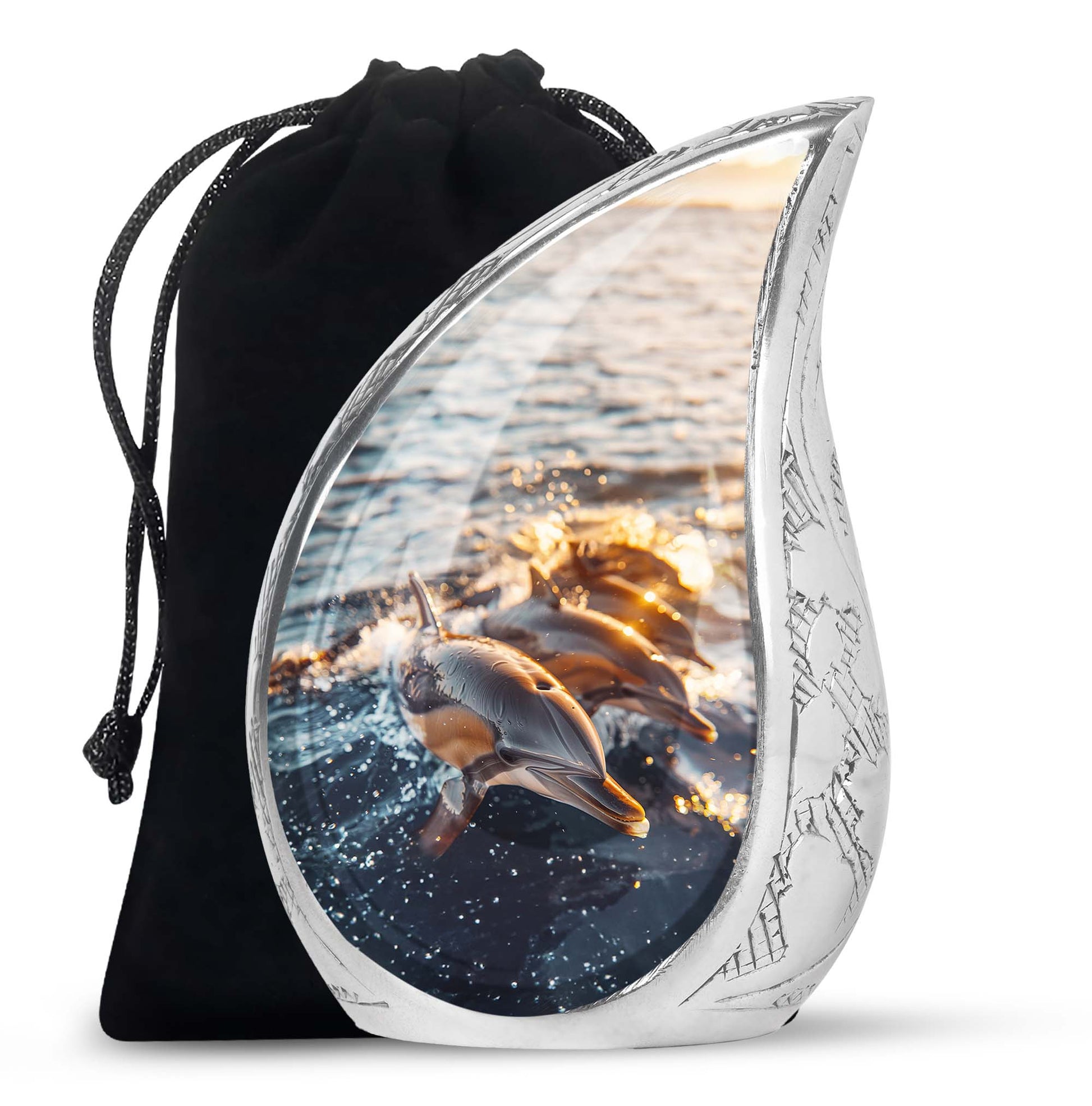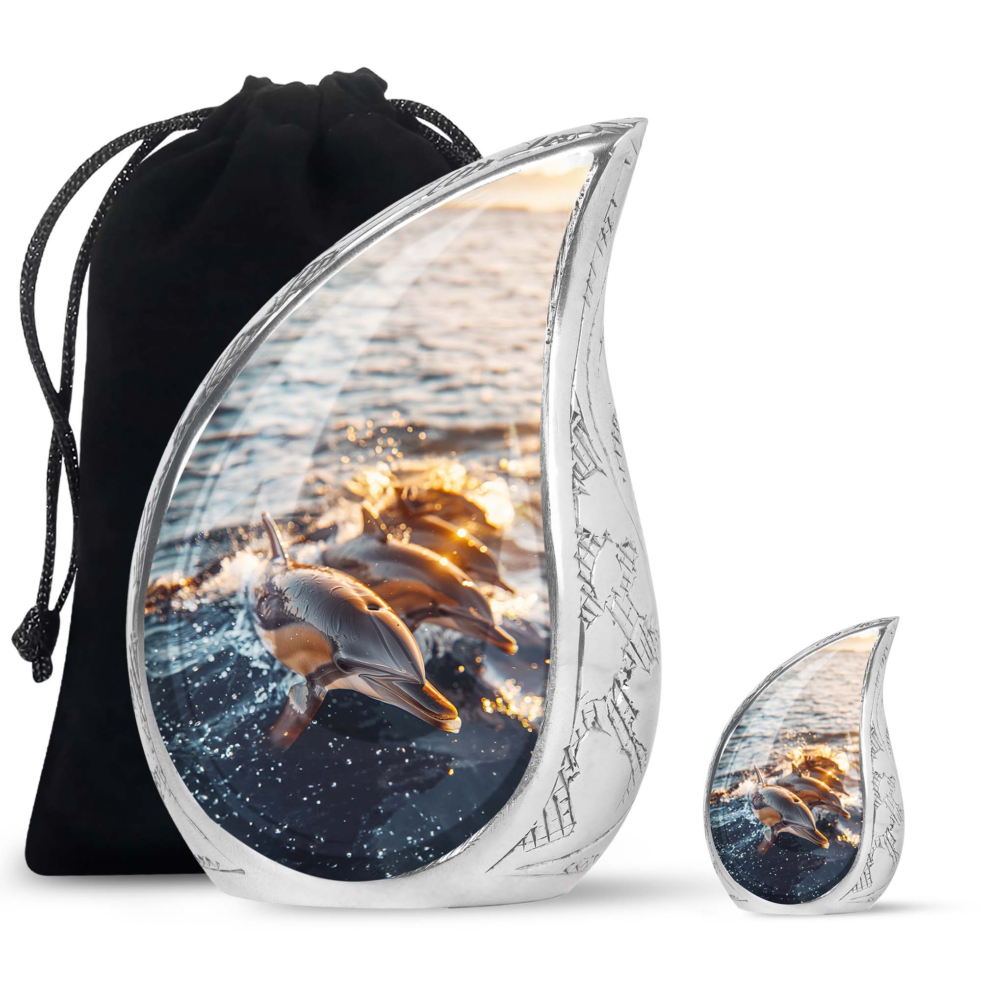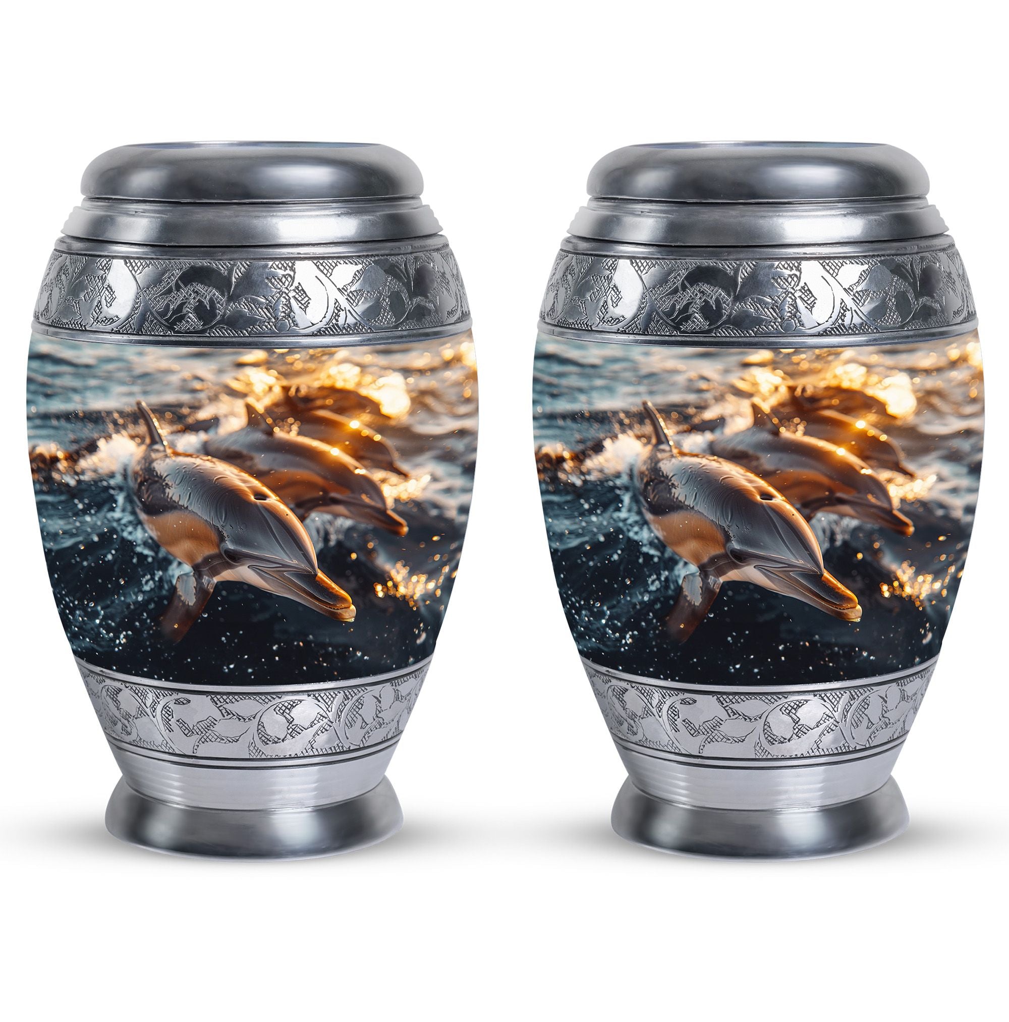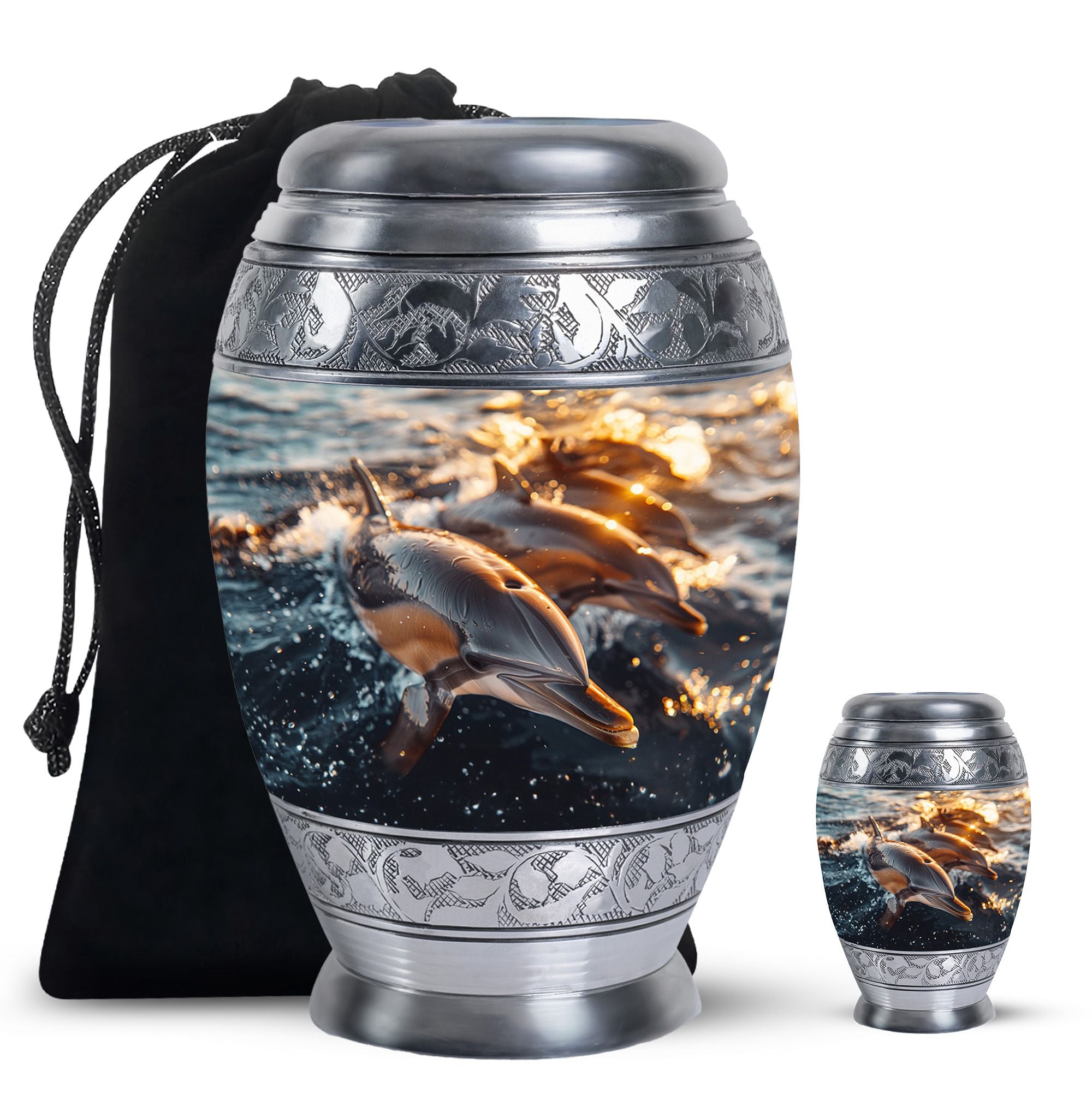 Crafted from premium aluminium, this urn showcases a vivid sunset scene with dolphins in motion, symbolizing freedom and everlasting connection. Its quality craftsmanship makes it suitable as urn for ashes adult male small, urn for adult male, or urns for ashes adult female, while providing secure placement with its screw-top lid. Families may also choose it as urn for human ashes adult male or urns for adult female, honoring loved ones with grace.