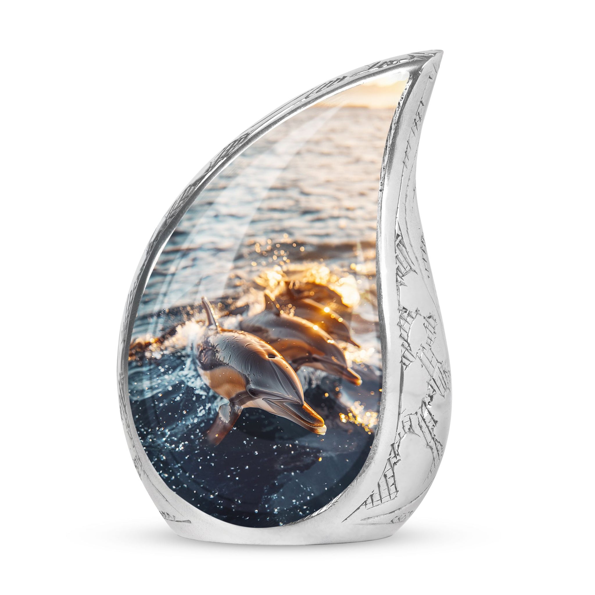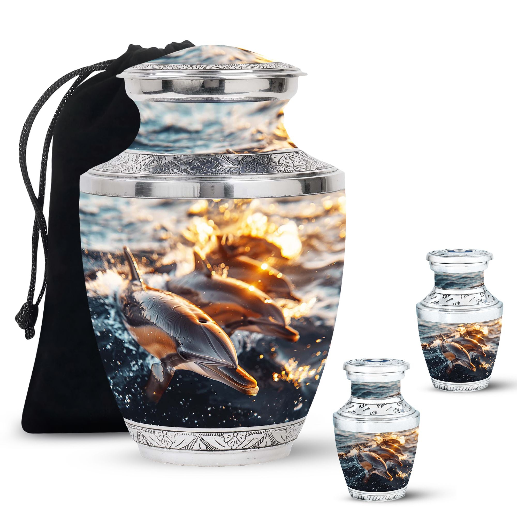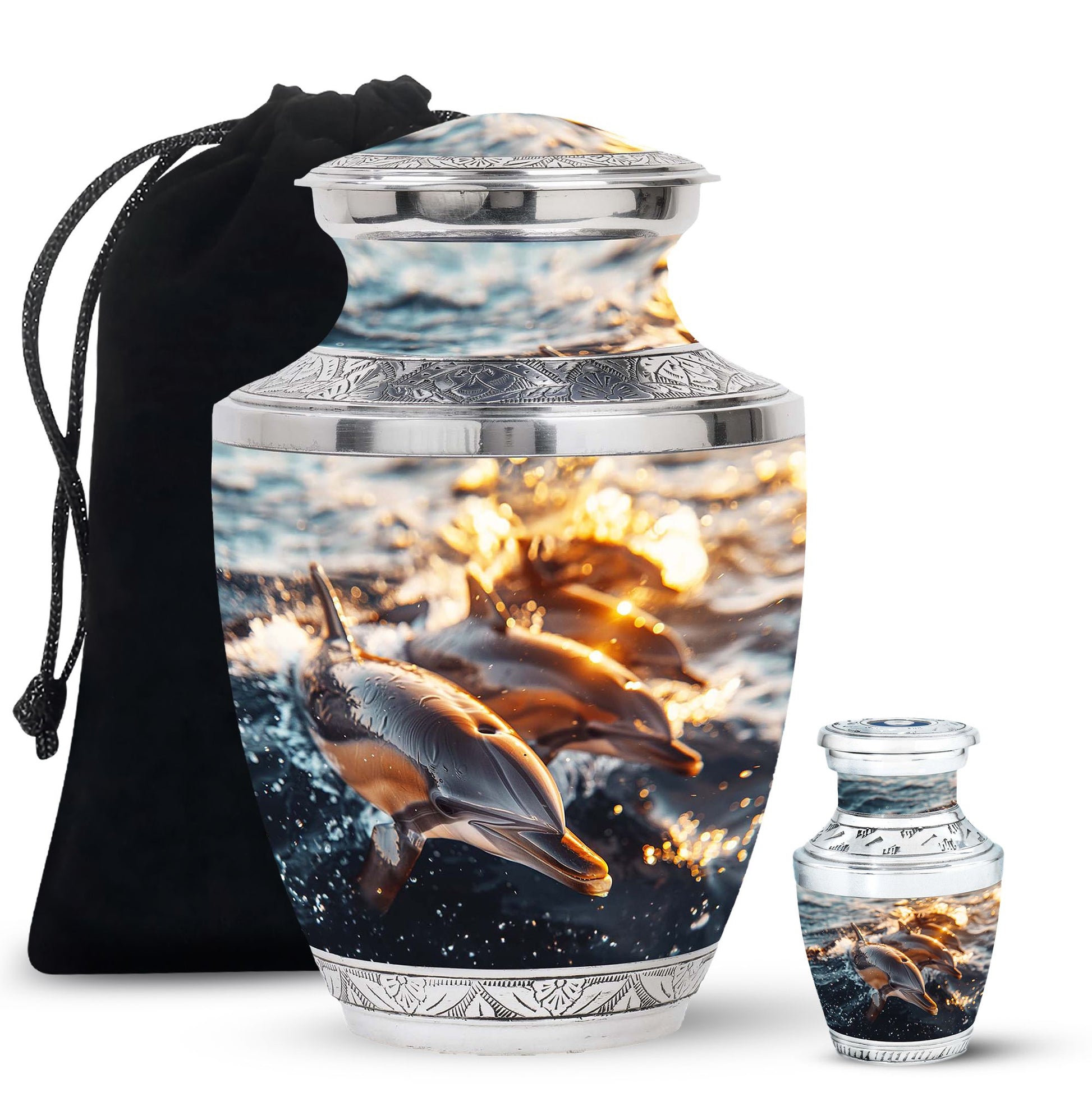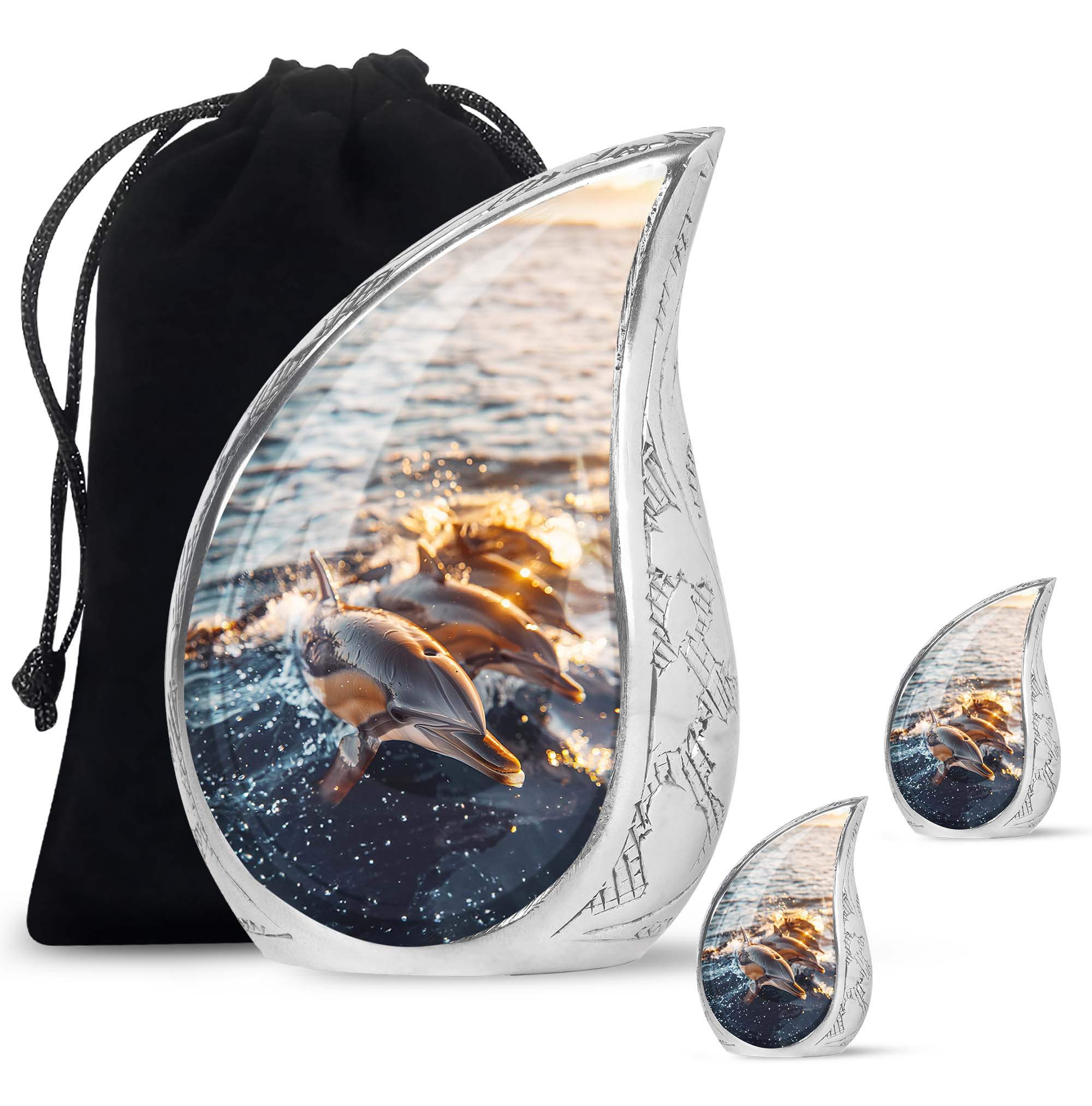 Crafted from premium aluminium, this urn showcases a vivid sunset scene with dolphins in motion, symbolizing freedom and everlasting connection. Its quality craftsmanship makes it suitable as urn for ashes adult male small, urn for adult male, or urns for ashes adult female, while providing secure placement with its screw-top lid. Families may also choose it as urn for human ashes adult male or urns for adult female, honoring loved ones with grace.
