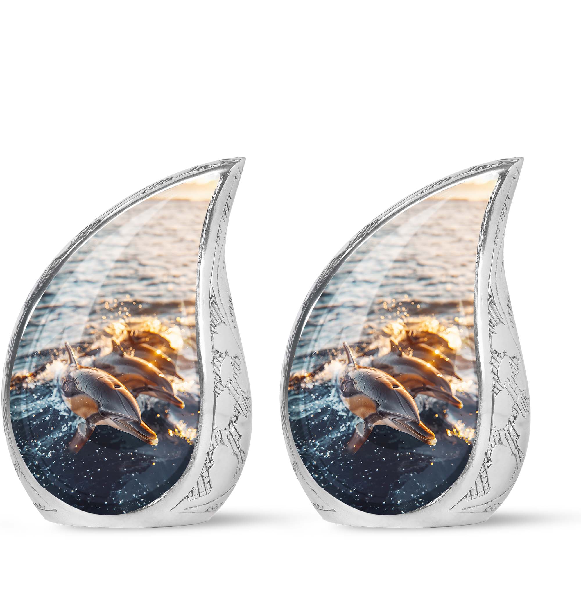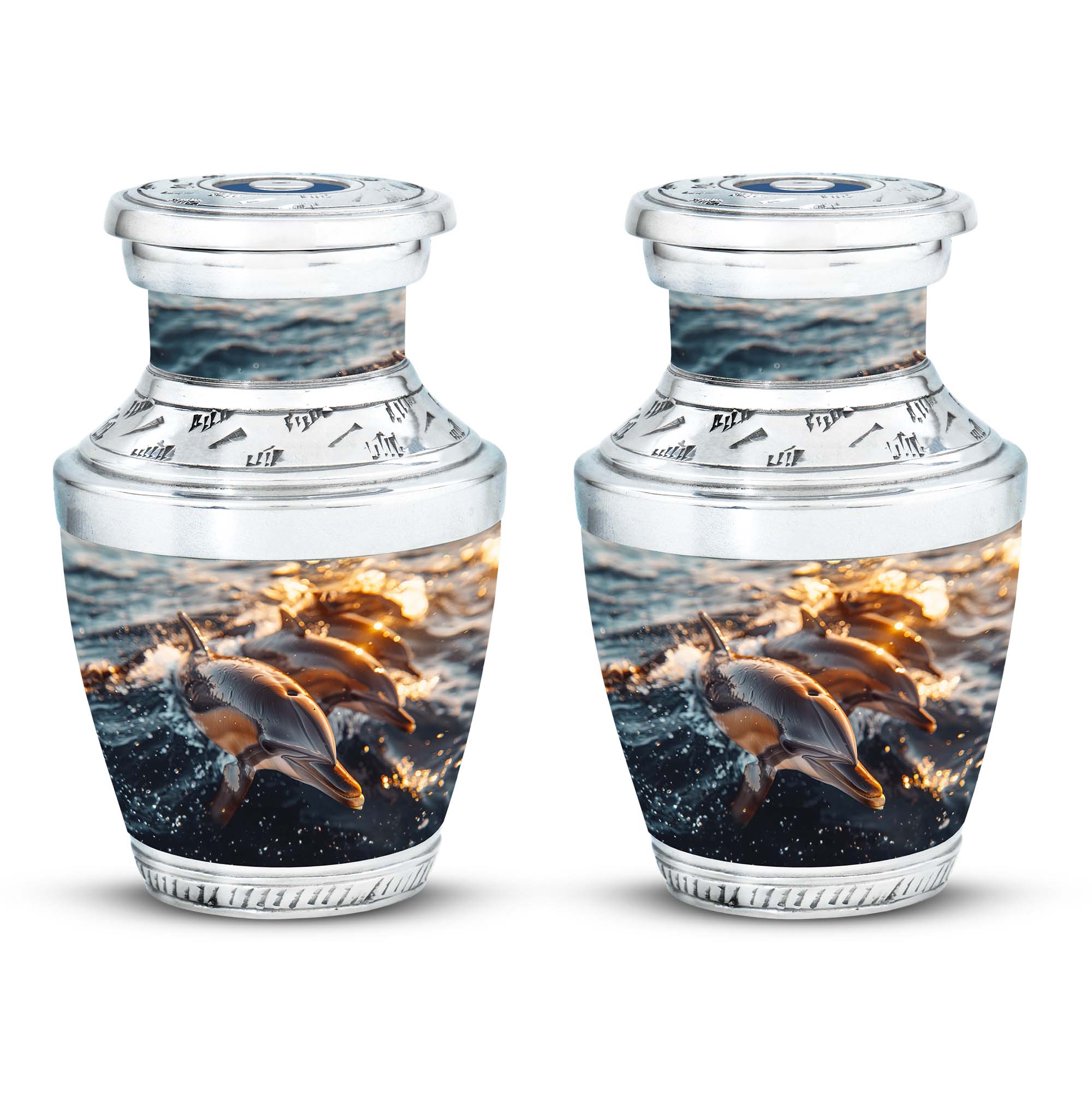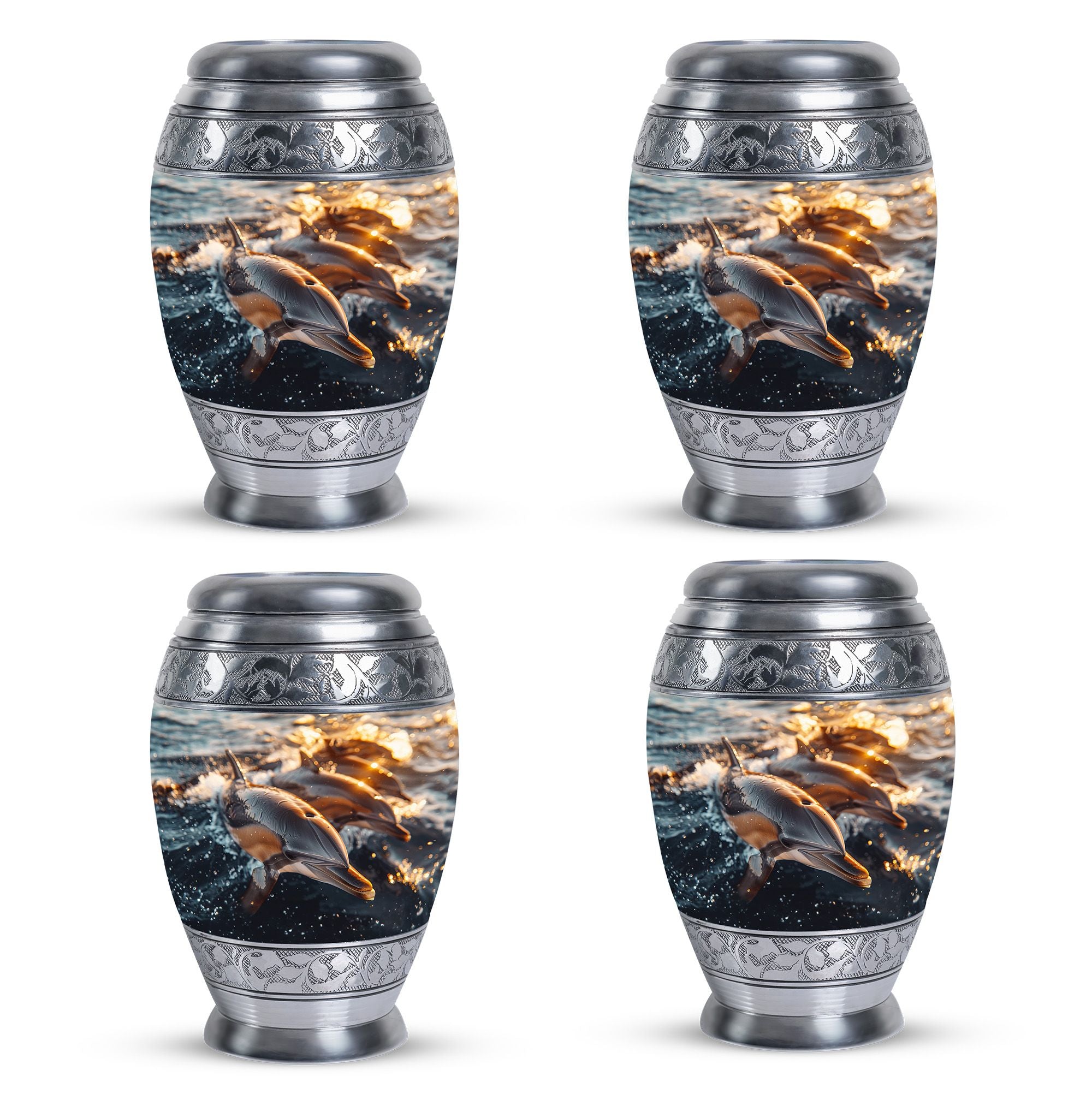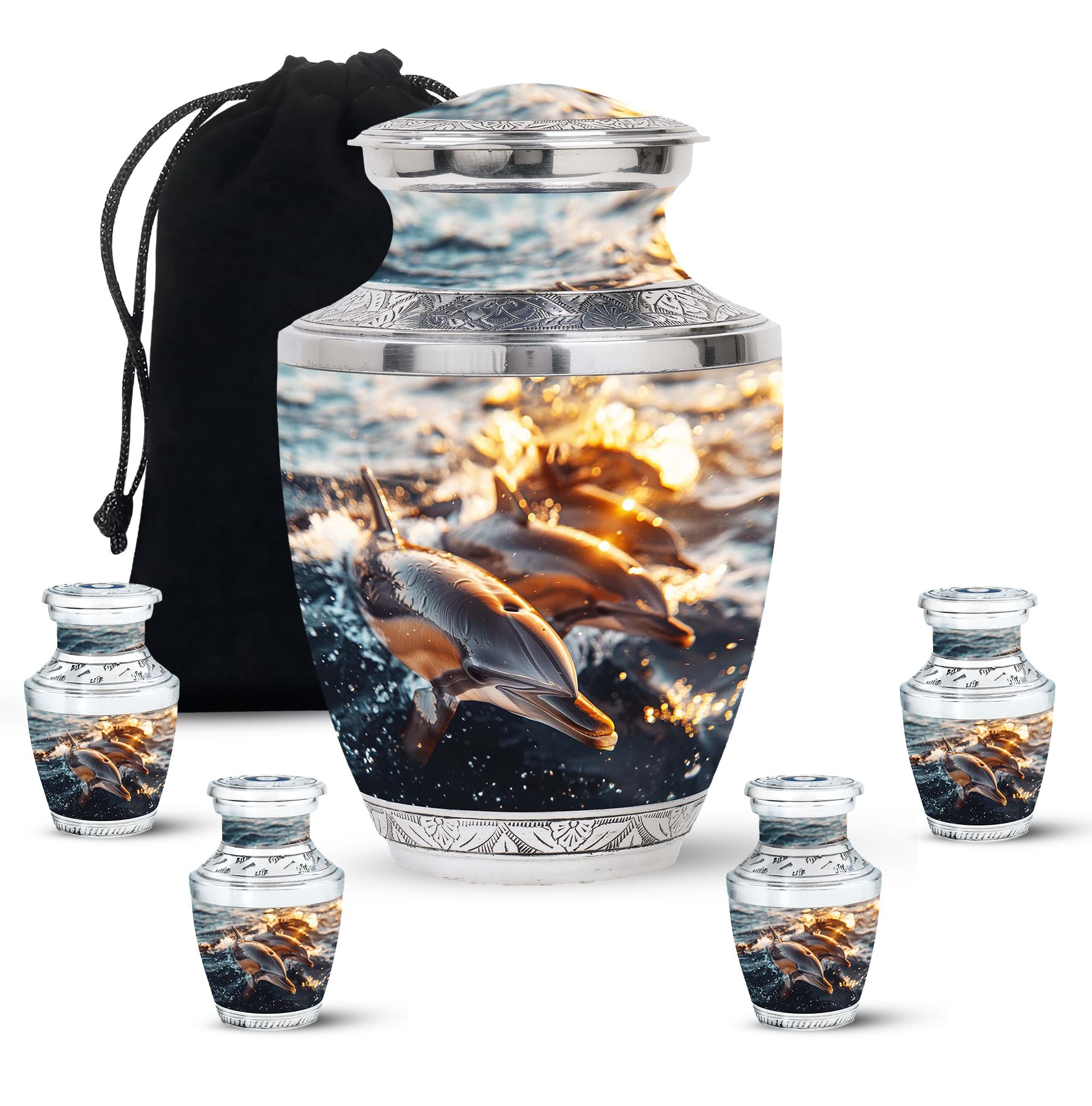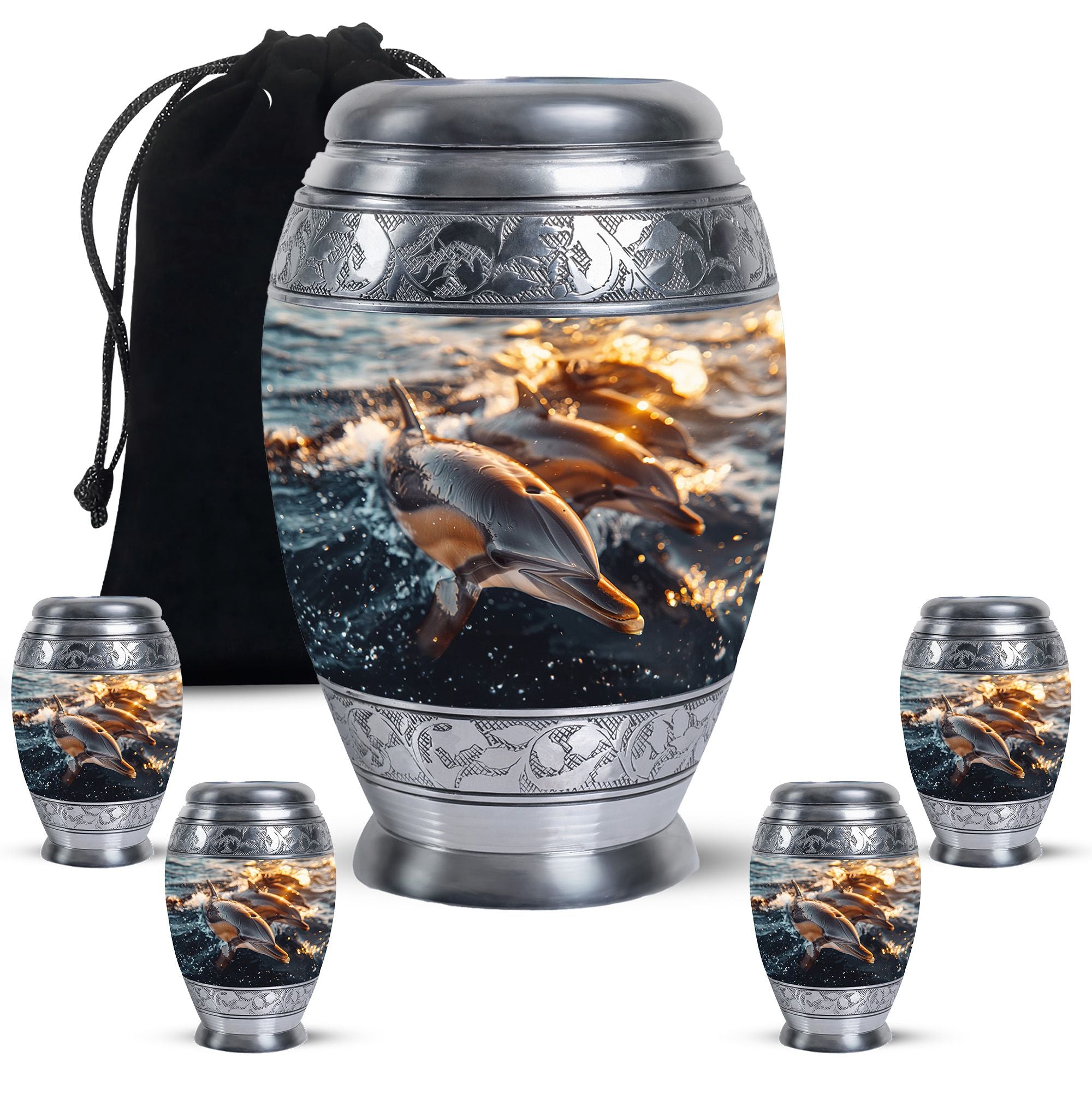 Crafted from premium aluminium, this urn showcases a vivid sunset scene with dolphins in motion, symbolizing freedom and everlasting connection. Its quality craftsmanship makes it suitable as urn for ashes adult male small, urn for adult male, or urns for ashes adult female, while providing secure placement with its screw-top lid. Families may also choose it as urn for human ashes adult male or urns for adult female, honoring loved ones with grace.