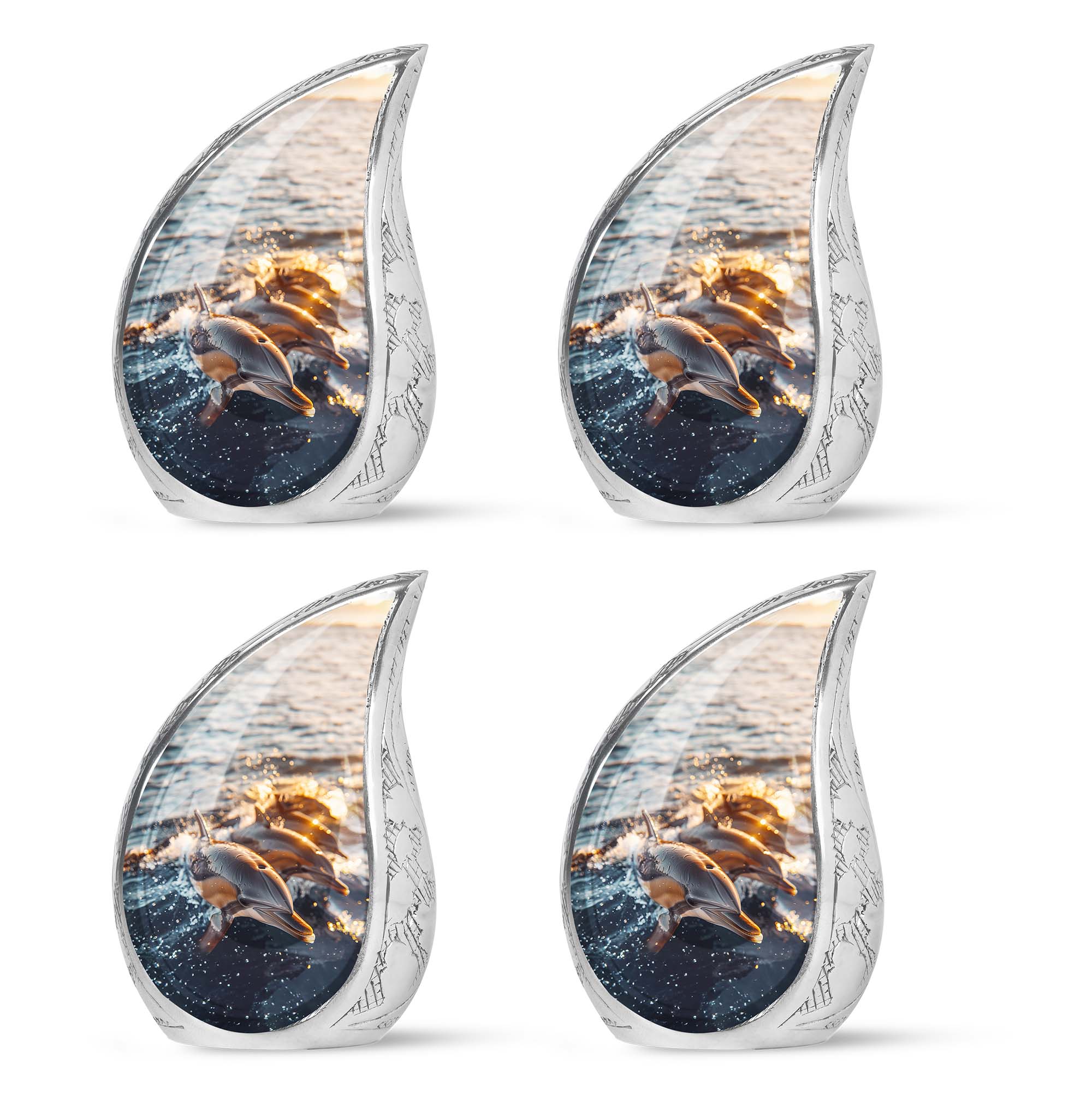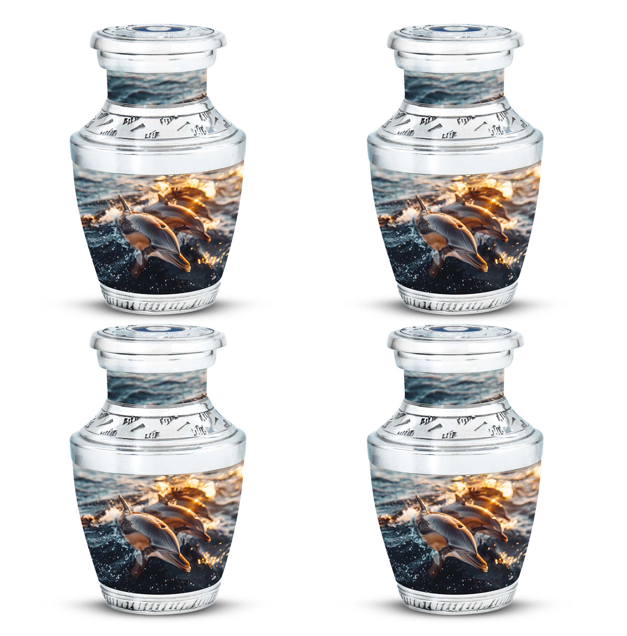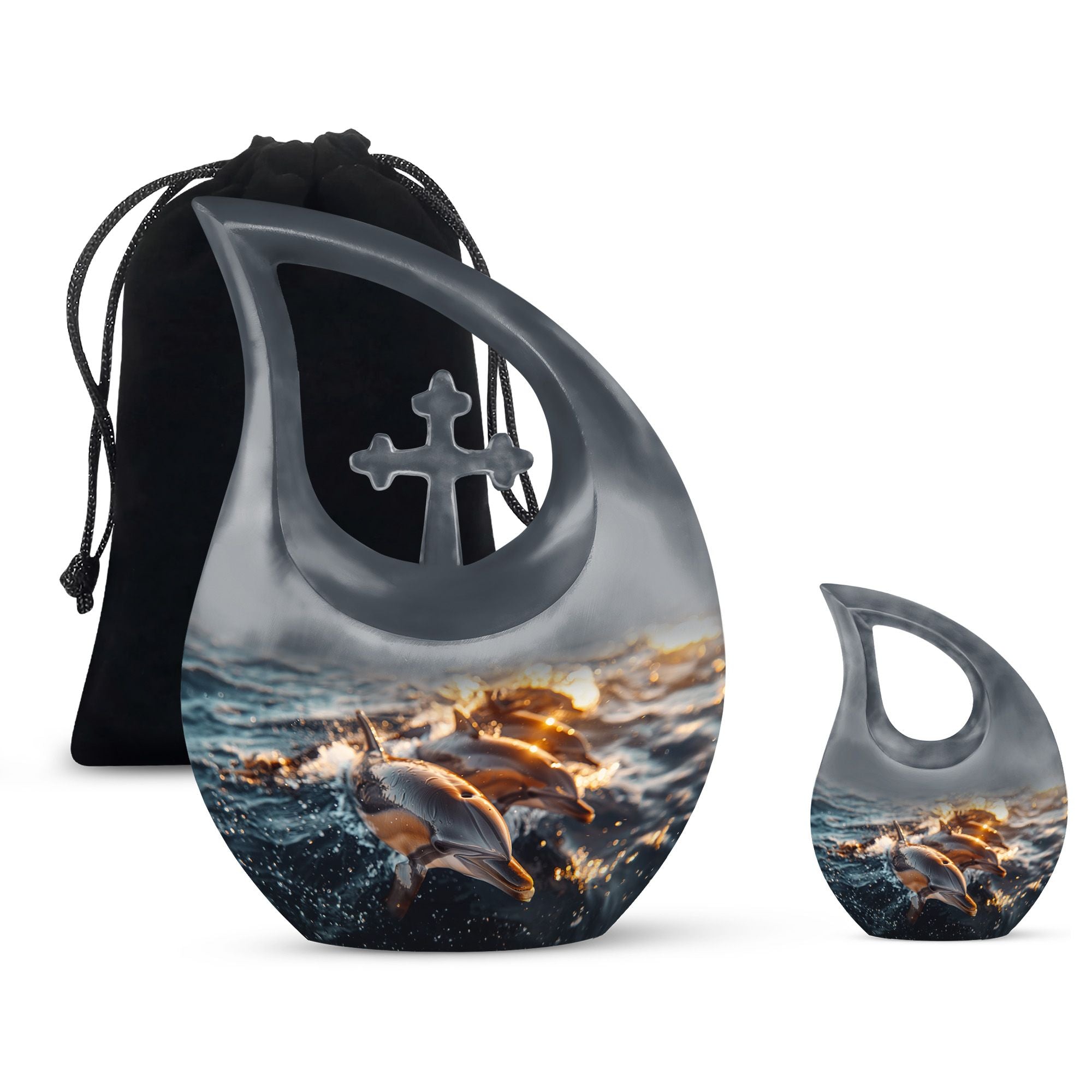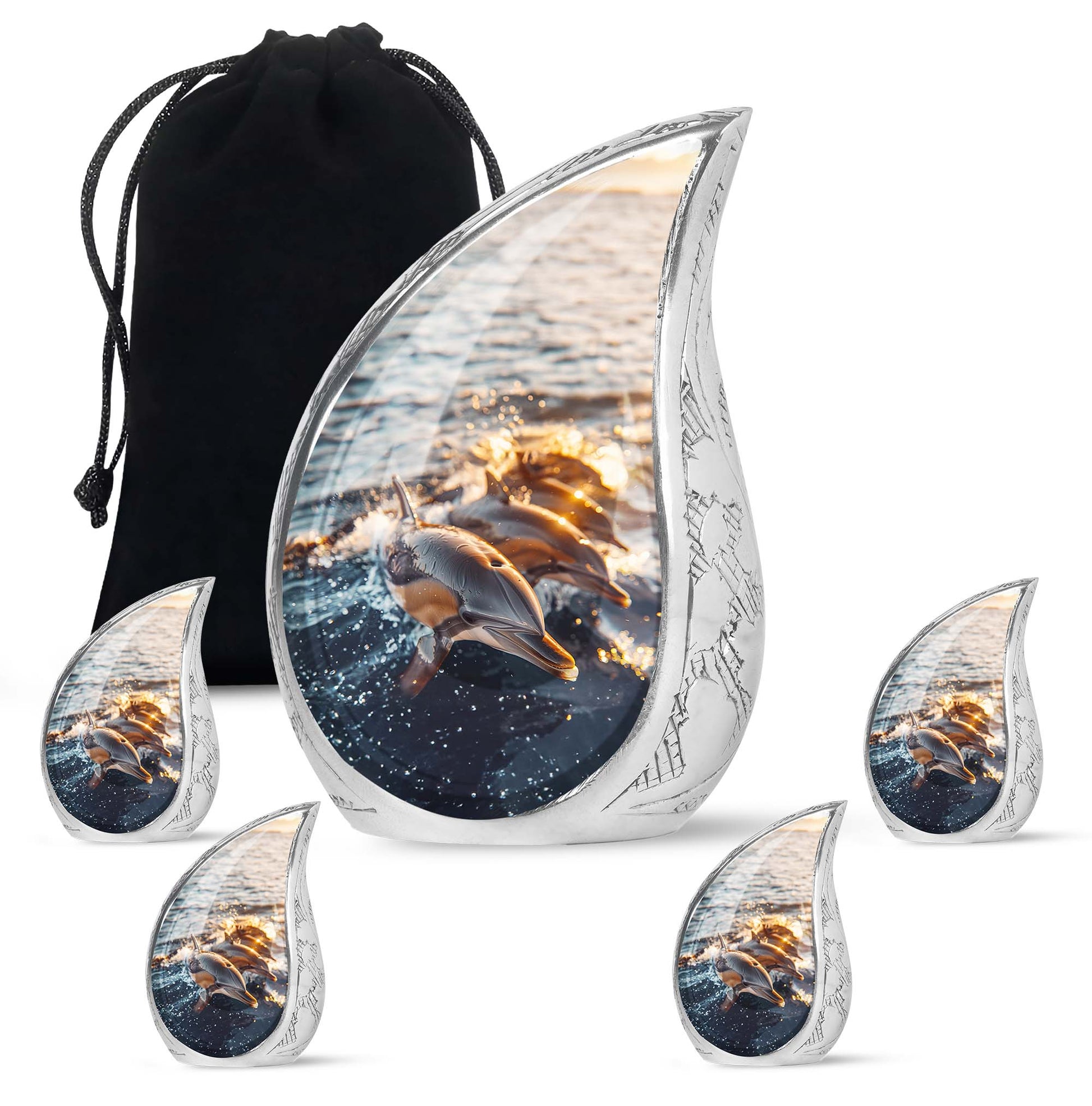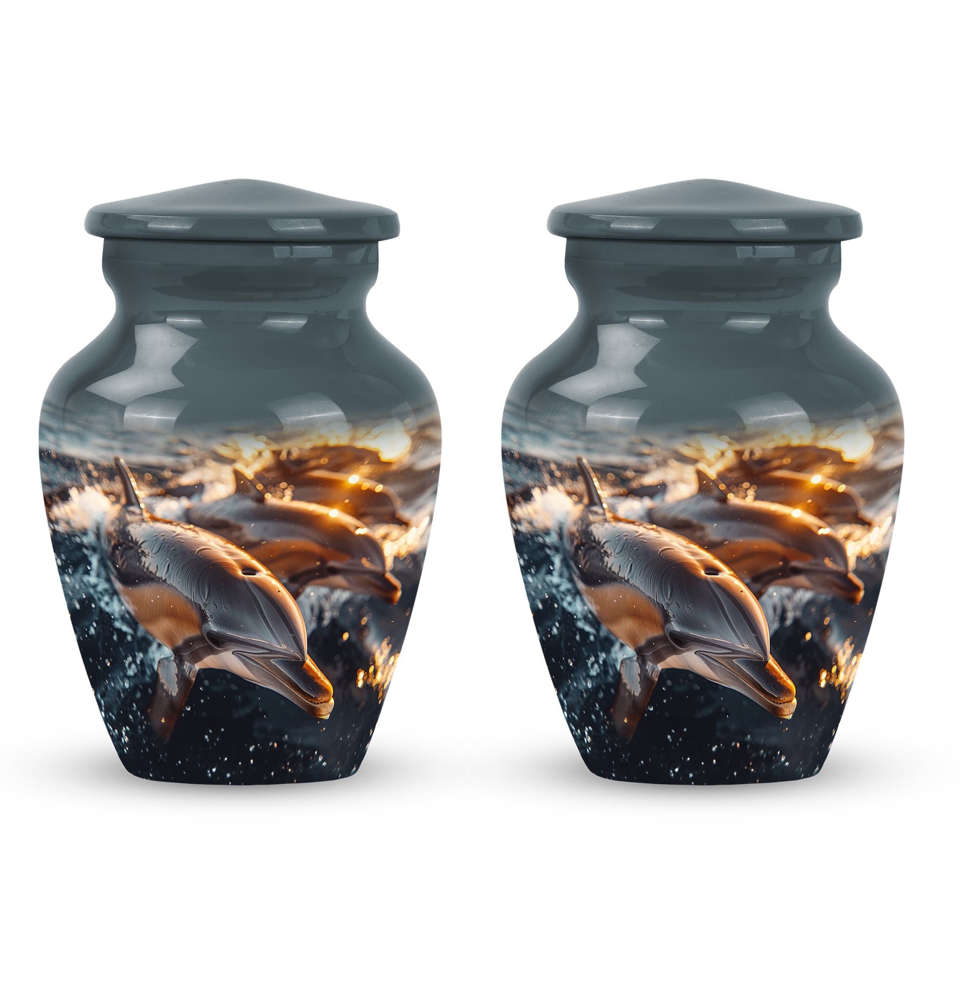 Crafted from premium aluminium, this urn showcases a vivid sunset scene with dolphins in motion, symbolizing freedom and everlasting connection. Its quality craftsmanship makes it suitable as urn for ashes adult male small, urn for adult male, or urns for ashes adult female, while providing secure placement with its screw-top lid. Families may also choose it as urn for human ashes adult male or urns for adult female, honoring loved ones with grace.