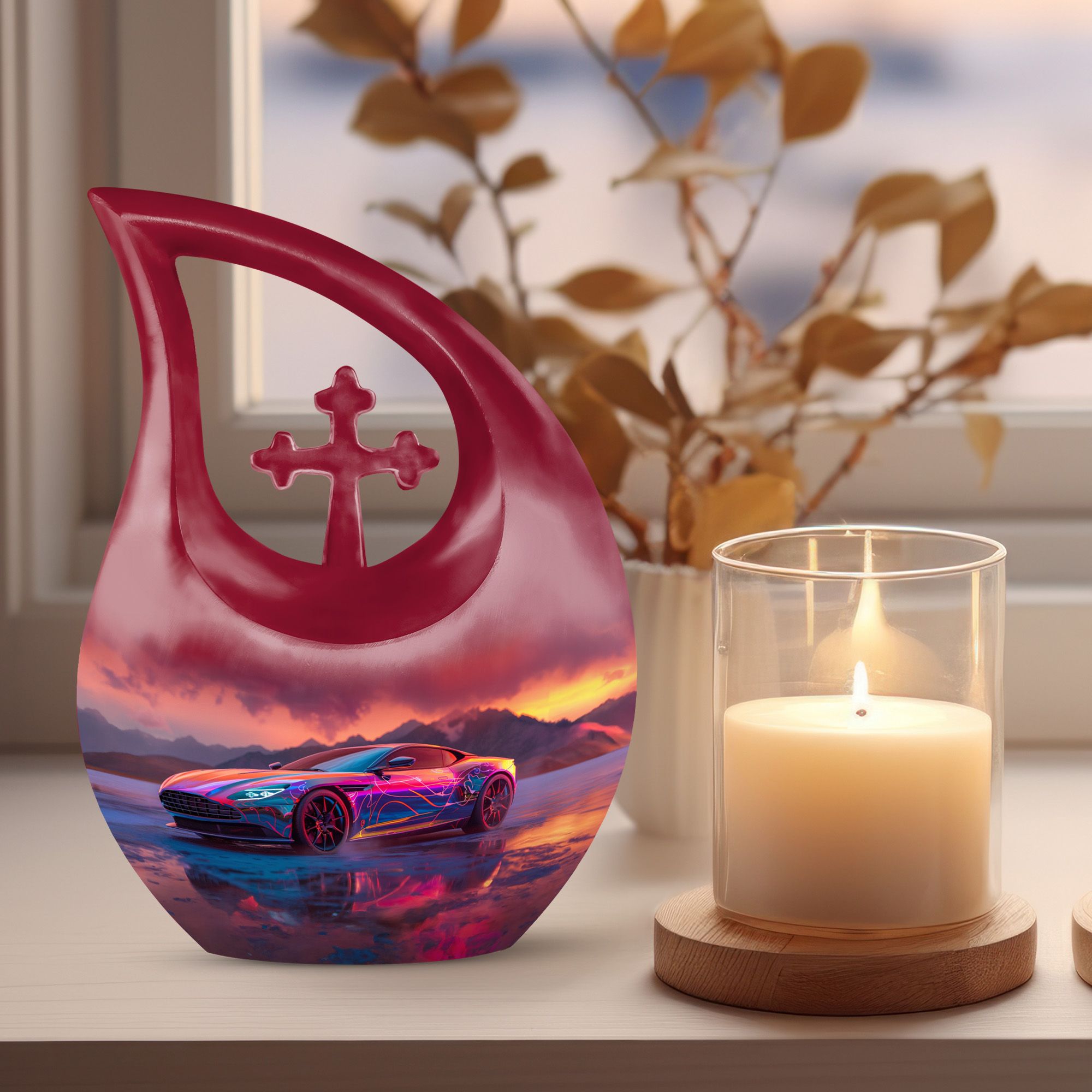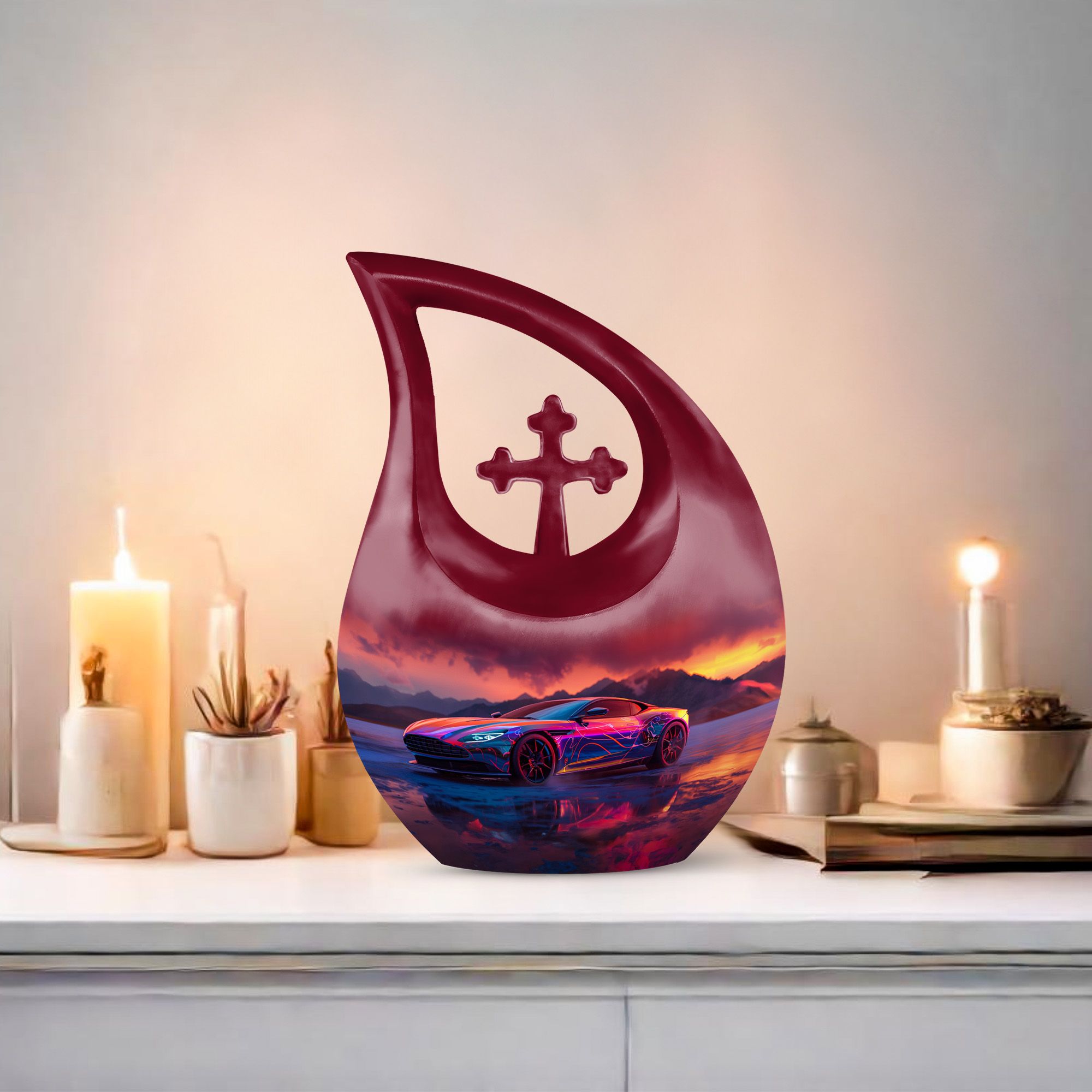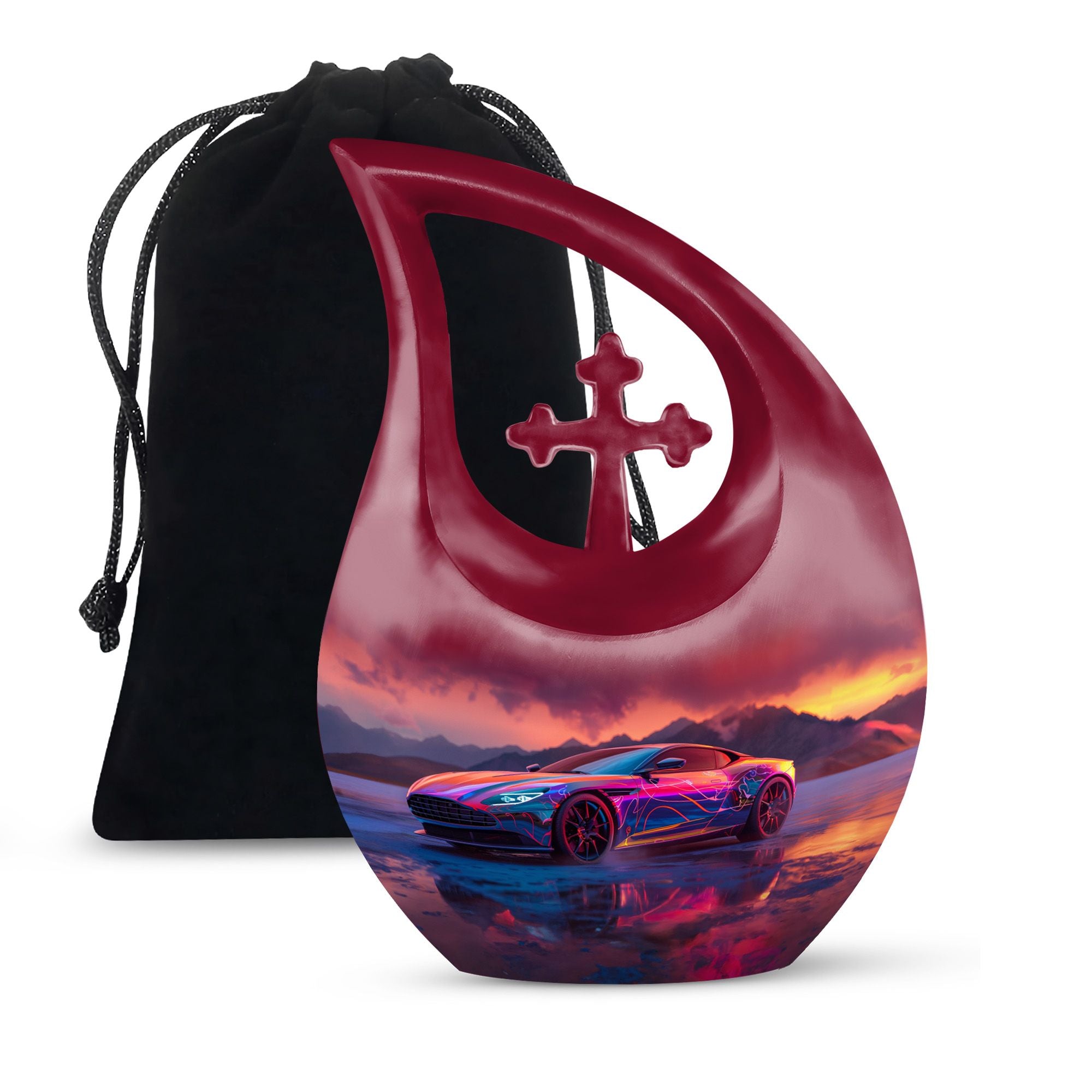 Create a long-lasting tribute to your loved one with our 10-inch-size Neon Sunset Dreamscape Urn, a truly remarkable apparatus among memorial urns. Primarily crafted from sturdy Aluminium, this cremation ash vase weighs a solid 3.3 pounds, offering a reminisce of the calming and protective essence your loved one. The urn is perfectly sized with a capacity to hold up to 200 cubic inches of ashes, safely secured in an accompanying velvet pouch. We offer you the opportunity to add a personal touch to these large urns by engraving names onto it, making it wholly unique. Its distinct theme of the 'Neon Sunset Dreamscape', coupled with the rare 'Cross Drop' shape, adds an elegant edge to its presence. With its vibrant color and aesthetic design, this urn serves as a beautiful, respectful home for the ashes of your loved ones. Our urns aren't just containers; they are a celebratory memory of lives spent with love and harmony.
