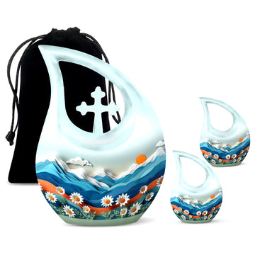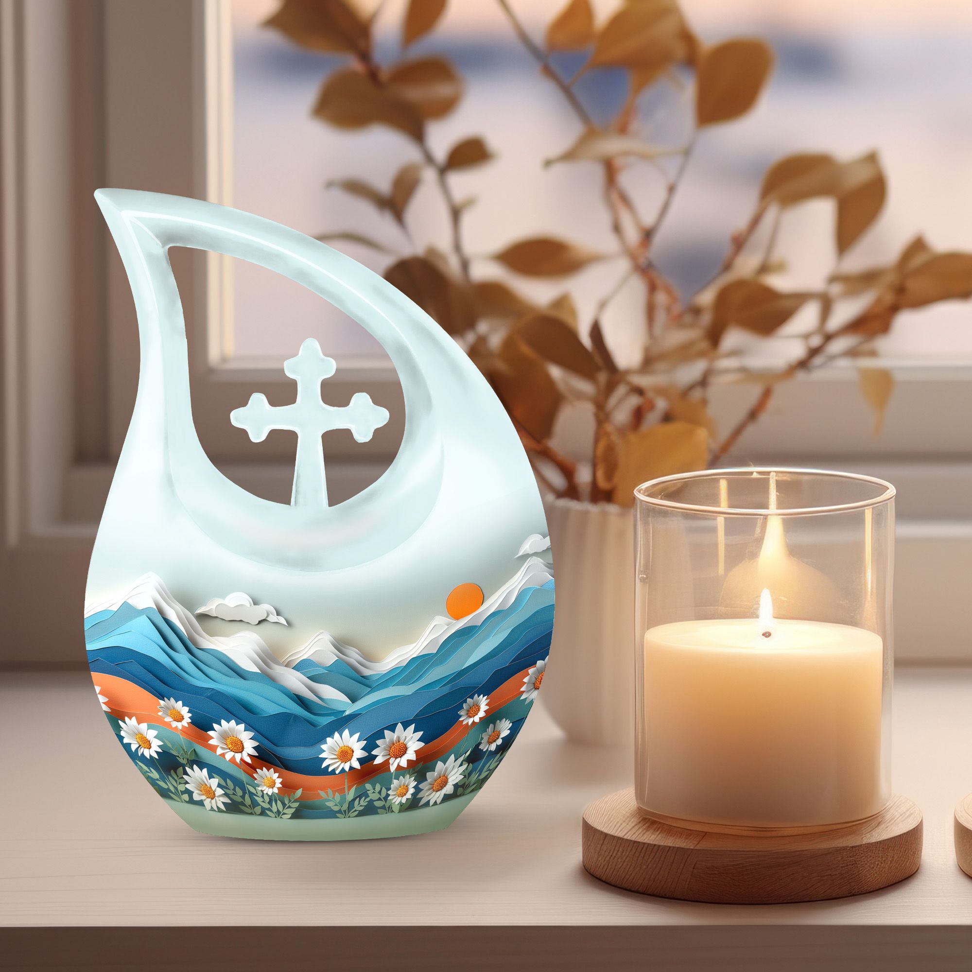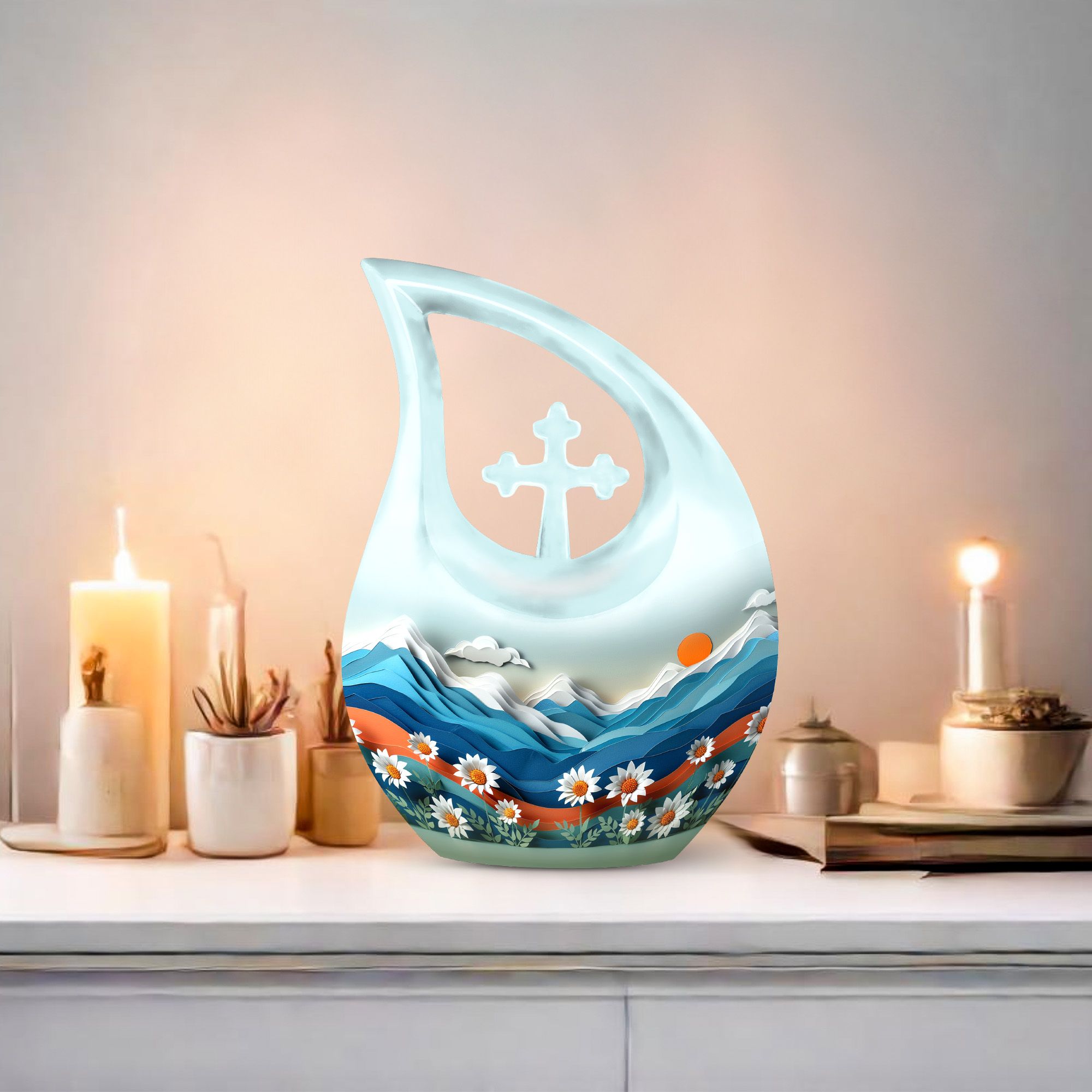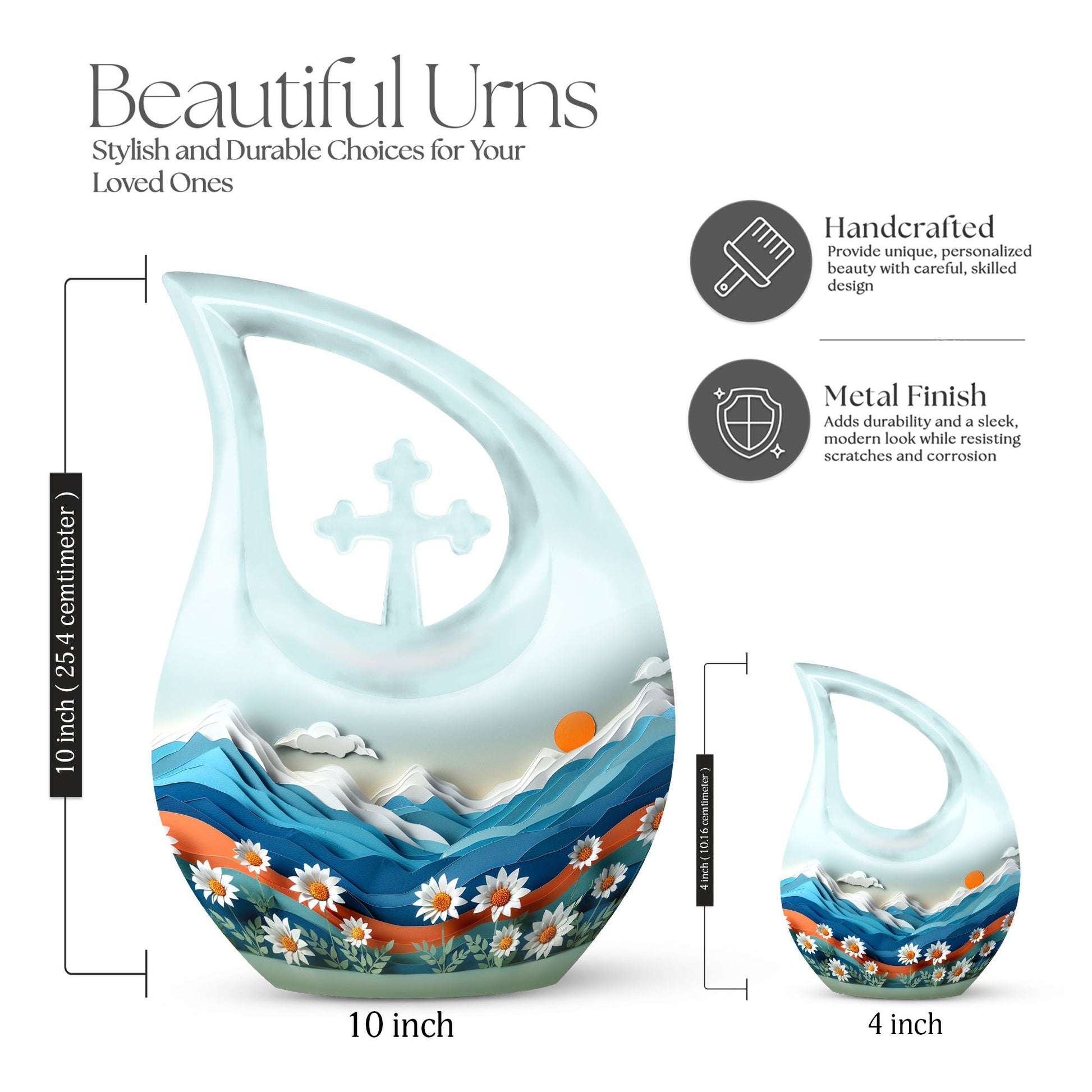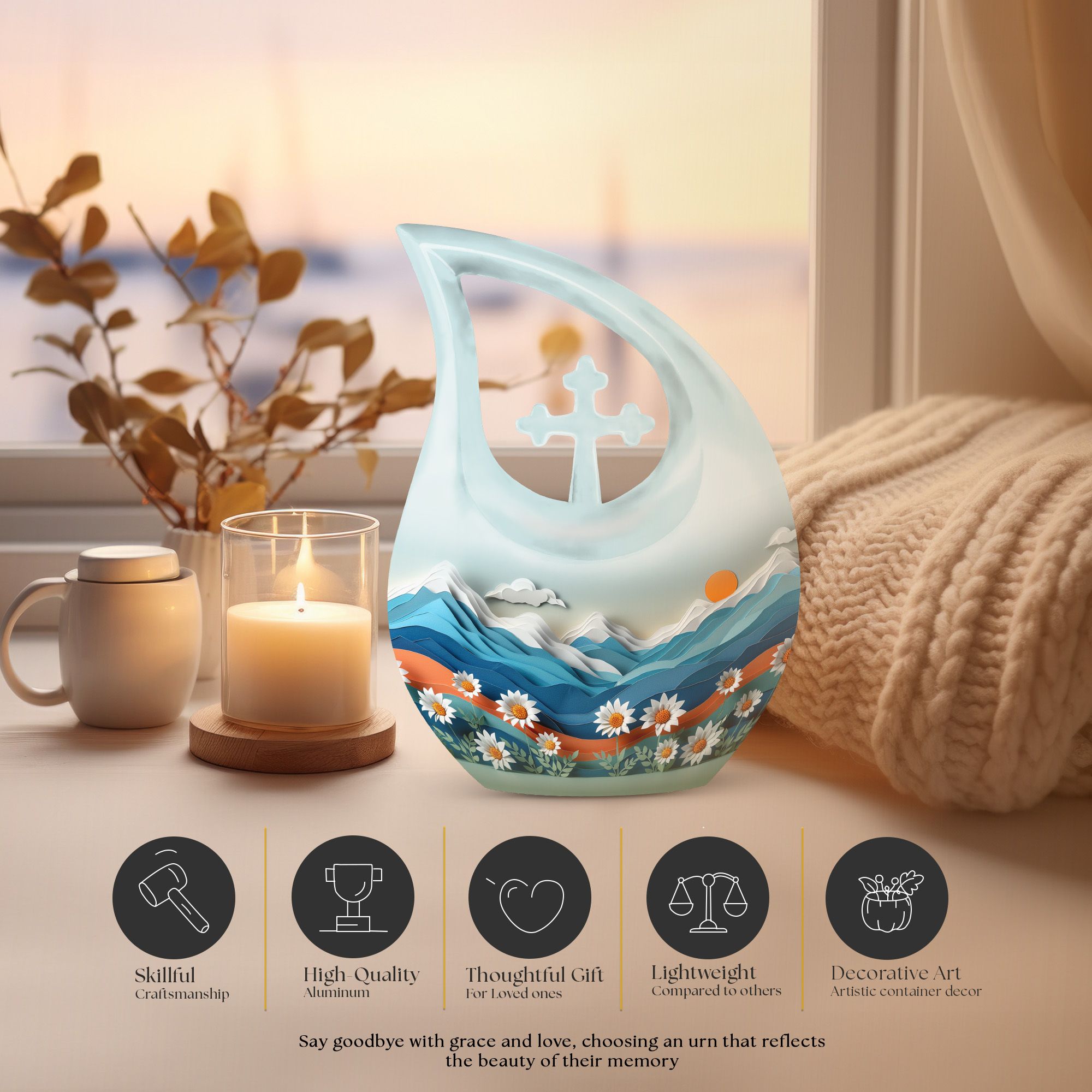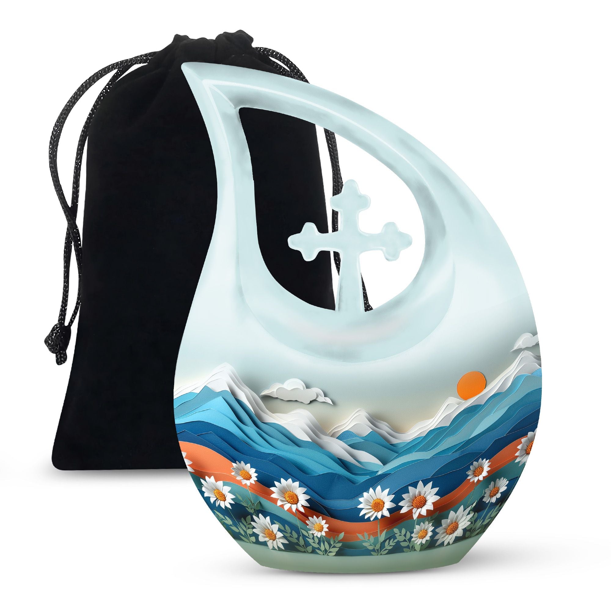 Embrace tranquility with our 'Sunset Over A Urn', a large, beautifully designed funeral urn that stands 10 inches tall and has the capacity to hold 200 cubic inches of ashes. Made from robust aluminium, this piece not only serves as a memorial urn but also a lovely keepsake that can withstand the elements when buried. The Cross-Drop design lends an ethereal touch to this precious memento. Practicality meets aesthetics with the accompanying velvet pouch, which gracefully contains the ashes, preserving the sanctity of beloved memories. Further personalization is available, allowing for the engraving of names, transforming the urn into a truly unique commemorative piece. This durably weighted urn (3.3 pounds) is suitable for adults and seniors who are seeking religious urns that marry solemnity with beauty. Discover our expansive range of companion urns for sale today, providing a lasting, sentimental touch to your memorial ceremonies.