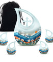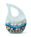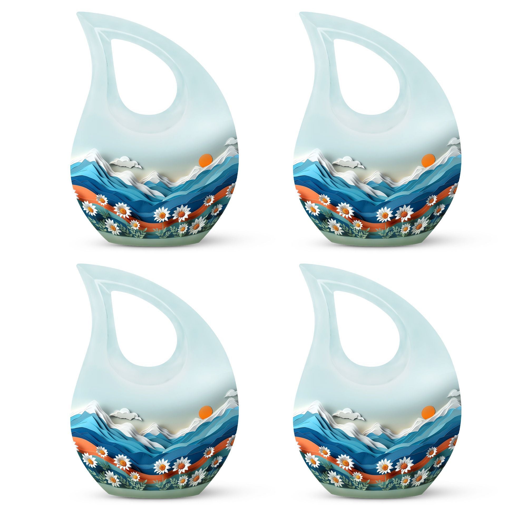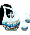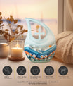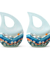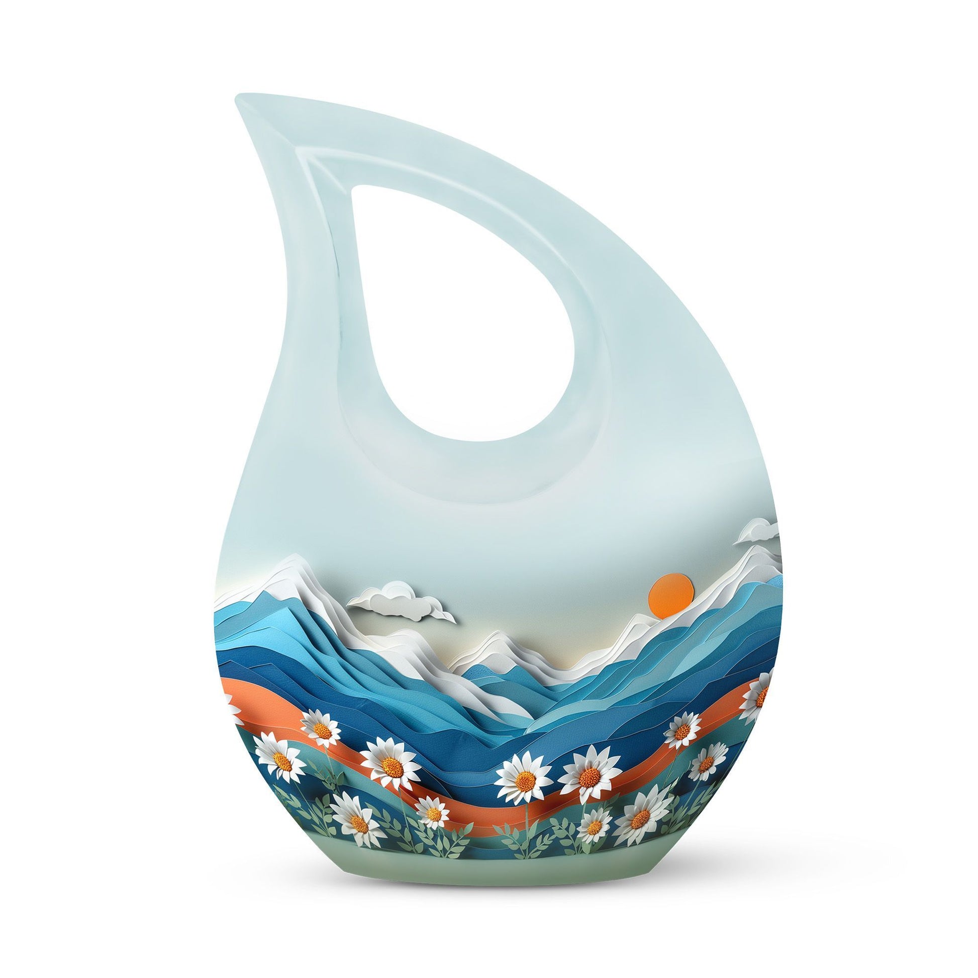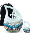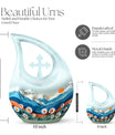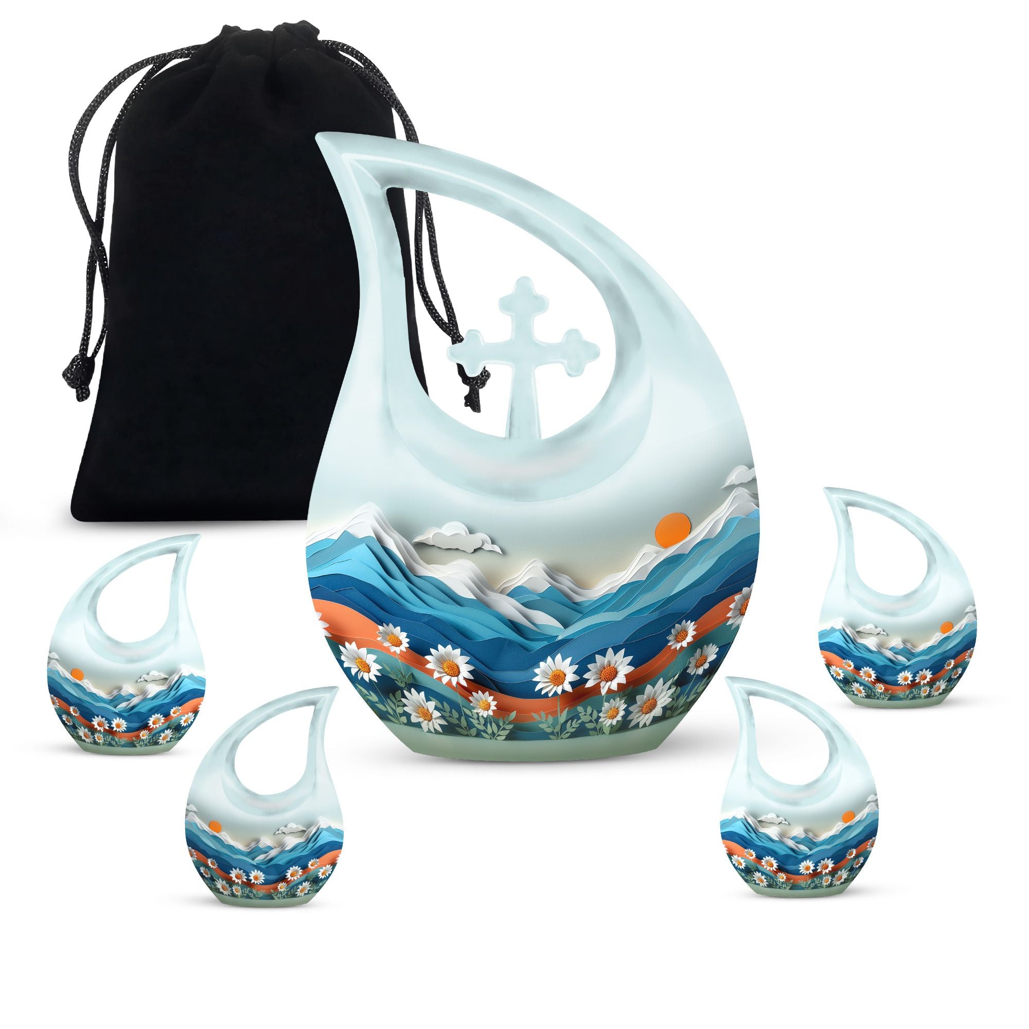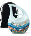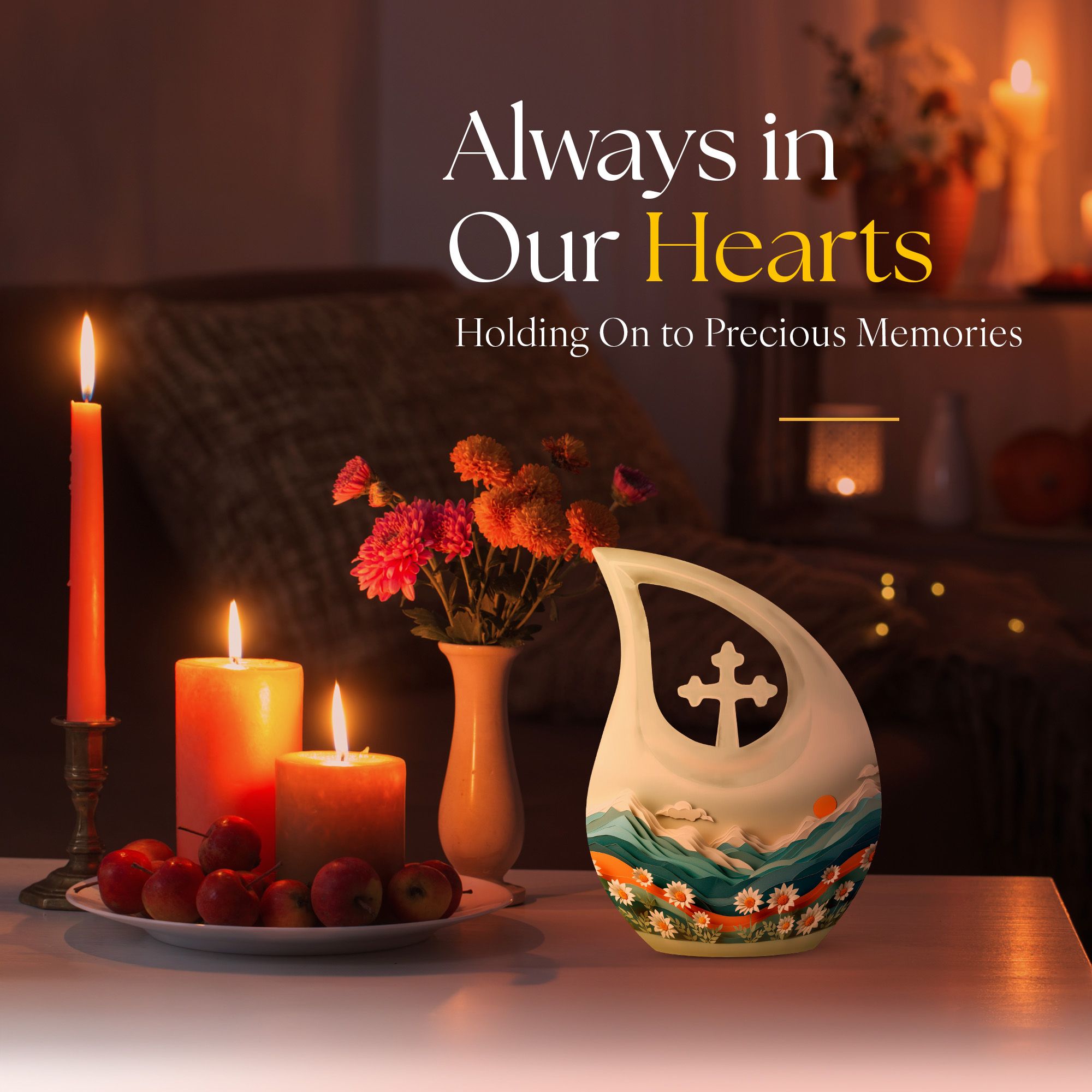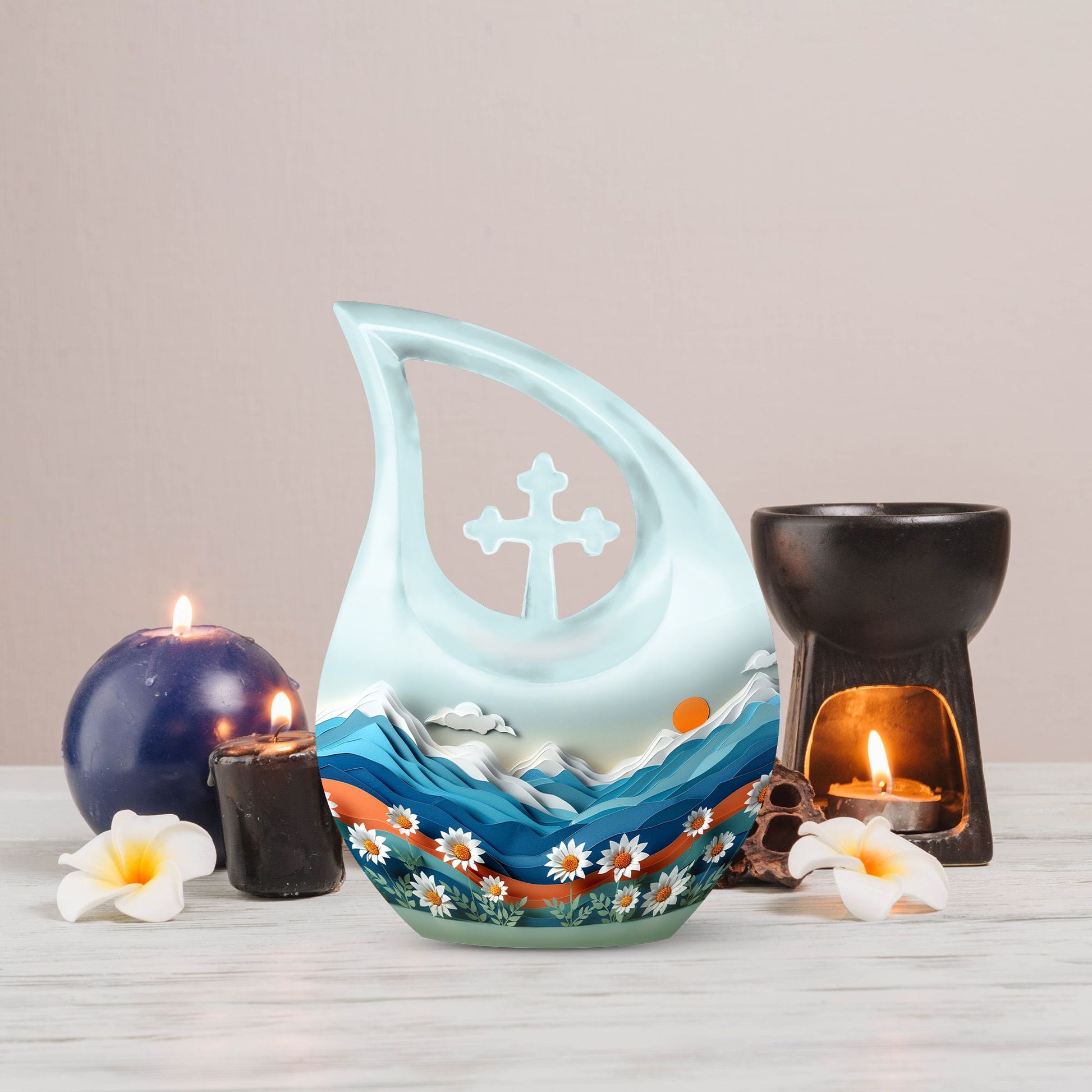 Embrace tranquility with our 'Sunset Over A Urn', a large, beautifully designed funeral urn that stands 10 inches tall and has the capacity to hold 200 cubic inches of ashes. Made from robust aluminium, this piece not only serves as a memorial urn but also a lovely keepsake that can withstand the elements when buried. The Cross-Drop design lends an ethereal touch to this precious memento. Practicality meets aesthetics with the accompanying velvet pouch, which gracefully contains the ashes, preserving the sanctity of beloved memories. Further personalization is available, allowing for the engraving of names, transforming the urn into a truly unique commemorative piece. This durably weighted urn (3.3 pounds) is suitable for adults and seniors who are seeking religious urns that marry solemnity with beauty. Discover our expansive range of companion urns for sale today, providing a lasting, sentimental touch to your memorial ceremonies.