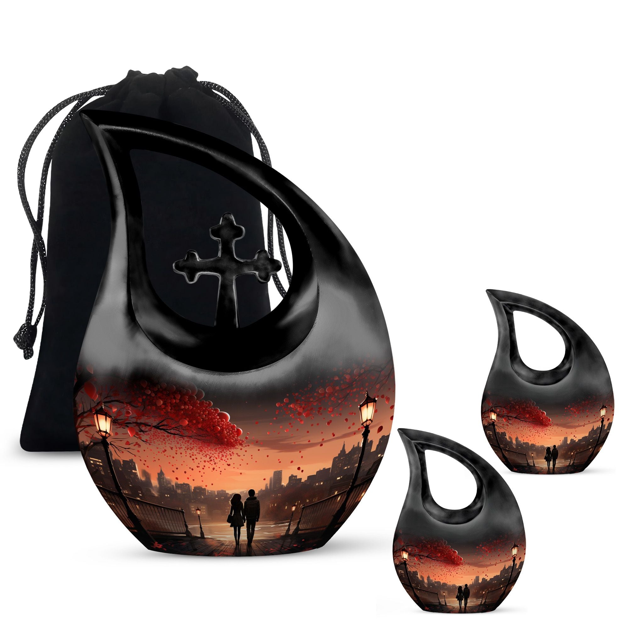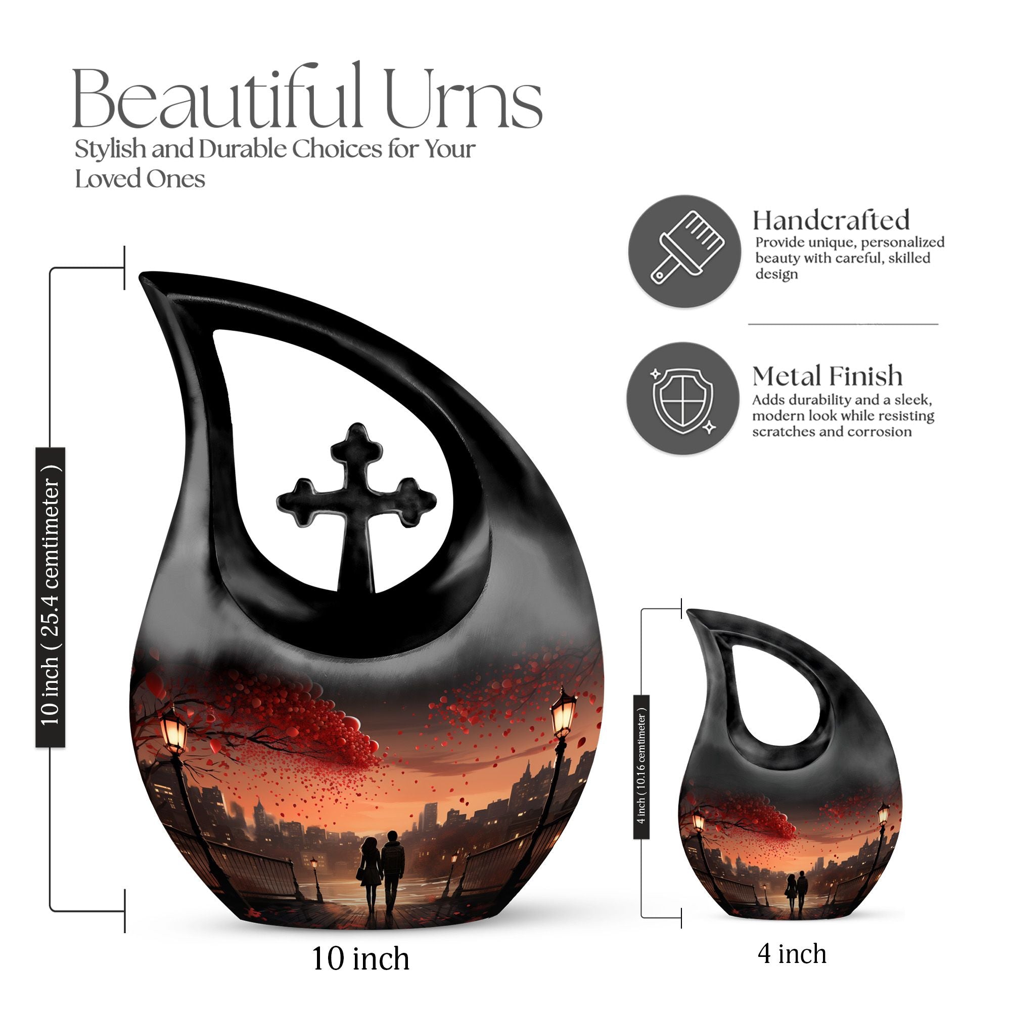 Crafted from premium aluminium, this urn features a warm horizon glow behind a couple walking hand-in-hand, symbolizing love’s enduring presence. Its smooth finish and elegant artistry make it suitable for urns cremation ashes female, cremation urn adult male, or large urns for human ashes adult male. The secure screw-top lid ensures safe preservation, while the durable structure provides lasting protection for your loved one’s ashes.