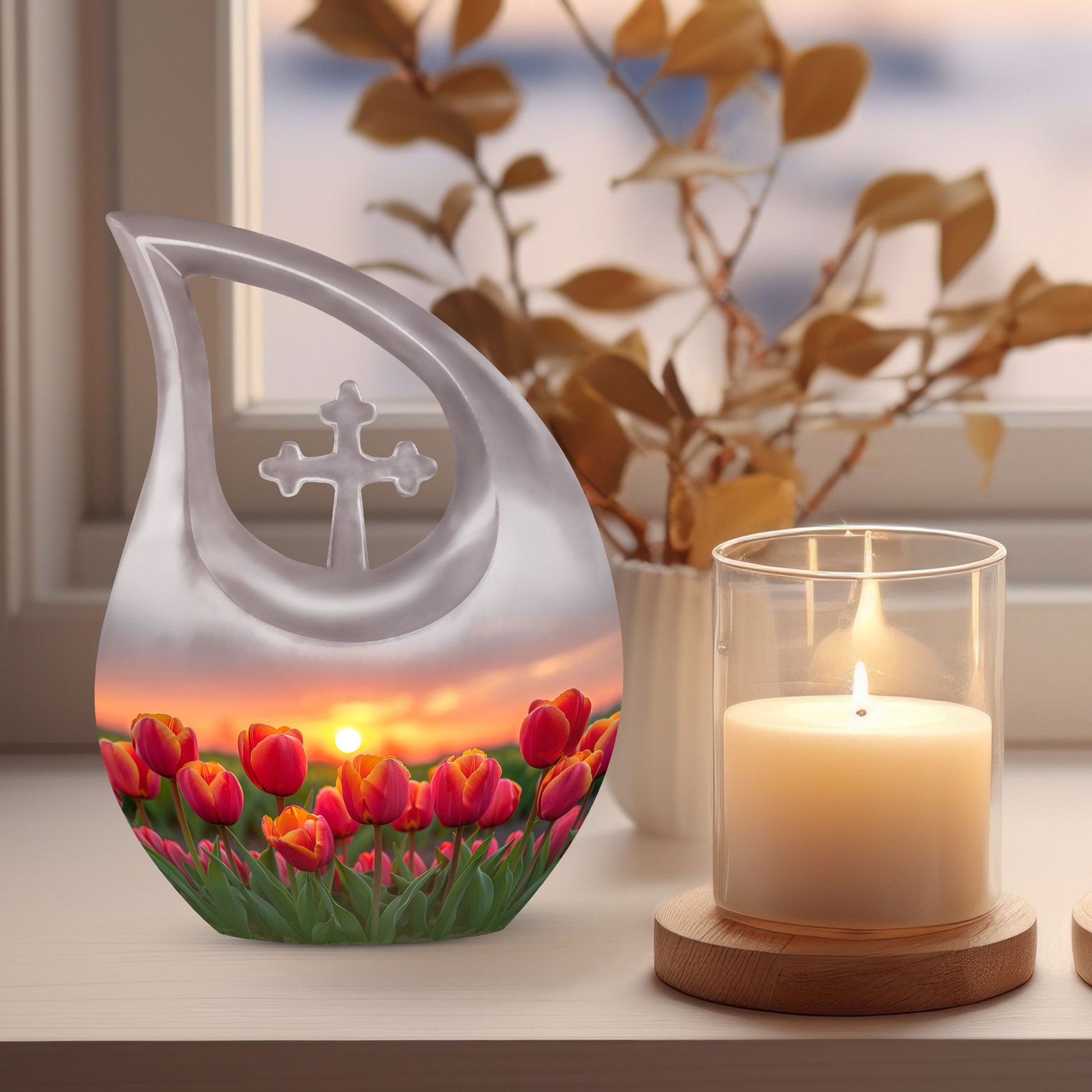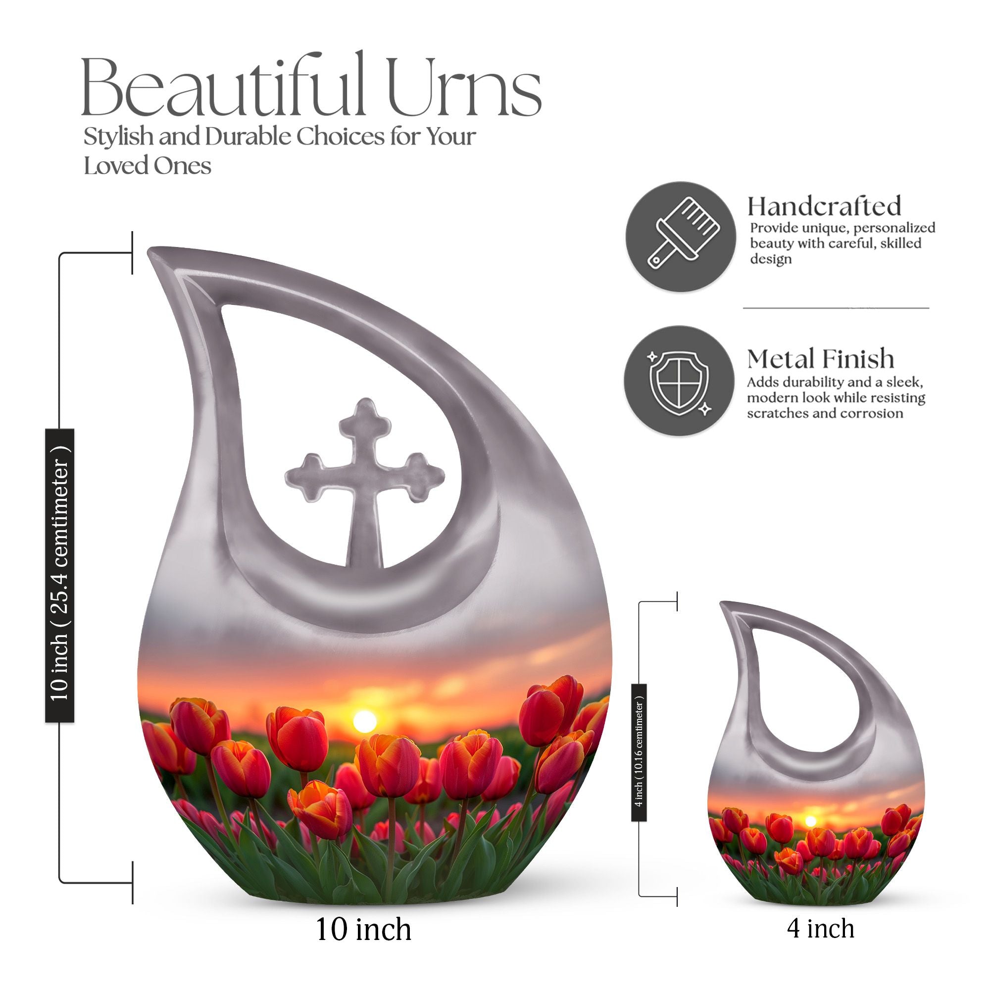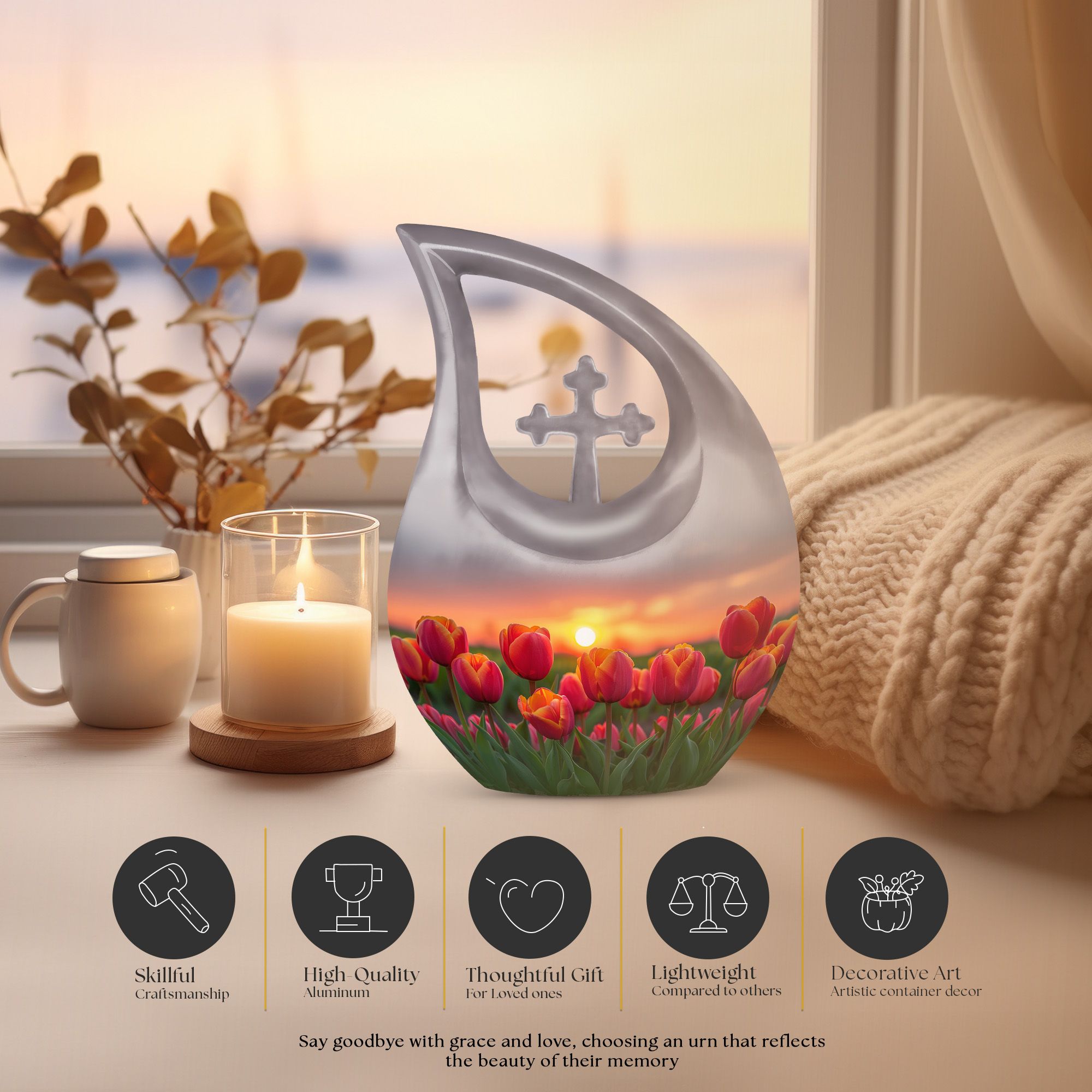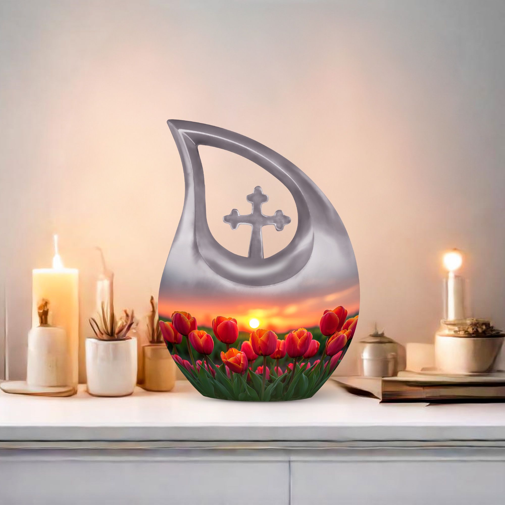 Cherish and honor the memory of your departed loved ones with our Sunset Serenade Urn. Crafted from premium quality aluminium, this extra-large cremation urn is a tribute to life and strength, able to hold 200 cubic inches of ashes. A notable feature is its Cross Drop theme, showing the setting sun's reflection on peaceful water - a gentle reminder of life's transient nature. This well-crafted urn weighs 3.3 pounds and reaches a height of 10 inches, giving it a robust and sturdy feel. With the included velvet pouch, your loved one's ashes are preserved securely with respect and dignity. For a unique touch, you can personalize this urn with engraving names. This beautiful piece serves not only as a resting place for your beloved but also as a keepsake to keep them close in heart and mind. Ideal for adults, seniors seeking beautiful yet affordable funeral urns for their loved ones. Popular searches include Sunset Serenade Urn, Blue Urns for Human Ashes, and Inexpensive Cremation Urns.