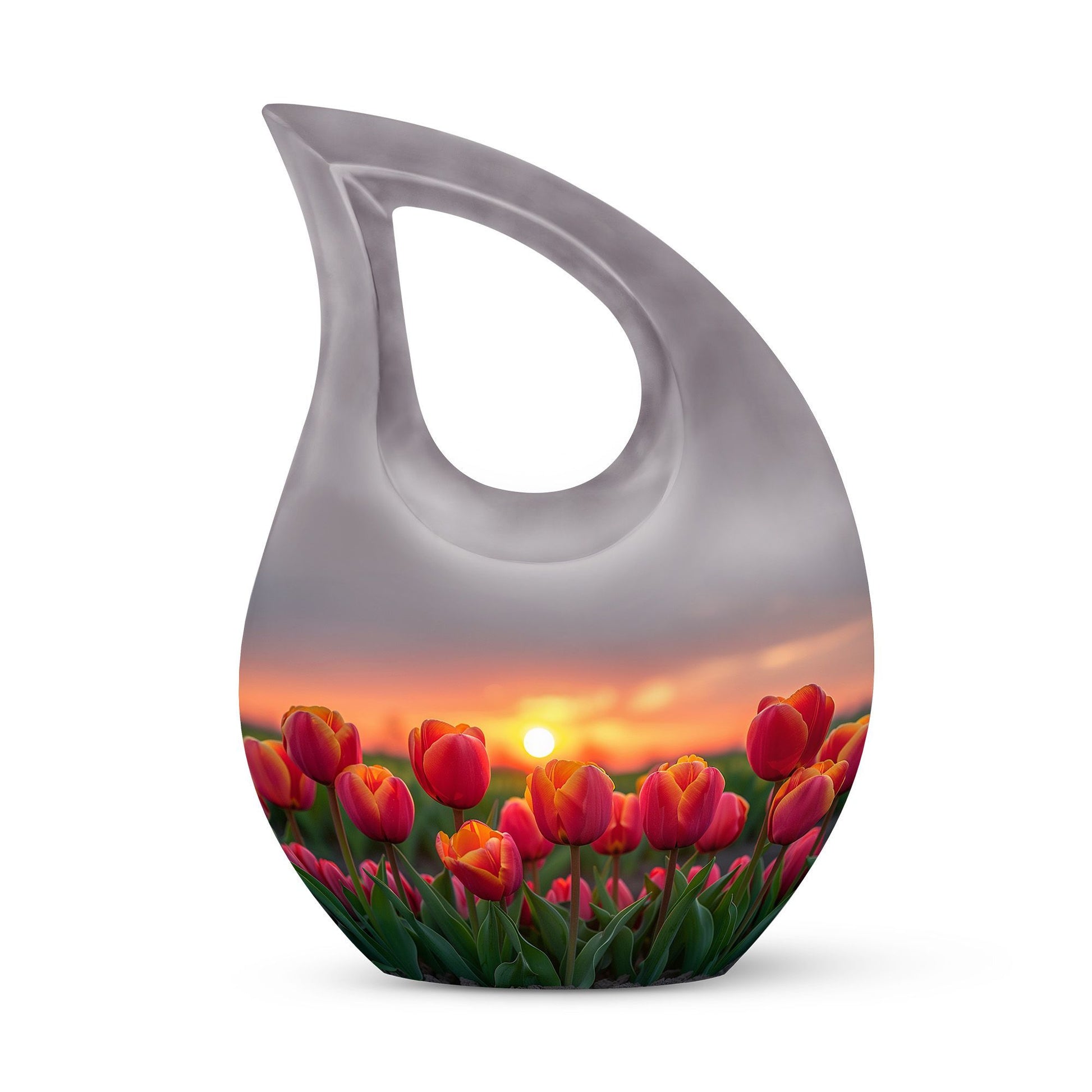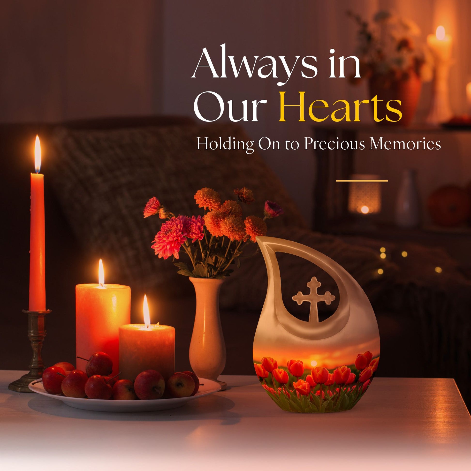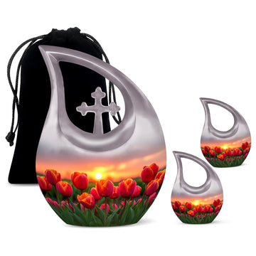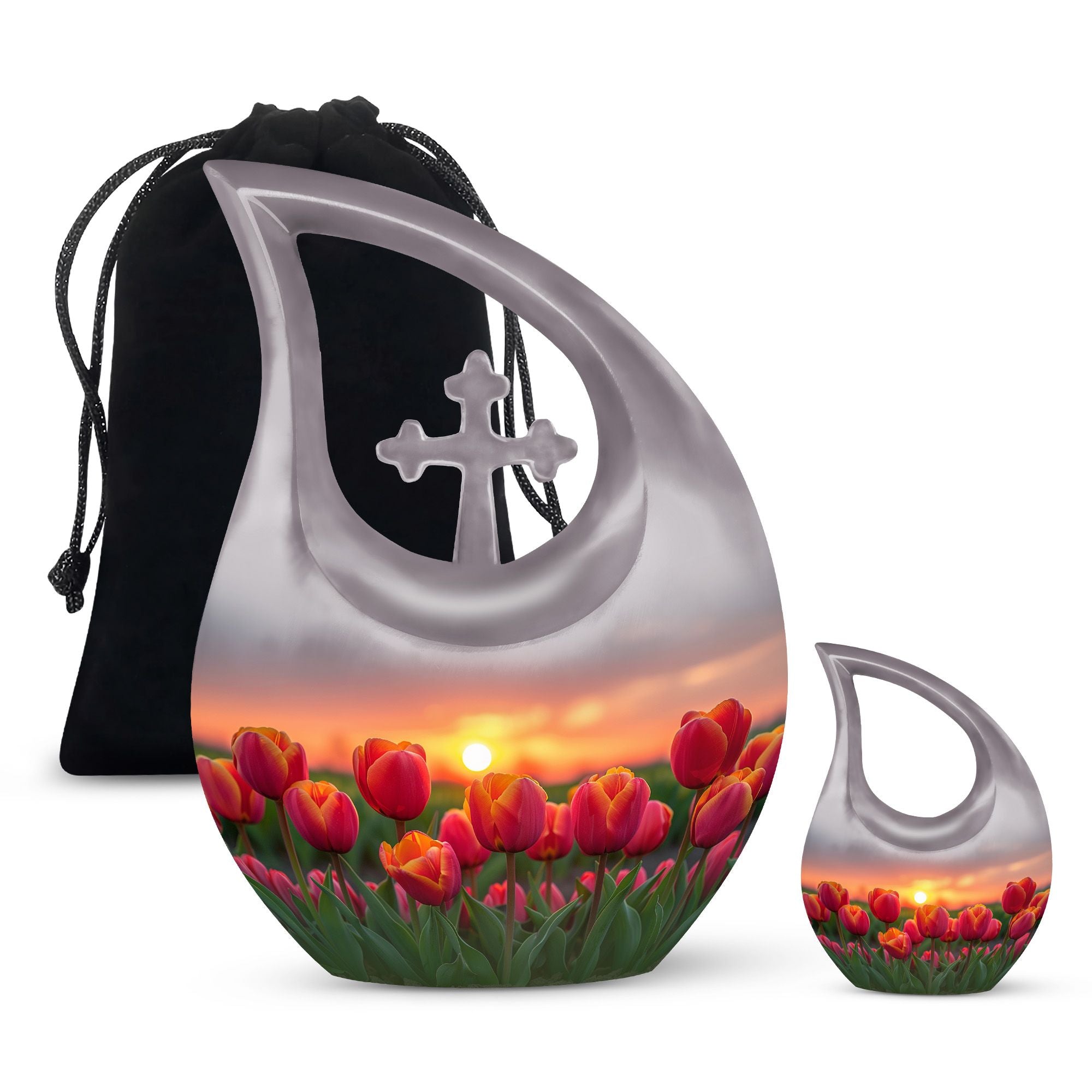 Cherish and honor the memory of your departed loved ones with our Sunset Serenade Urn. Crafted from premium quality aluminium, this extra-large cremation urn is a tribute to life and strength, able to hold 200 cubic inches of ashes. A notable feature is its Cross Drop theme, showing the setting sun's reflection on peaceful water - a gentle reminder of life's transient nature. This well-crafted urn weighs 3.3 pounds and reaches a height of 10 inches, giving it a robust and sturdy feel. With the included velvet pouch, your loved one's ashes are preserved securely with respect and dignity. For a unique touch, you can personalize this urn with engraving names. This beautiful piece serves not only as a resting place for your beloved but also as a keepsake to keep them close in heart and mind. Ideal for adults, seniors seeking beautiful yet affordable funeral urns for their loved ones. Popular searches include Sunset Serenade Urn, Blue Urns for Human Ashes, and Inexpensive Cremation Urns.