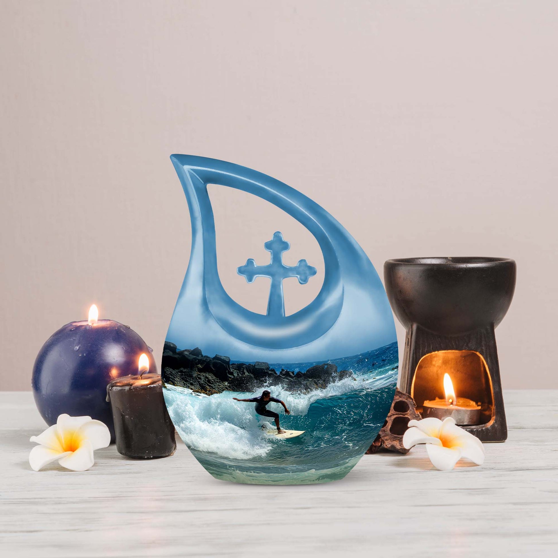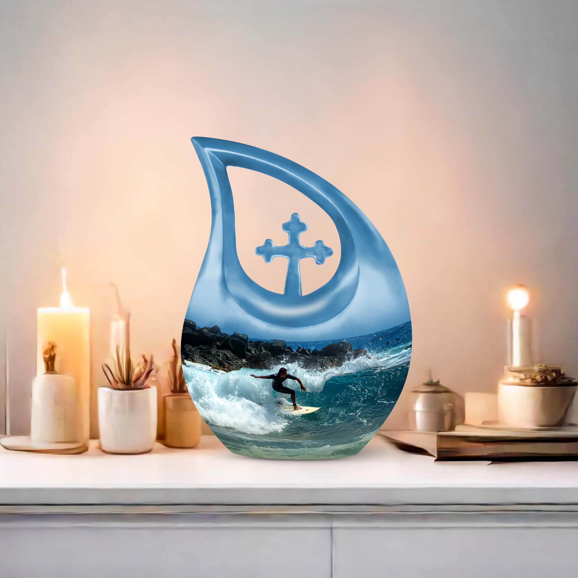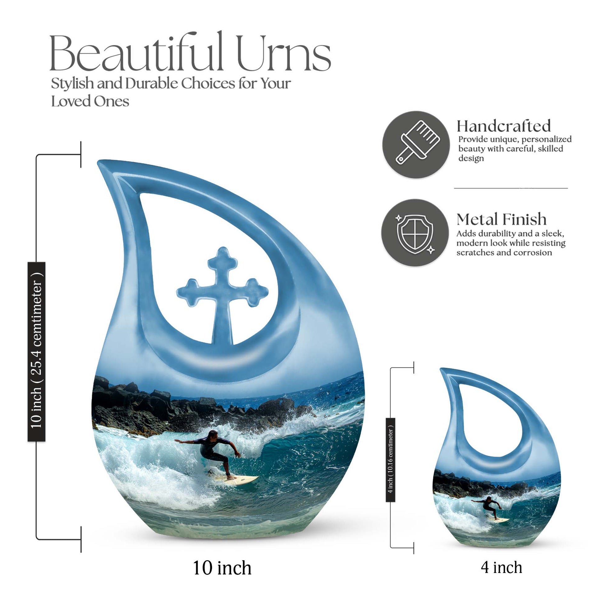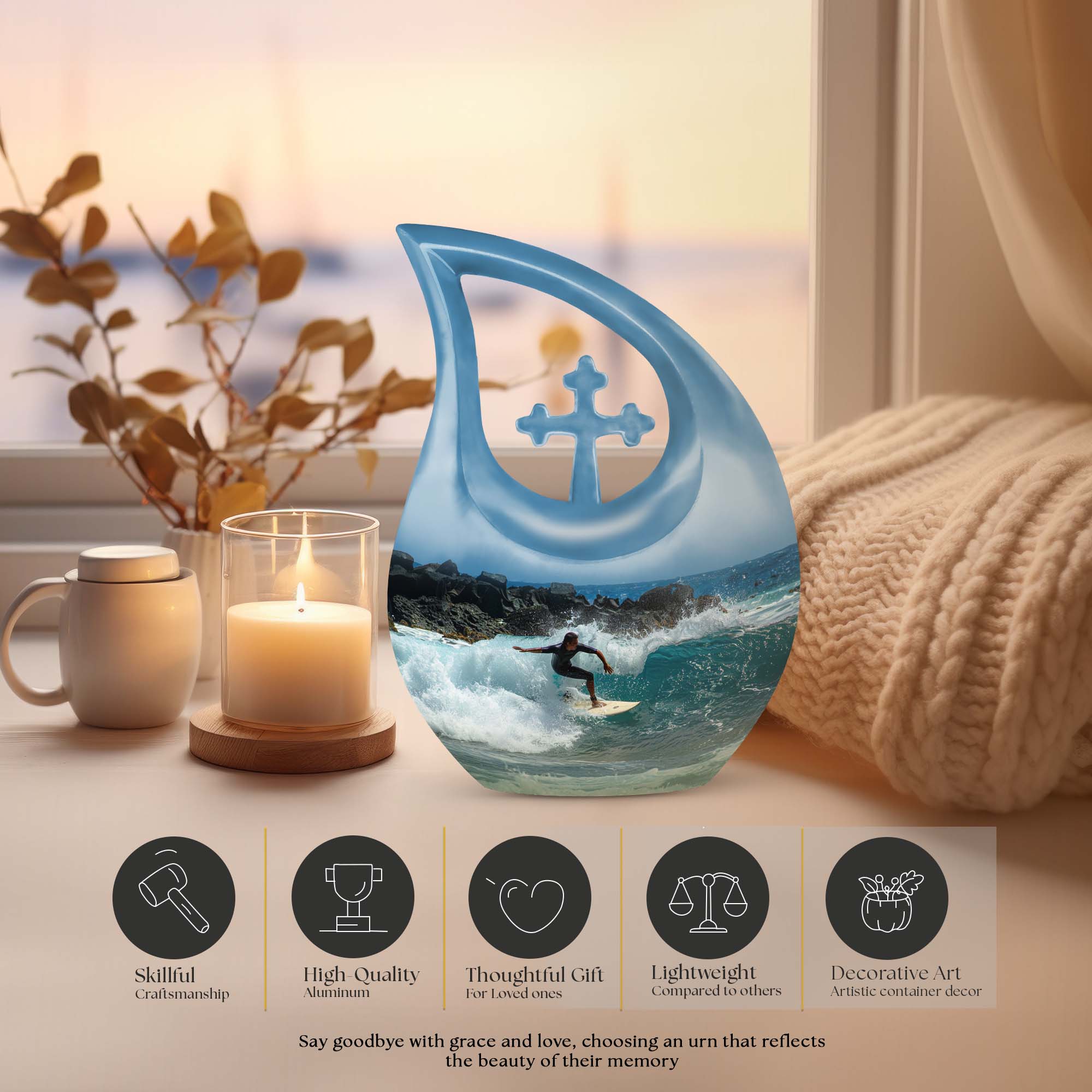 Discover a unique and tranquil way to honor your departed loved one with our 'Surfing The Rocky Urn'. This funeral urn is designed with an engaging 'Cross Drop' theme that pitches a comfortable link between spirituality and remembrance. Engineered to be 10 inches in height, the urn boasts a substantial capacity of 200 cubic inches, effectively accommodating the ashes of adults and seniors. The urn is skilfully crafted out of sturdy aluminium material, promising lasting durability even if you choose to bury it. It weighs a manageable 3.3 pounds, completing its perfect largeness with a sense of firm steadiness. What’s more, the urn comes with a plush velvet pouch, crafted for secure containment of ashes. To make it profoundly sentimental, it offers room for customization; you can personalize it by engraving names, tender annotations that emulate your endearing memories and feelings. Broaden your search by exploring more from a vast collection that includes religious urns, keepsake cremation urns, and companion urns. Give a peaceful rest to those irreplaceable remains with our 'Surfing The Rocky Urn', the epitome of profound memorial urns designed to field a naval of unforgettable parting journey.