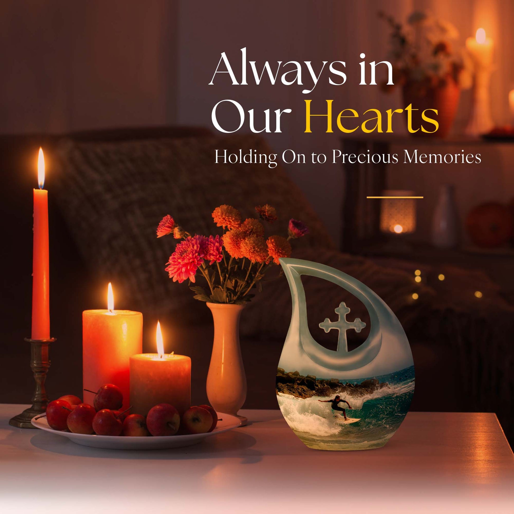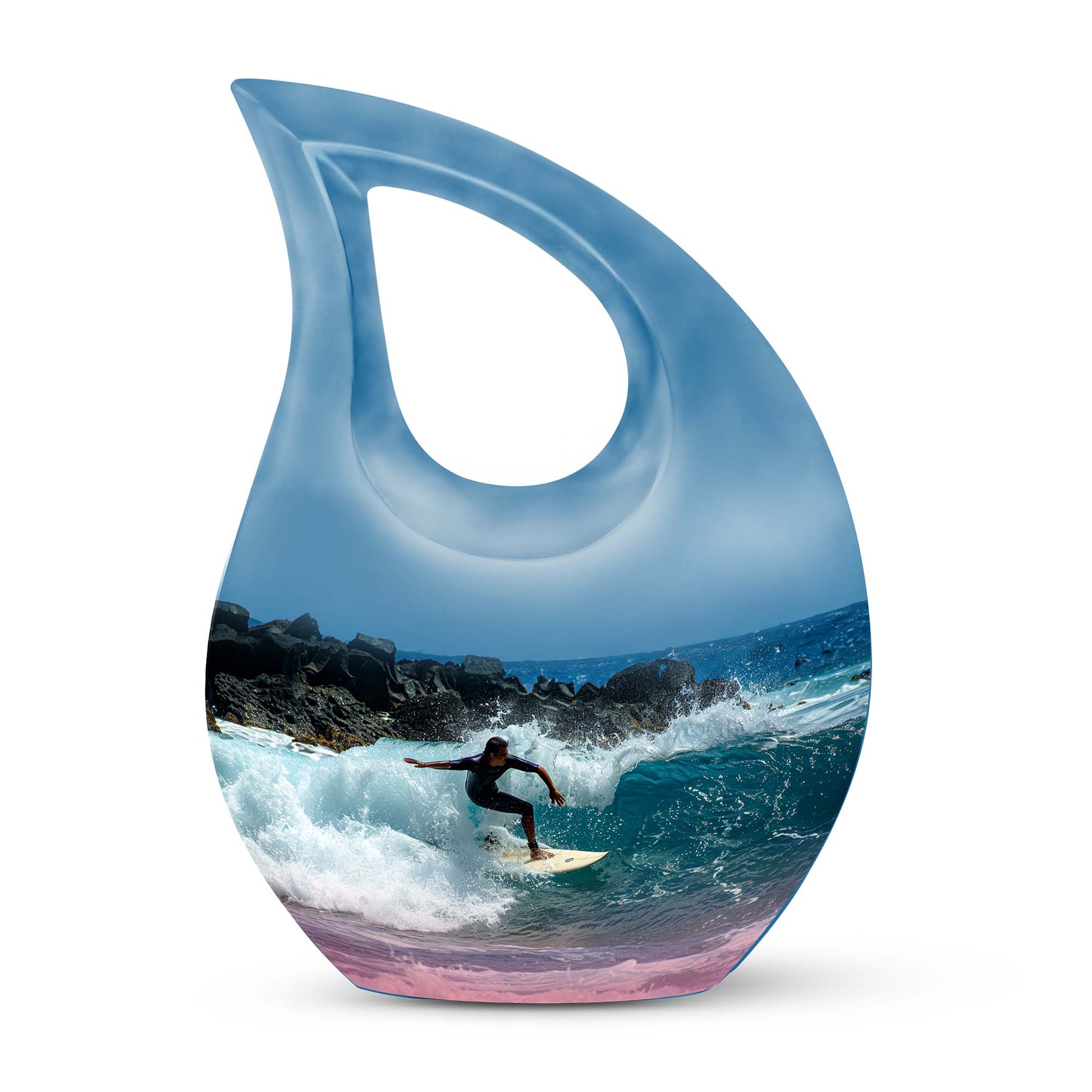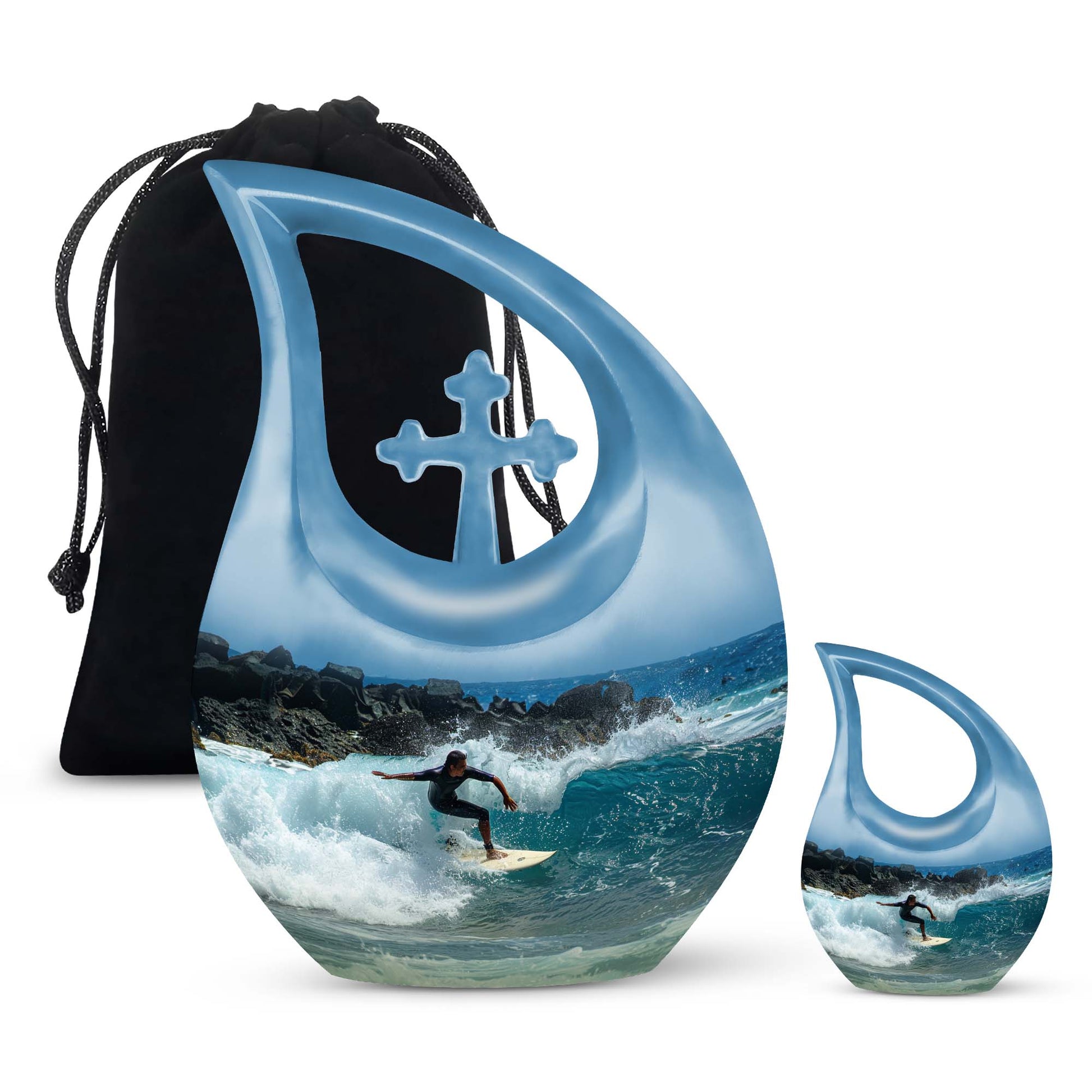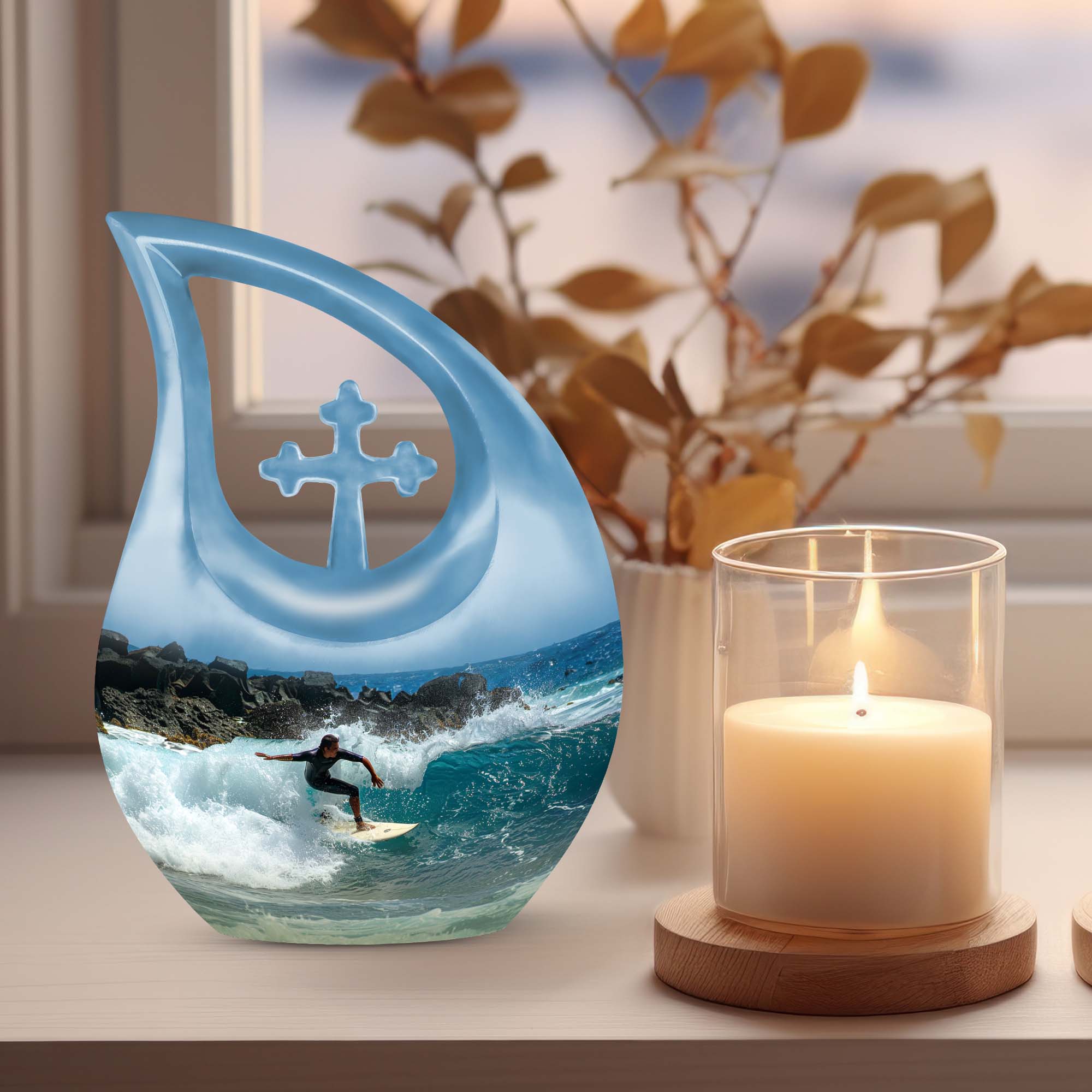 Discover a unique and tranquil way to honor your departed loved one with our 'Surfing The Rocky Urn'. This funeral urn is designed with an engaging 'Cross Drop' theme that pitches a comfortable link between spirituality and remembrance. Engineered to be 10 inches in height, the urn boasts a substantial capacity of 200 cubic inches, effectively accommodating the ashes of adults and seniors. The urn is skilfully crafted out of sturdy aluminium material, promising lasting durability even if you choose to bury it. It weighs a manageable 3.3 pounds, completing its perfect largeness with a sense of firm steadiness. What’s more, the urn comes with a plush velvet pouch, crafted for secure containment of ashes. To make it profoundly sentimental, it offers room for customization; you can personalize it by engraving names, tender annotations that emulate your endearing memories and feelings. Broaden your search by exploring more from a vast collection that includes religious urns, keepsake cremation urns, and companion urns. Give a peaceful rest to those irreplaceable remains with our 'Surfing The Rocky Urn', the epitome of profound memorial urns designed to field a naval of unforgettable parting journey.