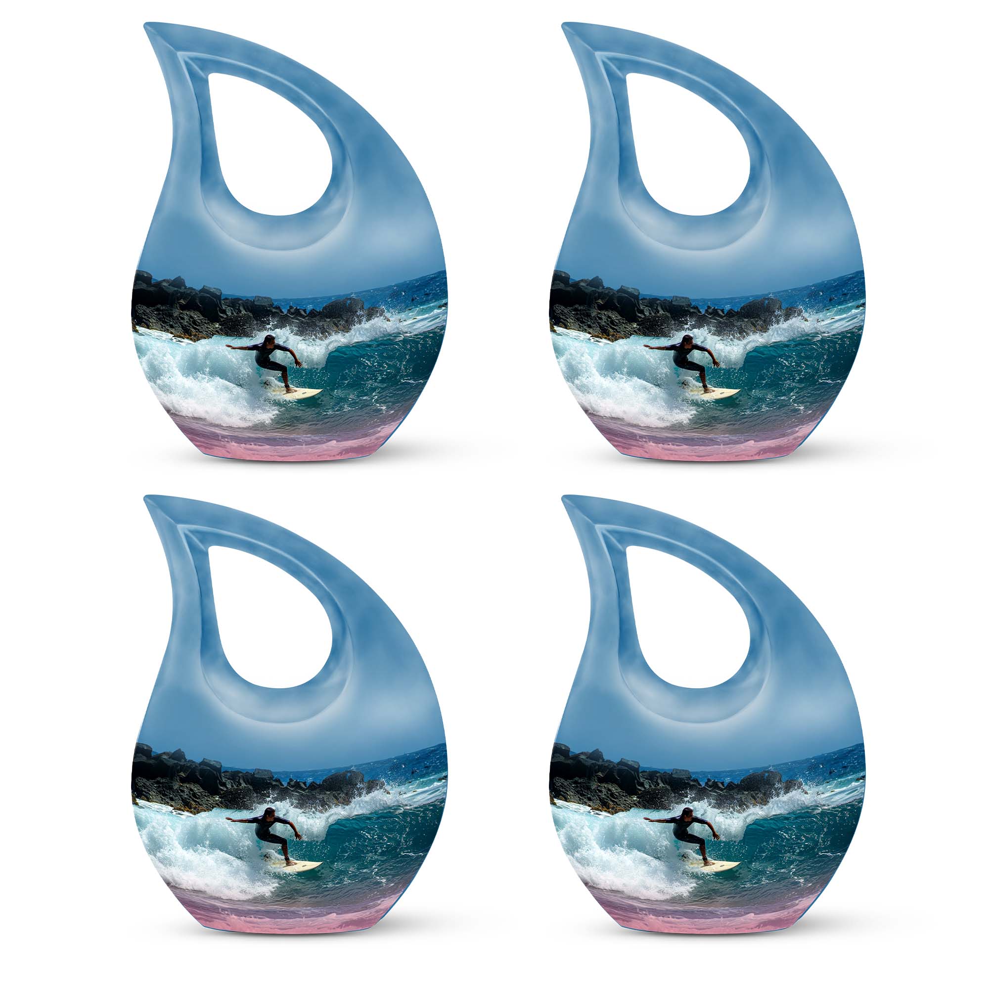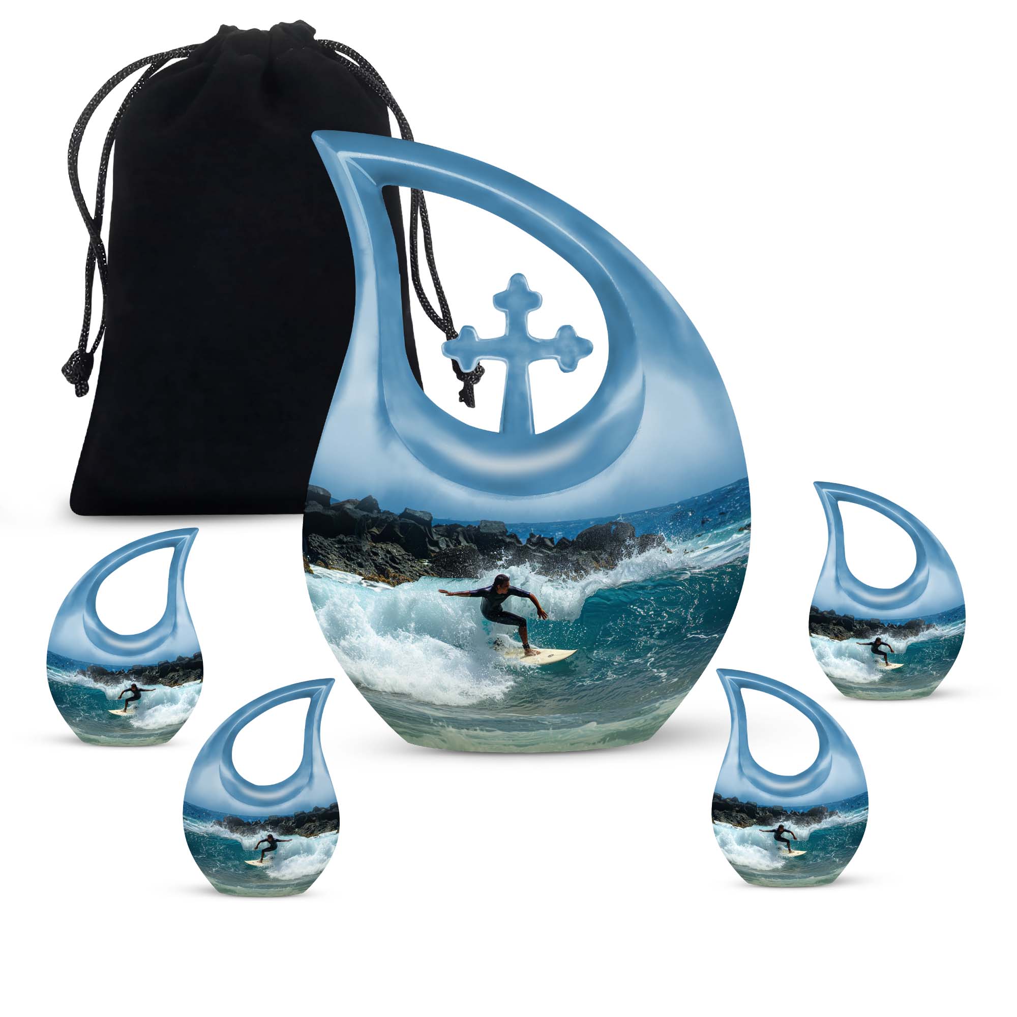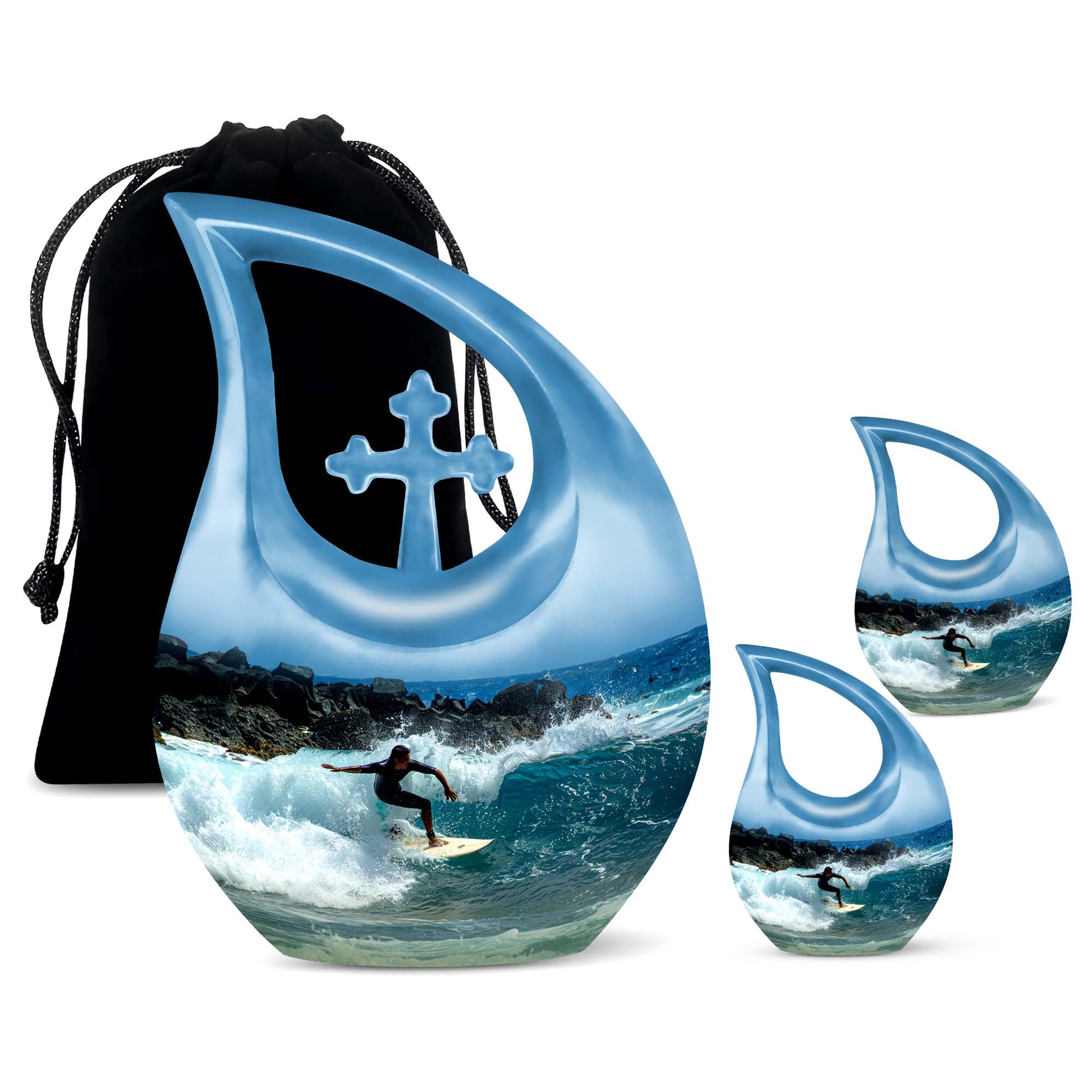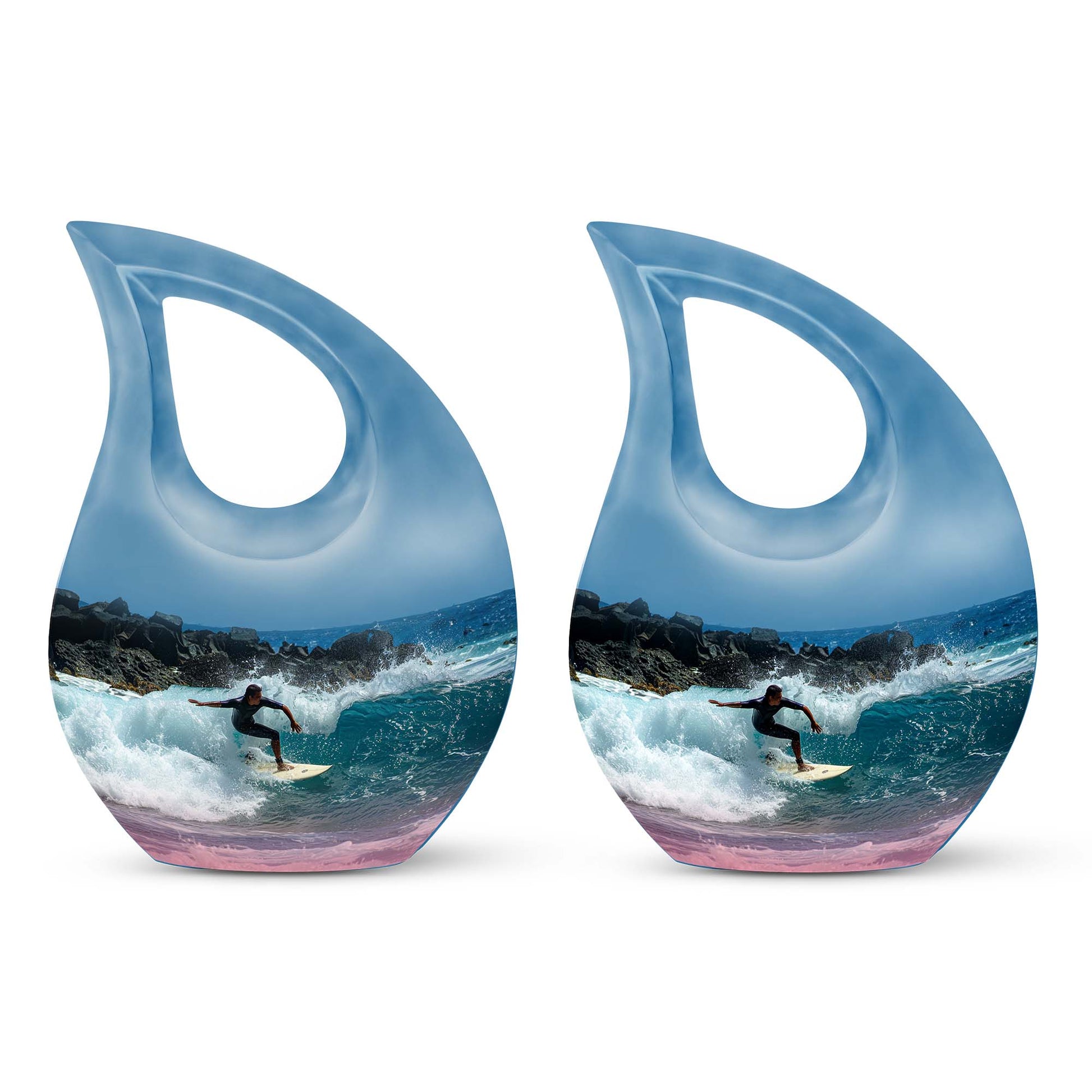 Discover a unique and tranquil way to honor your departed loved one with our 'Surfing The Rocky Urn'. This funeral urn is designed with an engaging 'Cross Drop' theme that pitches a comfortable link between spirituality and remembrance. Engineered to be 10 inches in height, the urn boasts a substantial capacity of 200 cubic inches, effectively accommodating the ashes of adults and seniors. The urn is skilfully crafted out of sturdy aluminium material, promising lasting durability even if you choose to bury it. It weighs a manageable 3.3 pounds, completing its perfect largeness with a sense of firm steadiness. What’s more, the urn comes with a plush velvet pouch, crafted for secure containment of ashes. To make it profoundly sentimental, it offers room for customization; you can personalize it by engraving names, tender annotations that emulate your endearing memories and feelings. Broaden your search by exploring more from a vast collection that includes religious urns, keepsake cremation urns, and companion urns. Give a peaceful rest to those irreplaceable remains with our 'Surfing The Rocky Urn', the epitome of profound memorial urns designed to field a naval of unforgettable parting journey.