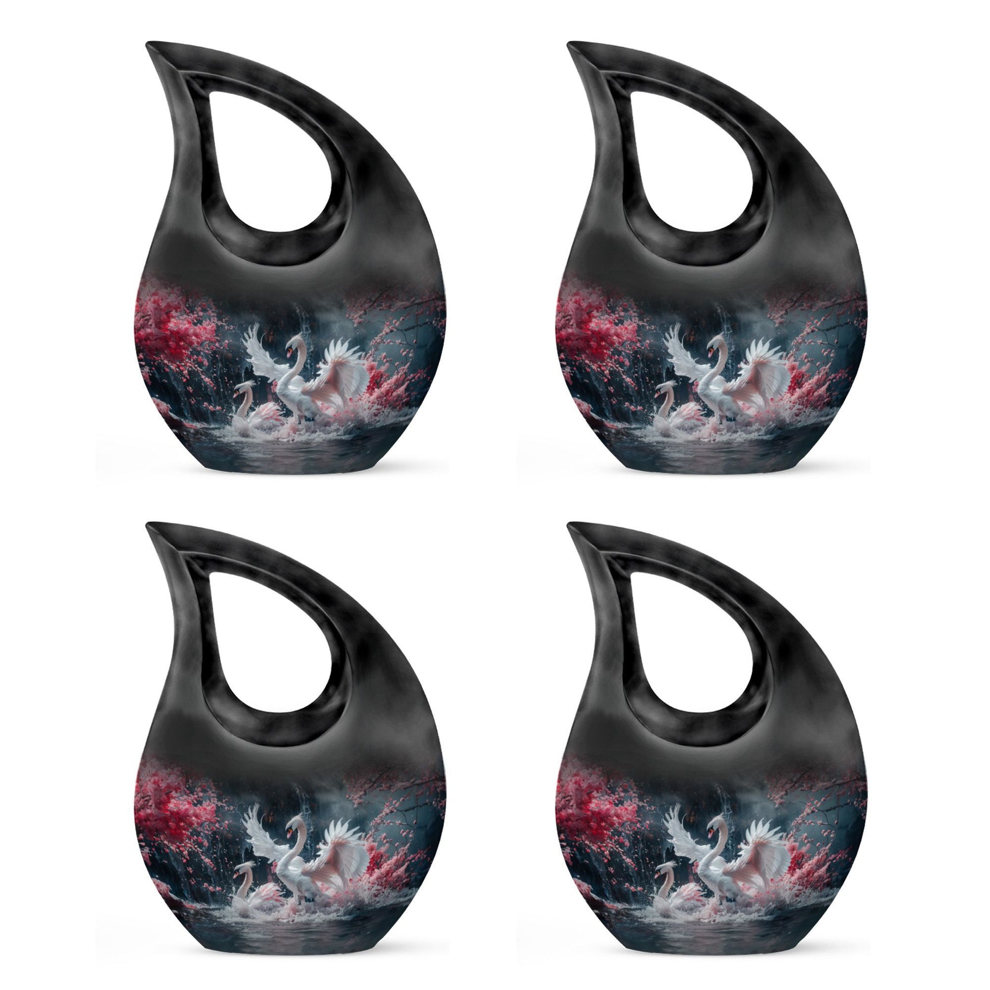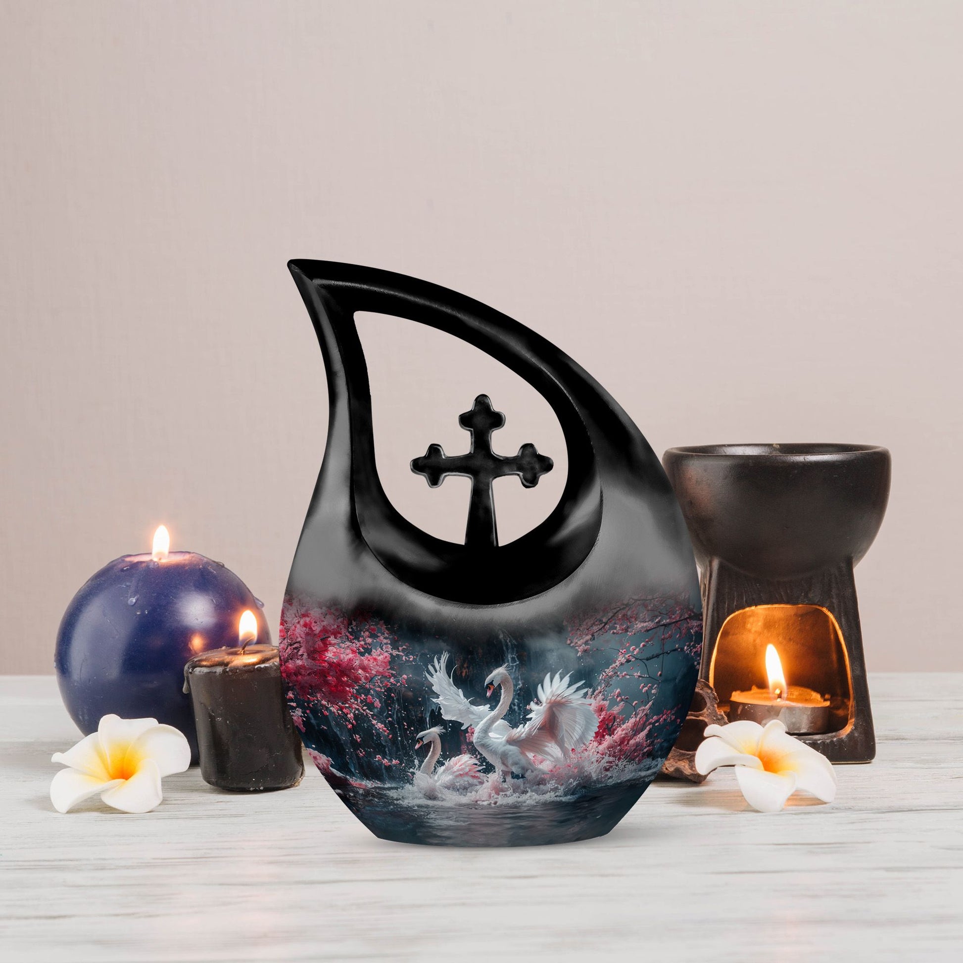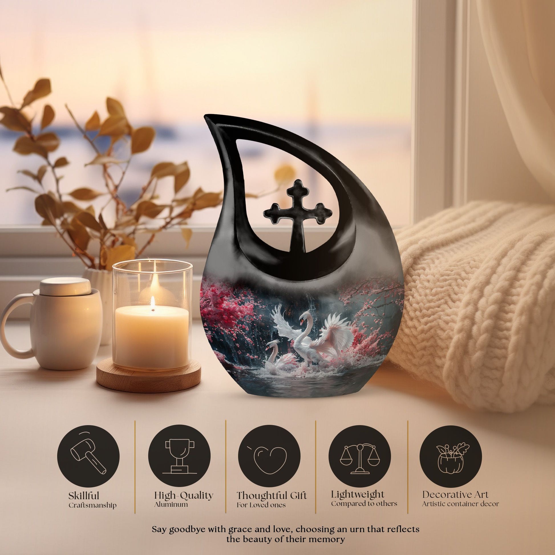 Immerse in the divine charm of our Enchanted Swan Dance Urn, a solemn expression of remembrance crafted exclusively for adults and seniors. This large urn features a symbolic 'Cross Drop' pattern, a serene and subtle theme that speaks volumes about life and legacy. Essential for memorial ceremonies, this urn is not just a vessel, but a testament of love, tenderness, and eternal peace. Crafted from durable aluminium, it stands at 10 inches, and can seamlessly contain up to 200 cubic inches of ashes. Each urn is accompanied with a silky velvet pouch, providing a gentle enclosure to the precious remnants of your loved ones. Despite its brawny weight of 3.3 pounds, this urn exudes an elegant lightness, making it an ideal keepsake. Personalize it further by engraving names, etching an immersive tale of togetherness. Whether you're searching for 'Urns For Ashes For Adults', 'Precious Moments Urns', or 'Small Cremation Urns', our Enchanted Swan Dance Urn stands as an exquisite testament to timeless beauty and elegance.