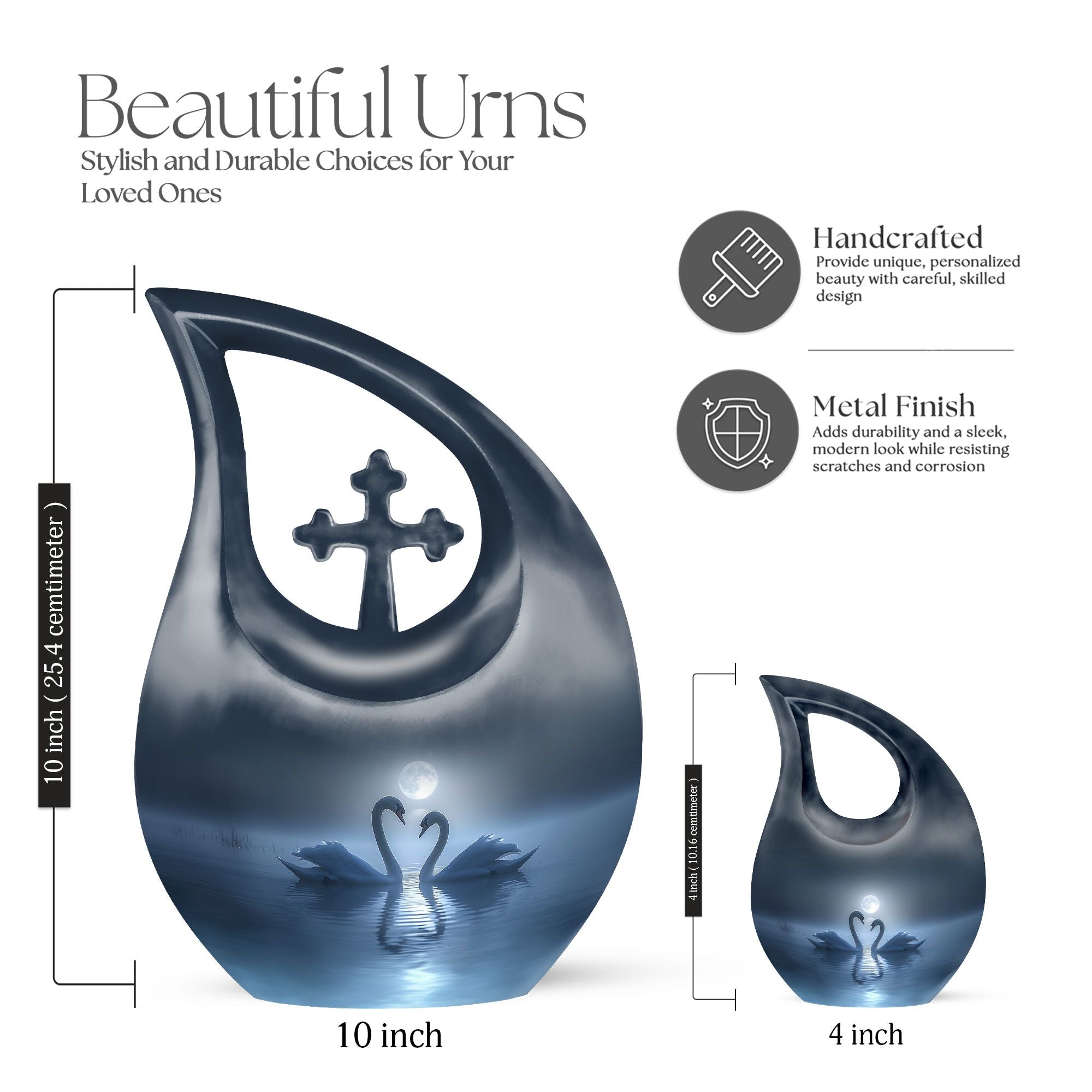 Crafted from durable aluminium, this 10-inch cremation urn for human ashes features a refined swan motif with soft, flowing details. The secure screw-top lid ensures ashes are safely protected, while the full adult capacity makes it suitable for any loved one. Families who wish to share ashes among relatives can pair this piece with mini urns for human ashes, mini urns for sharing ashes, or mini urns for decor. Whether selected for mom or dad, coordinating selections such as mini urns for human ashes mom, mini urns for human ashes dad, or miniature urns for human ashes offer beautiful matching options.