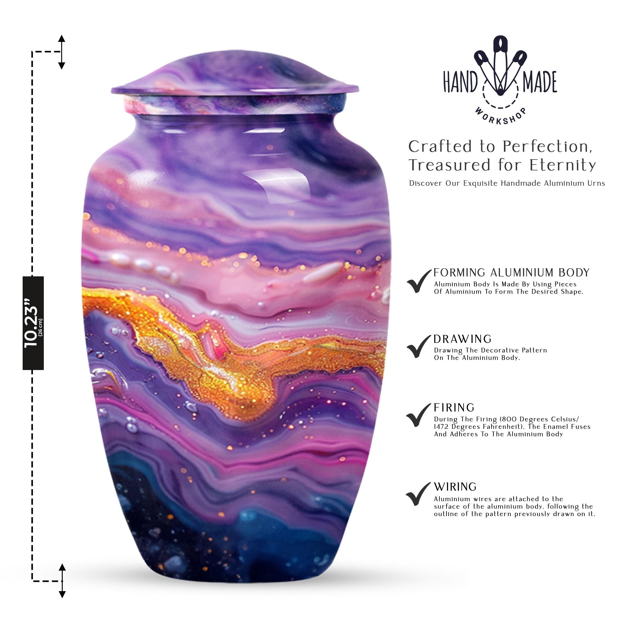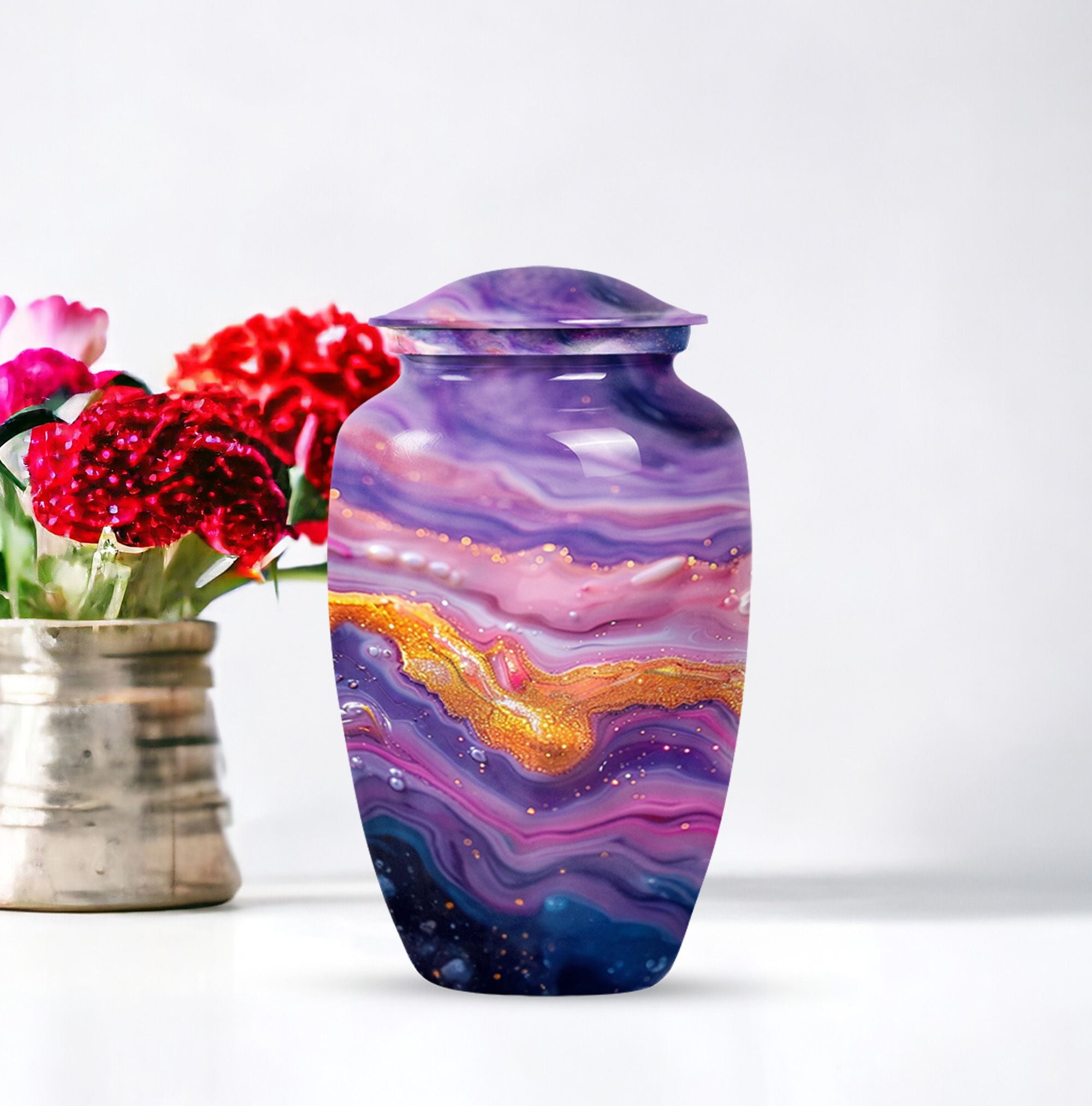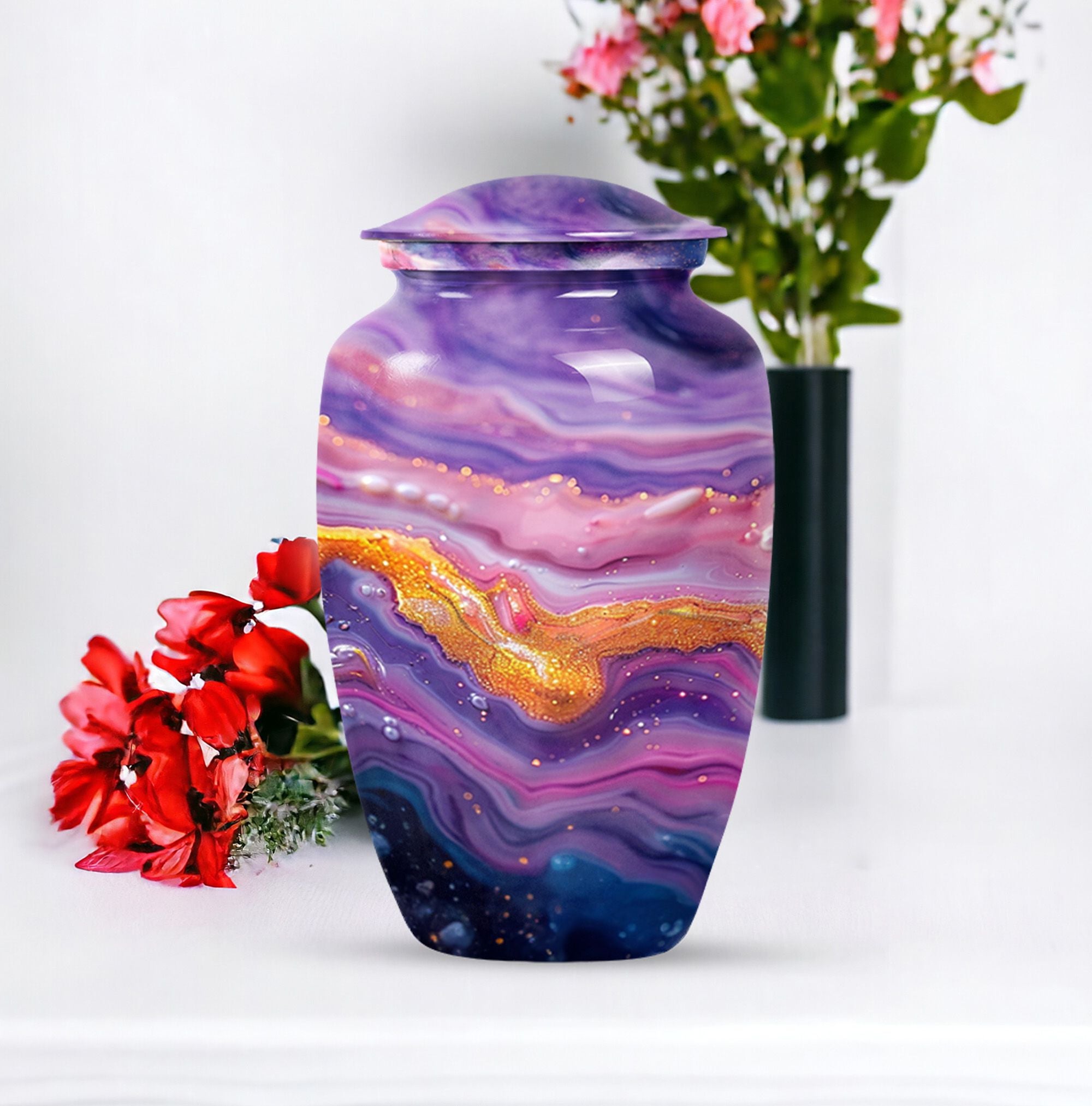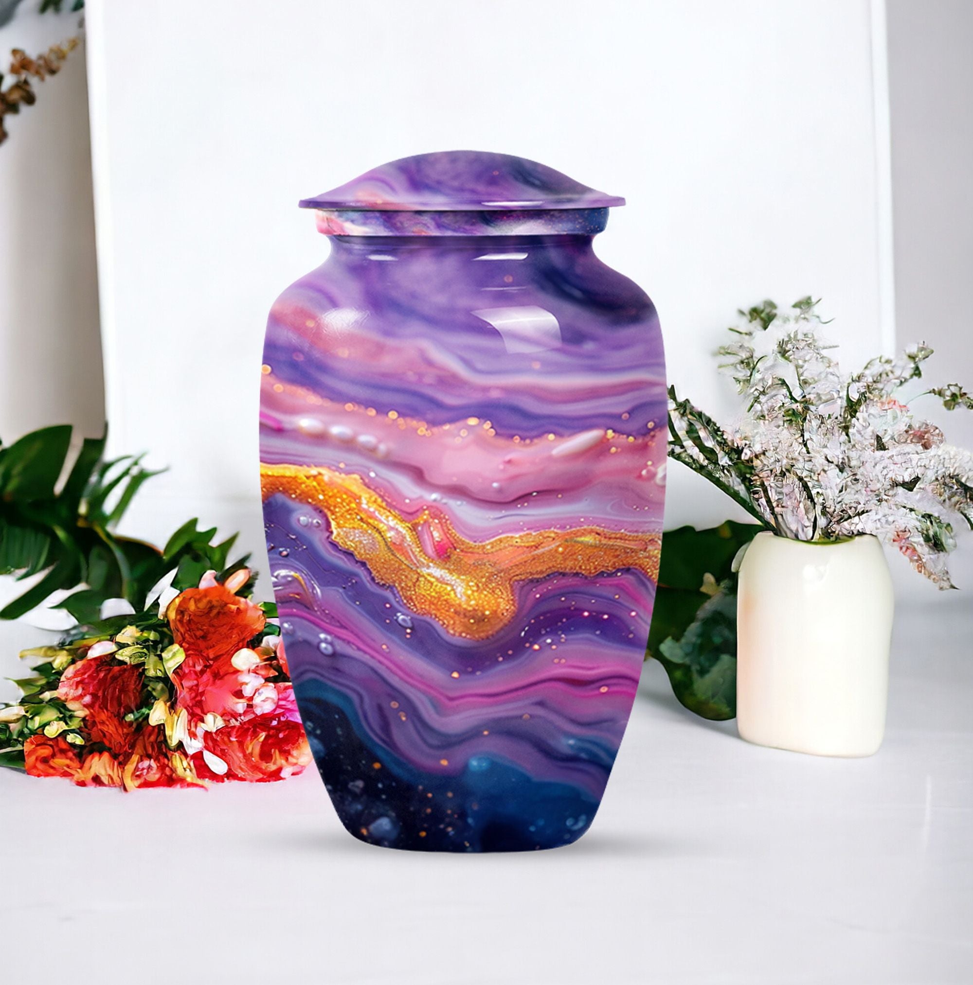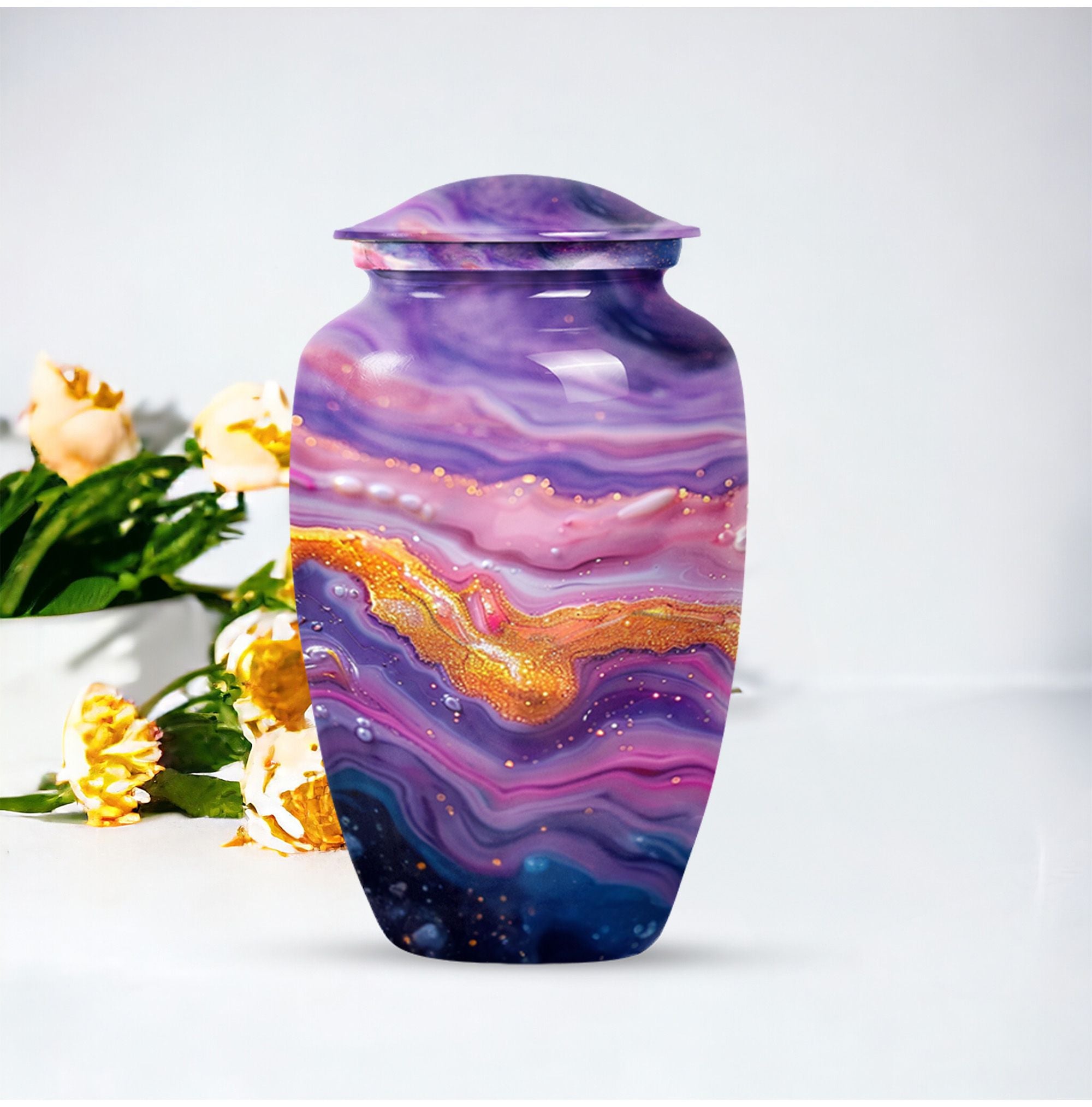 Experience the elegance and artistry of the Vibrant Swirl Urn, meticulously designed to preserve your cherished memories. Each urn is made from superior aluminum material, ensuring long-lasting durability. This large urn has the capacity to hold 200 cubic inches of ash, fitting the needs of most adults. Boasting a comforting weight of 3.3 pounds, it stands 10 inches tall, providing a significant presence that commands respect and reverence. Its intricate abstract theme adds a unique flair to the classic urn design. Alongside the urn, we provide a velvet pouch for tasteful containment and protection of the ashes. Plus, a special customization feature lets you personalize the piece adding engraved names of the departed, creating a truly unique memorial. Opt for our Vibrant Swirl Urn for a touching tribute to your loved ones. Note: this product doesn't include any design attribute as part of the specifications.