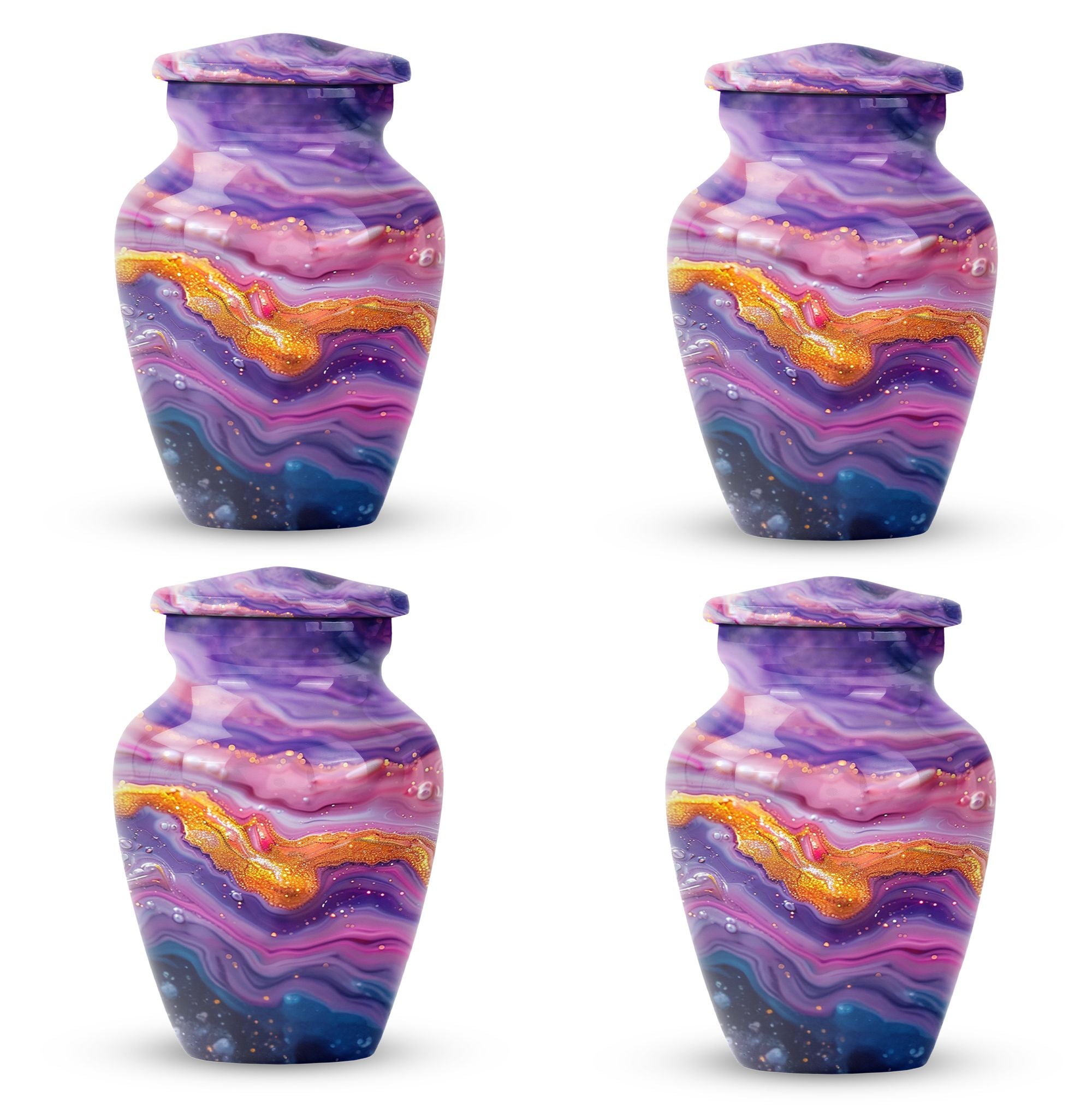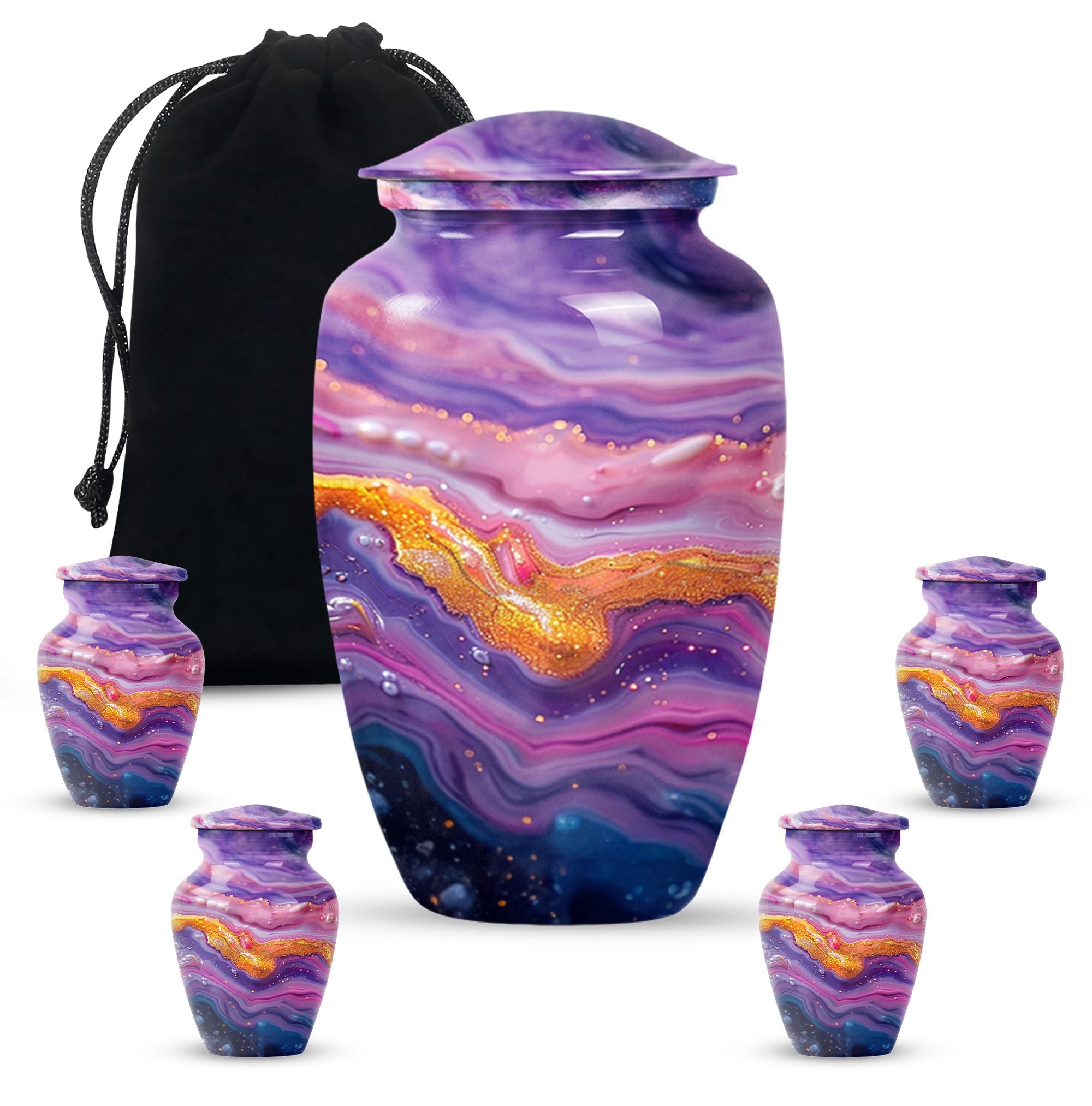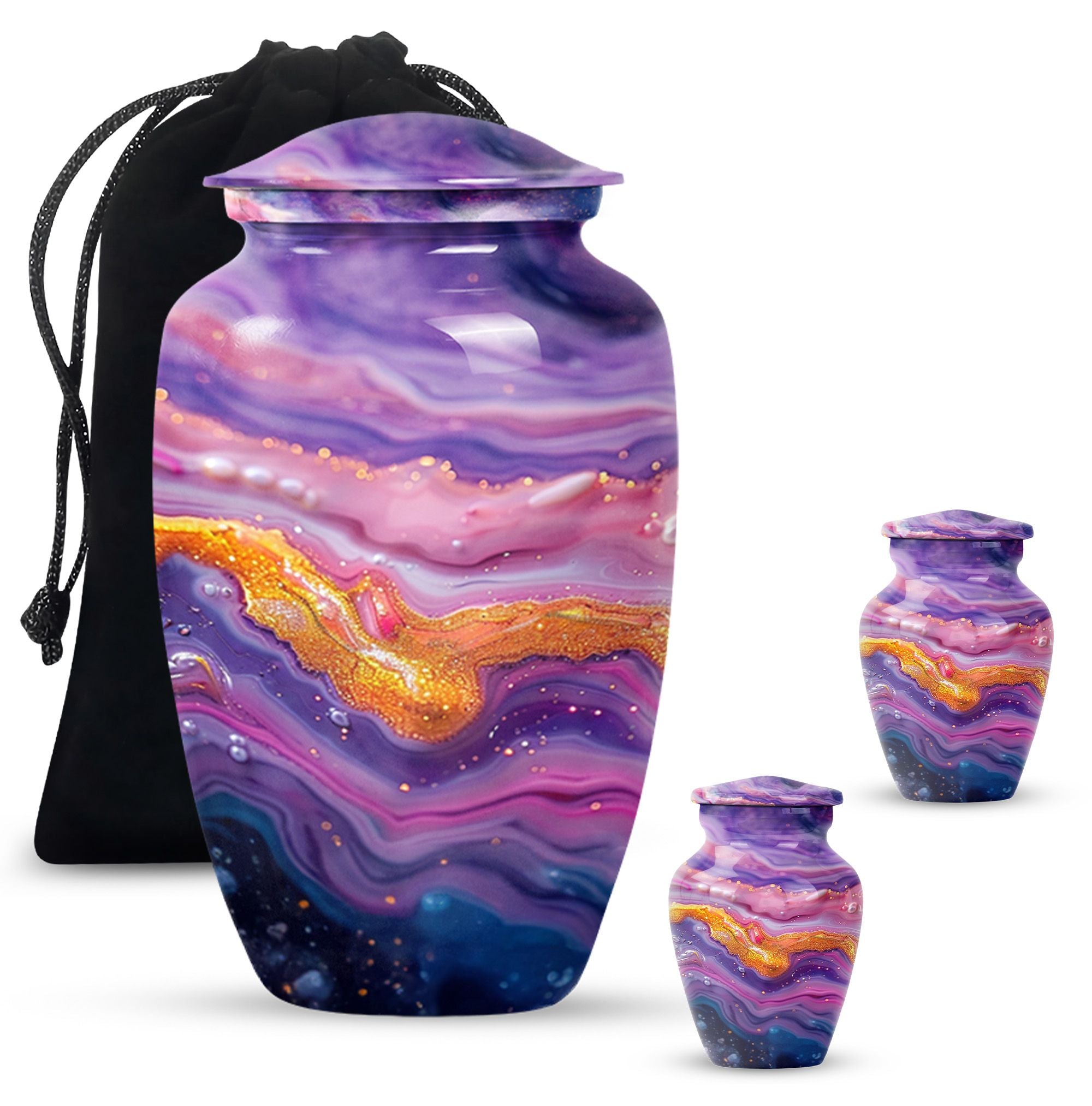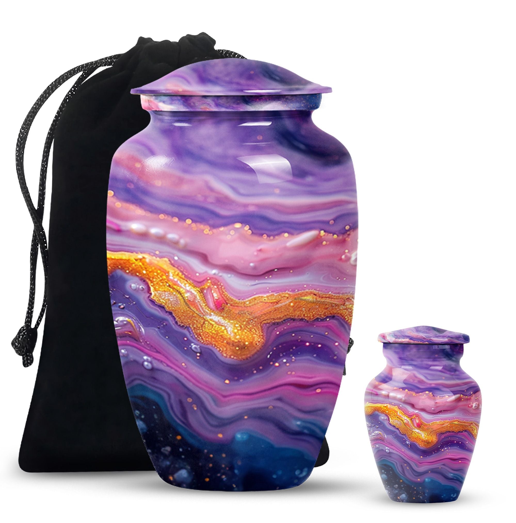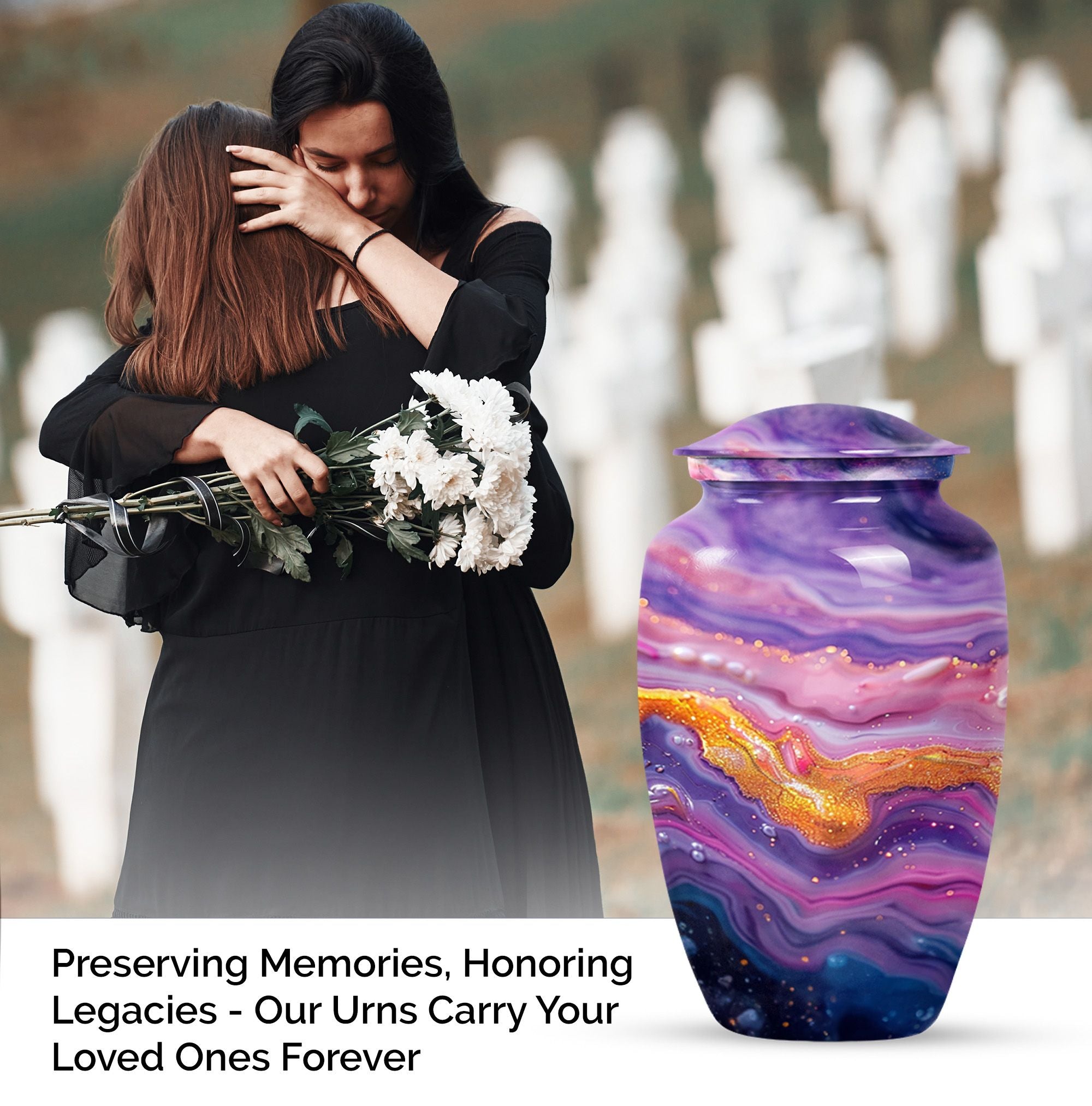 Experience the elegance and artistry of the Vibrant Swirl Urn, meticulously designed to preserve your cherished memories. Each urn is made from superior aluminum material, ensuring long-lasting durability. This large urn has the capacity to hold 200 cubic inches of ash, fitting the needs of most adults. Boasting a comforting weight of 3.3 pounds, it stands 10 inches tall, providing a significant presence that commands respect and reverence. Its intricate abstract theme adds a unique flair to the classic urn design. Alongside the urn, we provide a velvet pouch for tasteful containment and protection of the ashes. Plus, a special customization feature lets you personalize the piece adding engraved names of the departed, creating a truly unique memorial. Opt for our Vibrant Swirl Urn for a touching tribute to your loved ones. Note: this product doesn't include any design attribute as part of the specifications.