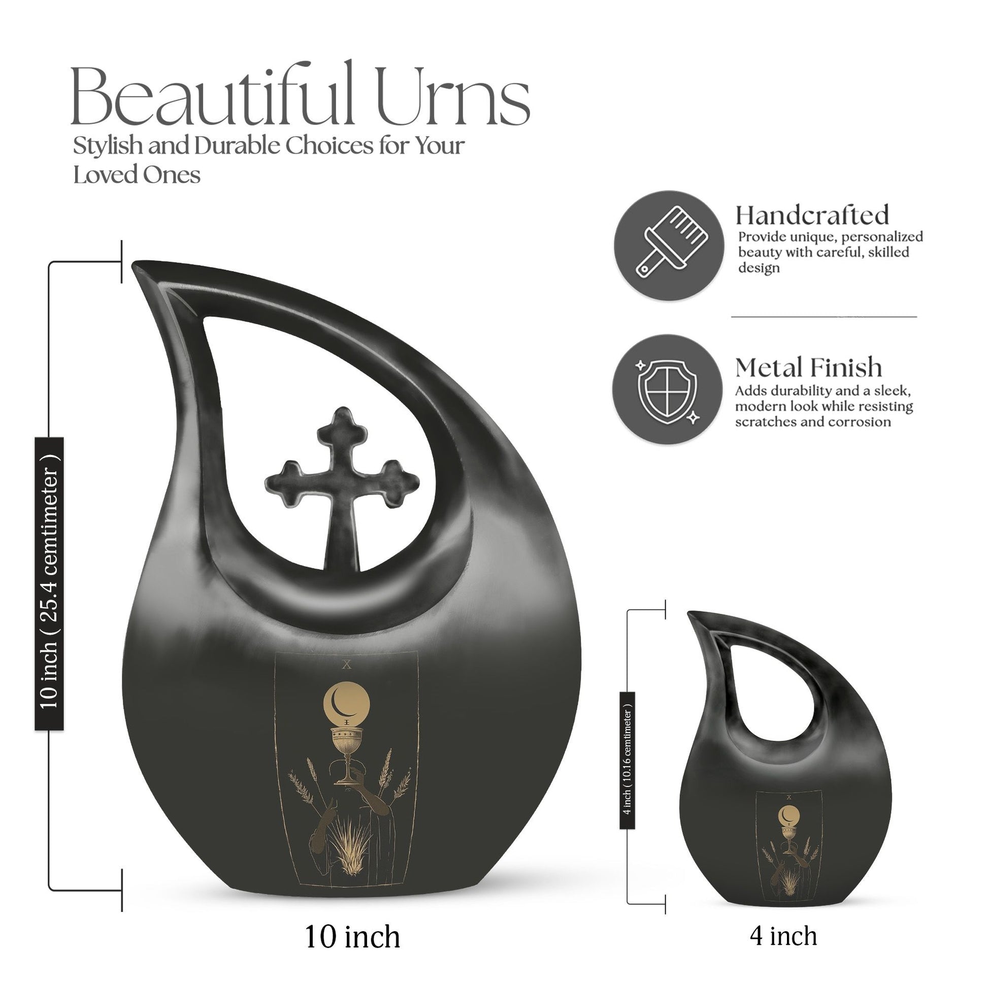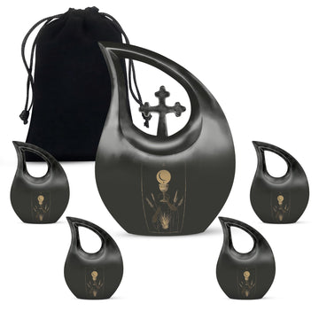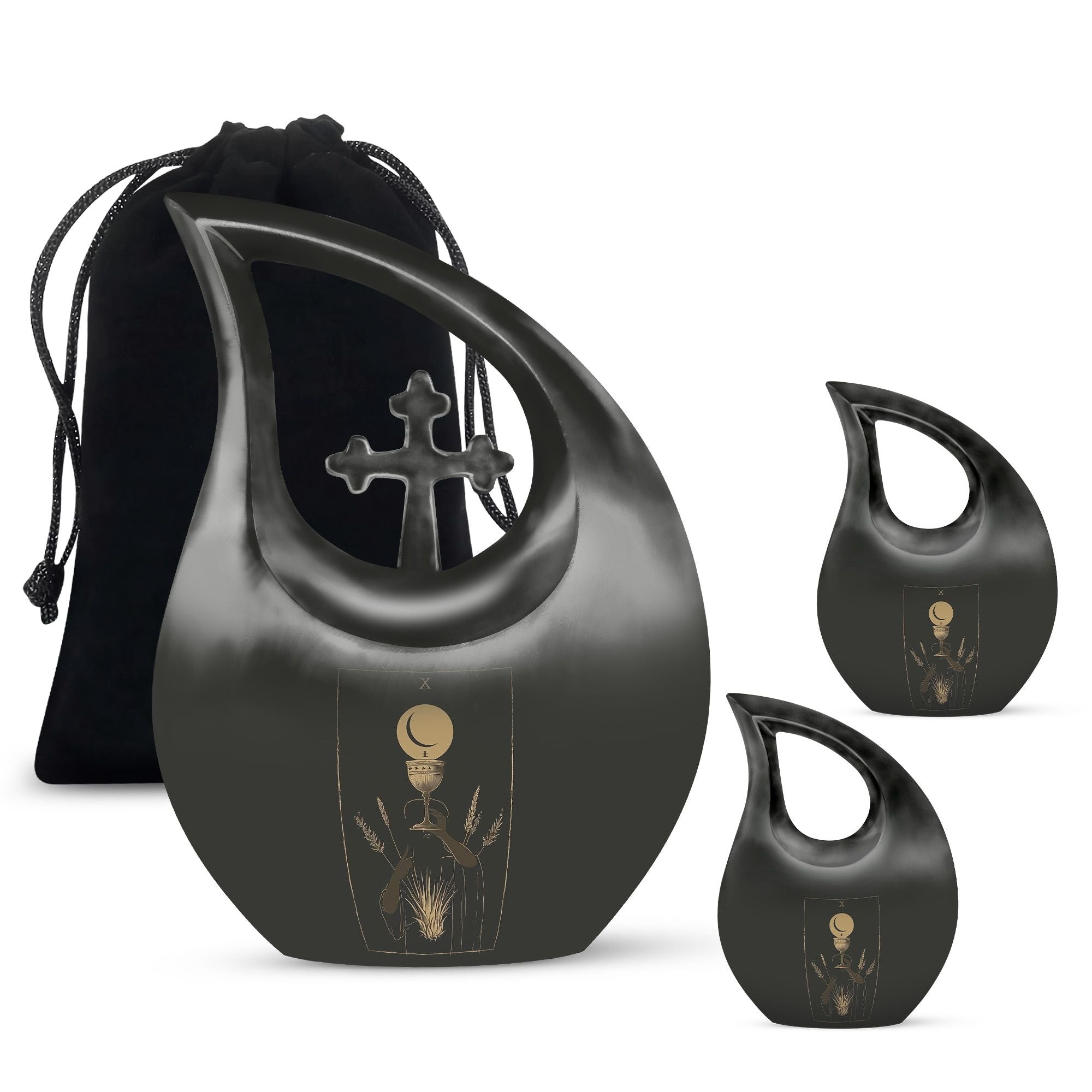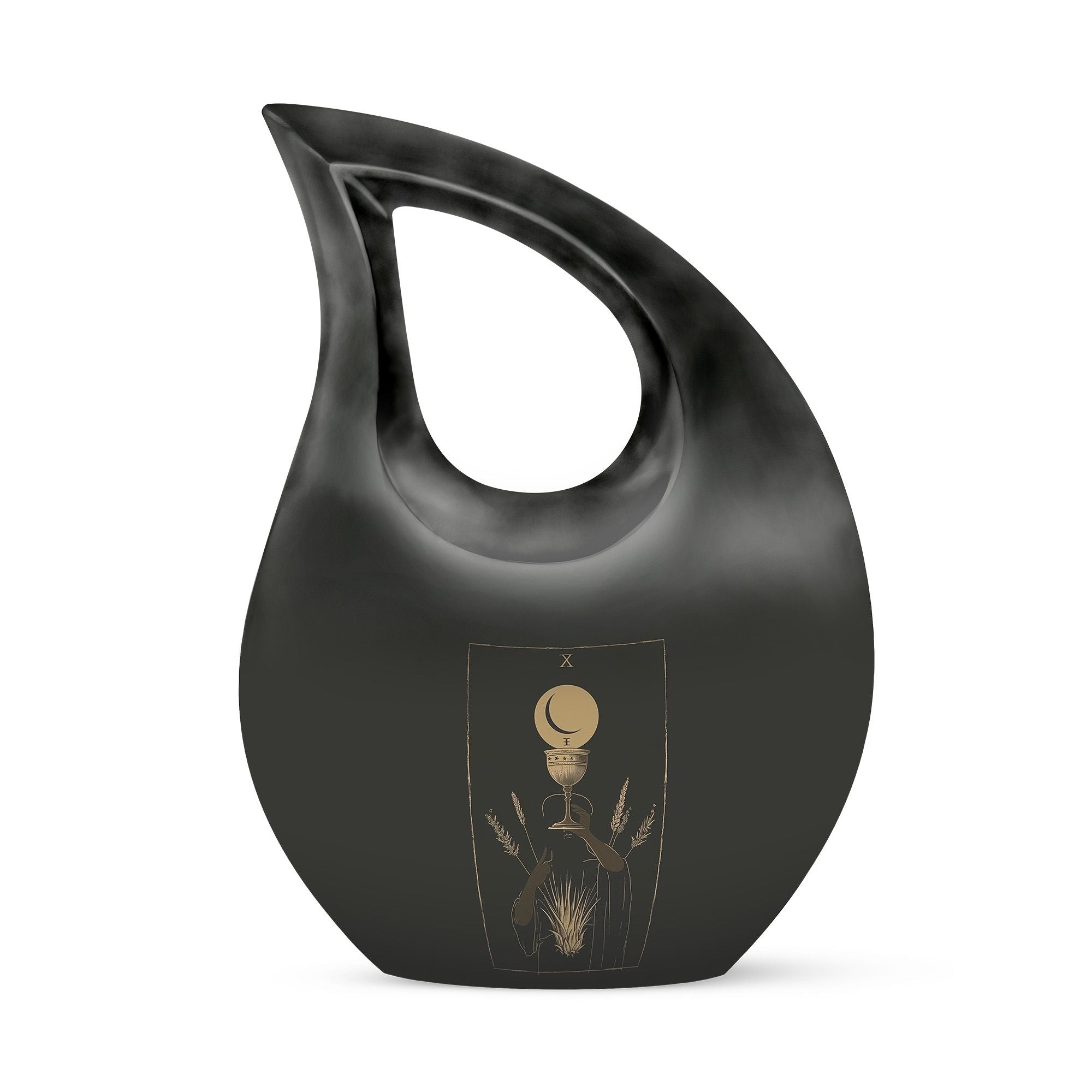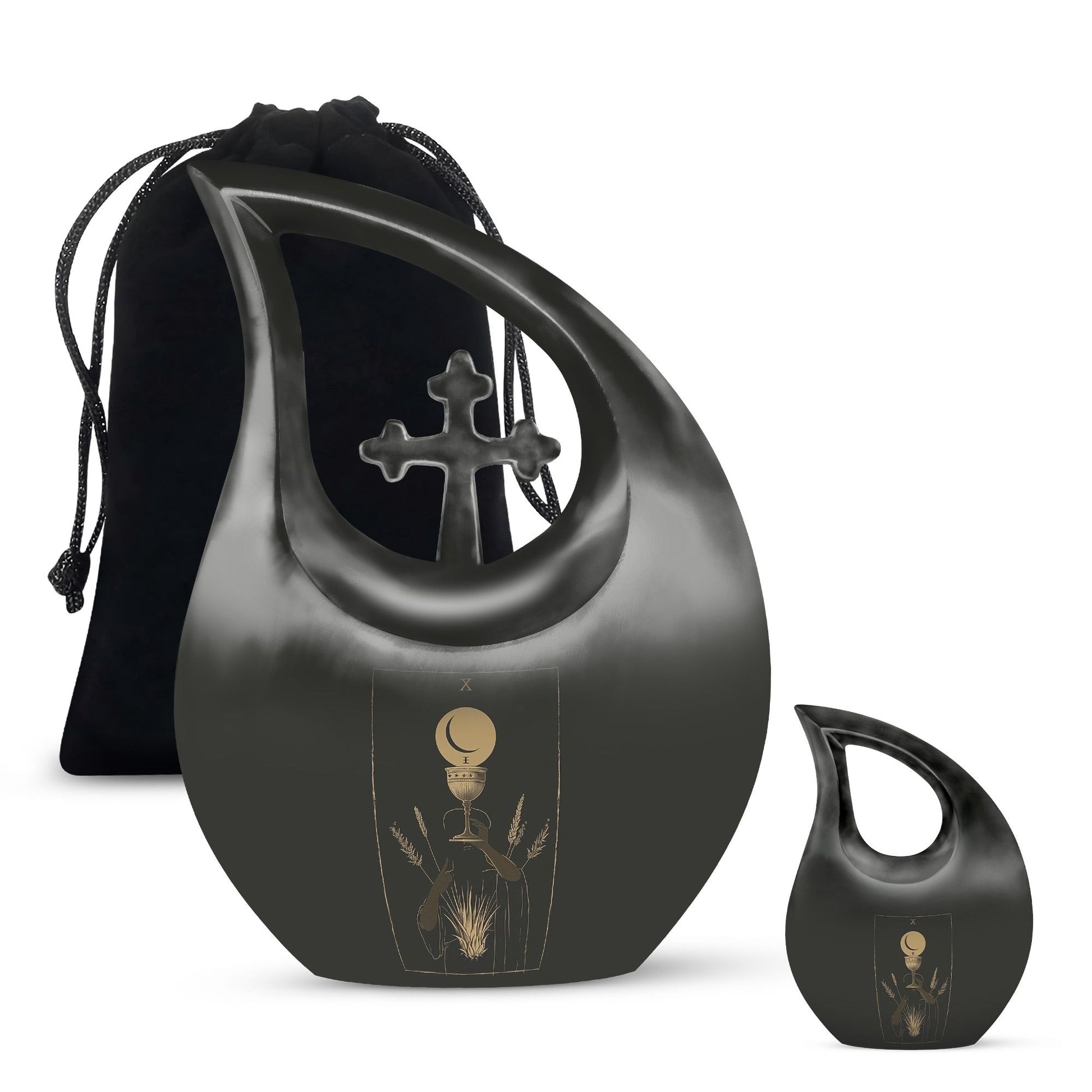 Discover the exquisite Tarot urn, a cherished item in our collection of memorial urns. The beauty and grandeur of this large urn echo comfort and serenity. Crafted with finesse from durable, high-quality aluminum, it stands impressively at 10 inches and weighs 3.3 pounds. Our 'Cross Drop' urn is designed to effortlessly contain 200 cubic inches of your loved one's sacred ashes. The urn comes complete with a velvet pouch, offering a dignified containment for the treasured remains. Add a personal touch by choosing an option to engrave names, transforming the urn into a beautiful ashes keepsake for a man or a custom mom urn. Understated yet unusual, this urn serves as an apt testament to a life well-lived. It stands out as an elegant option among decorative urns in facilitating a touching tribute to your departed loved ones.
