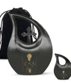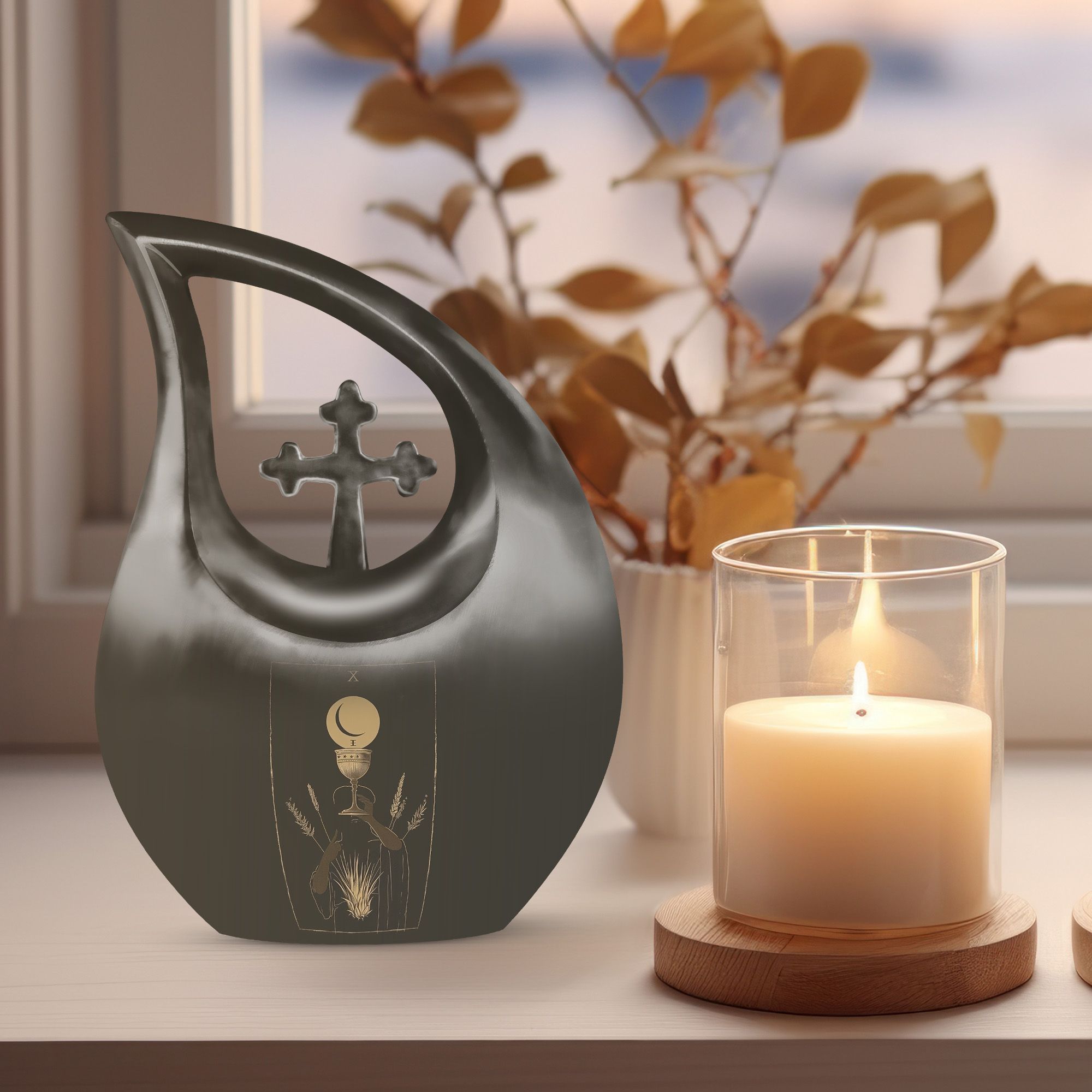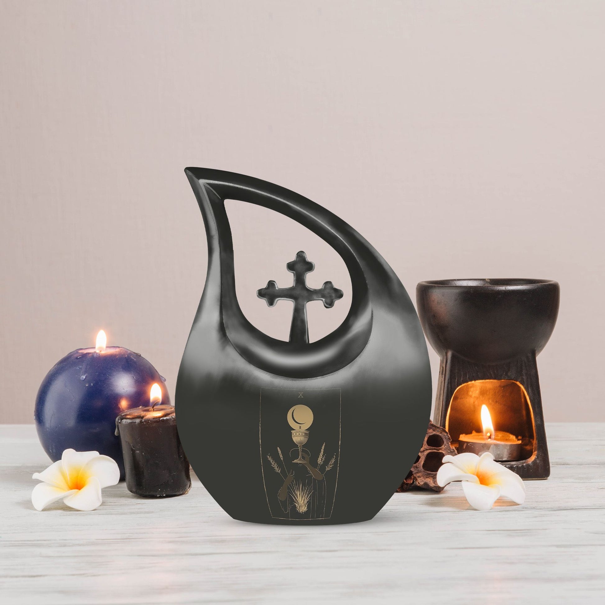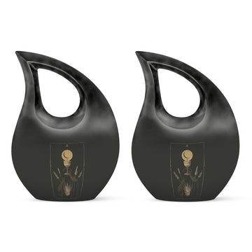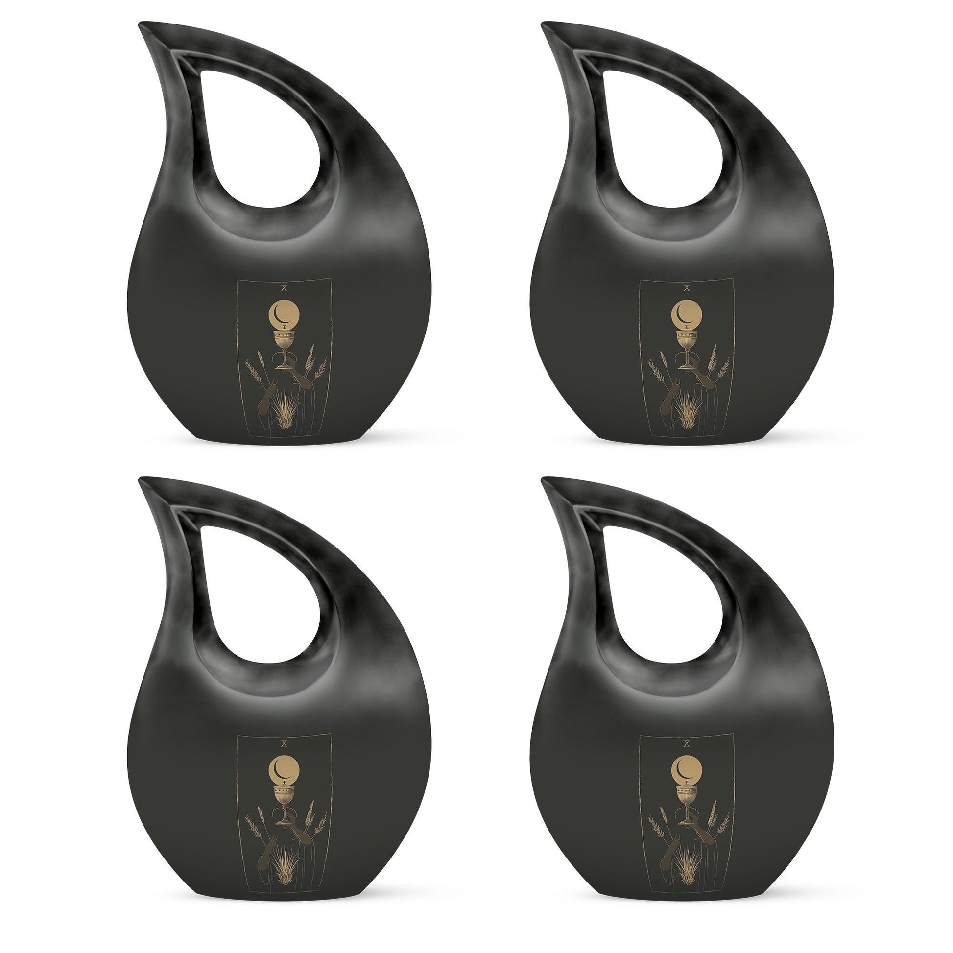 Discover the exquisite Tarot urn, a cherished item in our collection of memorial urns. The beauty and grandeur of this large urn echo comfort and serenity. Crafted with finesse from durable, high-quality aluminum, it stands impressively at 10 inches and weighs 3.3 pounds. Our 'Cross Drop' urn is designed to effortlessly contain 200 cubic inches of your loved one's sacred ashes. The urn comes complete with a velvet pouch, offering a dignified containment for the treasured remains. Add a personal touch by choosing an option to engrave names, transforming the urn into a beautiful ashes keepsake for a man or a custom mom urn. Understated yet unusual, this urn serves as an apt testament to a life well-lived. It stands out as an elegant option among decorative urns in facilitating a touching tribute to your departed loved ones.