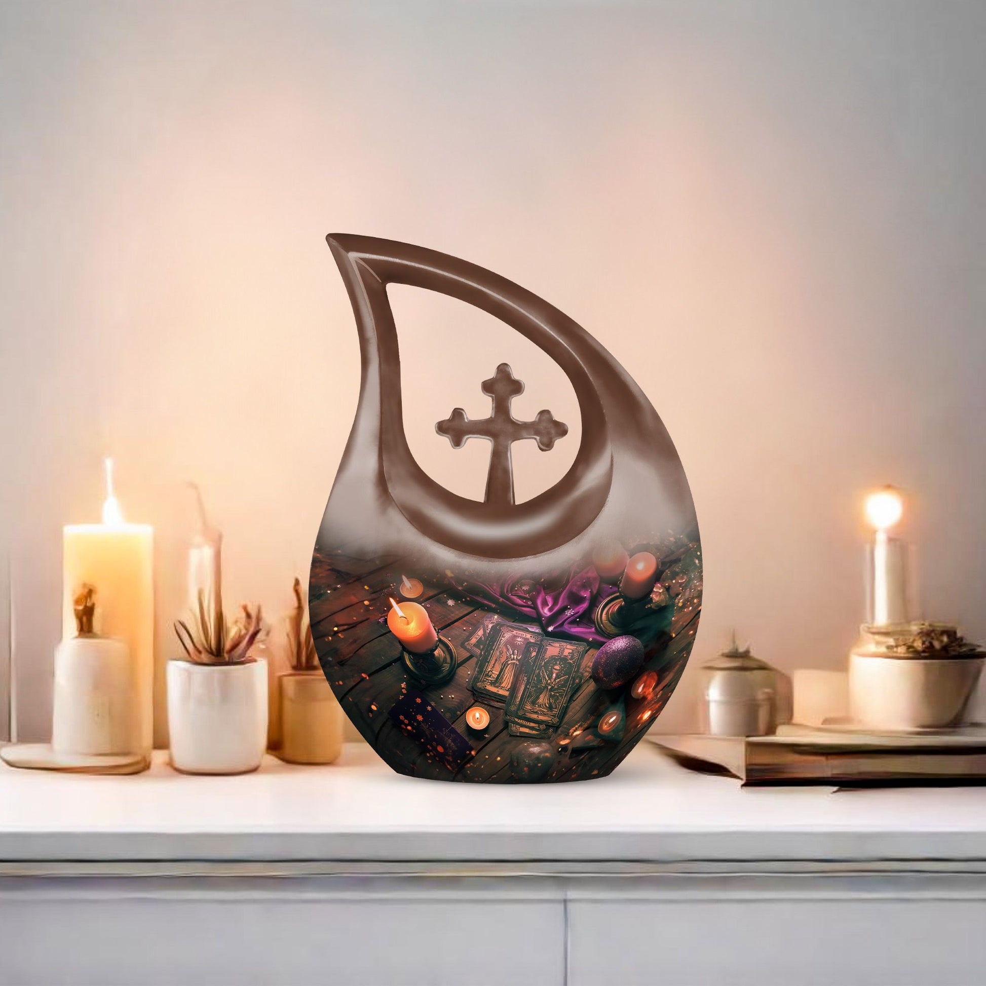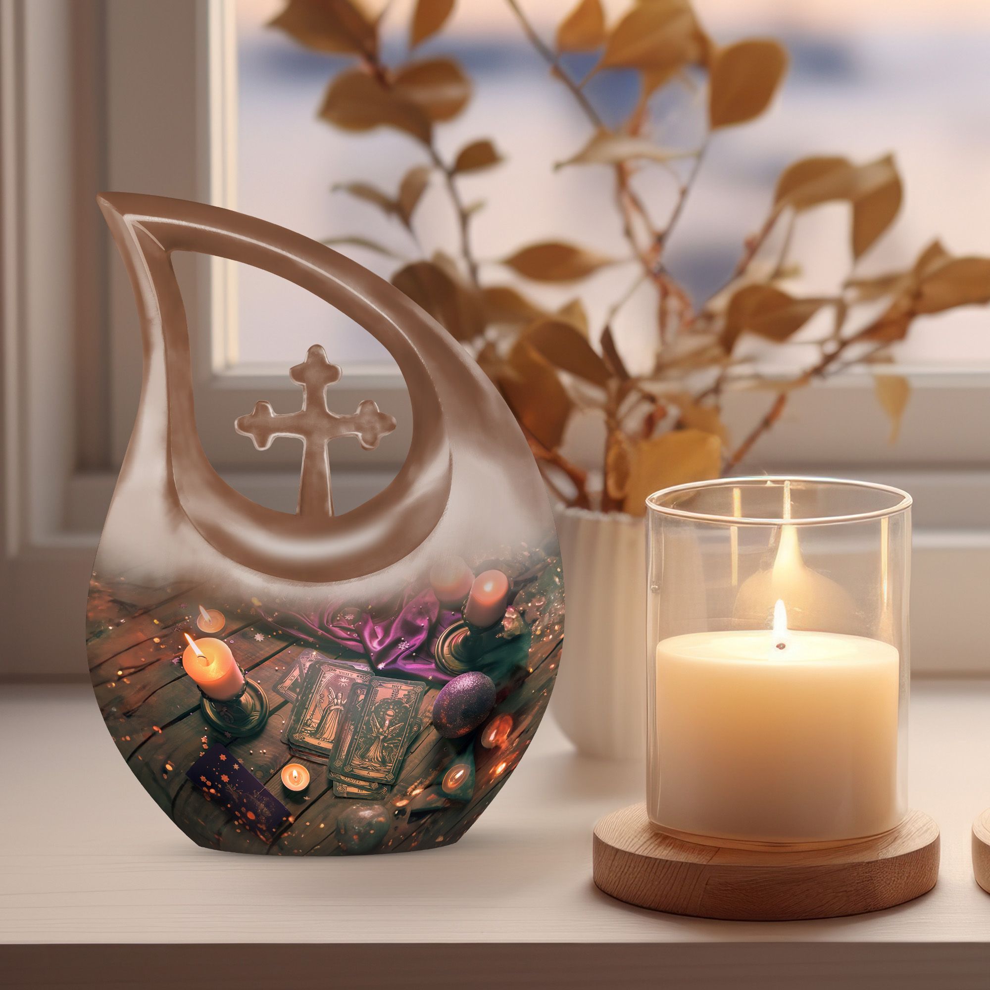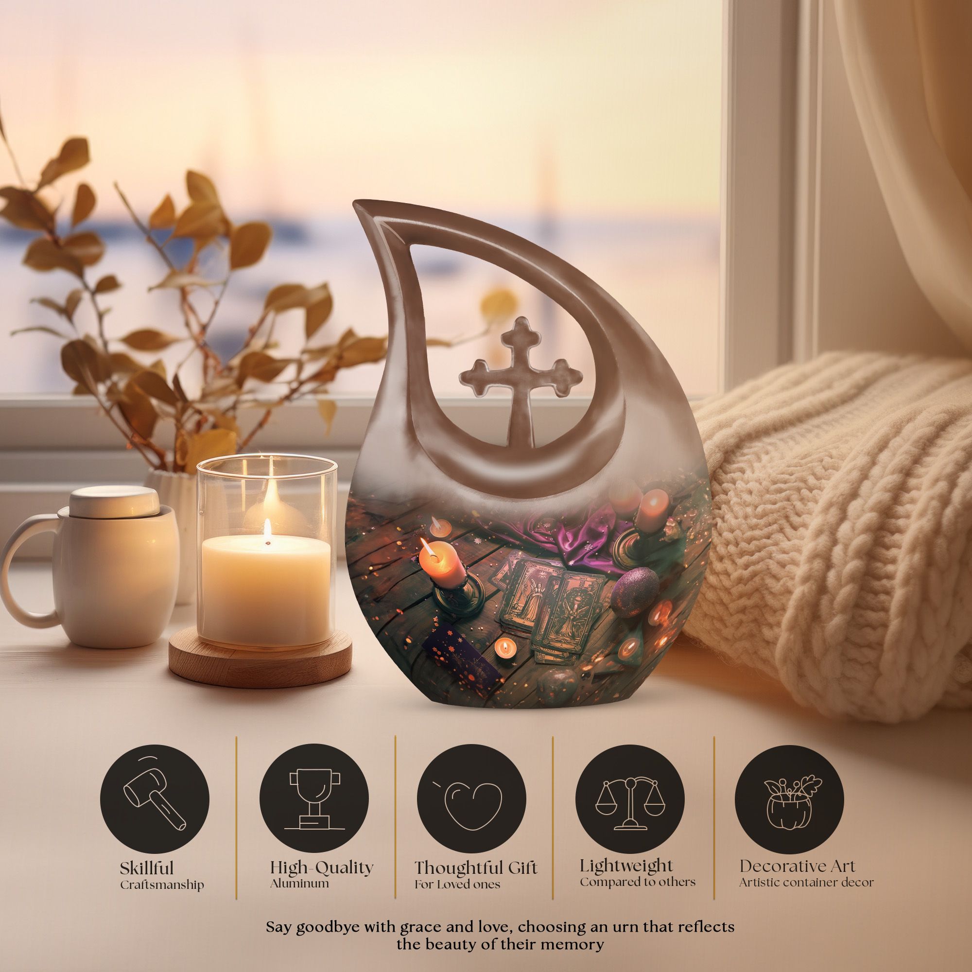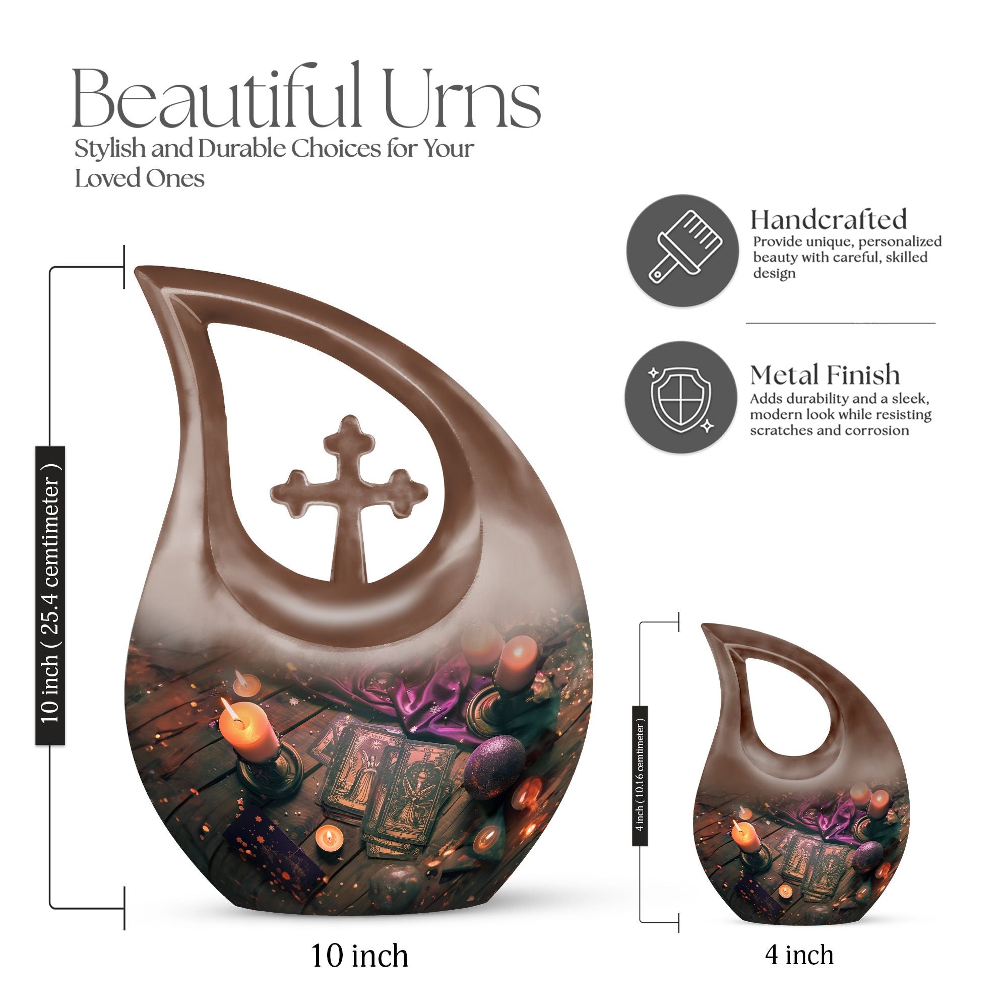 Commemorate your loved one with our unique Tarot-inspired urn, precisely designed to hold remains with reverence. Showcasing a 'Cross Drop' theme, this memorial urn stands tall at a noticeable height of 10 inches and is robustly constructed from durable aluminium. Not just your ordinary storage for remnants, it has an impressive capacity of 200 cubic inches, making it suitable for large burials. With a weight of 3.3 pounds, it establishes a comforting, substantial feel in your hands. As a bonus, it comes with a velvet pouch that securely holds the contents. The option to customize comes handy; you can personalize it with engraved names, making it a truly unique tribute. This product pays a sincere homage to the dearly departed and makes it a worthy addition in the realm of Modern Urns for Ashes, Urns for Angels, or Burial Urns for Human Ashes. A standout memorabilia, it's not just an urn, but a heartfelt way of saying - 'Always remembered, never forgotten'.