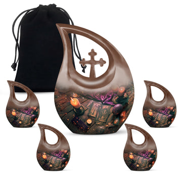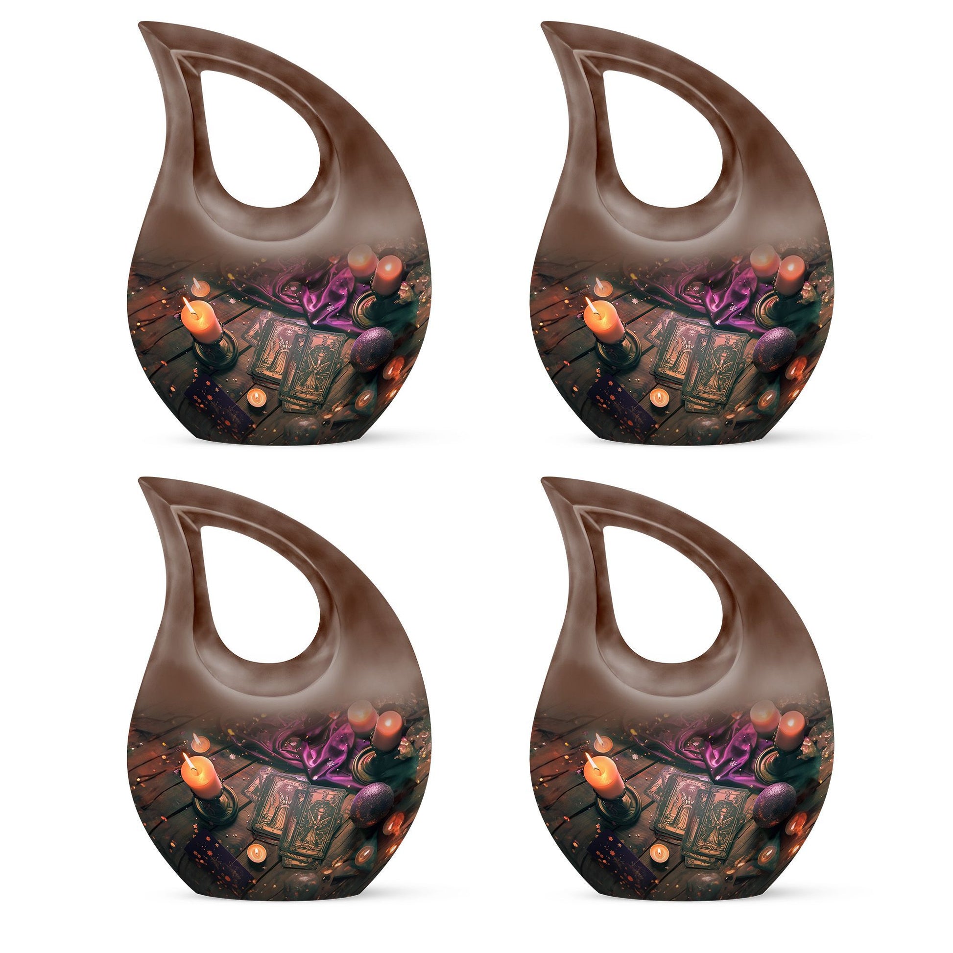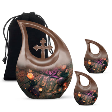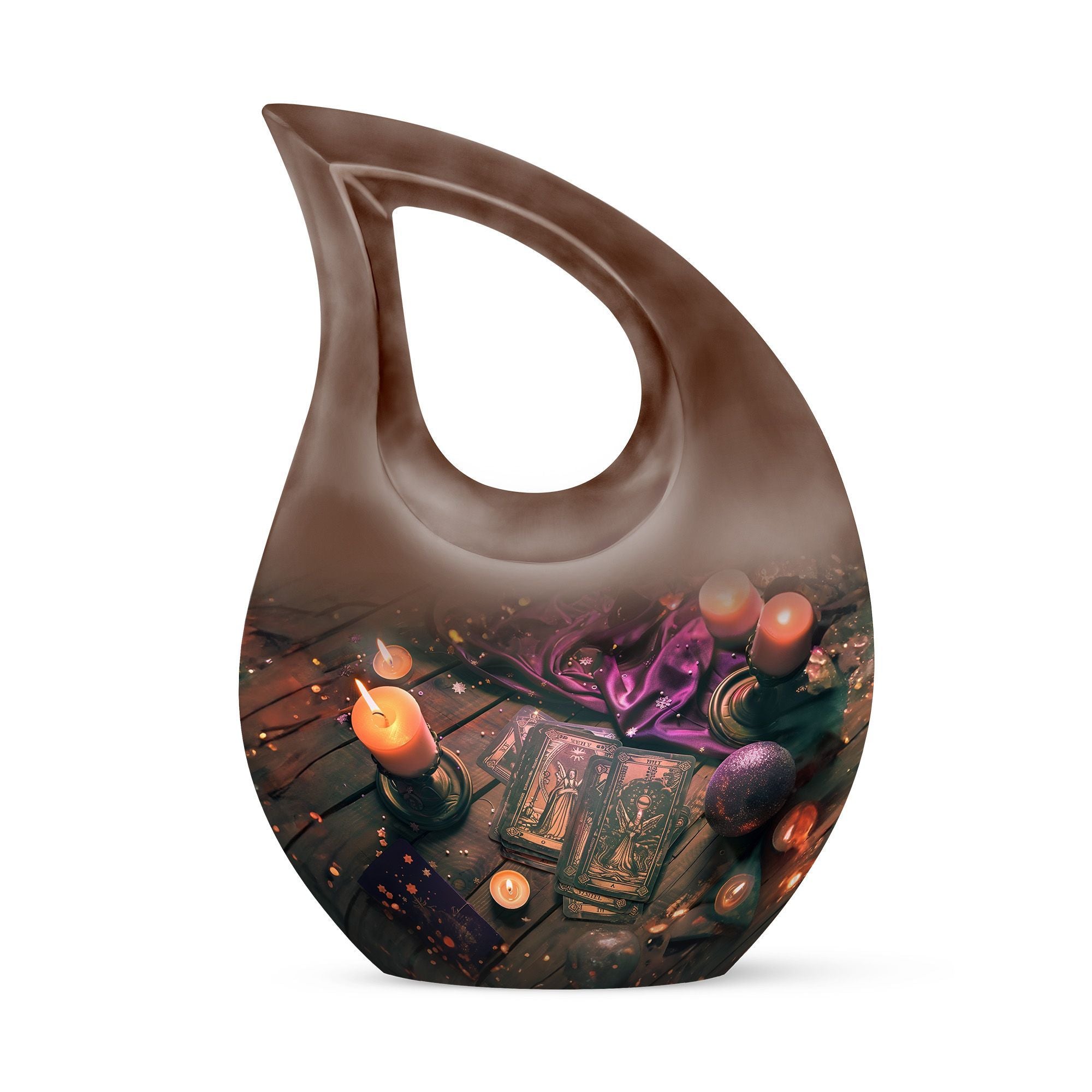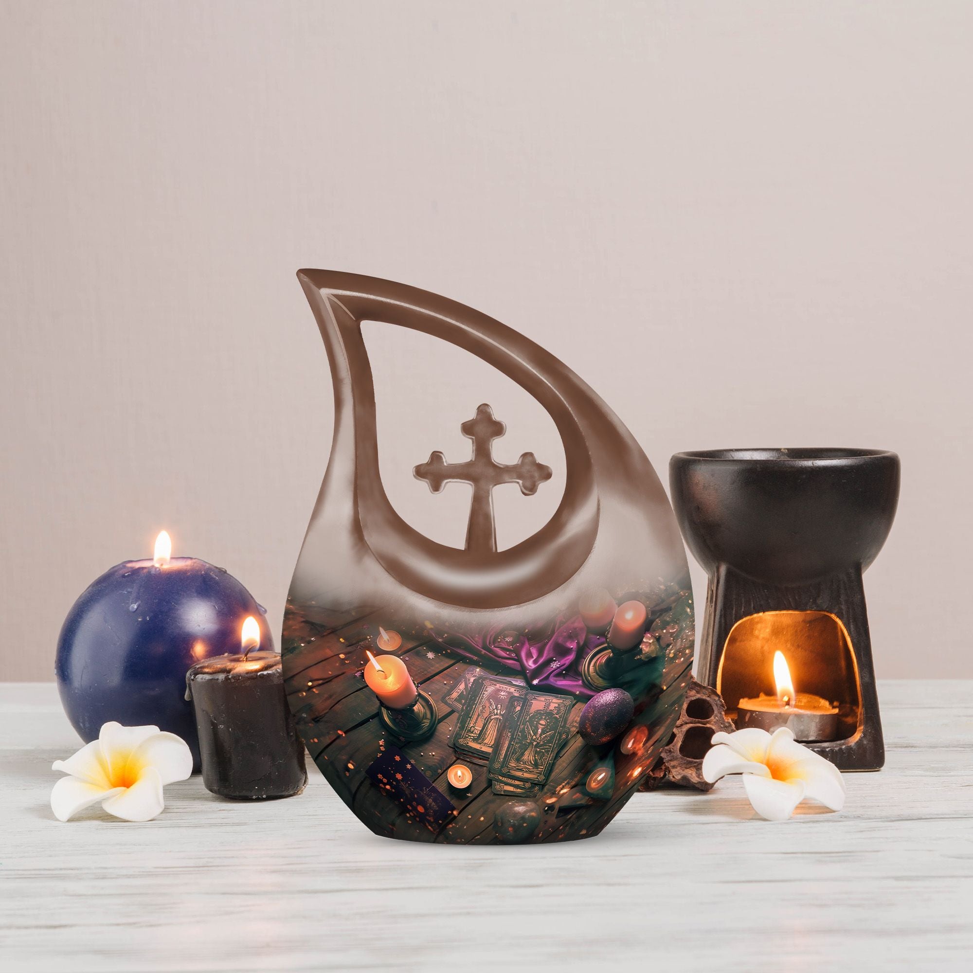 Commemorate your loved one with our unique Tarot-inspired urn, precisely designed to hold remains with reverence. Showcasing a 'Cross Drop' theme, this memorial urn stands tall at a noticeable height of 10 inches and is robustly constructed from durable aluminium. Not just your ordinary storage for remnants, it has an impressive capacity of 200 cubic inches, making it suitable for large burials. With a weight of 3.3 pounds, it establishes a comforting, substantial feel in your hands. As a bonus, it comes with a velvet pouch that securely holds the contents. The option to customize comes handy; you can personalize it with engraved names, making it a truly unique tribute. This product pays a sincere homage to the dearly departed and makes it a worthy addition in the realm of Modern Urns for Ashes, Urns for Angels, or Burial Urns for Human Ashes. A standout memorabilia, it's not just an urn, but a heartfelt way of saying - 'Always remembered, never forgotten'.