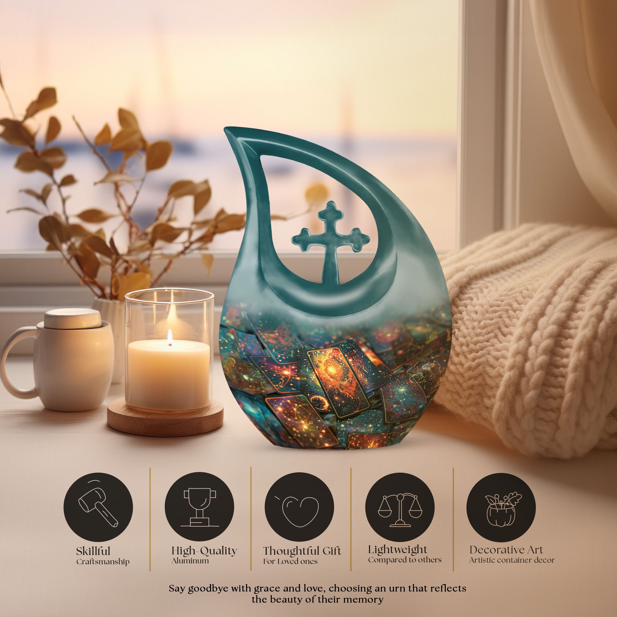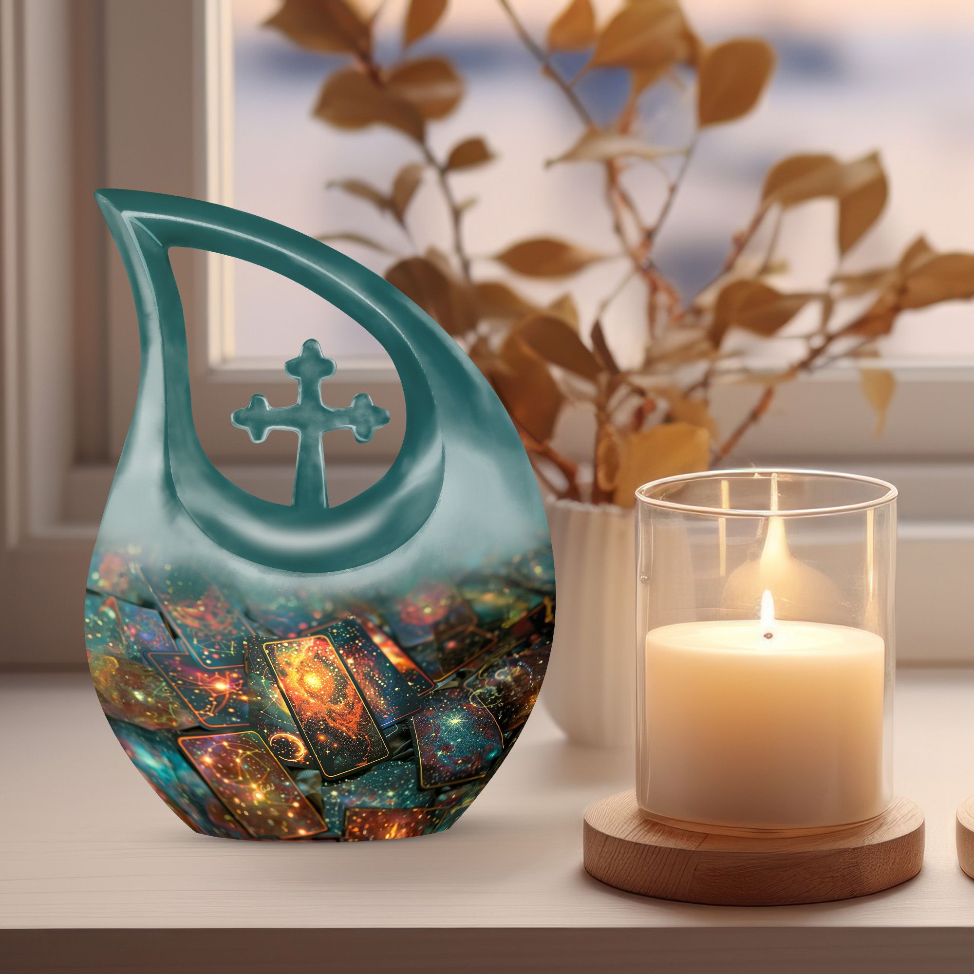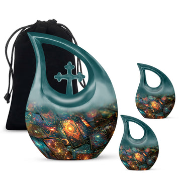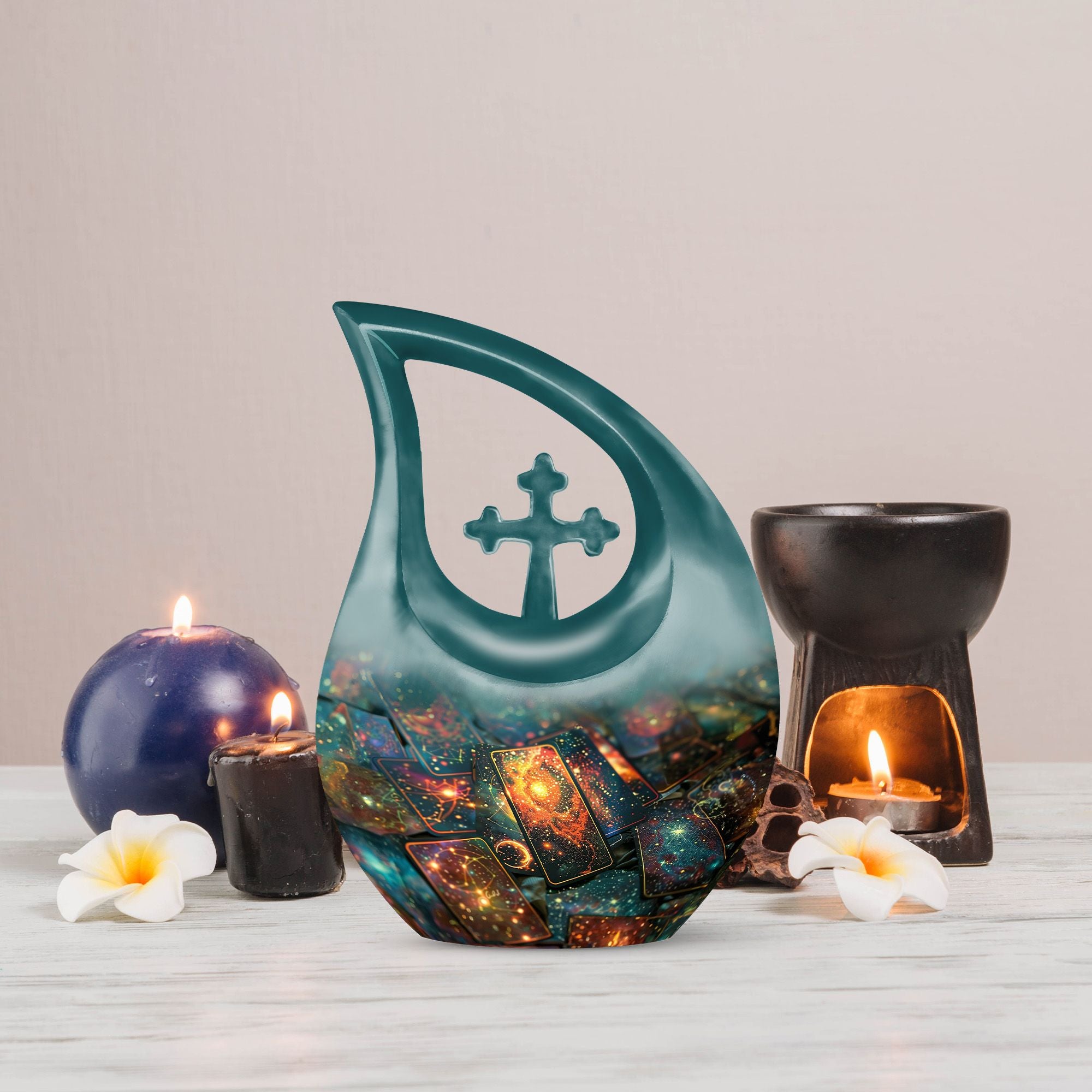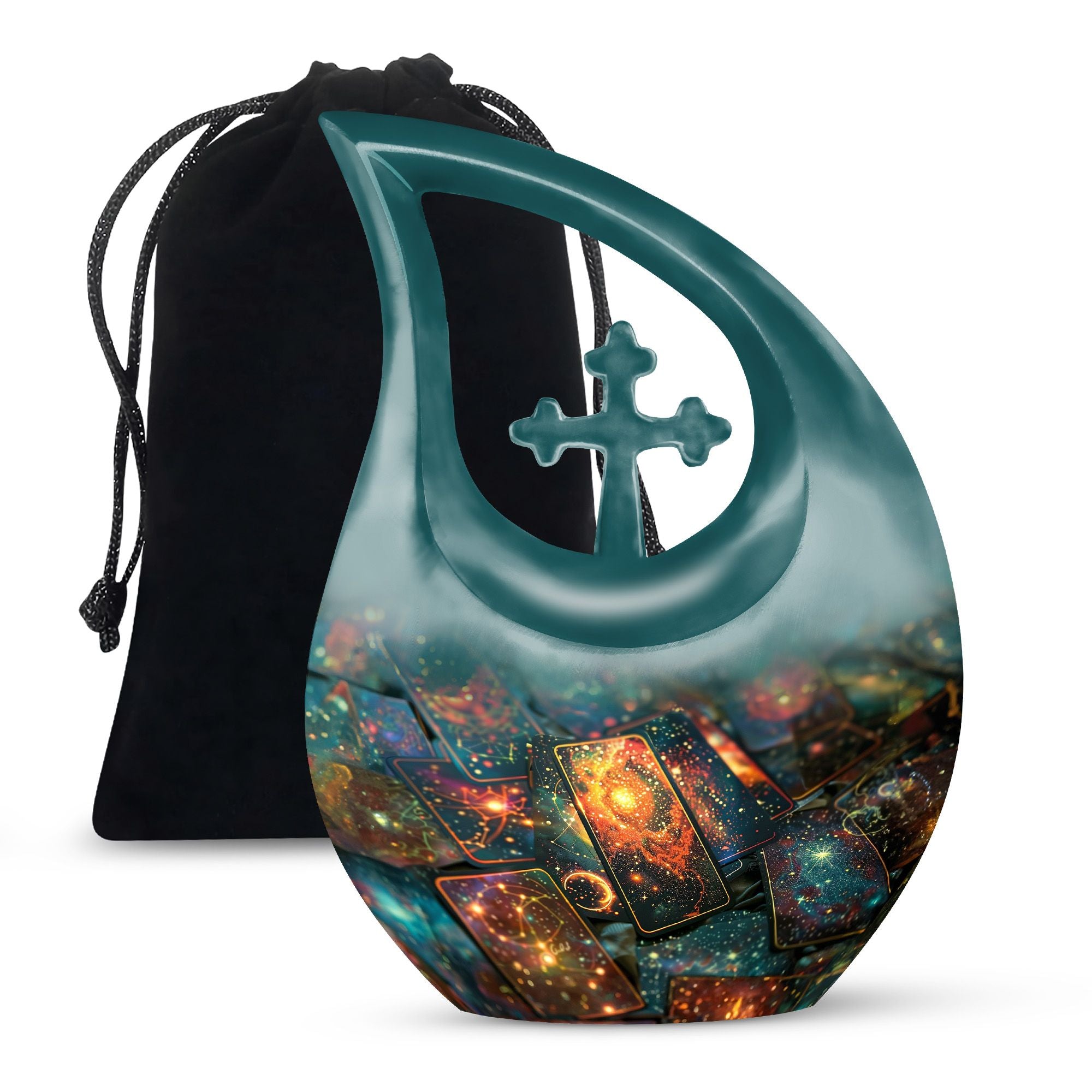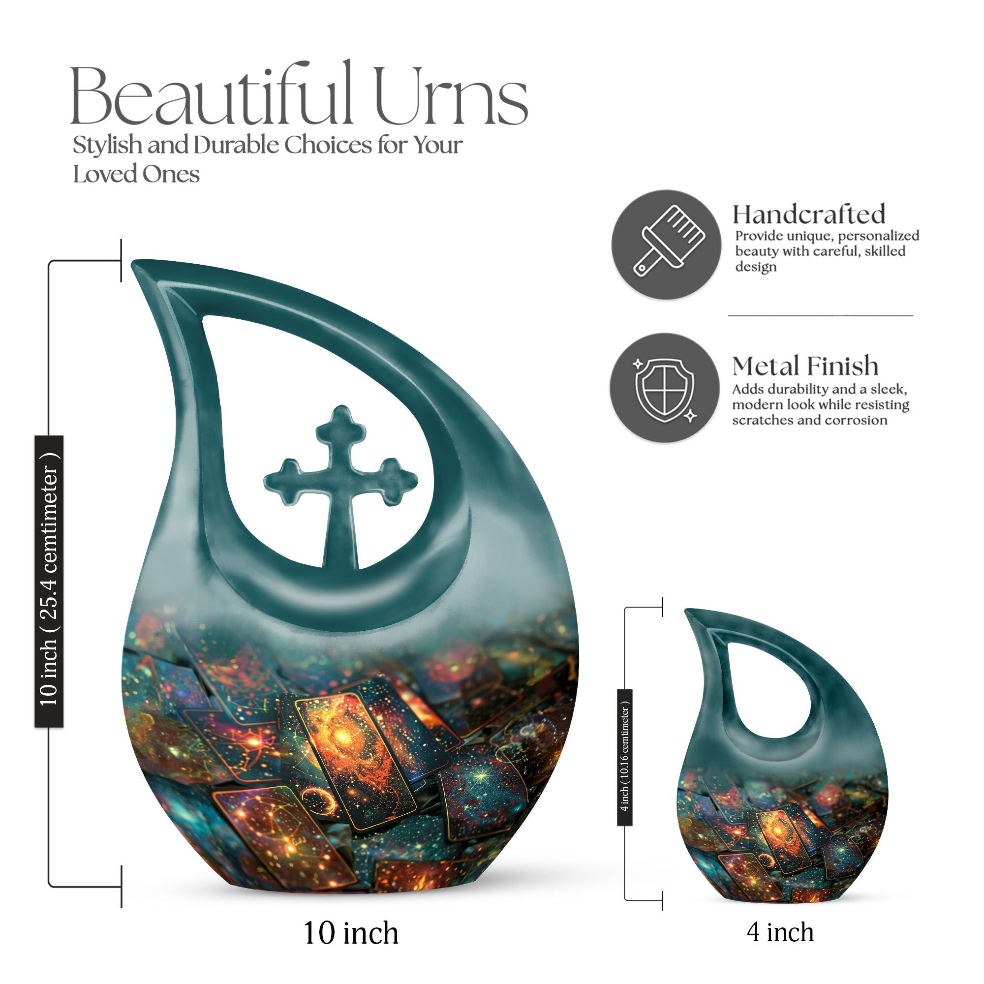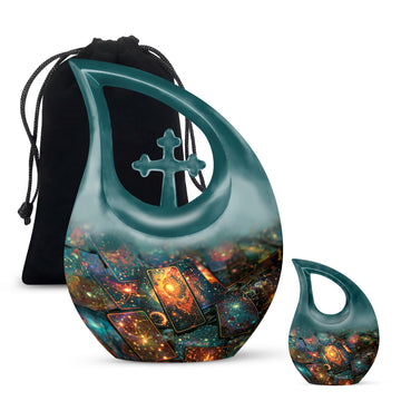 Honor your cherished loved ones and safeguard their memories with our Tarot-inspired Large Urn, a symbol of divine wisdom and mystic echo. This Cross Drop Cremation Urn, crafted meticulously from high-quality Aluminium, stands 10 inches tall and weighs a sturdy 3.3 pounds. Its substantial 200 cubic inch capacity makes it a fitting memorial urn for human ashes. Included in the package is a plush velvet pouch, a thoughtful provision for containing precious ashes. As a unique aspect, this Tarot Urn allows for engraving of names, enabling you to personalize a heartfelt remembrance. While the substantial size and design look exceptional, the urn integrates symbolic Tarot elements, radiating a profound spiritual connection. Whether you're seeking Cremation Vaults, an Urn for Mom, affordable Urns, or a distinct Ashes Container, this Tarot Urn offers unparalleled quality and deep sentimental value.
