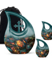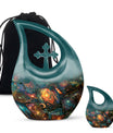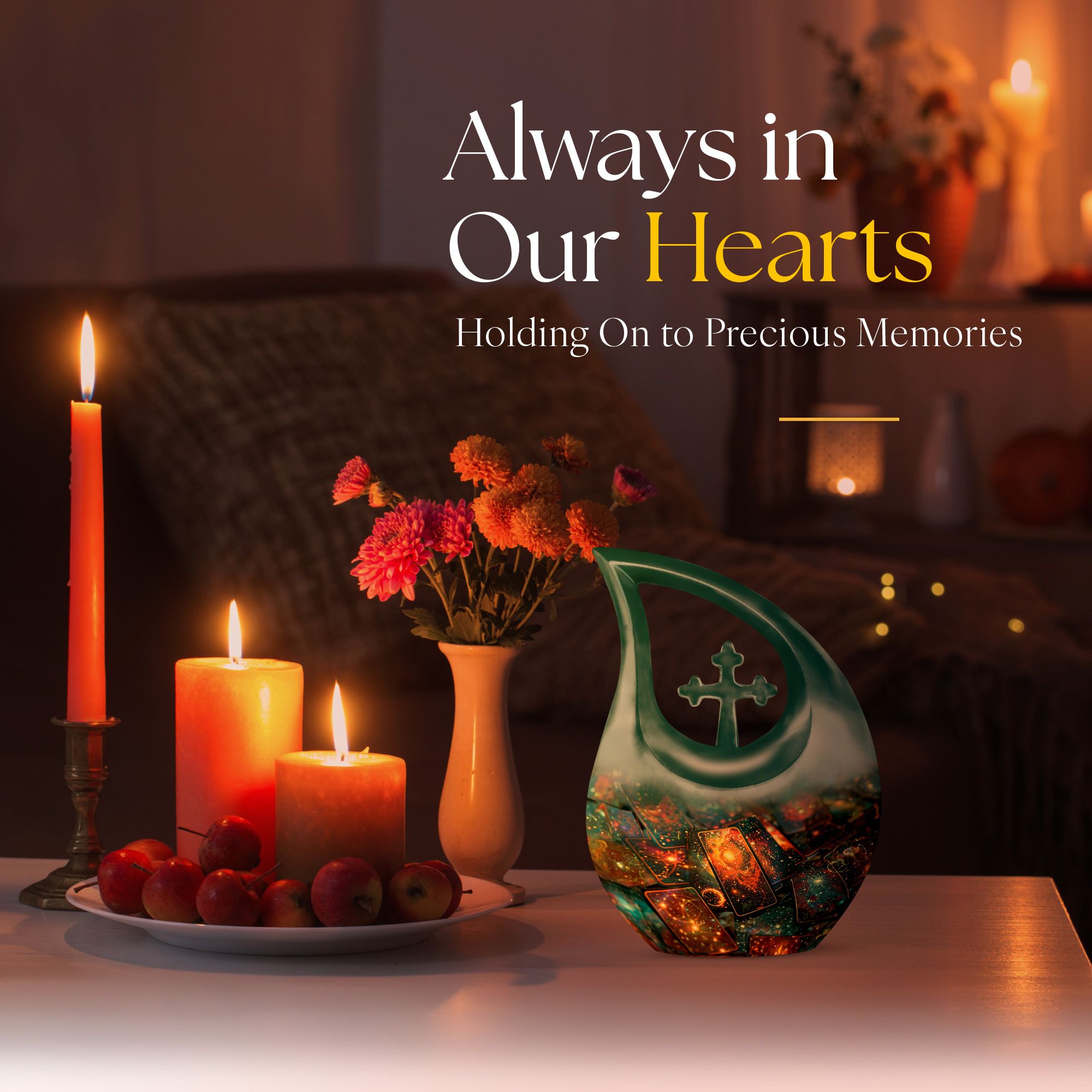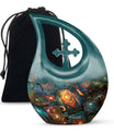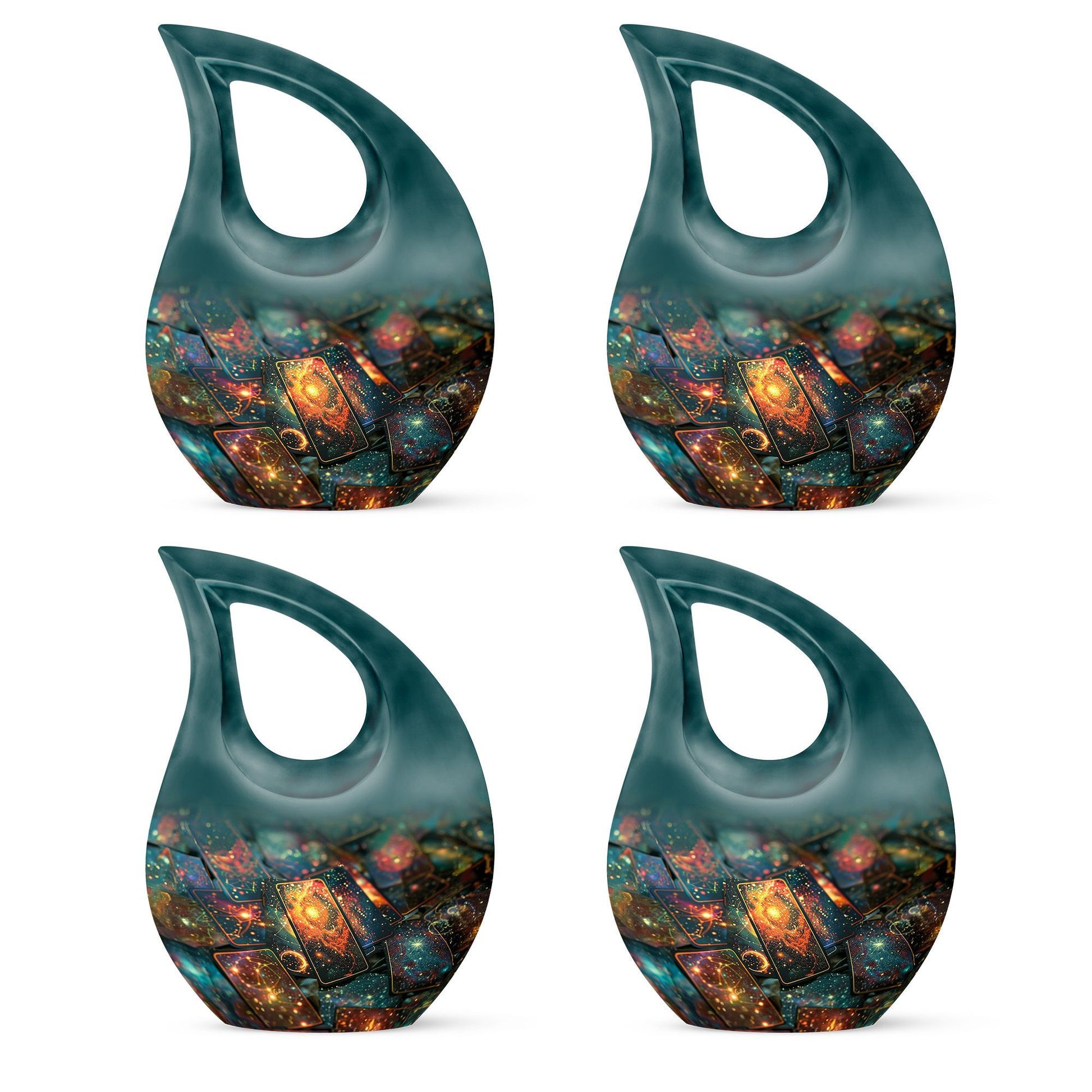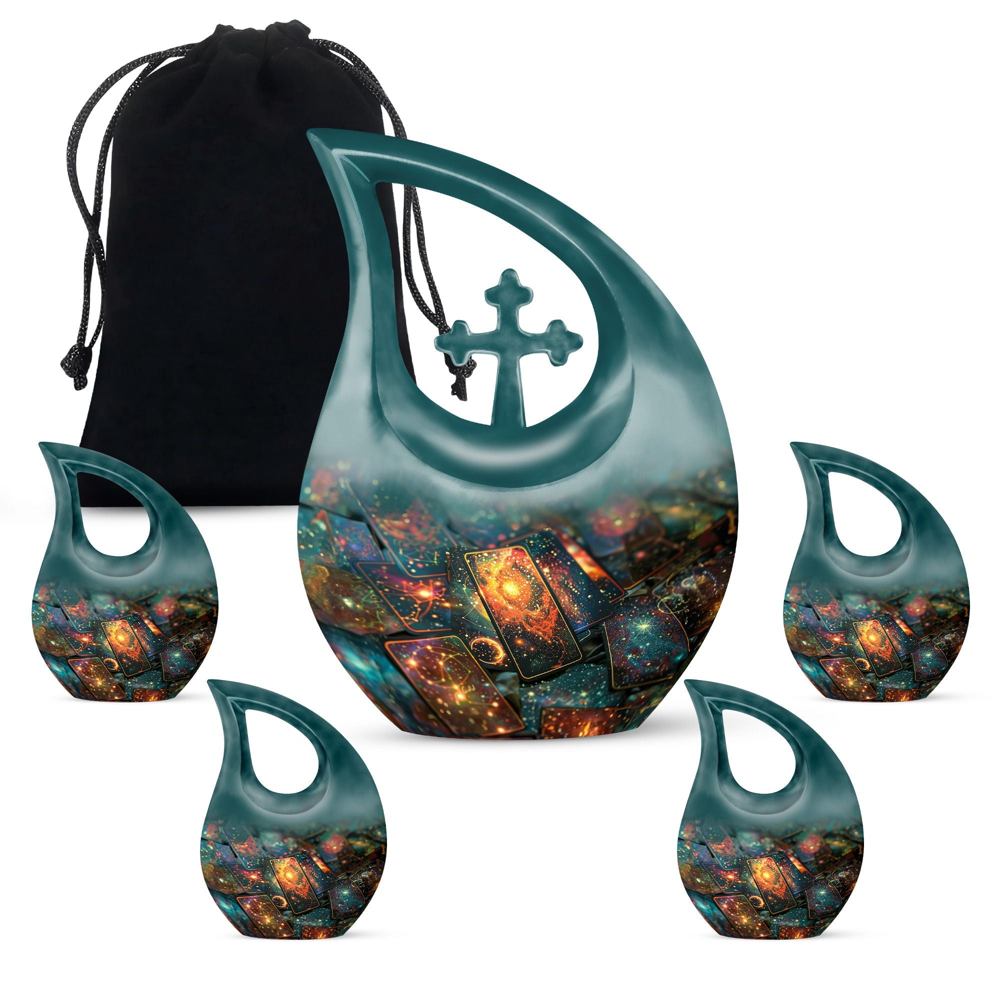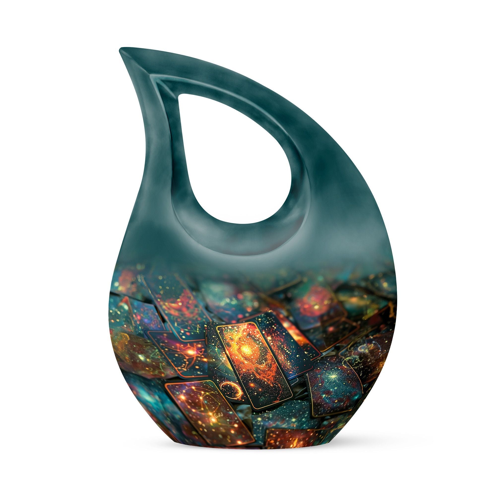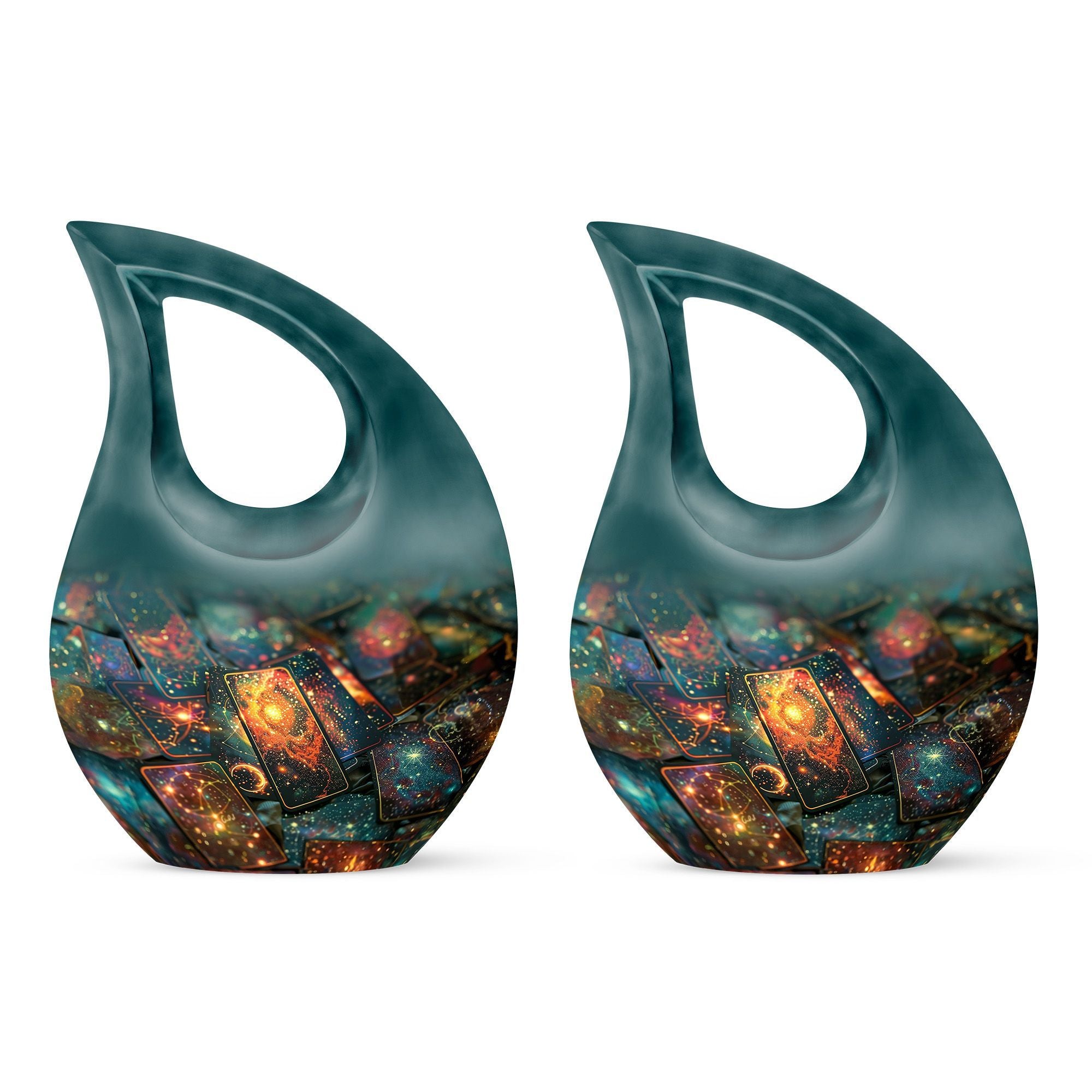 Honor your cherished loved ones and safeguard their memories with our Tarot-inspired Large Urn, a symbol of divine wisdom and mystic echo. This Cross Drop Cremation Urn, crafted meticulously from high-quality Aluminium, stands 10 inches tall and weighs a sturdy 3.3 pounds. Its substantial 200 cubic inch capacity makes it a fitting memorial urn for human ashes. Included in the package is a plush velvet pouch, a thoughtful provision for containing precious ashes. As a unique aspect, this Tarot Urn allows for engraving of names, enabling you to personalize a heartfelt remembrance. While the substantial size and design look exceptional, the urn integrates symbolic Tarot elements, radiating a profound spiritual connection. Whether you're seeking Cremation Vaults, an Urn for Mom, affordable Urns, or a distinct Ashes Container, this Tarot Urn offers unparalleled quality and deep sentimental value.