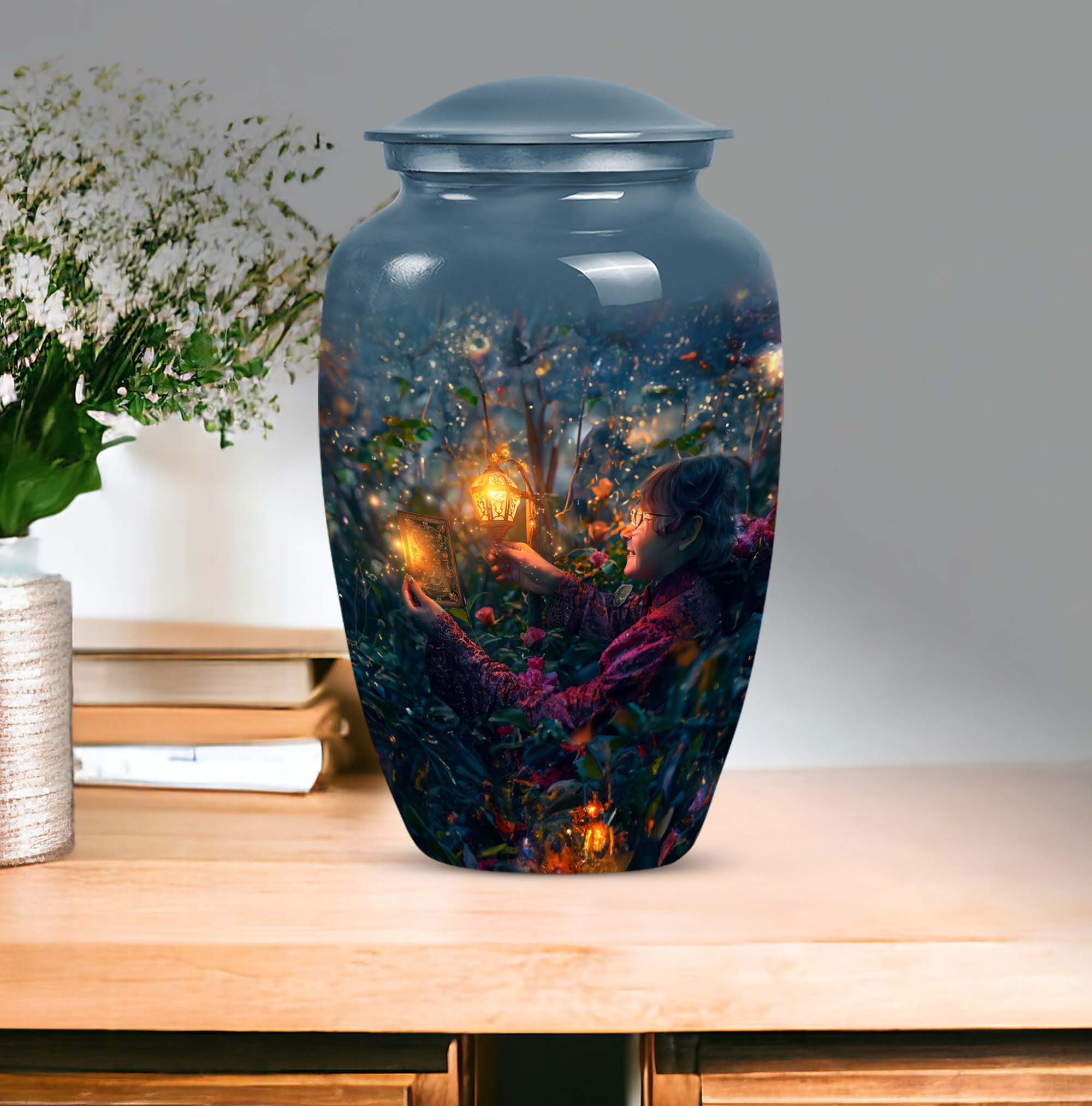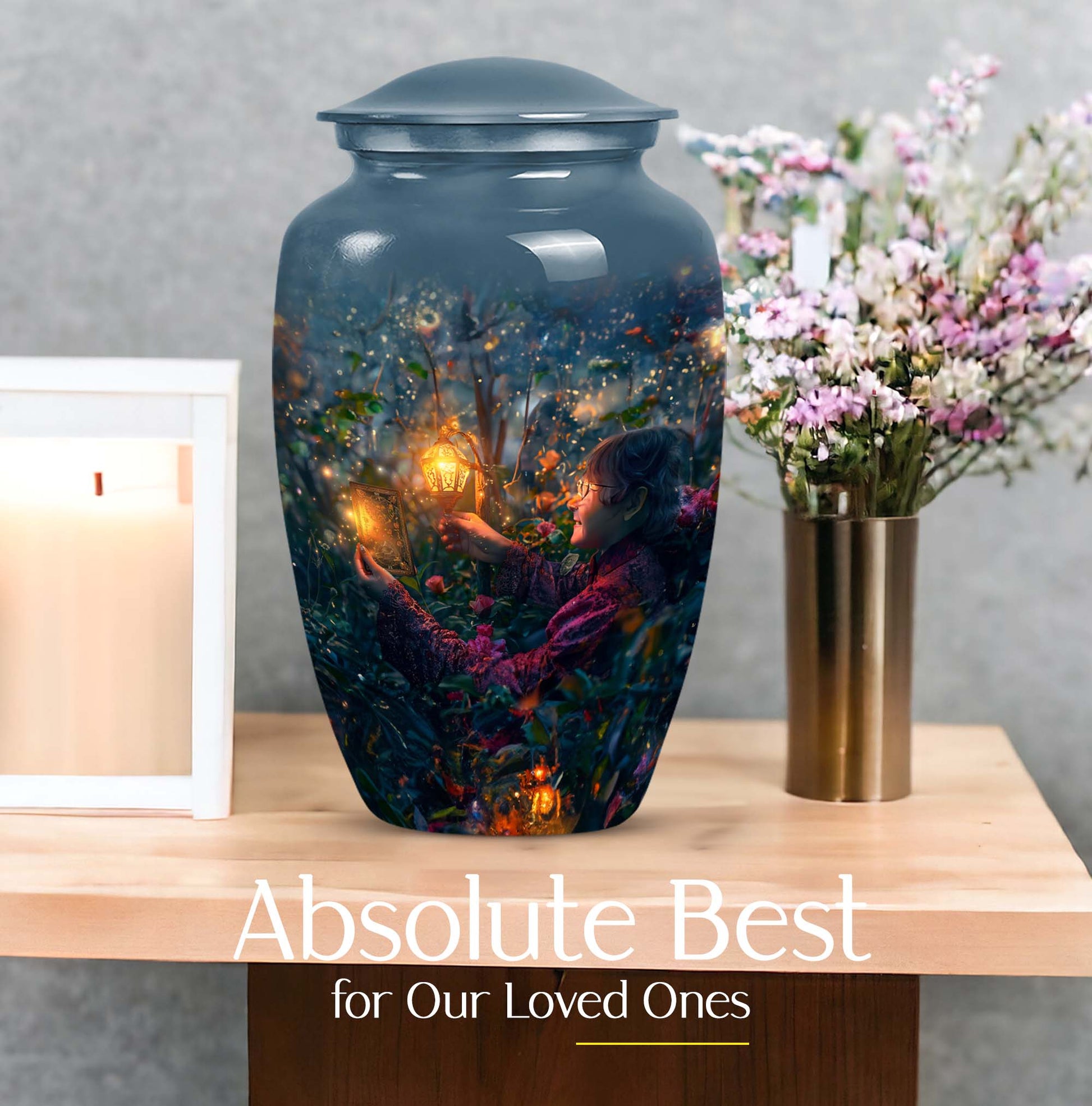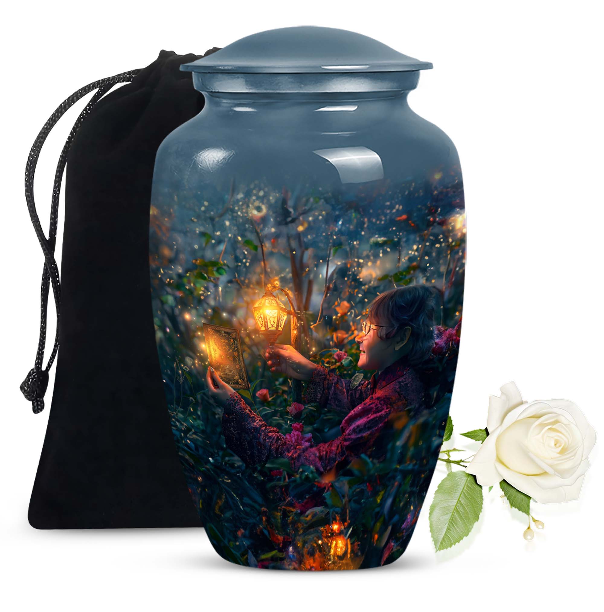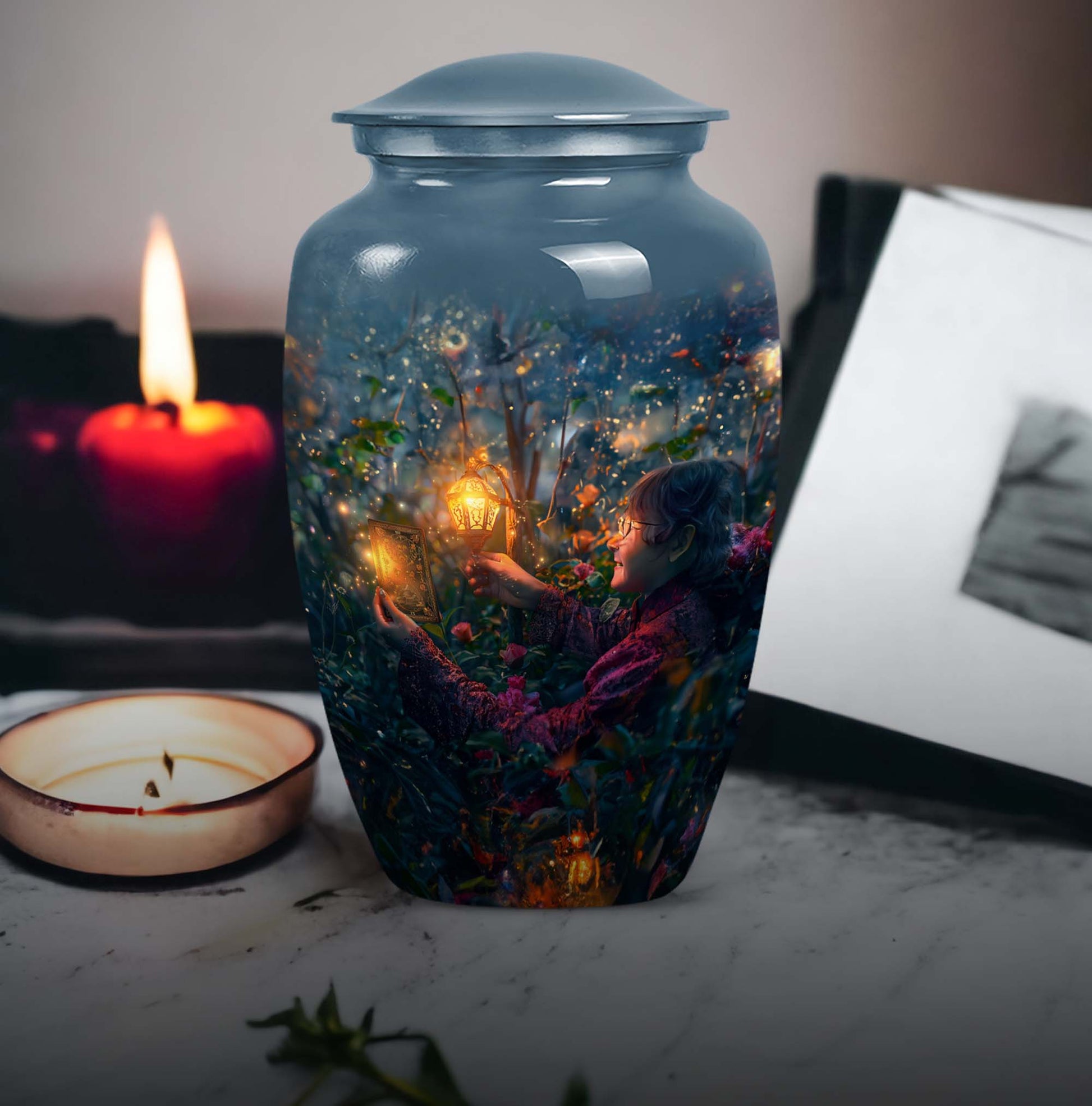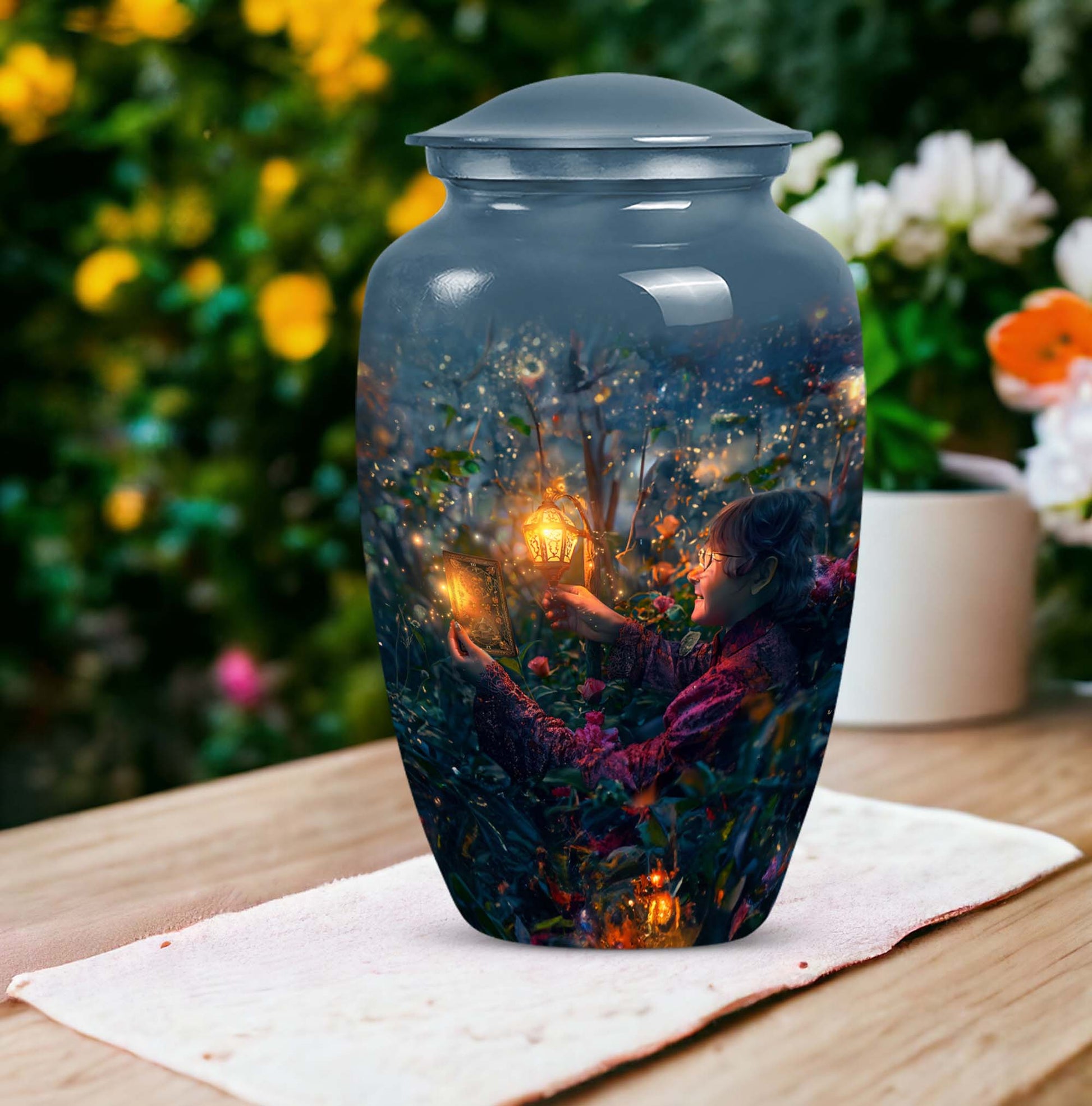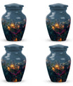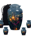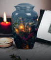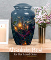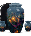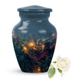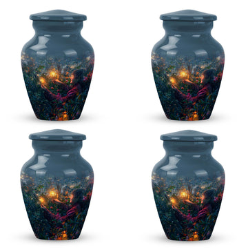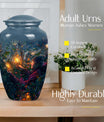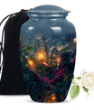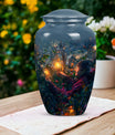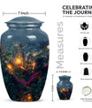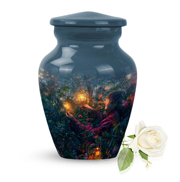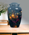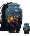 Experience the tranquility and peace that comes with our Tarot Urn, a finely crafted memorial urn for your loved one's ashes. Boasting a size of 10 inches and a hefty weight of 3.3 pounds, this large urn guarantees durability and longevity, keeping precious remains secure. Crafted from high-quality aluminium, its abstract theme adds a touch of unique allure to its classic silhouette. With a capacity of 200 cubic inches, it can comfortably accommodate the ashes of an adult. Ease of handling is ensured, as your purchase includes a velvet pouch designed for the containment of ashes. Moreover, this burial urn offers the opportunity to make it more meaningful by personalizing it with engraved names. Despite its sturdy structure, it maintains a gentle appearance that can suit any memorial setting. This Tarot Urn is not just an indoor treasure; it is also suitable as outdoor urns, elegantly fulfilling your funeral or memorial ceremony needs. Step into the realm of comfort and serenity with our Tarot Urn, a paramount addition to your memorial urns' collection.