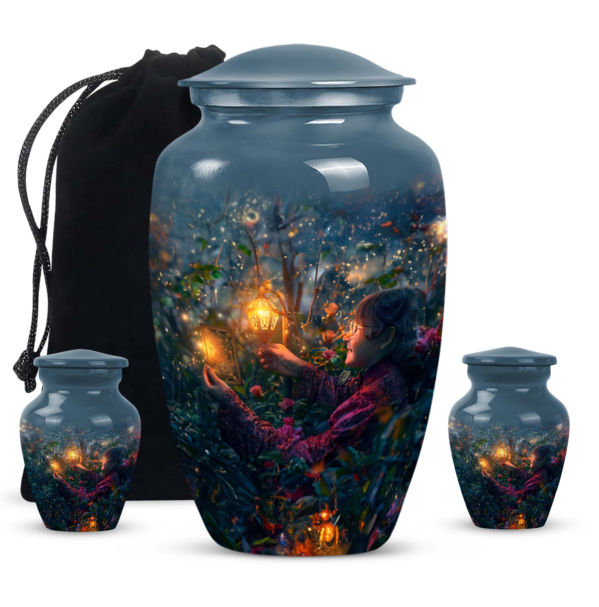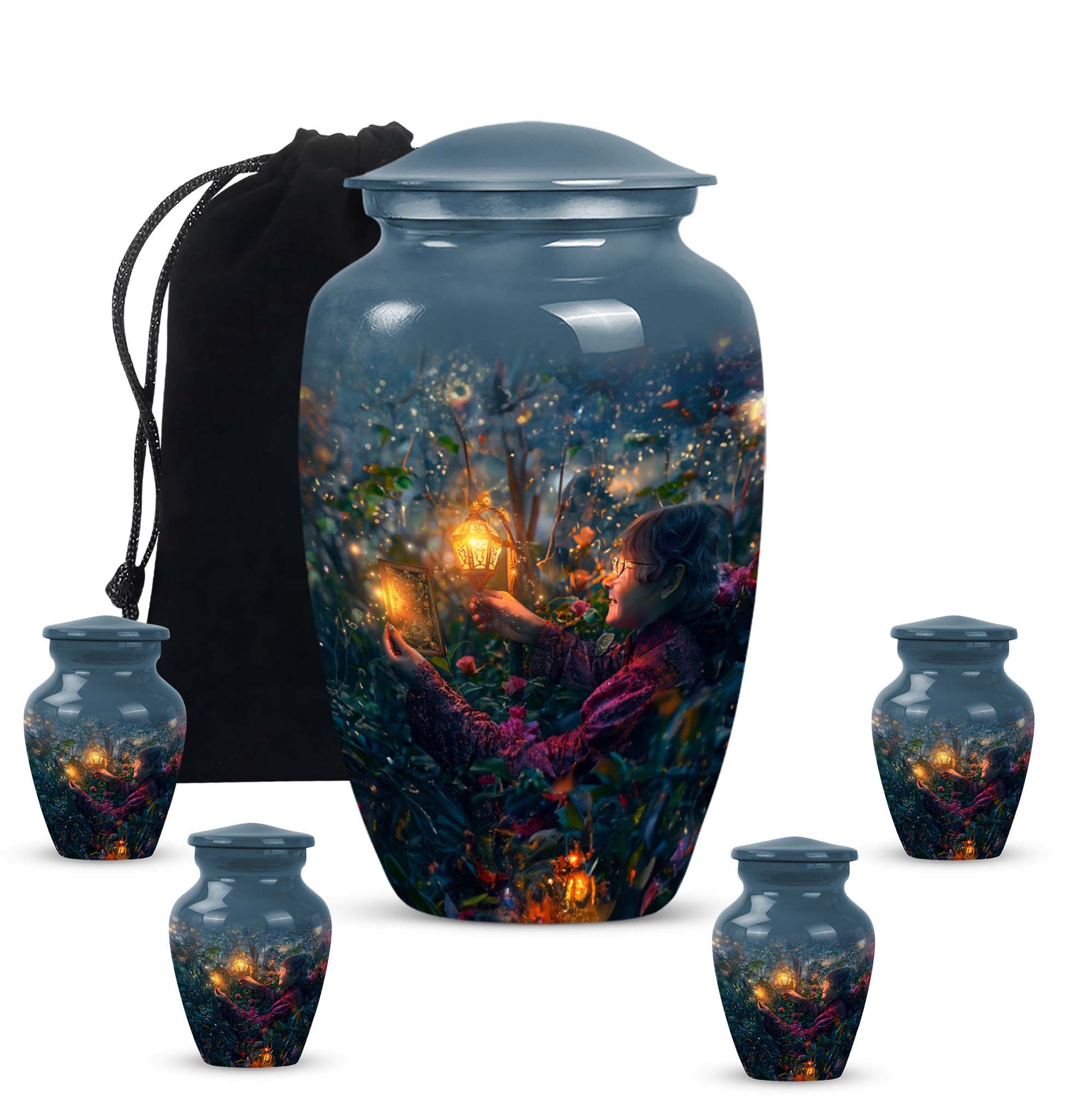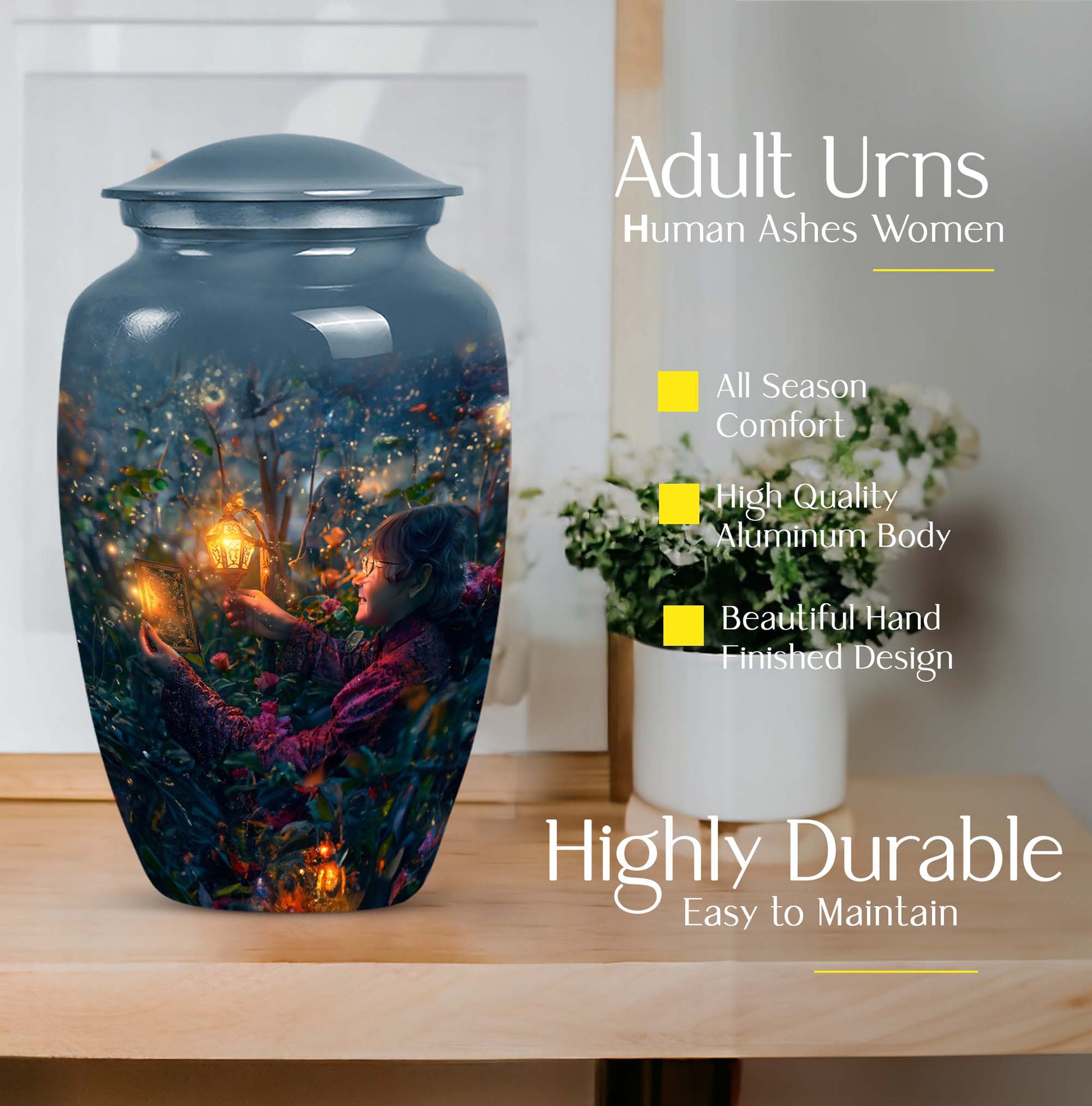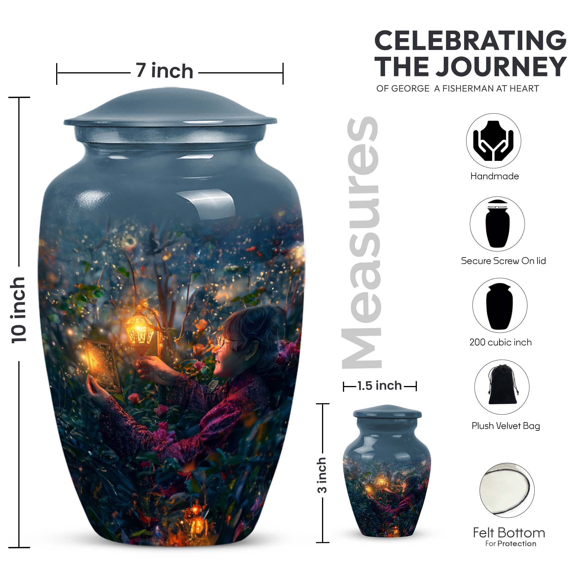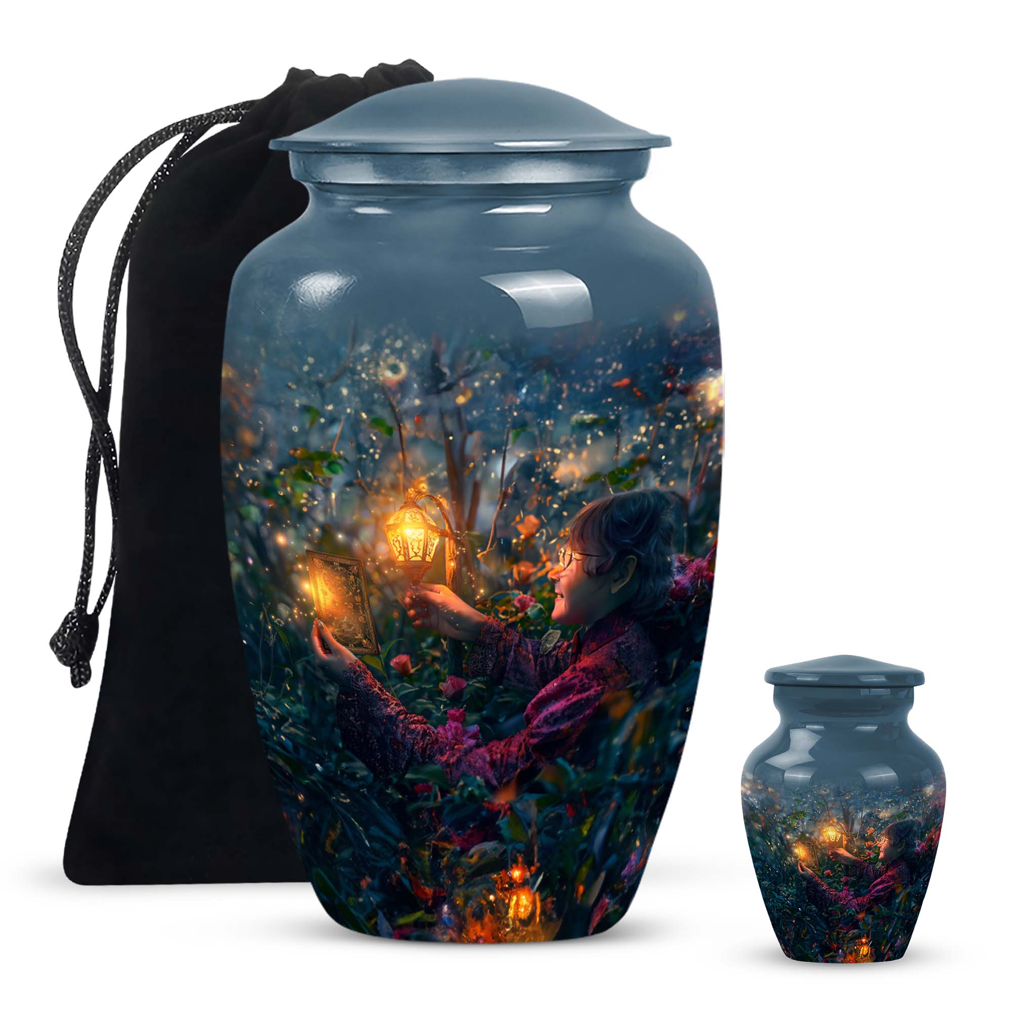 Experience the tranquility and peace that comes with our Tarot Urn, a finely crafted memorial urn for your loved one's ashes. Boasting a size of 10 inches and a hefty weight of 3.3 pounds, this large urn guarantees durability and longevity, keeping precious remains secure. Crafted from high-quality aluminium, its abstract theme adds a touch of unique allure to its classic silhouette. With a capacity of 200 cubic inches, it can comfortably accommodate the ashes of an adult. Ease of handling is ensured, as your purchase includes a velvet pouch designed for the containment of ashes. Moreover, this burial urn offers the opportunity to make it more meaningful by personalizing it with engraved names. Despite its sturdy structure, it maintains a gentle appearance that can suit any memorial setting. This Tarot Urn is not just an indoor treasure; it is also suitable as outdoor urns, elegantly fulfilling your funeral or memorial ceremony needs. Step into the realm of comfort and serenity with our Tarot Urn, a paramount addition to your memorial urns' collection.
