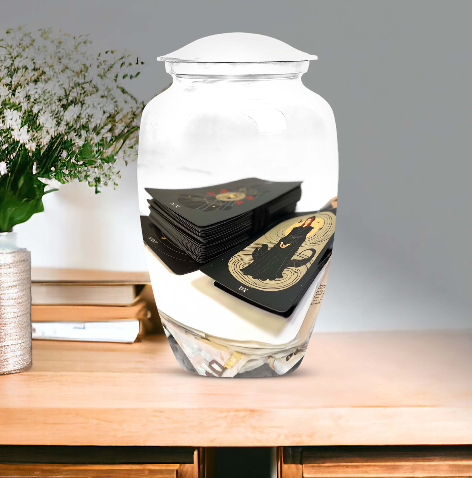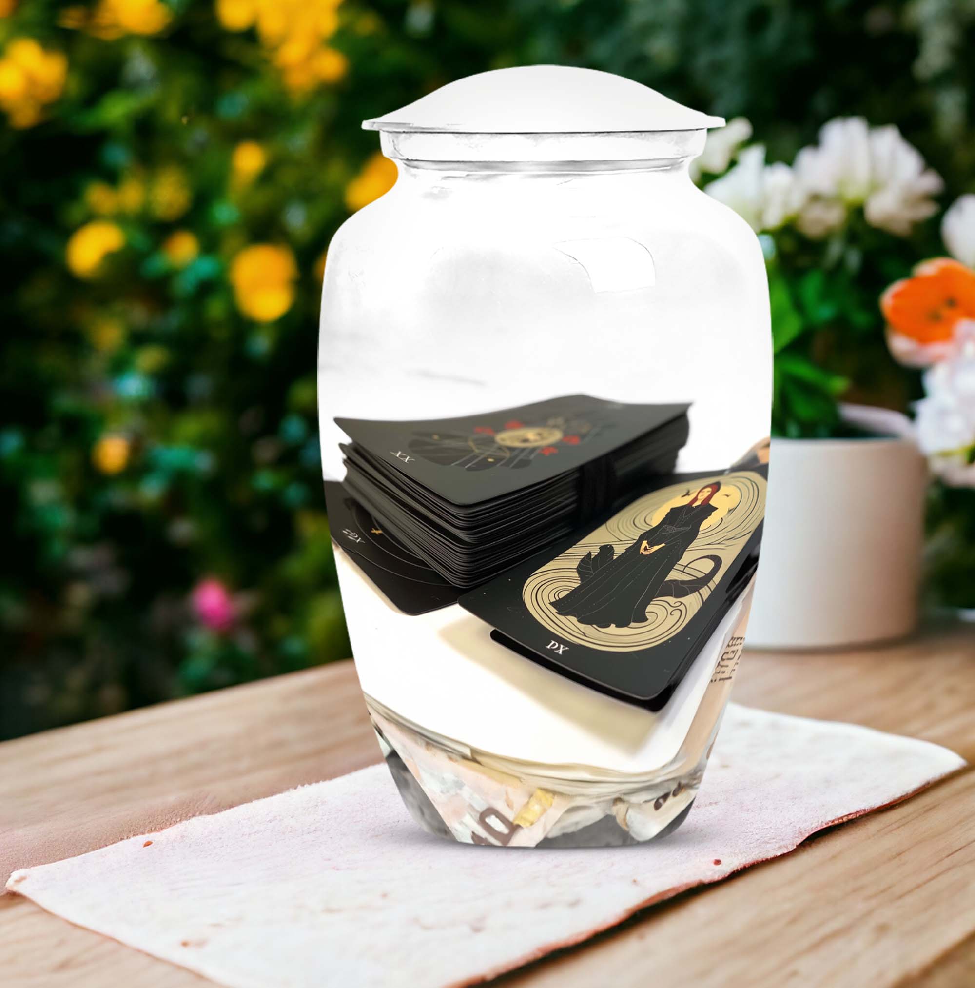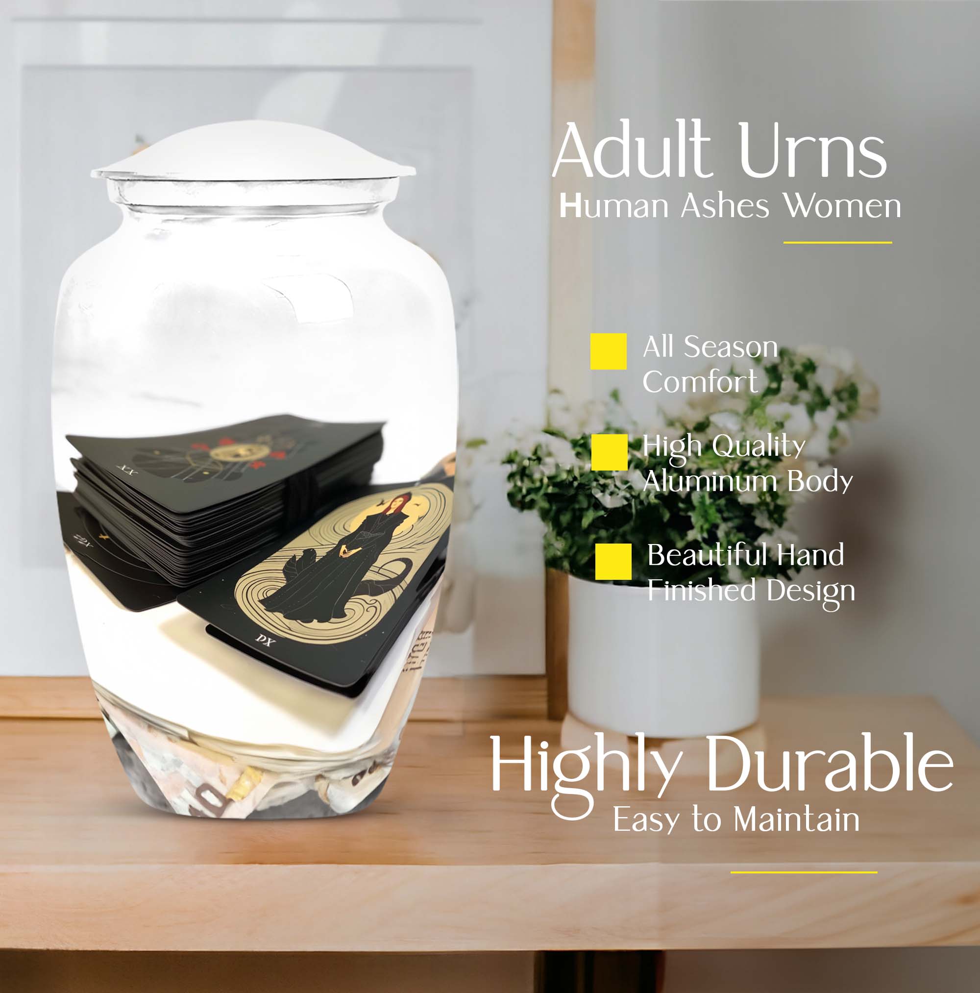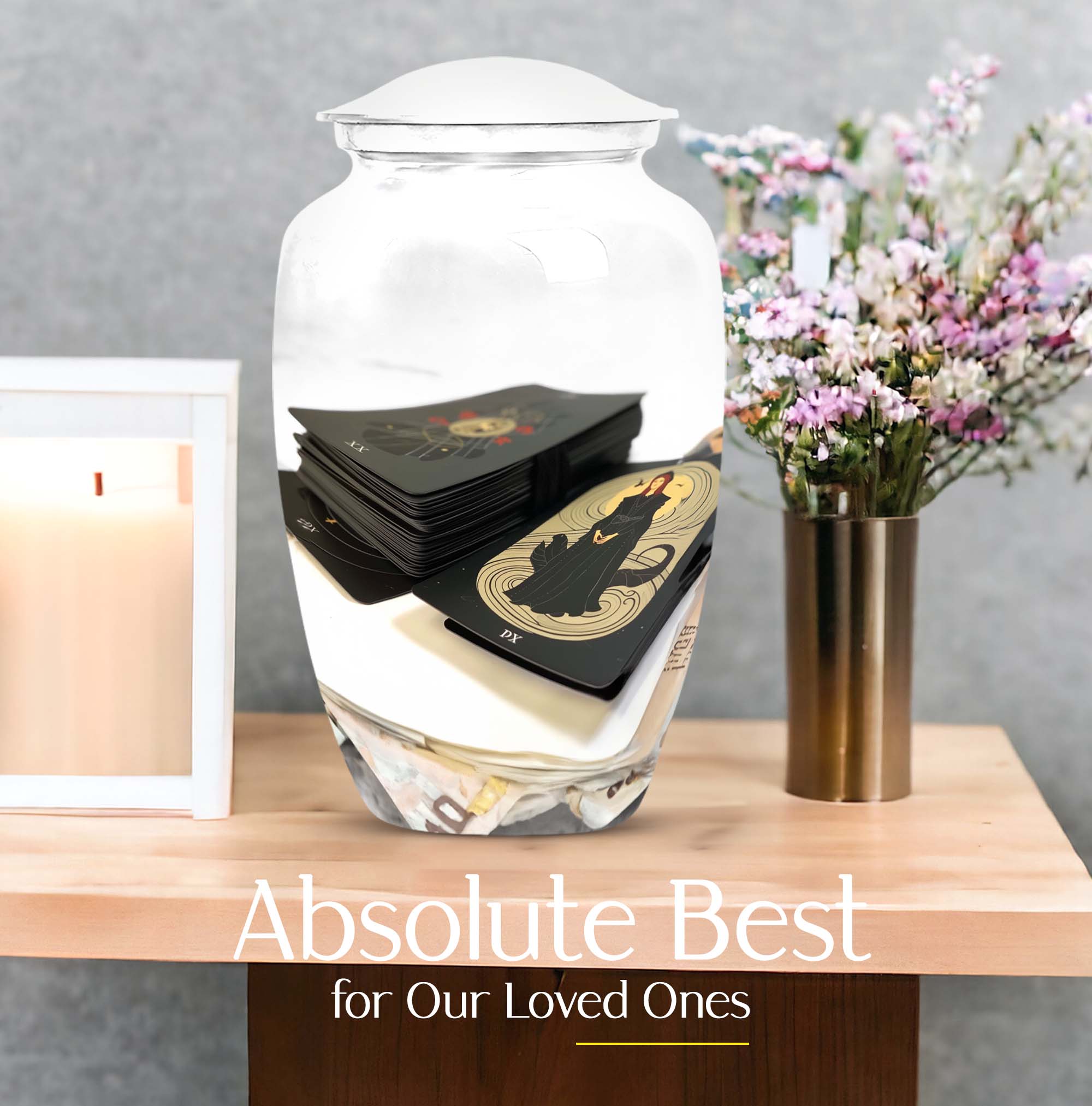 Step into a solemn and serene experience with this 10-inch Tarot Urn for adult cremation ashes. Crafted from robust Aluminium and crafted in a 'Classic Urn' style, this Urn represents a dignified tribute to your loved ones. It weighs just 3.3 pounds, making it easy to transport to your chosen memorial location. Its sleek dimensions comfortably accommodate up to 200 cubic inches of ash, making it suitable for all adult male cremations. The package also provides a soft velvet pouch to respectfully contain the ashes. This Large Urn catches one's eye with its intricate Abstract theme, adding an additional layer of spirituality. For a more personalized memorial, there is an option to customize the urn by engraving names upon it. Ideal for burial or it can grace your mantel with its unforgettable presence. Whether you're looking for 'burial medium size urns' or 'funeral urns for adult ashes women', this Tarot Urn gives reverence to the lives that enriched yours.